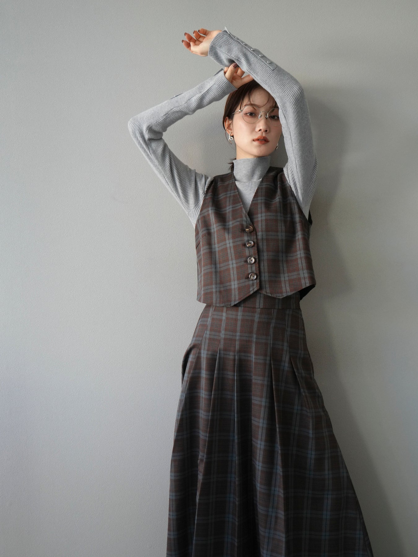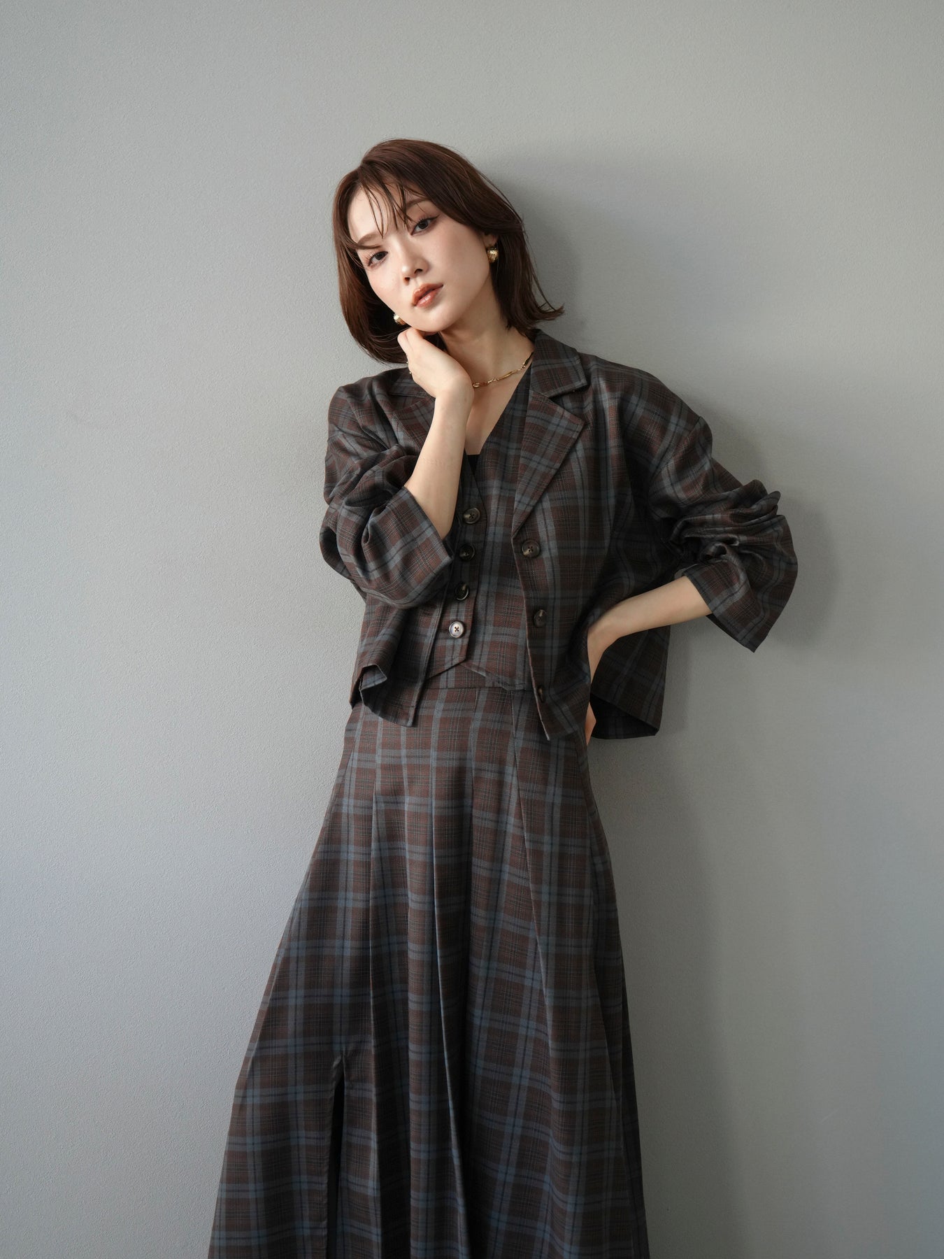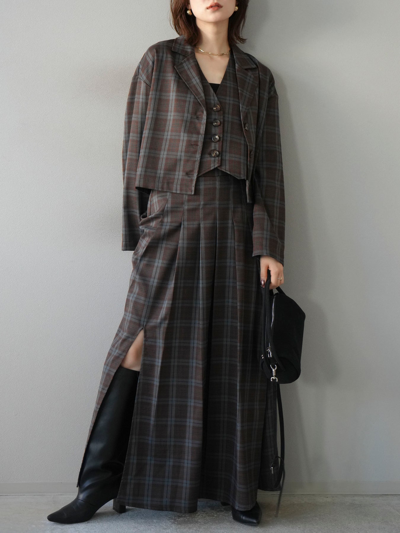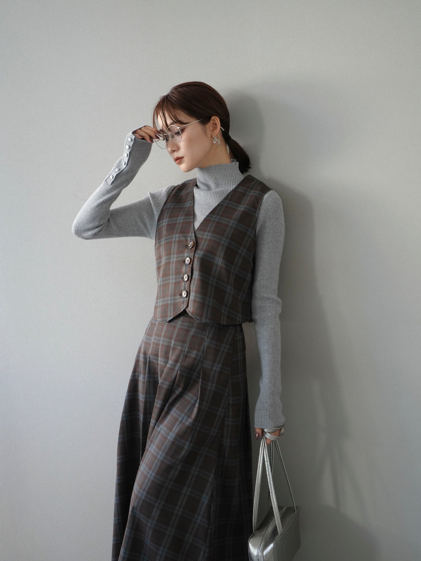 クラシカルなチェック柄で仕上げたベスト。深めのVネックとフロントボタンがシャープな印象を与え、すっきりとしたシルエットでスタイリングを引き締めます。シャツやブラウスにレイヤードすればトラッド感のある着こなしに、Tシャツやカットソーと合わせればカジュアルダウンも可能。同柄のジャケットやパンツと組み合わせて、セットアップ風にコーディネートするのもおすすめです。シーズンを問わず幅広く活躍する万能アイテム。 ※ボトムス、キャミソール(インナー)以外の商品は一律でインナーは付属していません。