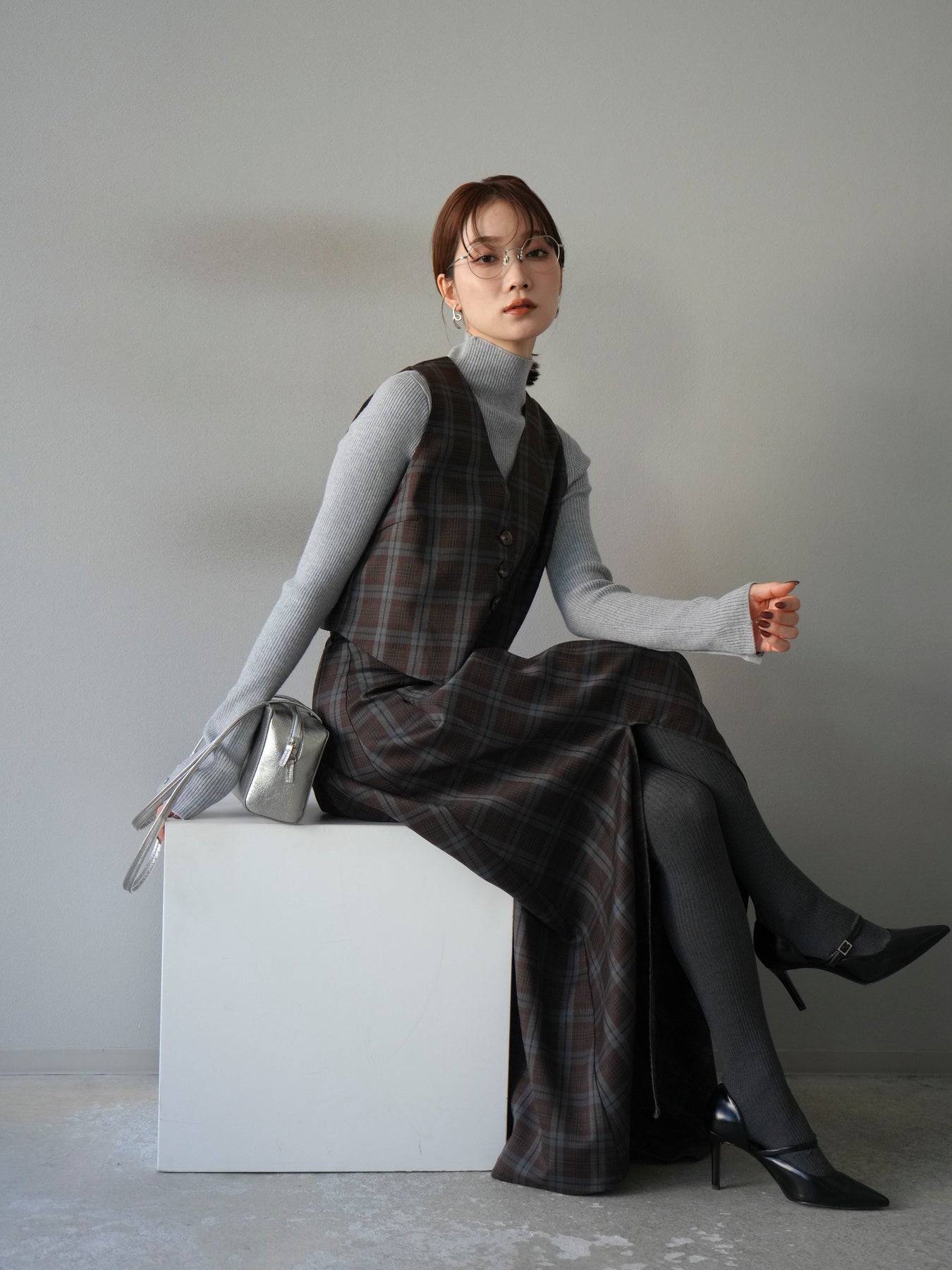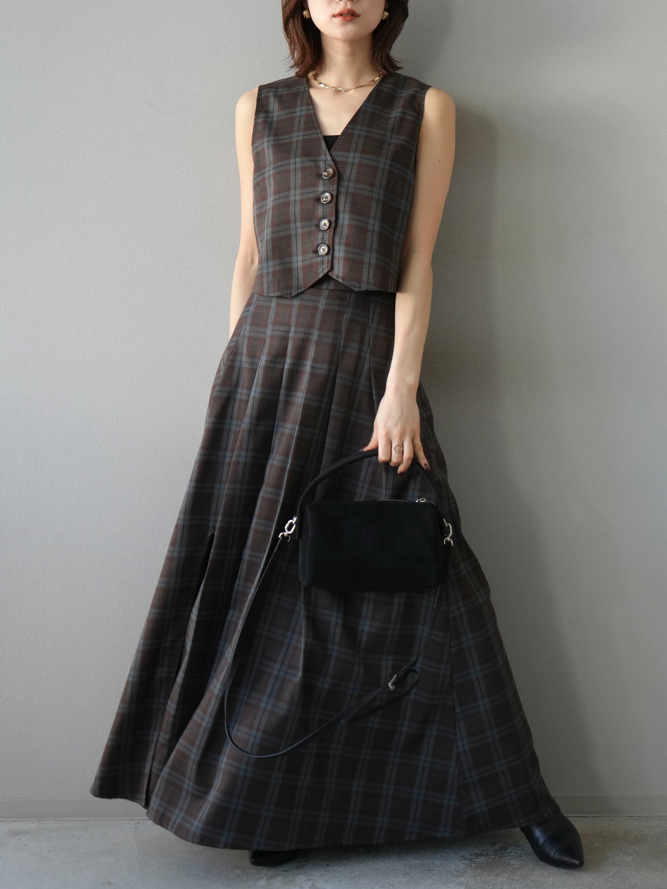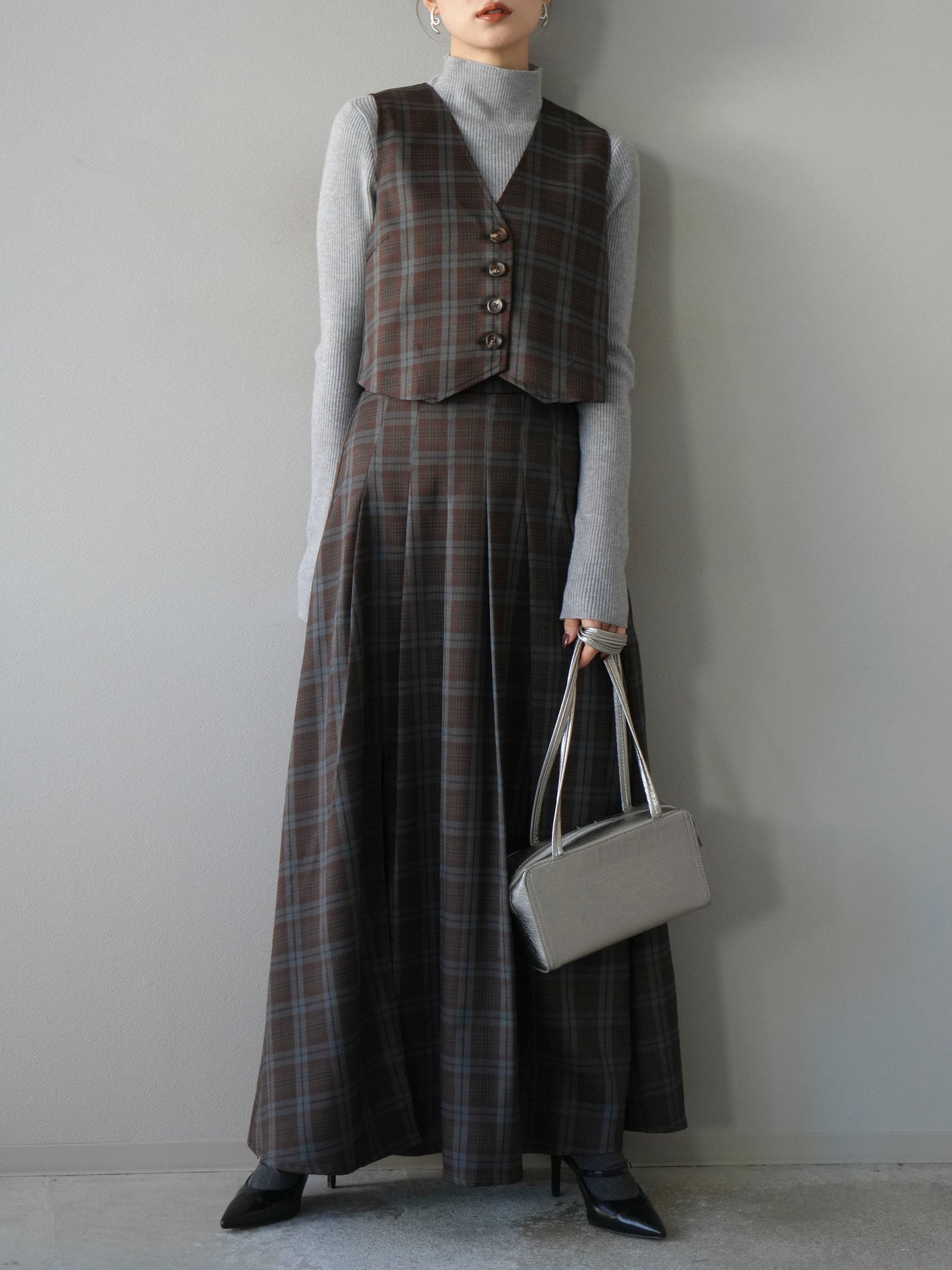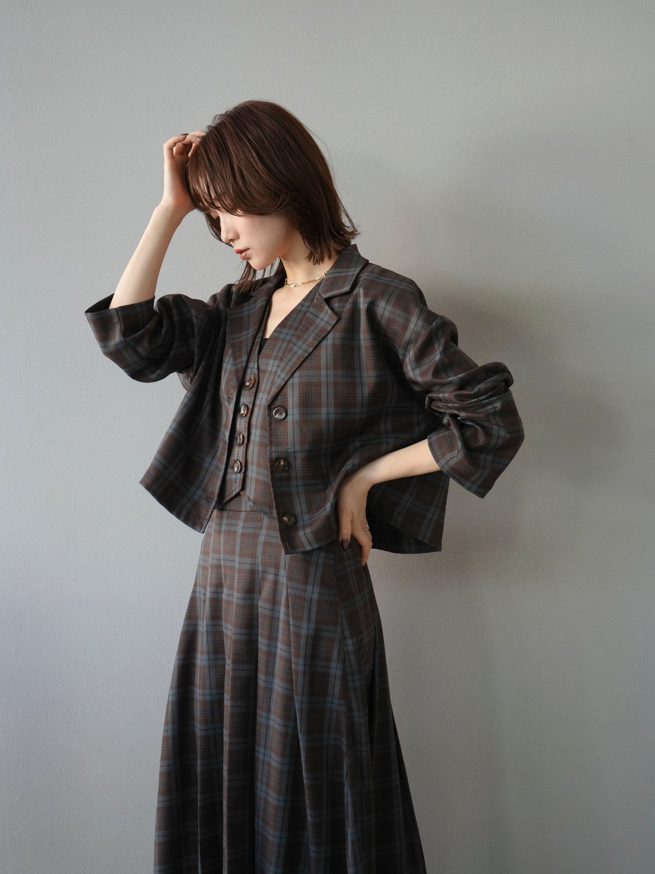 クラシカルなチェック柄で仕上げたベスト。深めのVネックとフロントボタンがシャープな印象を与え、すっきりとしたシルエットでスタイリングを引き締めます。シャツやブラウスにレイヤードすればトラッド感のある着こなしに、Tシャツやカットソーと合わせればカジュアルダウンも可能。同柄のジャケットやパンツと組み合わせて、セットアップ風にコーディネートするのもおすすめです。シーズンを問わず幅広く活躍する万能アイテム。 ※ボトムス、キャミソール(インナー)以外の商品は一律でインナーは付属していません。