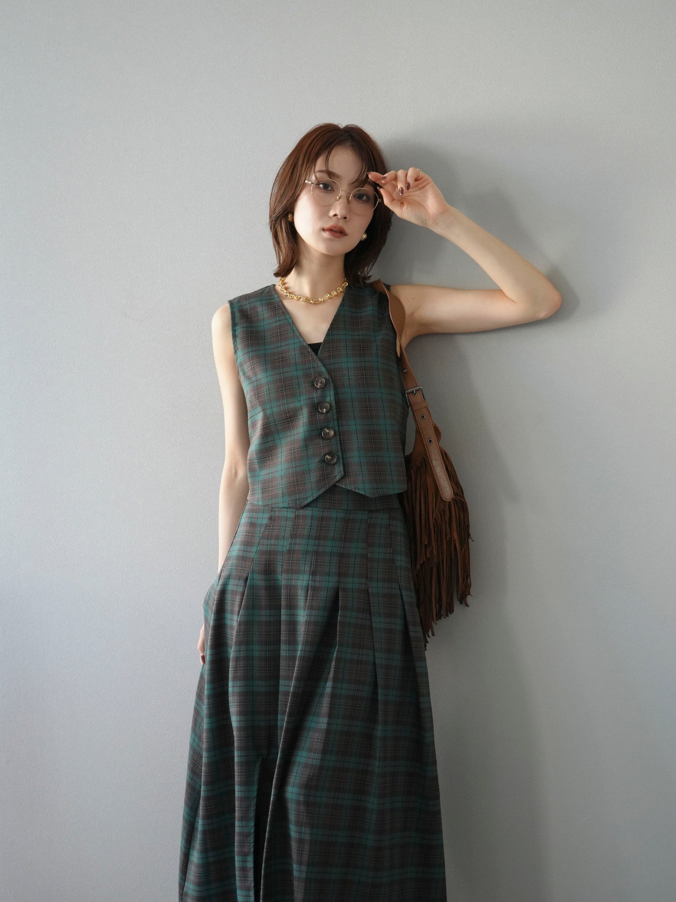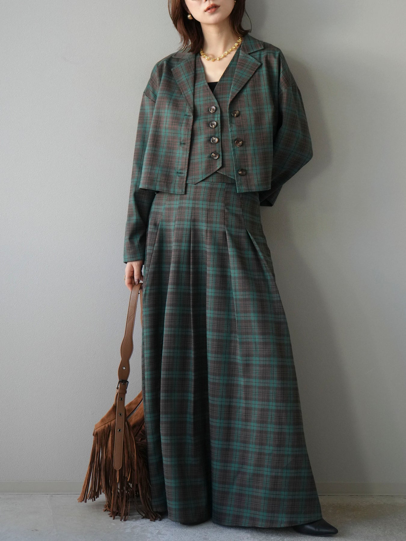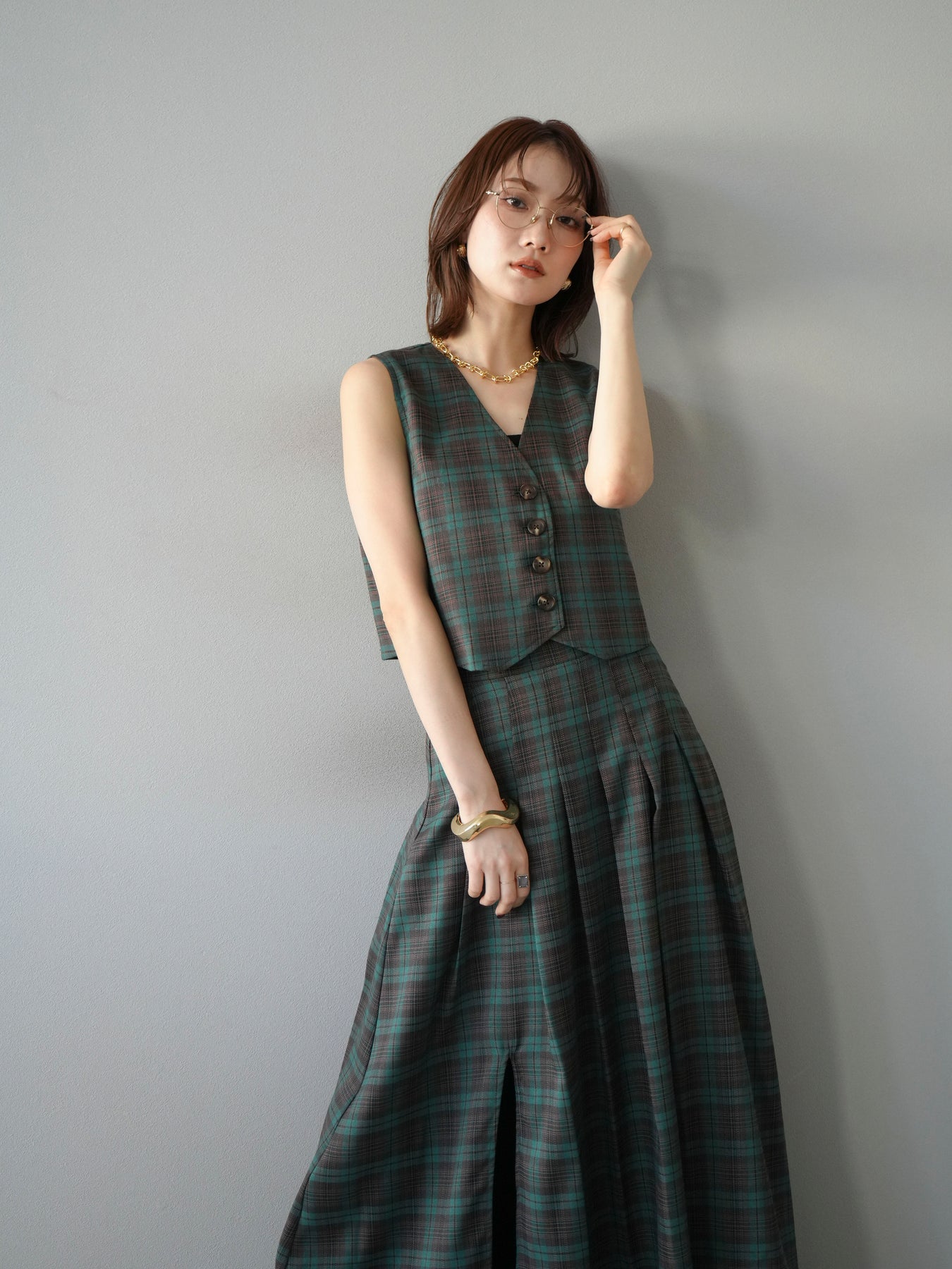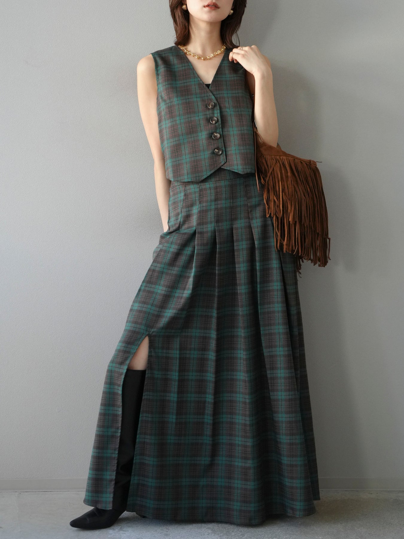 [予約]チェック柄ベスト/グリーン