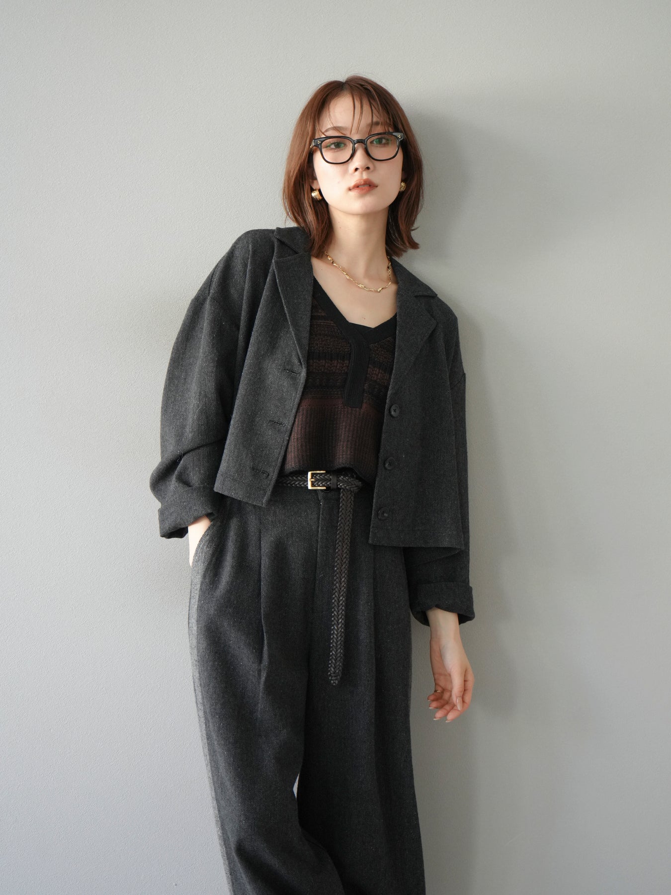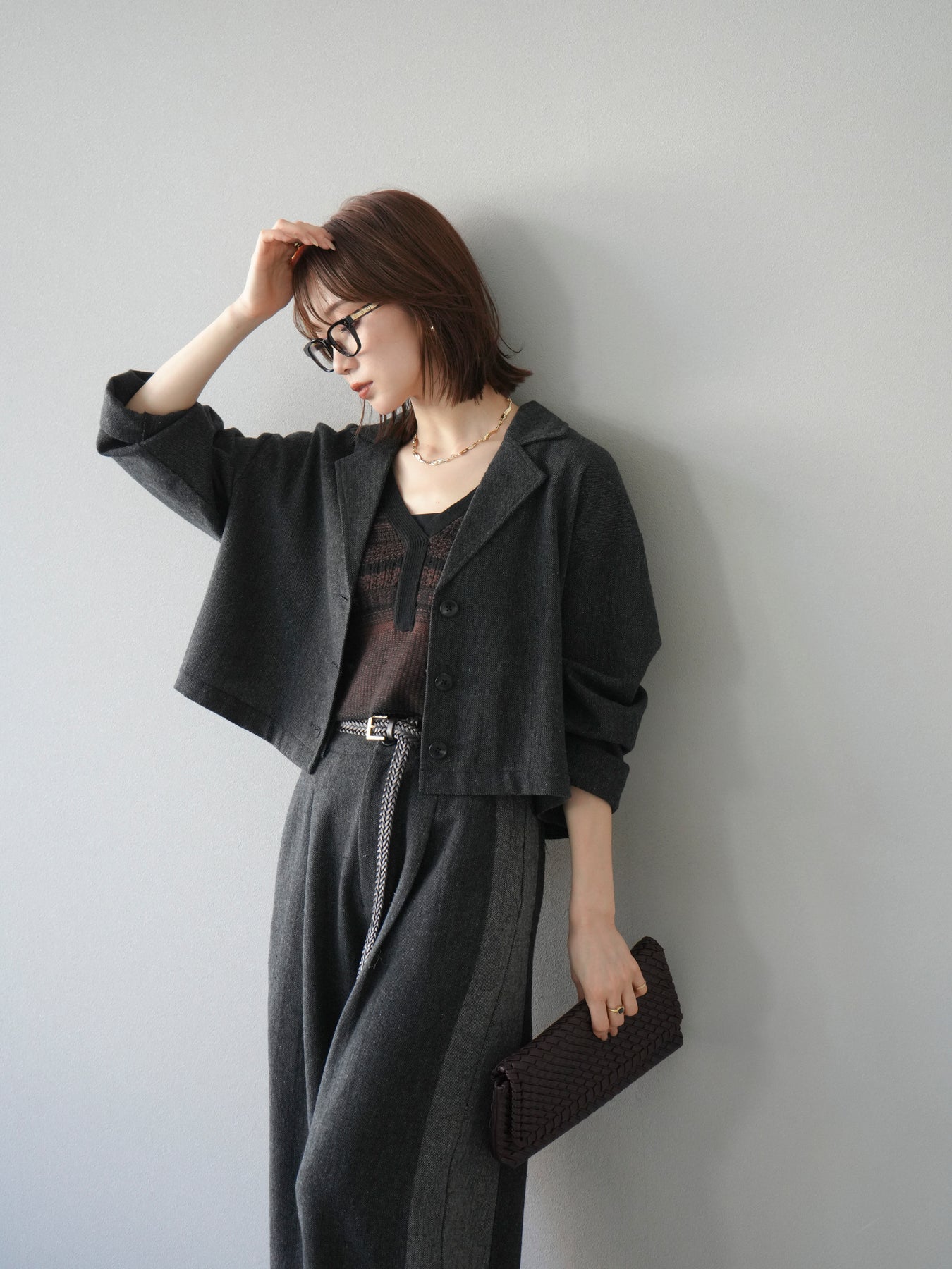 上品なツイード素材で仕立てたショートジャケット。コンパクトな丈感がスタイルアップ効果を叶え、羽織るだけでバランスの良いシルエットに仕上がります。テーラードカラーがきちんと感を演出しつつ、程よくゆとりのあるシルエットで抜け感もプラス。パンツやスカート、ワンピースまで幅広いアイテムに合わせやすく、デイリーからオフィスシーンまで活躍する一着です。 ※ボトムス、キャミソール(インナー)以外の商品は一律でインナーは付属していません。