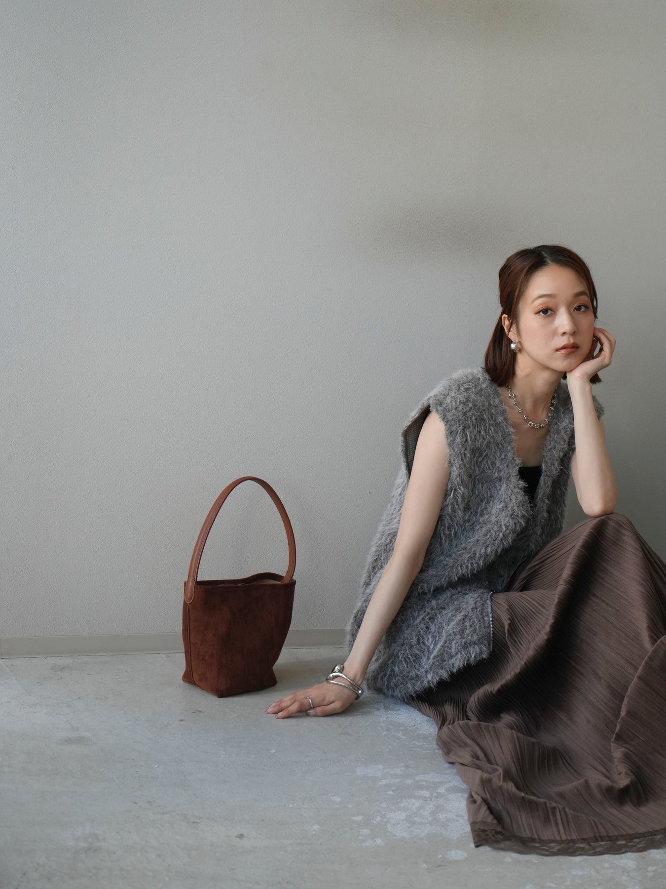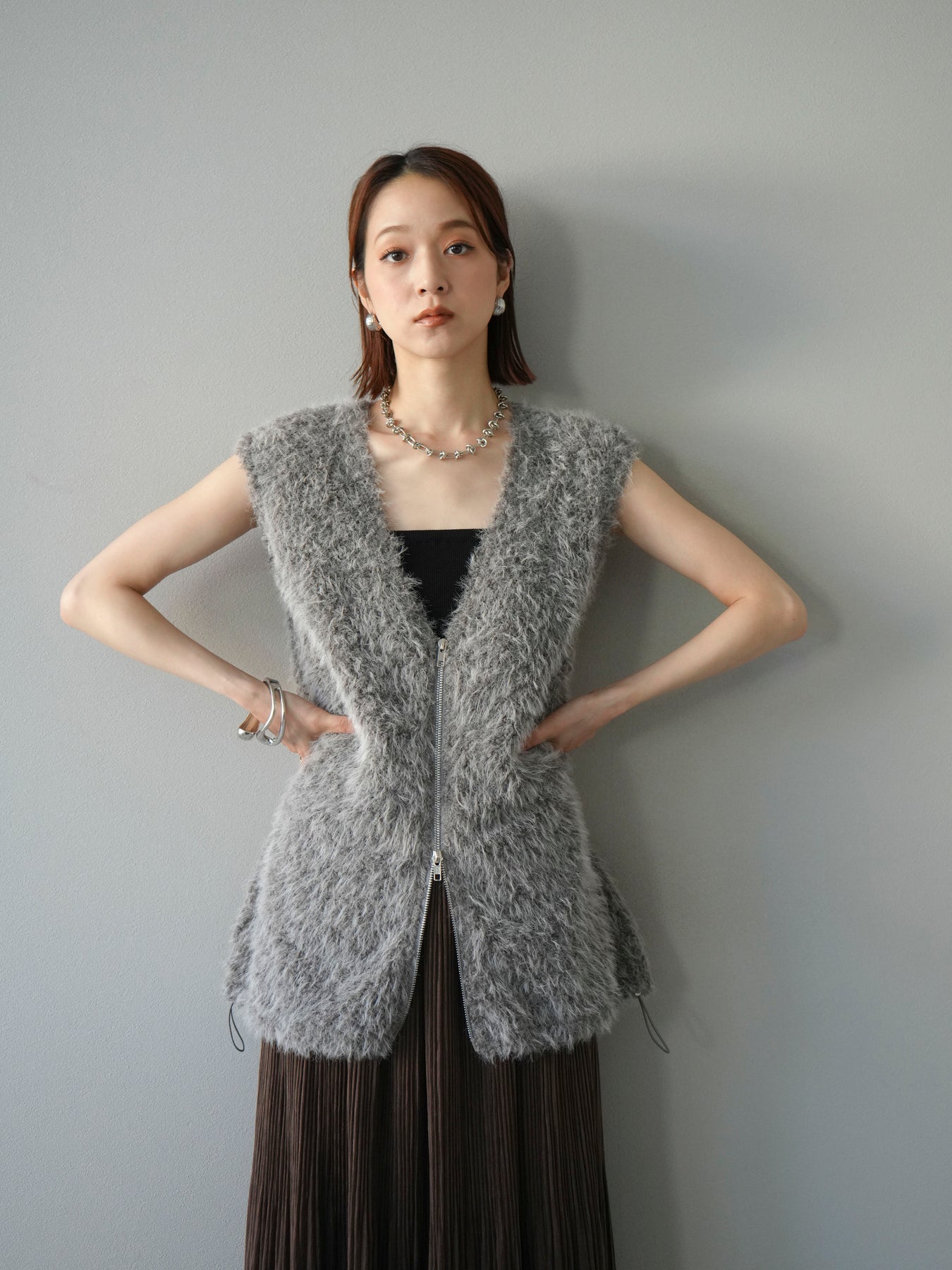 ふんわりとしたシャギー素材がシーズンムードを高めるジップベスト。毛足のある柔らかな風合いで、羽織るだけであたたかみのあるスタイルを演出します。ダブルZIP仕様になっており、シルエットやレイヤードのアレンジも自在。裾のドローコードで絞りを調整できるので、メリハリのある着こなしも可能です。ロンTやシャツに重ねるだけでトレンド感のあるコーディネートに仕上がる、万能アイテムです。 ※ボトムス、キャミソール(インナー)以外の商品は一律でインナーは付属していません。