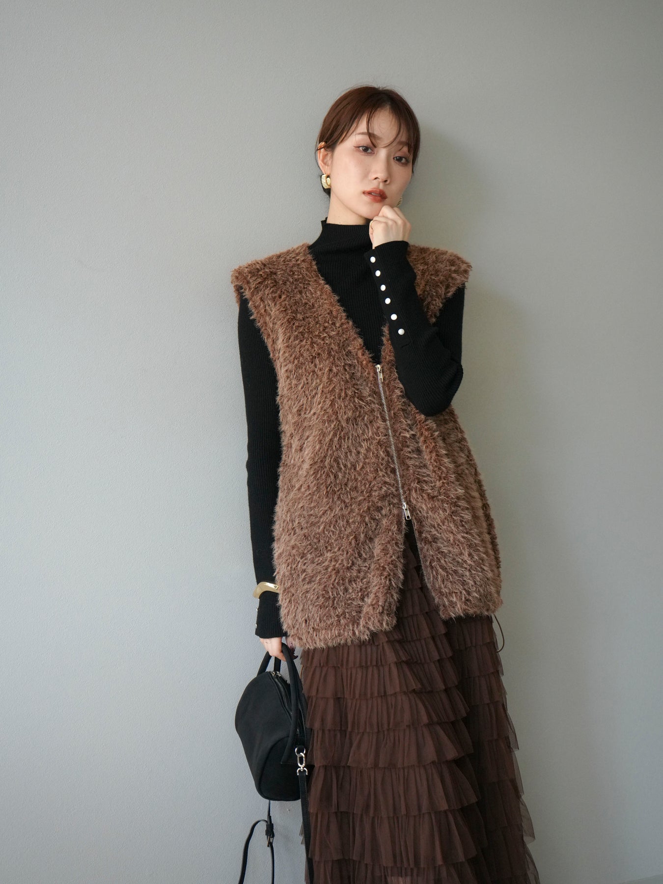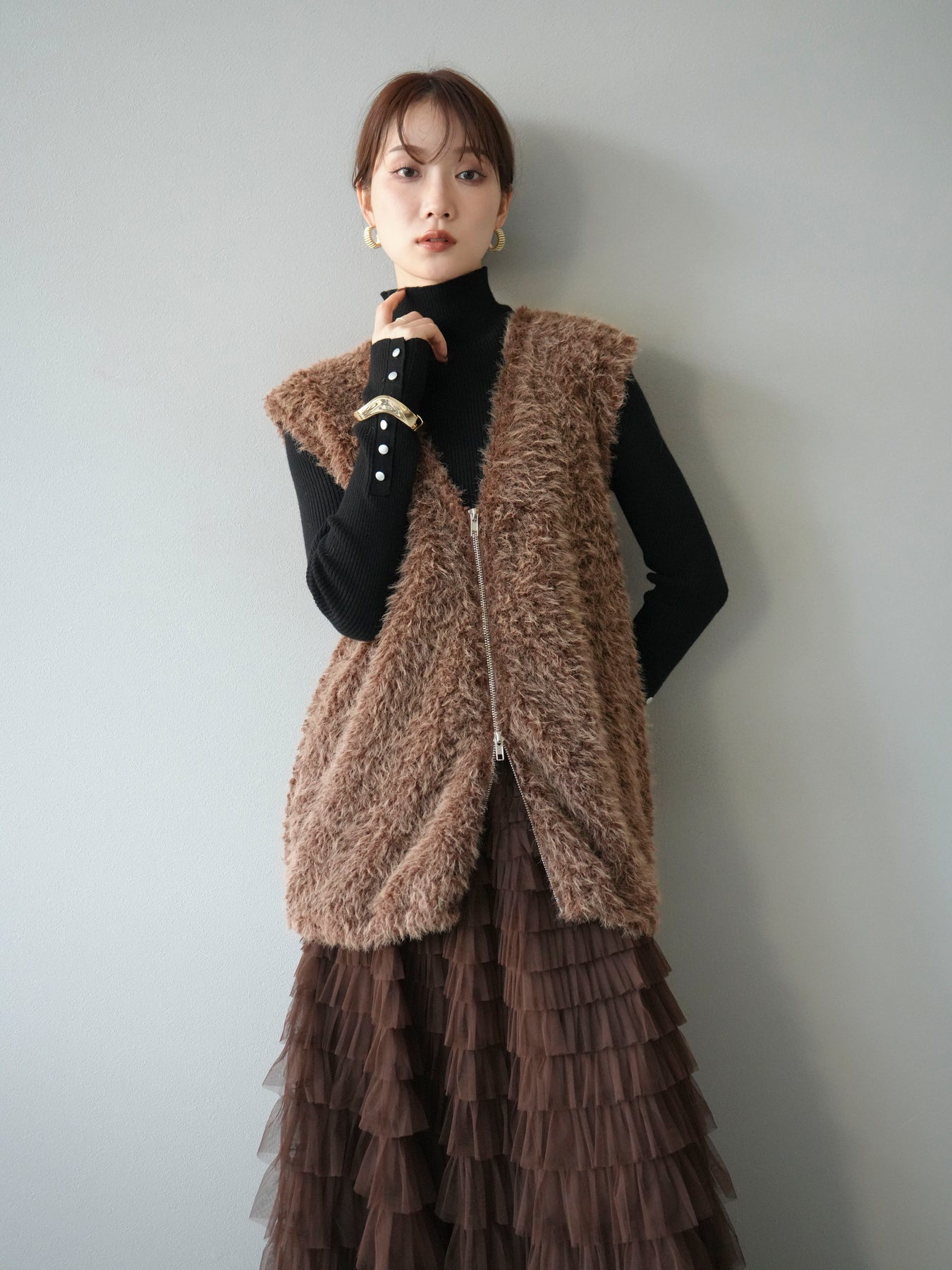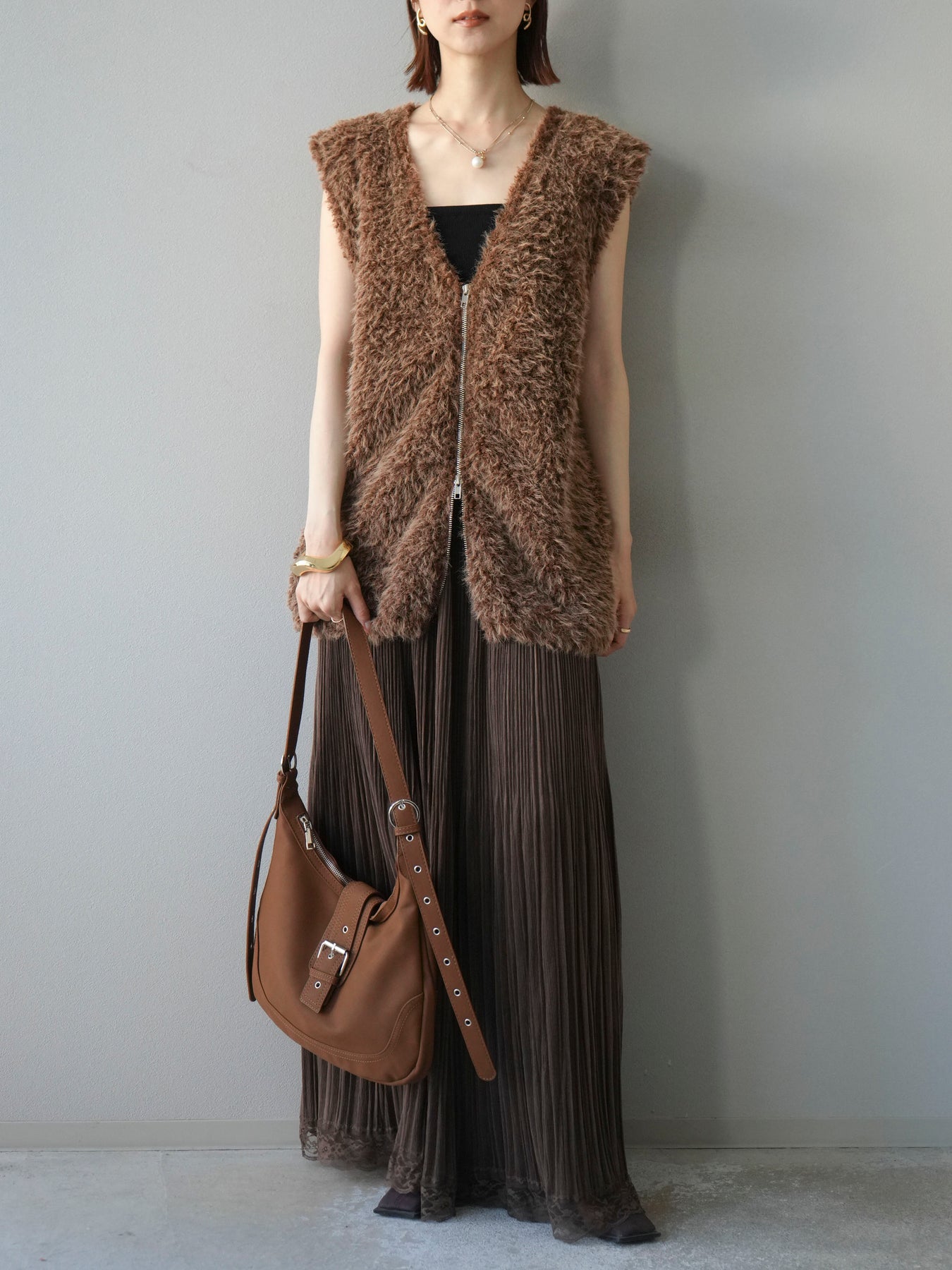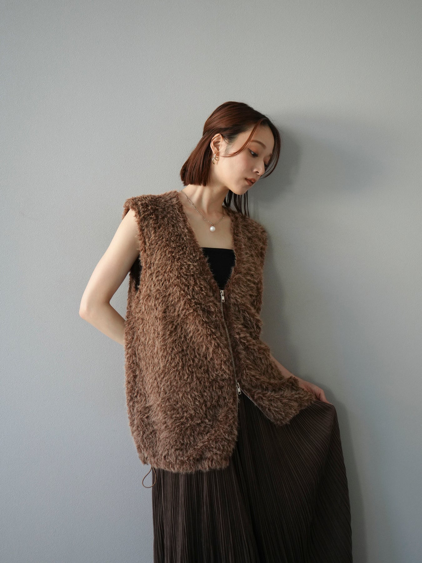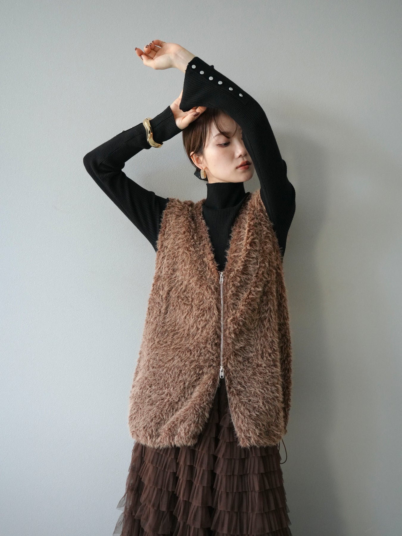 [予約]ダブルZIPループシャギーベスト/ブラウン