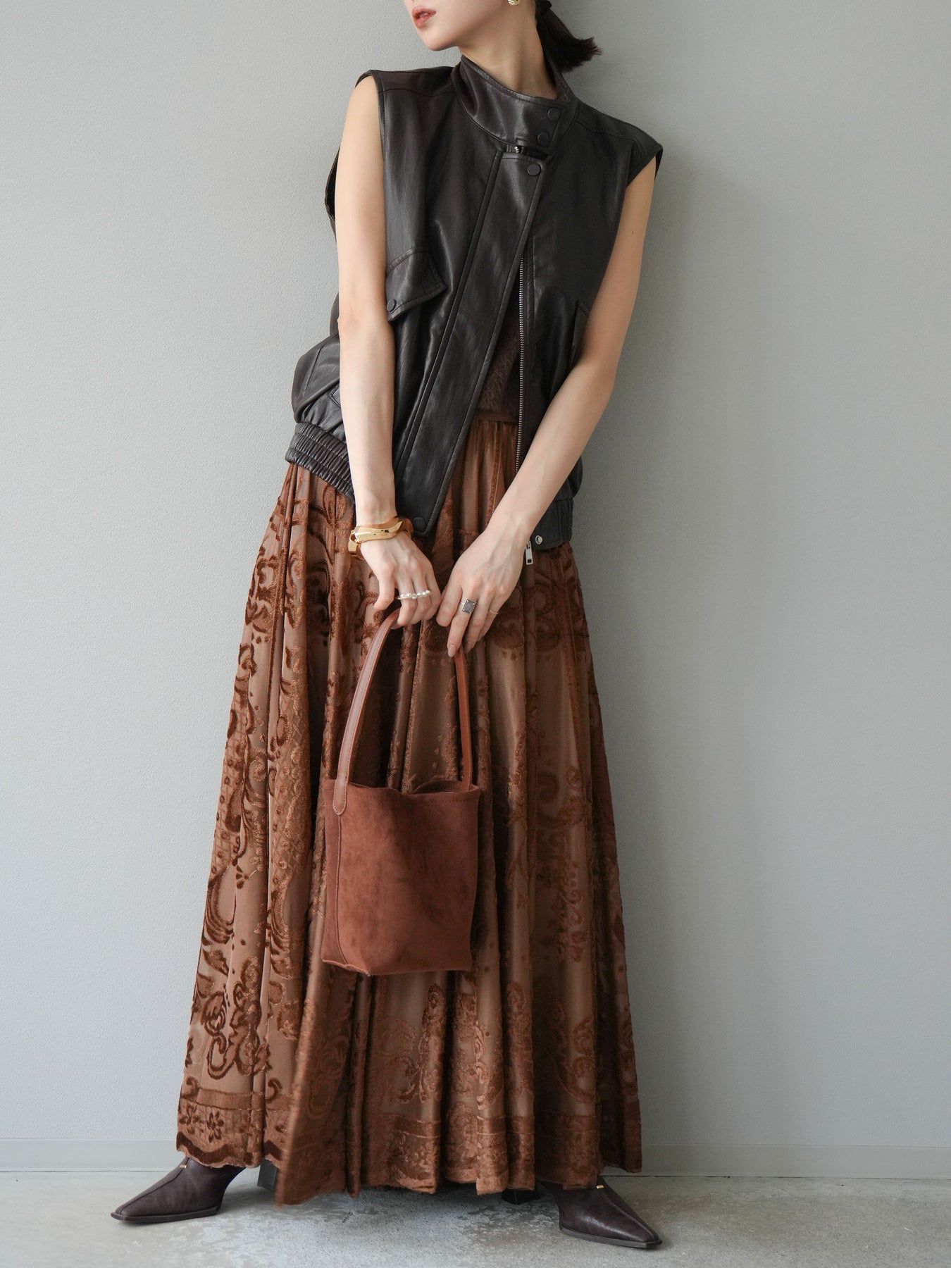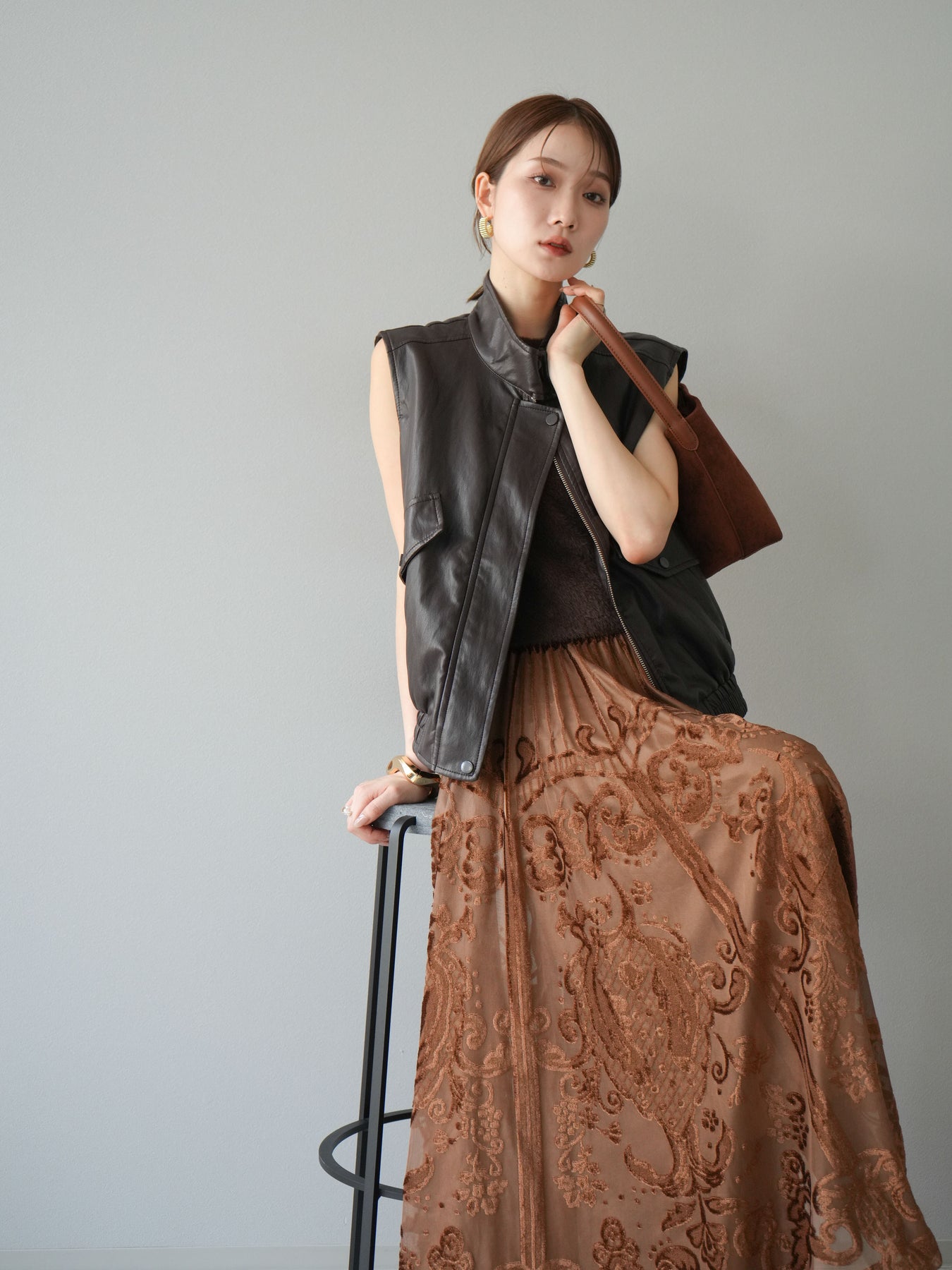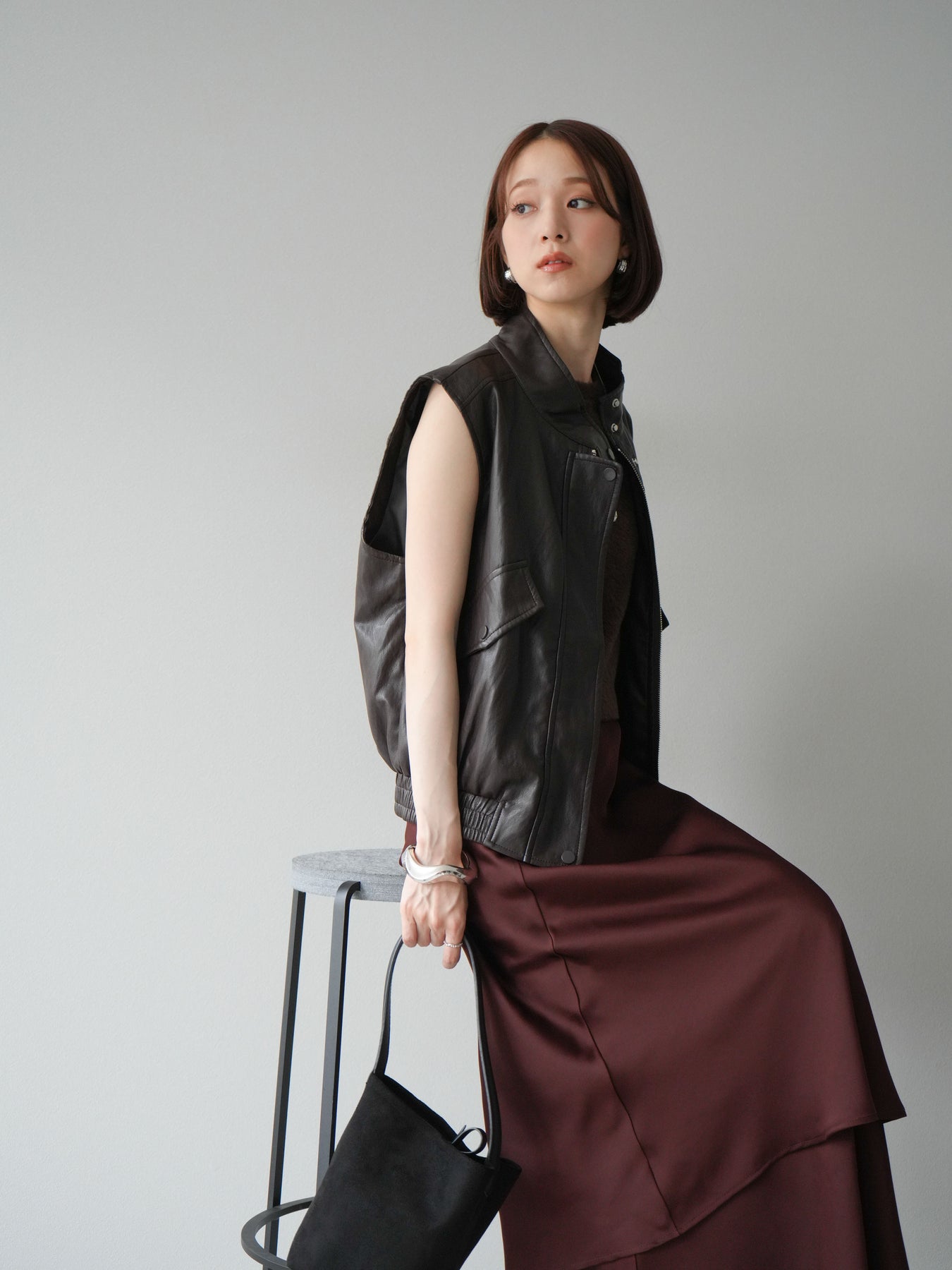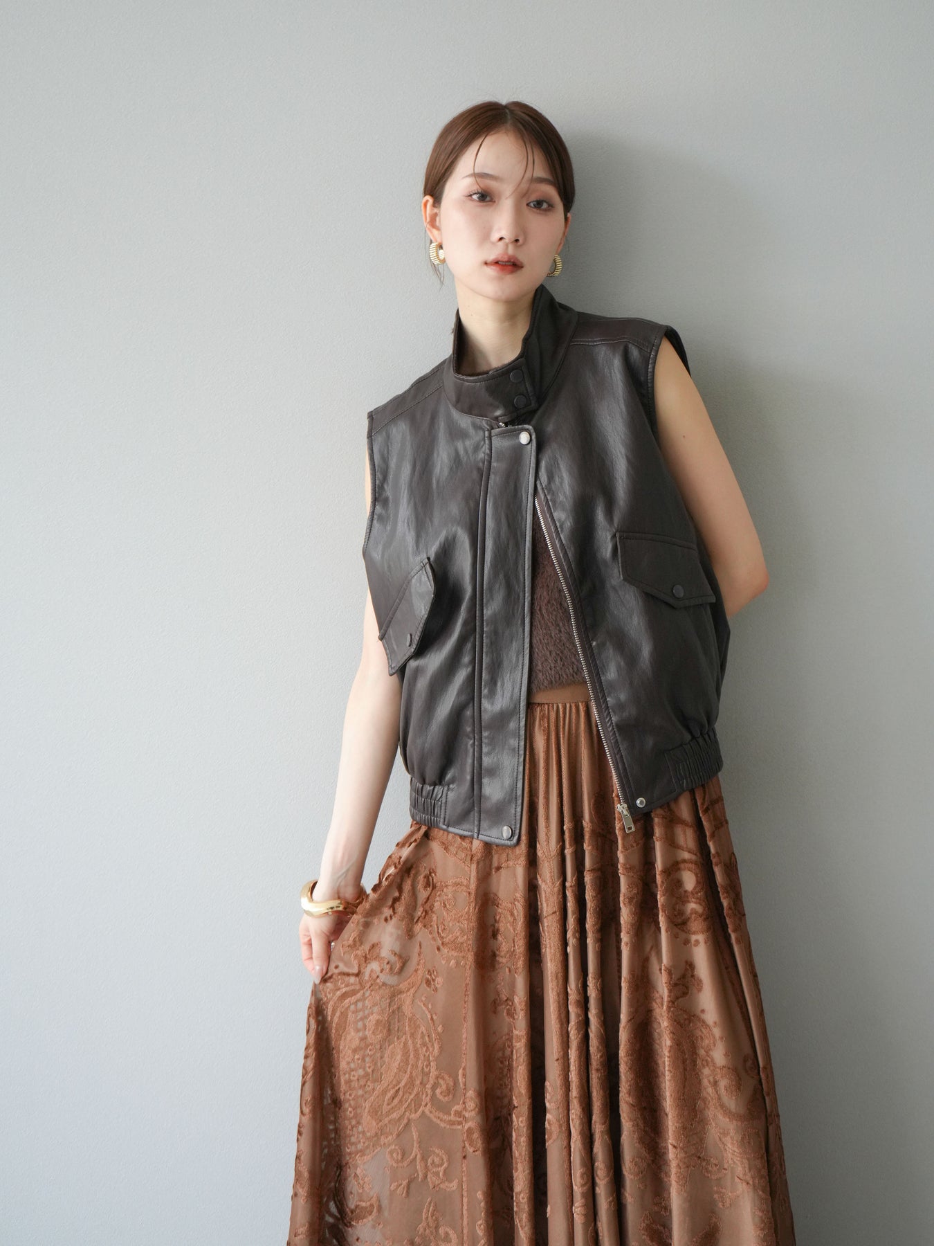 マットな質感のフェイクレザーを使用したスリーブレスブルゾン。モードな印象を引き立てるスタンドカラーとフロントZIPデザインが特徴で、シンプルなスタイリングに羽織るだけでぐっと雰囲気を高めてくれます。程よい厚みのある素材感でシルエットが美しく保たれ、肩を強調しすぎないスリーブレス仕様が抜け感を演出。Tシャツやカットソーとのカジュアルなレイヤードはもちろん、ワンピースに合わせて甘辛バランスを楽しむのもおすすめです。シーズンを問わず活躍する万能なアイテムです。 ※ボトムス、キャミソール(インナー)以外の商品は一律でインナーは付属していません。