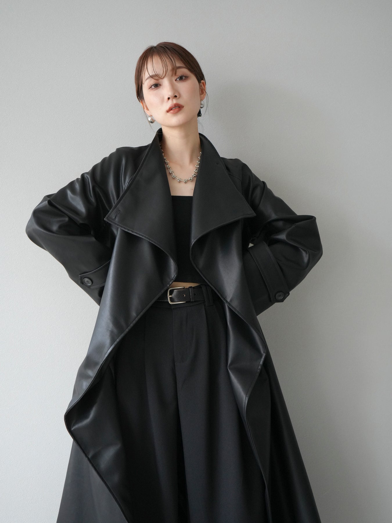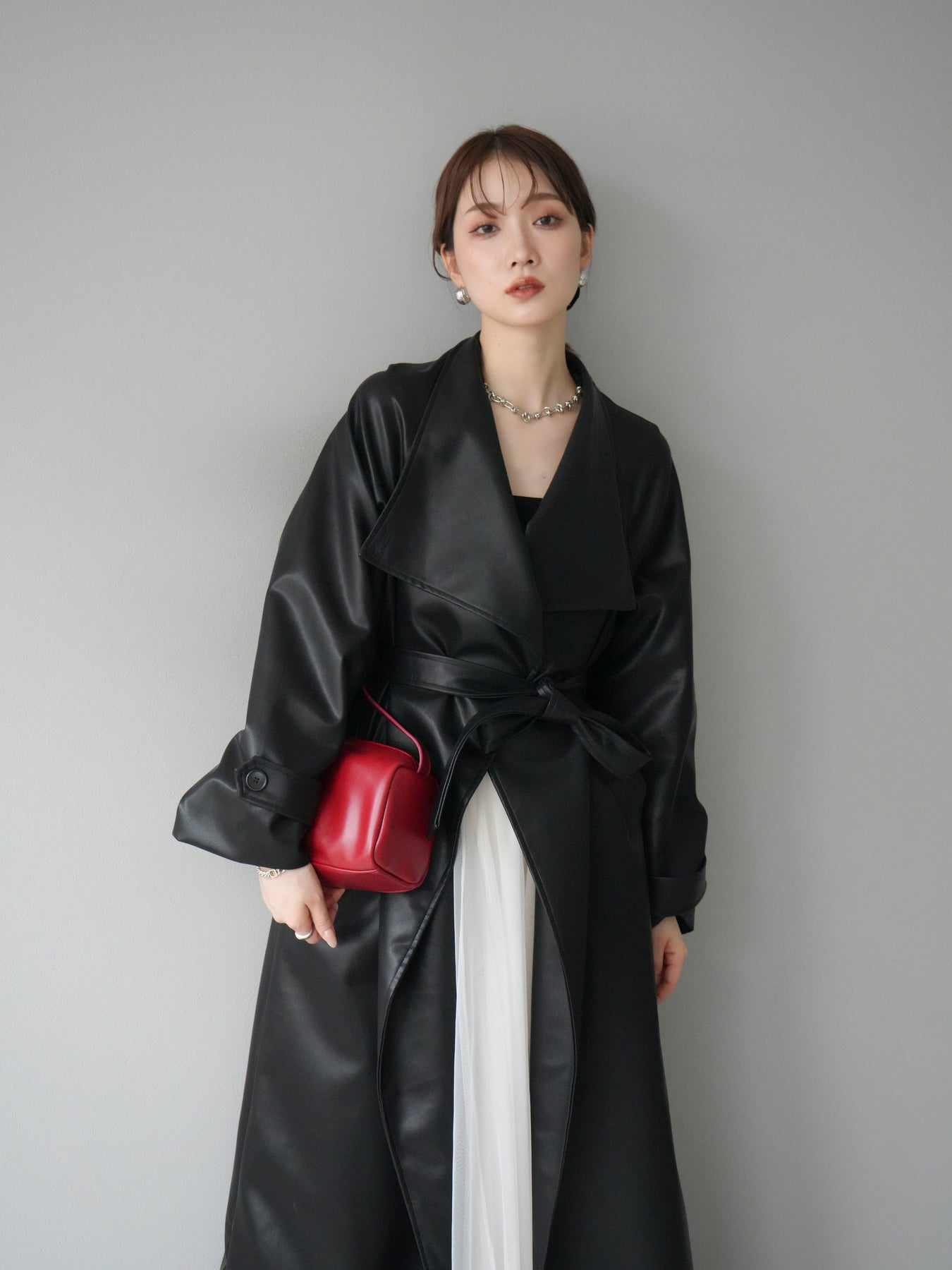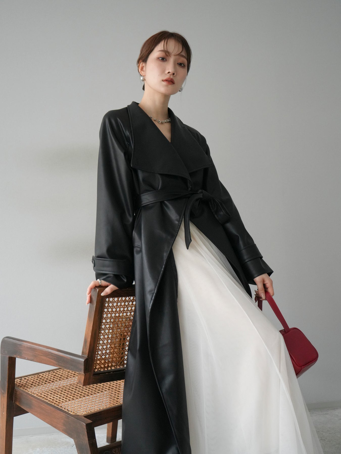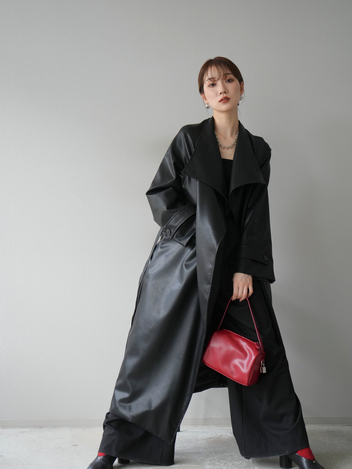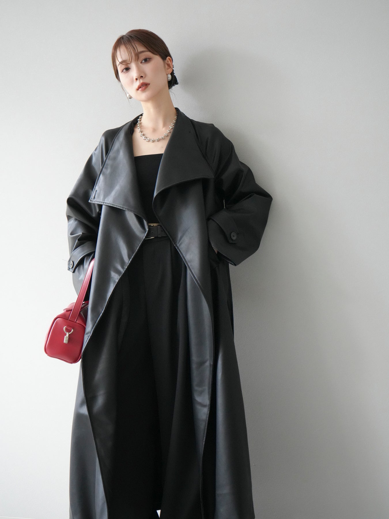 存在感のある大きめのカラーが印象的なレザーロングコート。滑らかなレザー調素材が高級感を引き立て、羽織るだけでモードなスタイリングが完成します。付属のベルトでウエストマークすればシルエットにメリハリを加えることができ、さまざまな着こなしを楽しめるデザイン。ロング丈が体全体を包み込み、特別なシーンからデイリースタイルまで幅広く活躍する一着です。 ※ボトムス、キャミソール(インナー)以外の商品は一律でインナーは付属していません。
