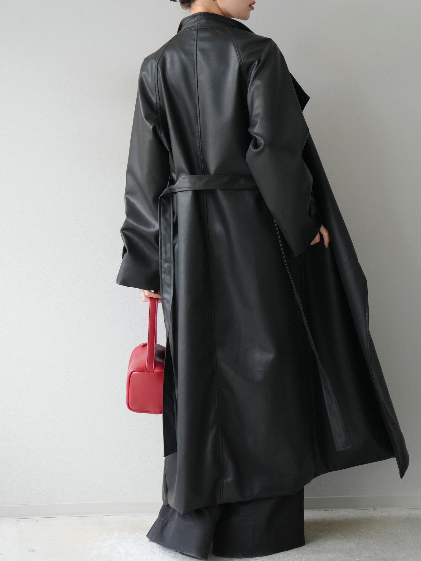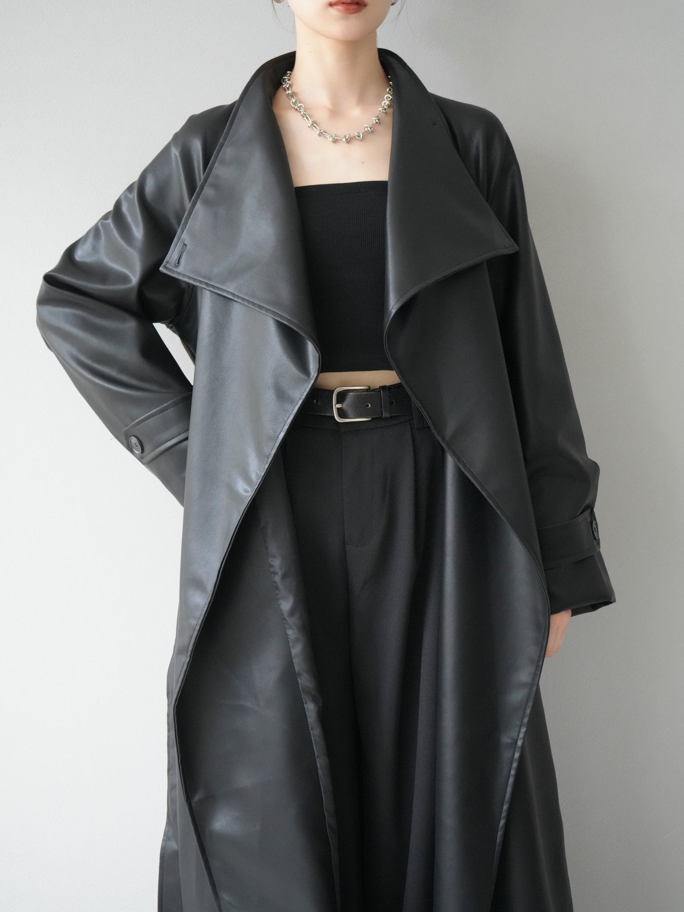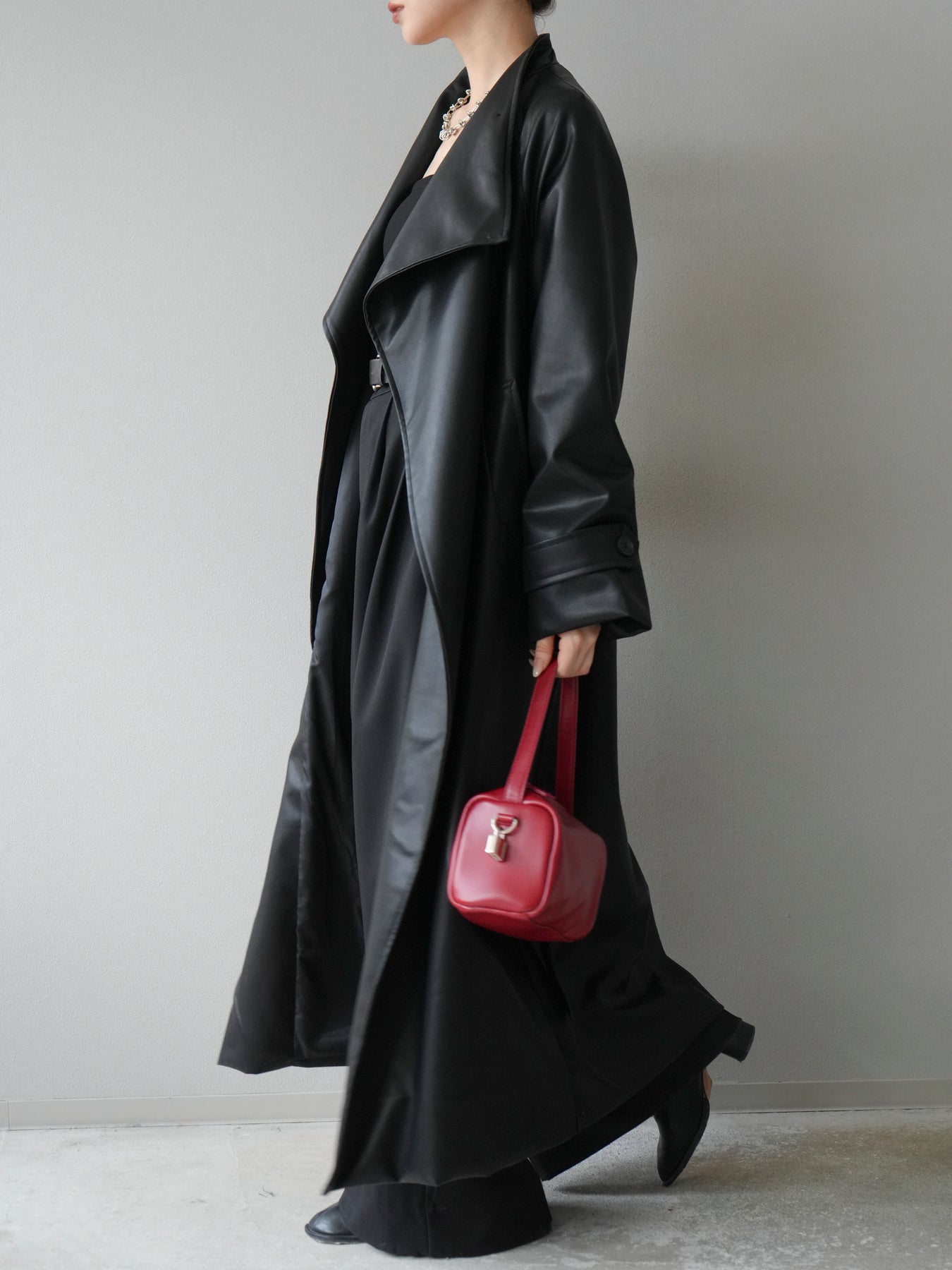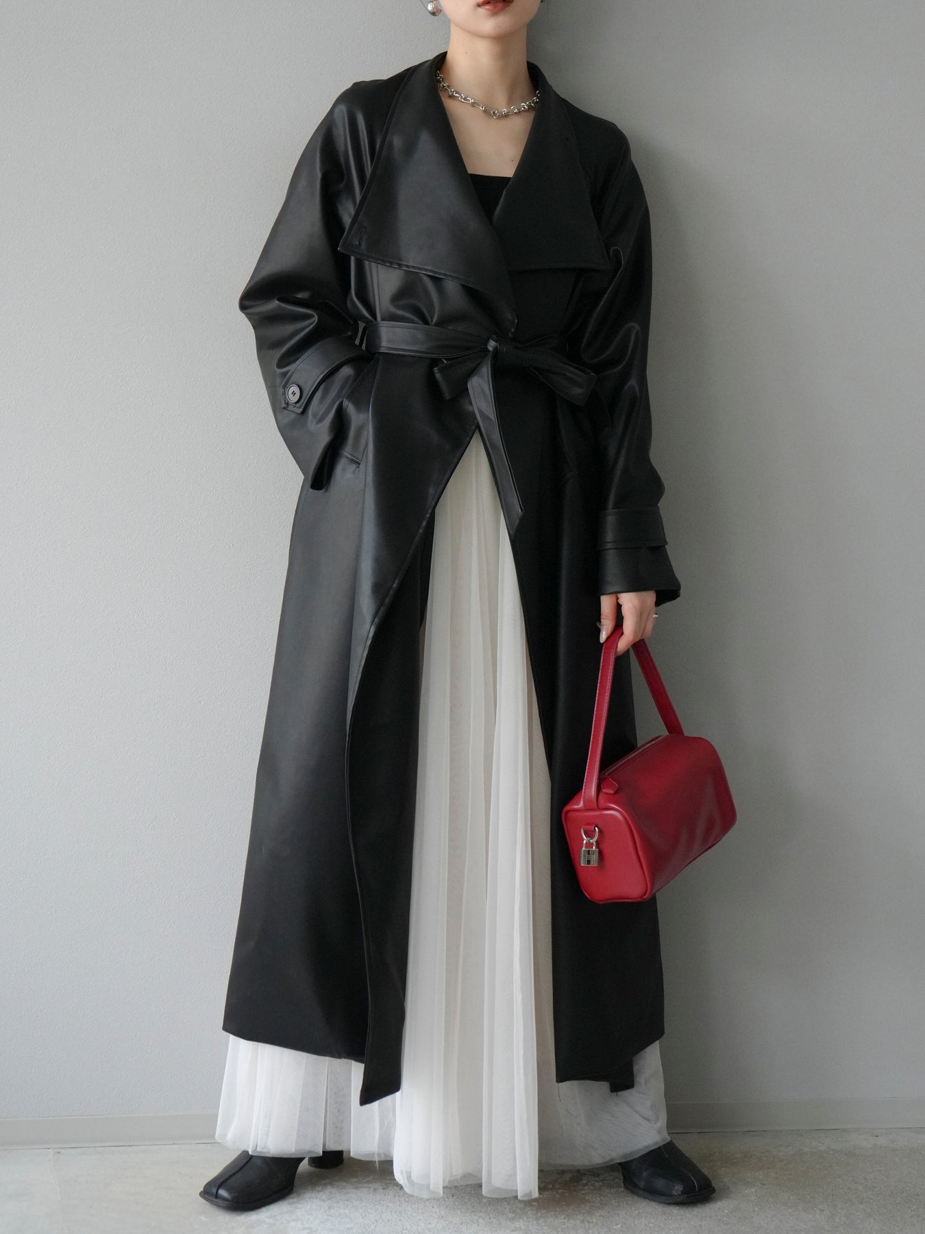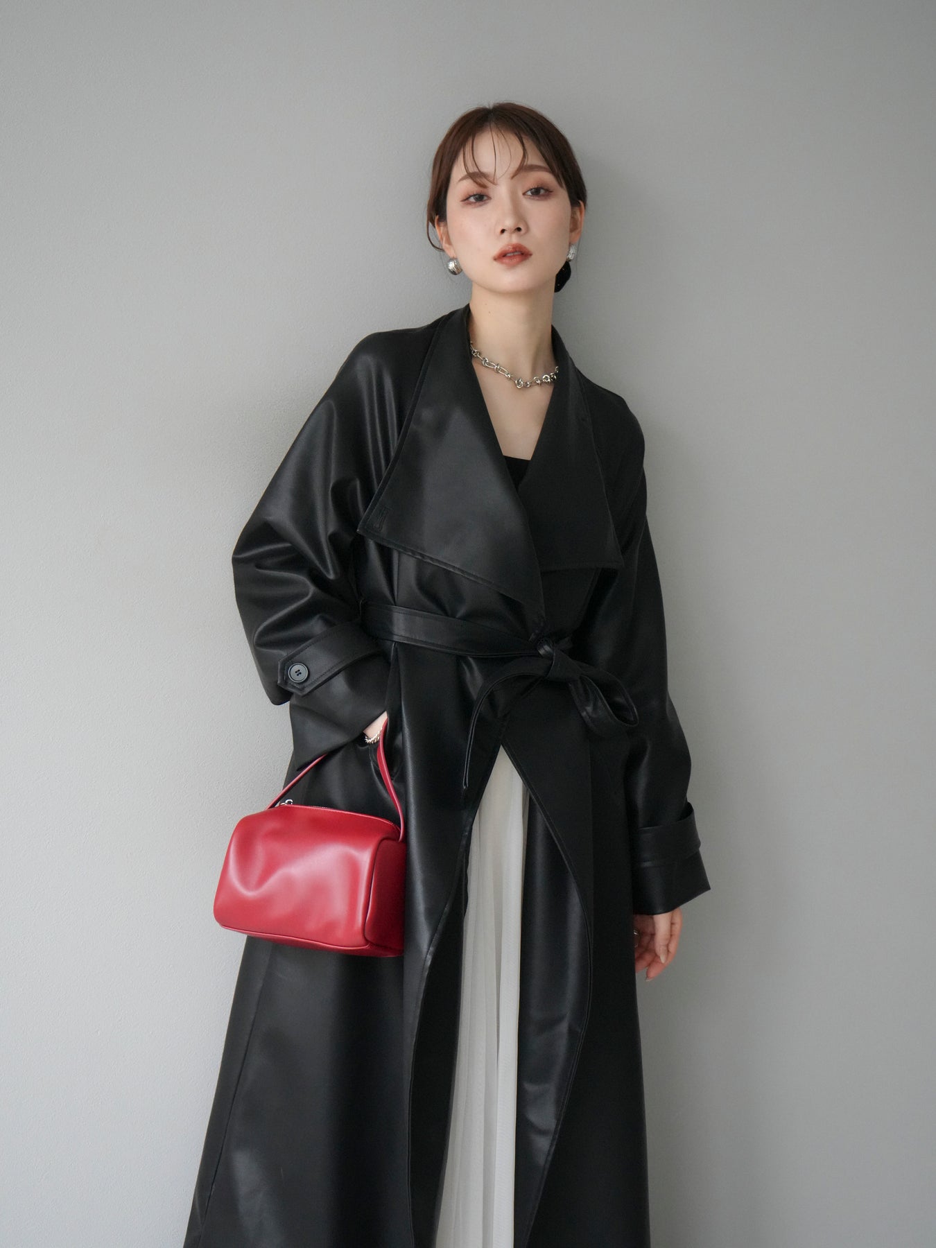 存在感のある大きめのカラーが印象的なレザーロングコート。滑らかなレザー調素材が高級感を引き立て、羽織るだけでモードなスタイリングが完成します。付属のベルトでウエストマークすればシルエットにメリハリを加えることができ、さまざまな着こなしを楽しめるデザイン。ロング丈が体全体を包み込み、特別なシーンからデイリースタイルまで幅広く活躍する一着です。 ※ボトムス、キャミソール(インナー)以外の商品は一律でインナーは付属していません。