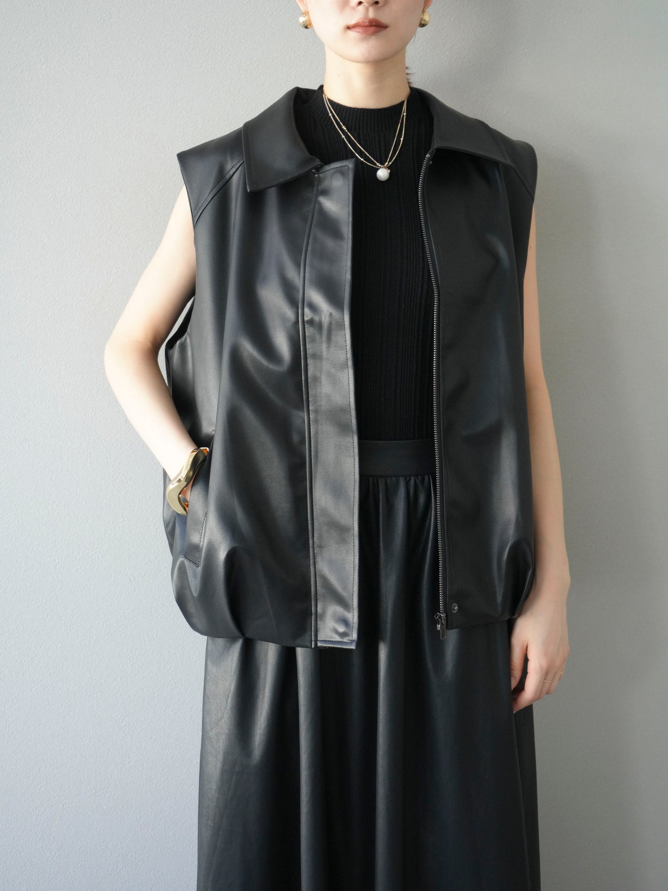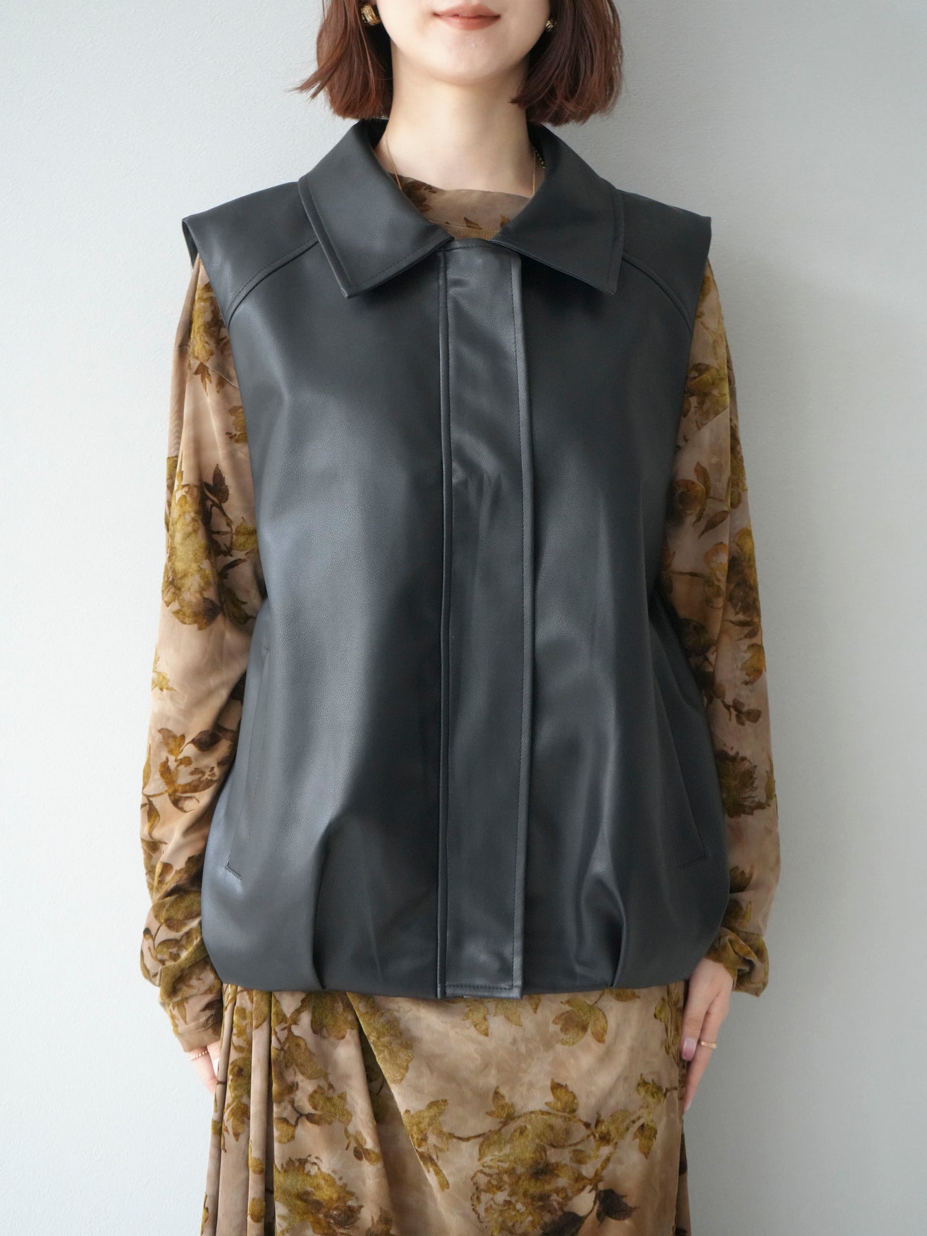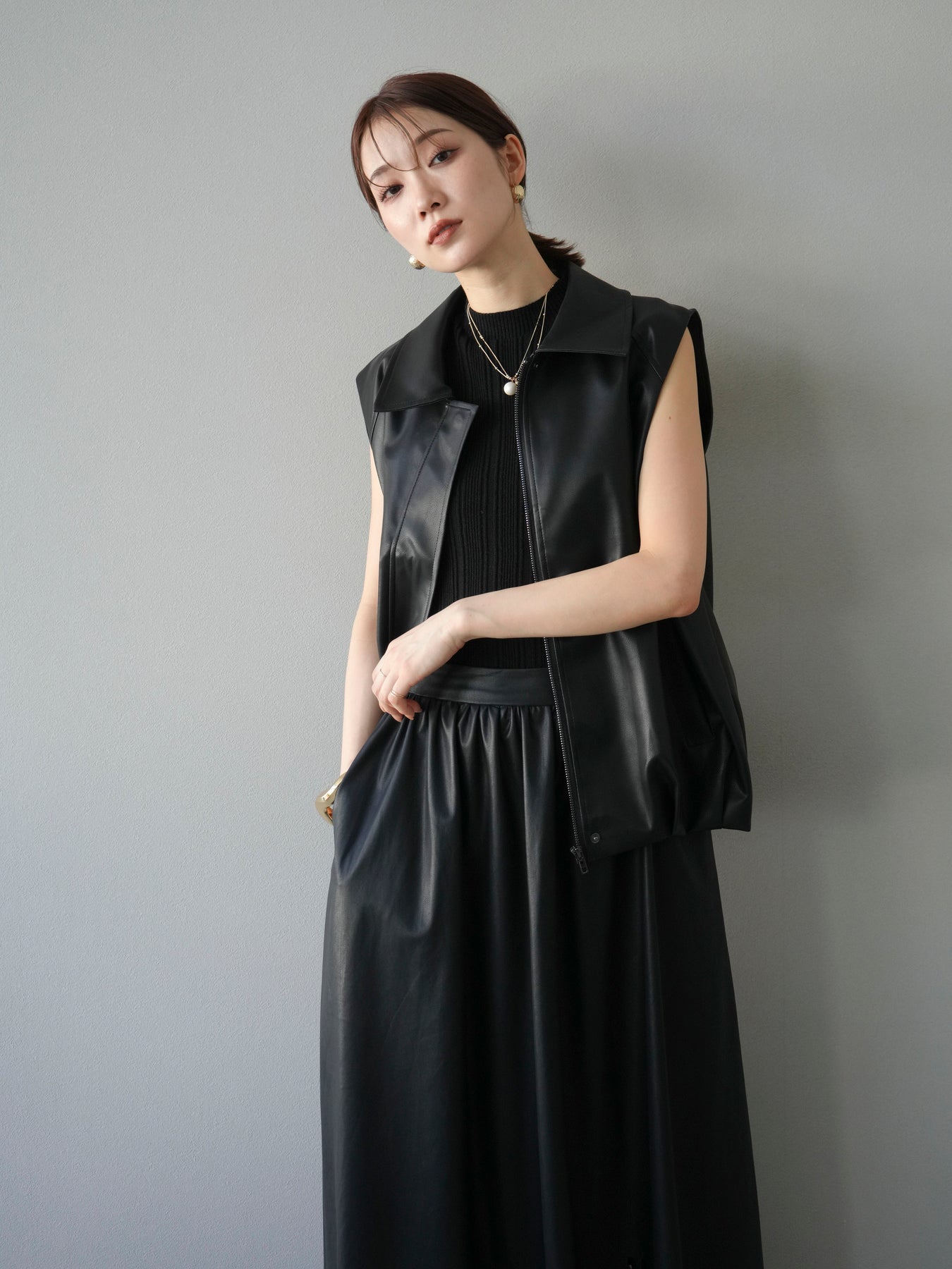 スタイリングにモードな印象を与えるレザーベスト。タックを入れたヘムラインが立体感を生み、シンプルながら存在感のある仕上がりになっています。しっかりとしたレザー調素材がシーズンムードを高め、シャツやワンピースに重ねるだけでコーディネートをアップデート。トレンド感と着回し力を兼ね備えた、今季の主役アイテムです。 ※ボトムス、キャミソール(インナー)以外の商品は一律でインナーは付属していません。