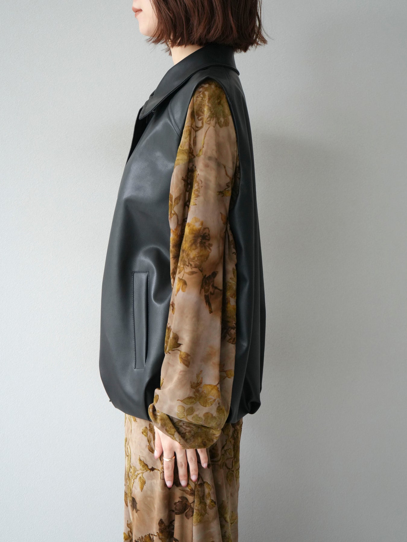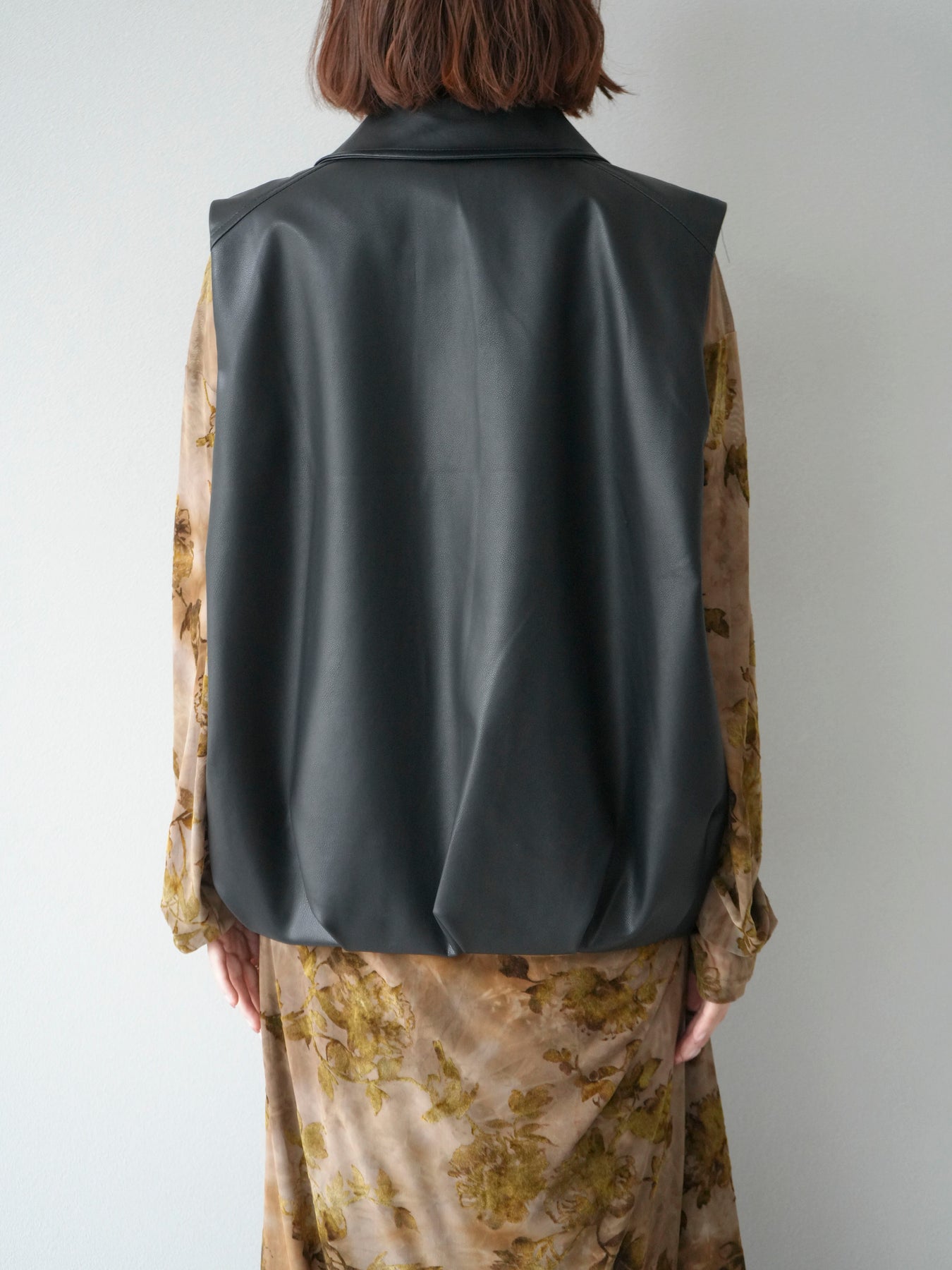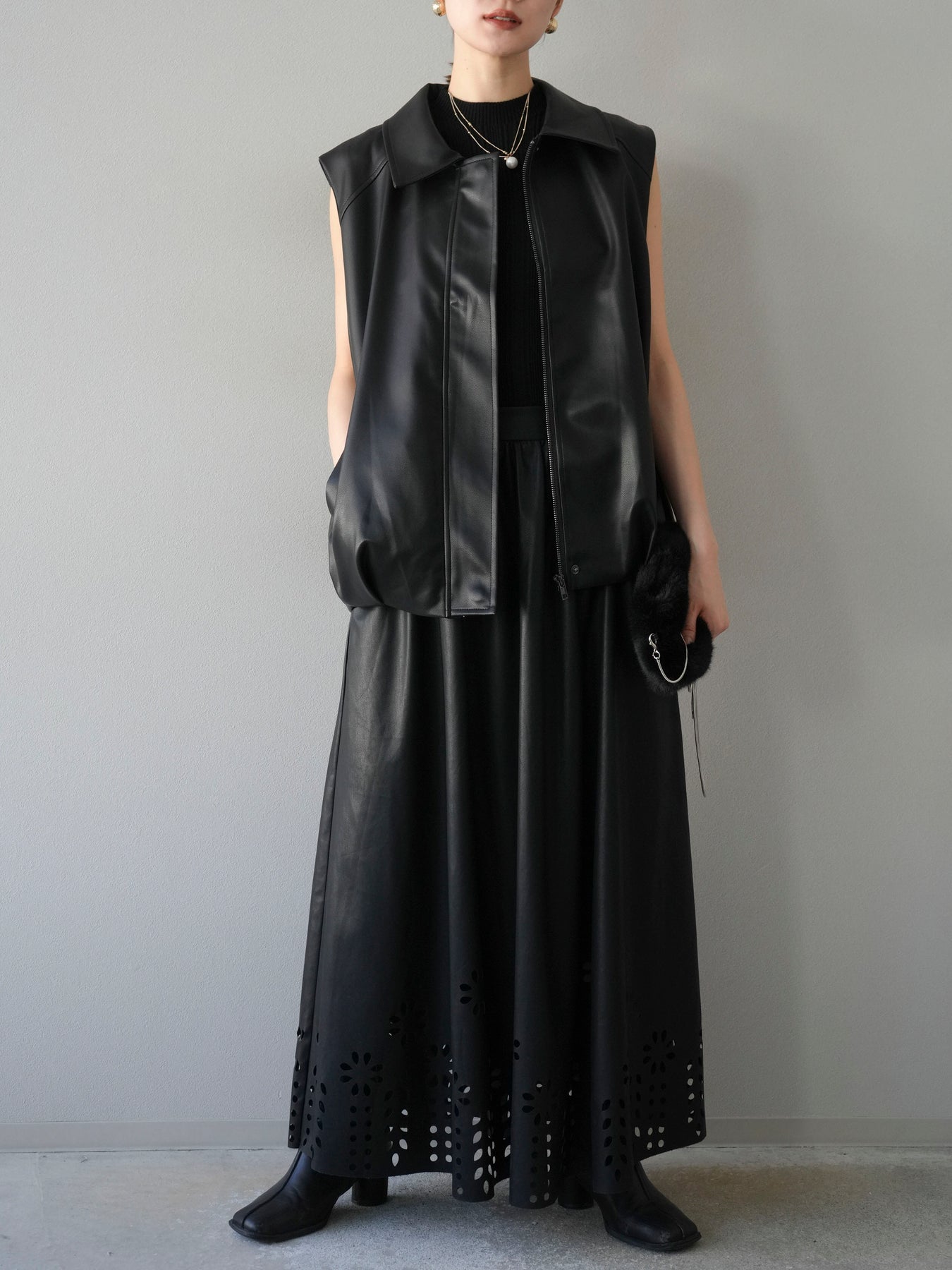 スタイリングにモードな印象を与えるレザーベスト。タックを入れたヘムラインが立体感を生み、シンプルながら存在感のある仕上がりになっています。しっかりとしたレザー調素材がシーズンムードを高め、シャツやワンピースに重ねるだけでコーディネートをアップデート。トレンド感と着回し力を兼ね備えた、今季の主役アイテムです。 ※ボトムス、キャミソール(インナー)以外の商品は一律でインナーは付属していません。
