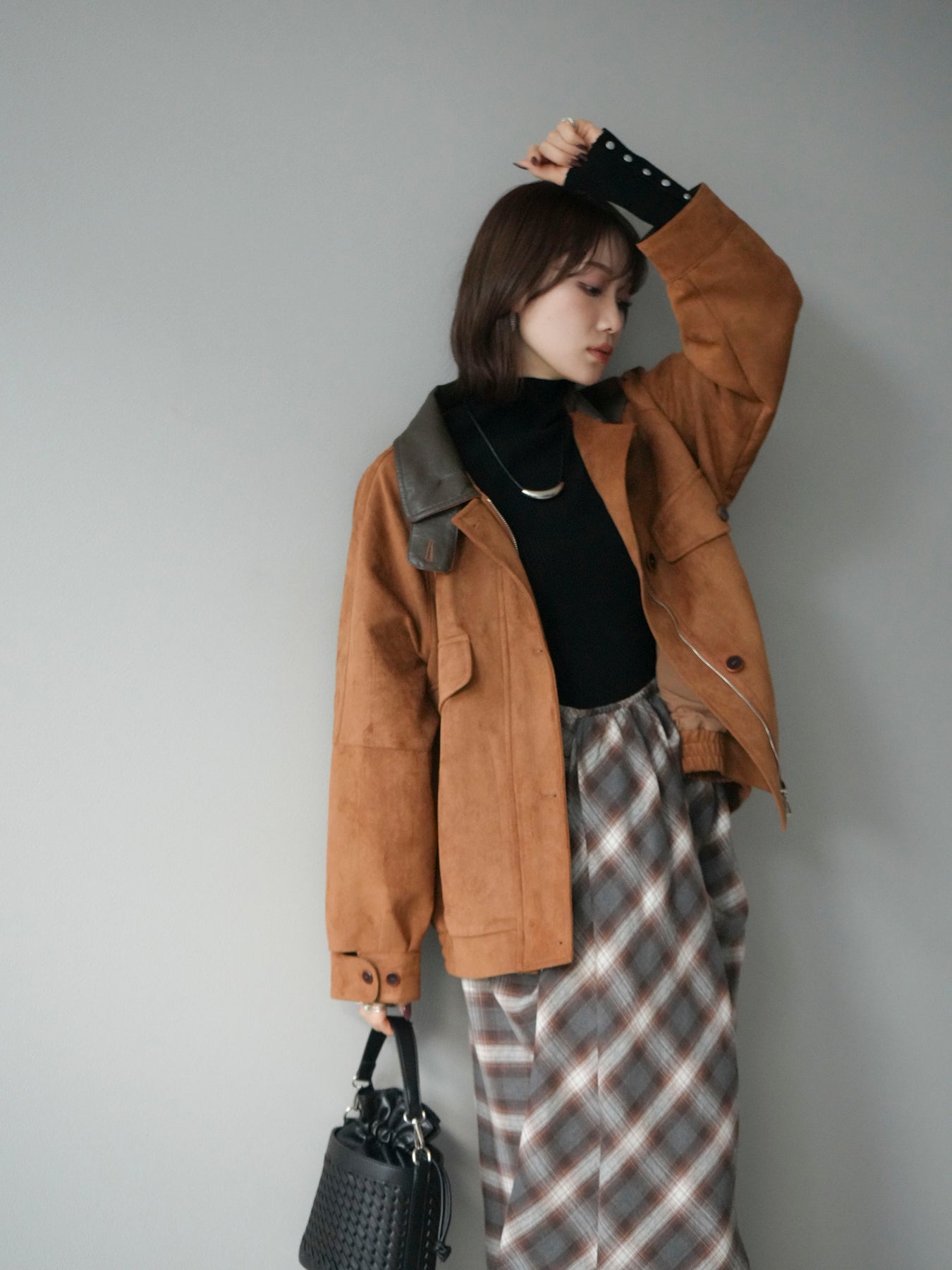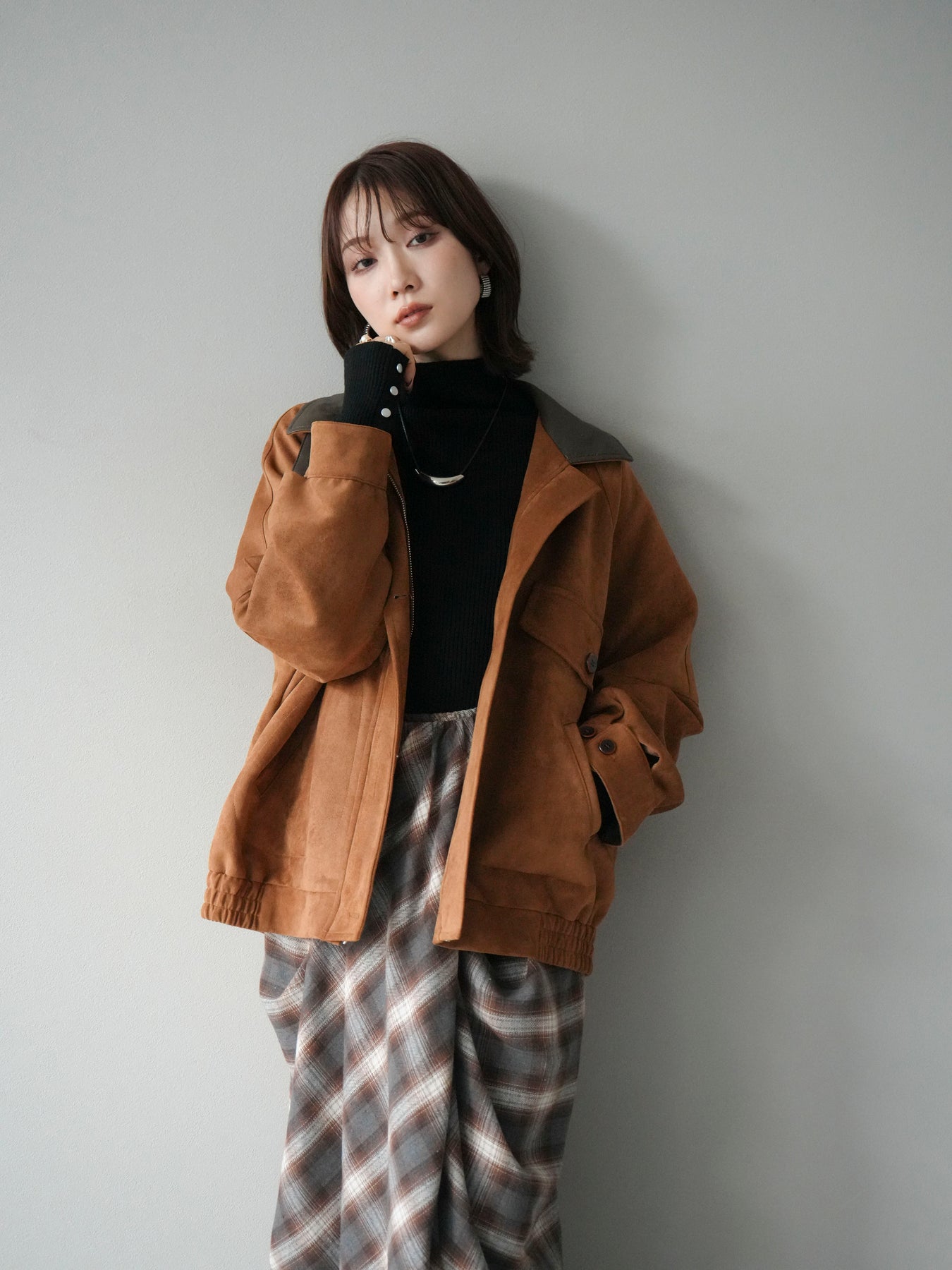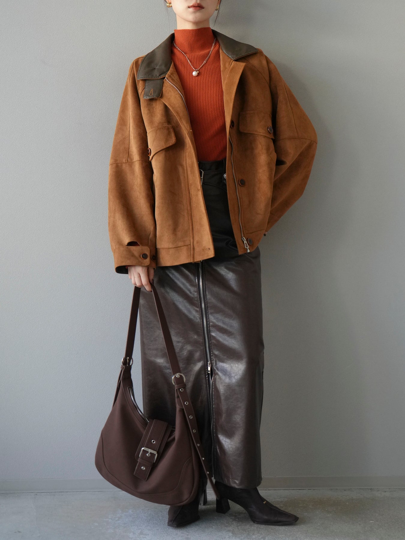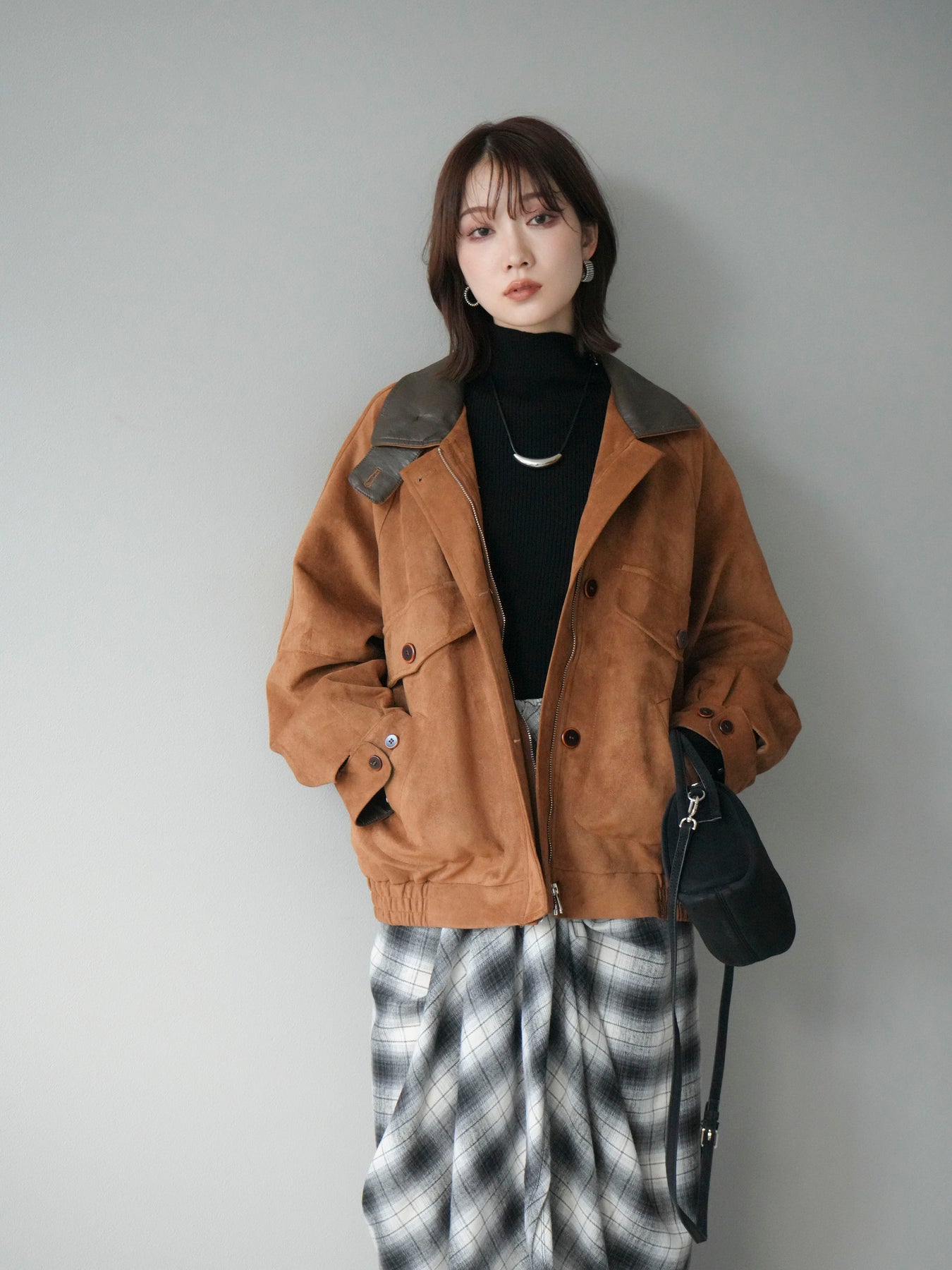 スウェード調素材にレザー襟を組み合わせ、フロントに存在感のあるデザインポケットを施したジャケット。コンパクトな丈感と程よいボリューム感のあるシルエットが、羽織るだけでスタイリングにアクセントを加えてくれます。高めのスタンドネックとフロントボタン仕様で防寒性もあり、秋冬のアウターとして活躍。パンツでメンズライクに、スカートやワンピースで女性らしく着崩してもおしゃれに決まる万能な一着です。 ※ボトムス、キャミソール(インナー)以外の商品は一律でインナーは付属していません。