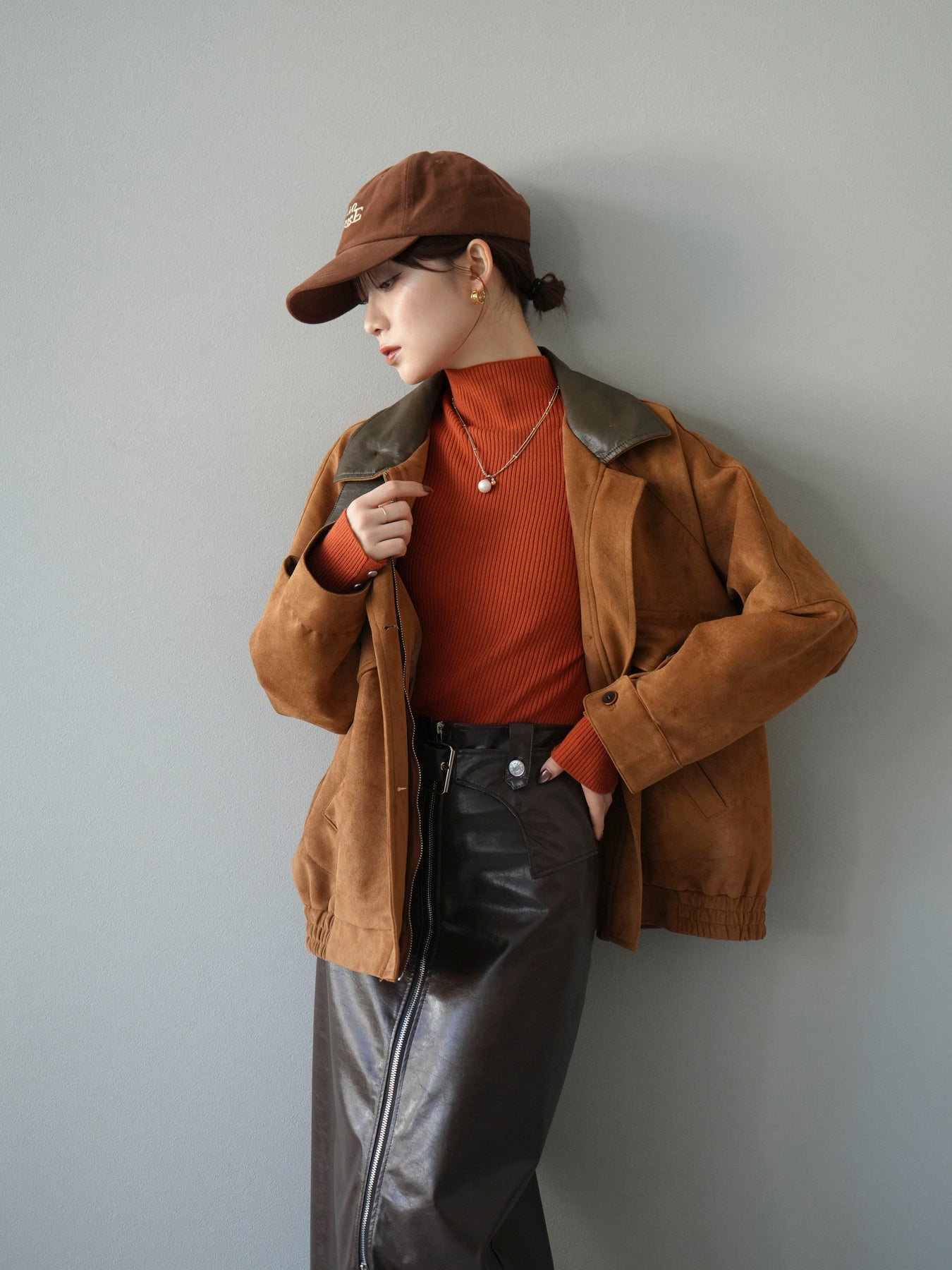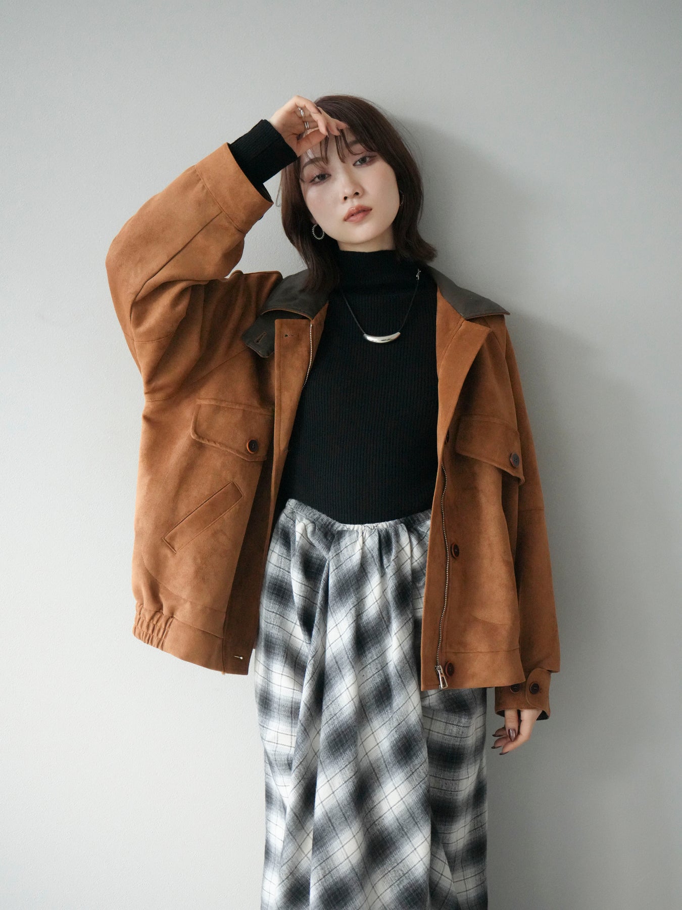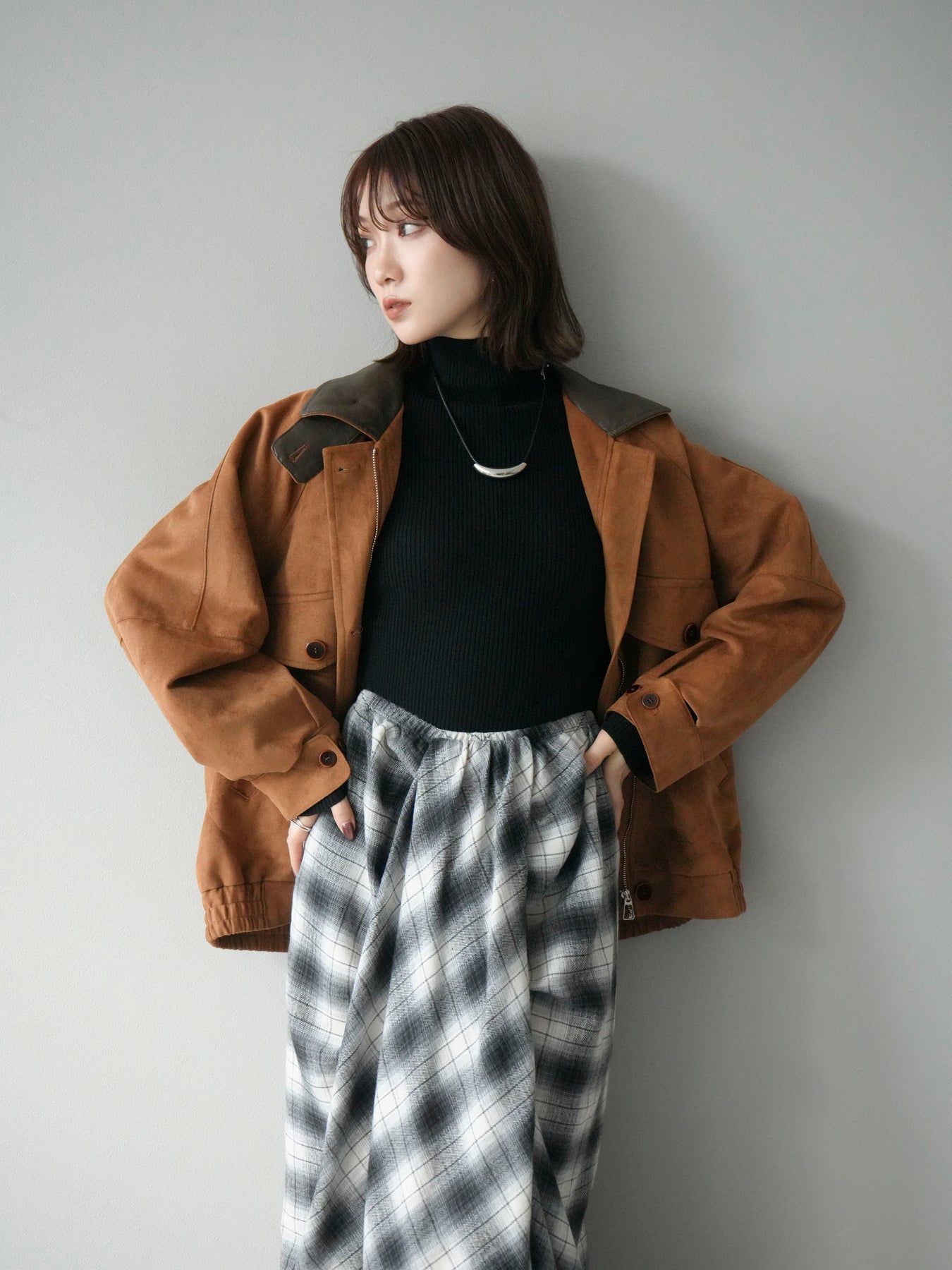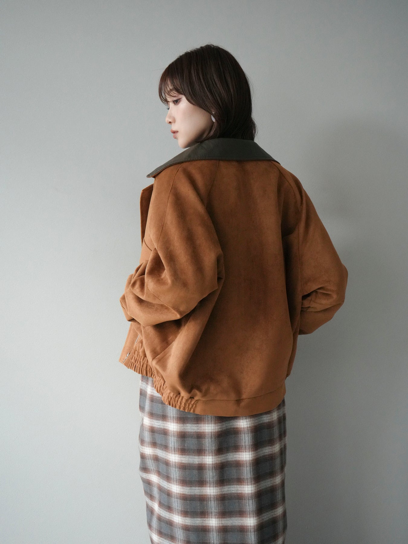 スウェード調素材にレザー襟を組み合わせ、フロントに存在感のあるデザインポケットを施したジャケット。コンパクトな丈感と程よいボリューム感のあるシルエットが、羽織るだけでスタイリングにアクセントを加えてくれます。高めのスタンドネックとフロントボタン仕様で防寒性もあり、秋冬のアウターとして活躍。パンツでメンズライクに、スカートやワンピースで女性らしく着崩してもおしゃれに決まる万能な一着です。 ※ボトムス、キャミソール(インナー)以外の商品は一律でインナーは付属していません。