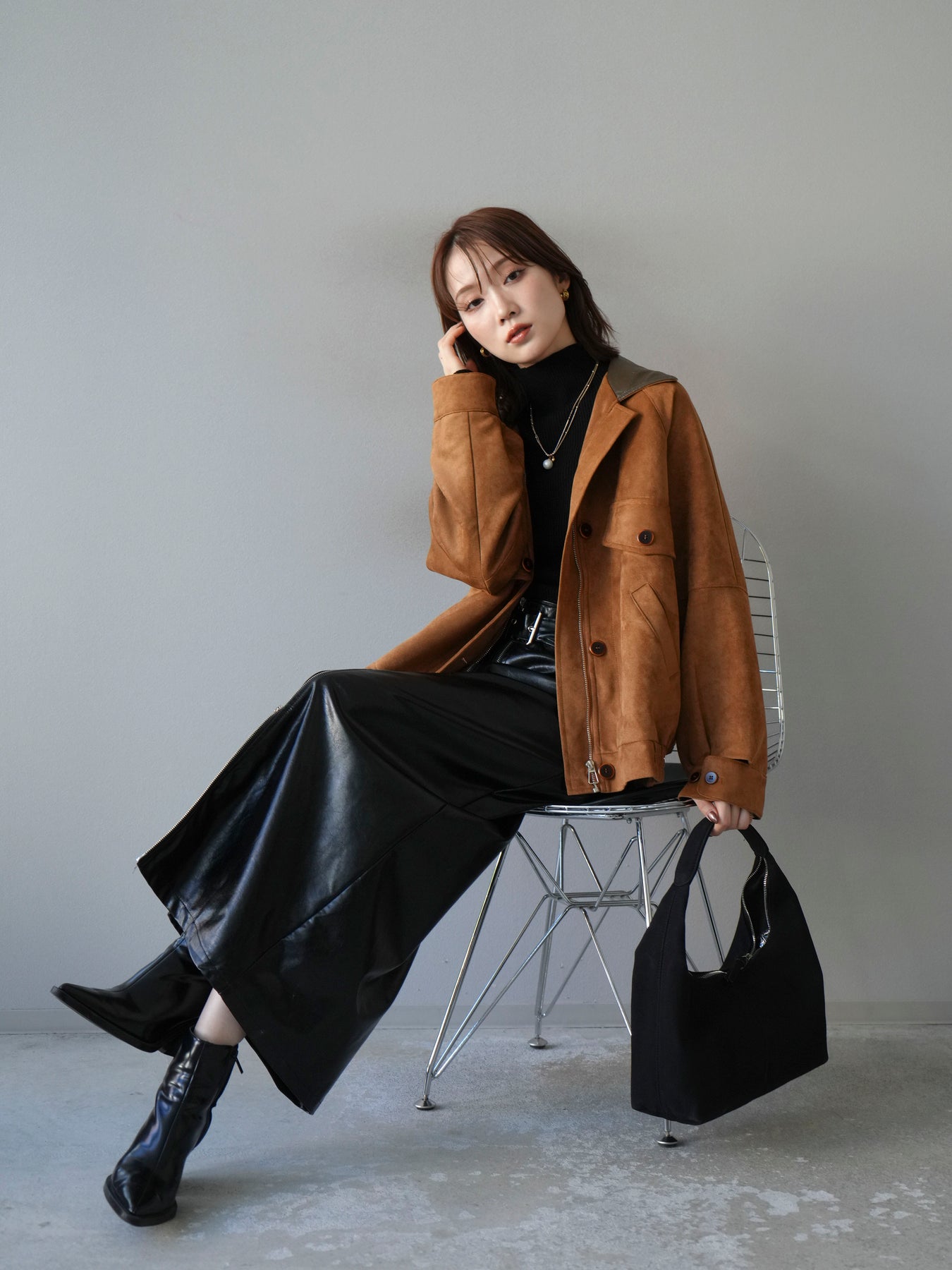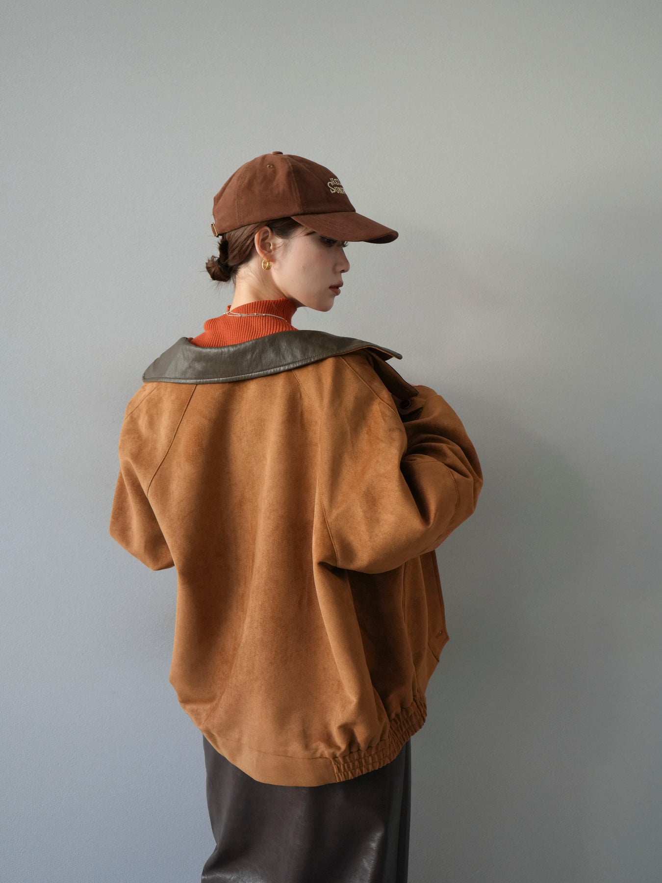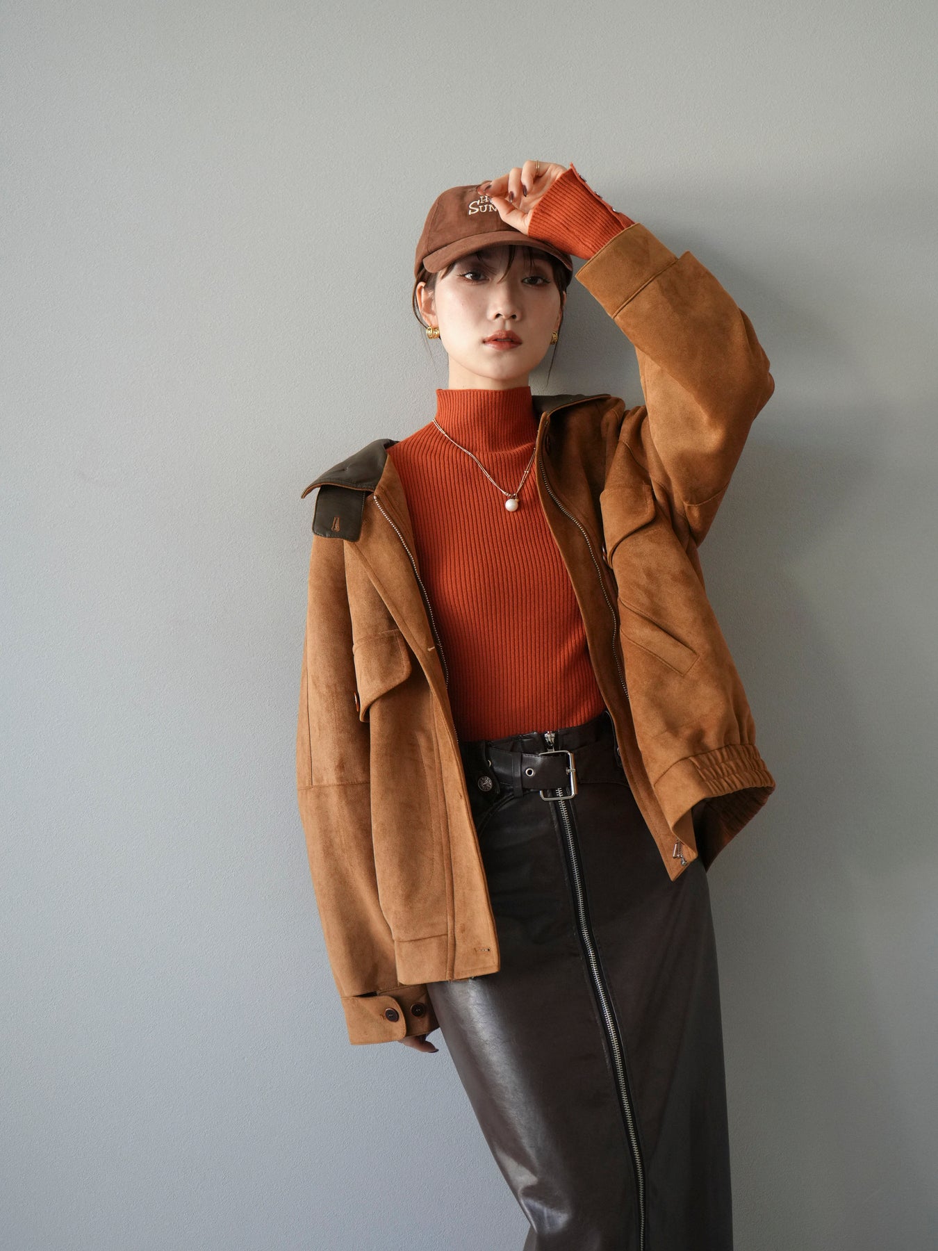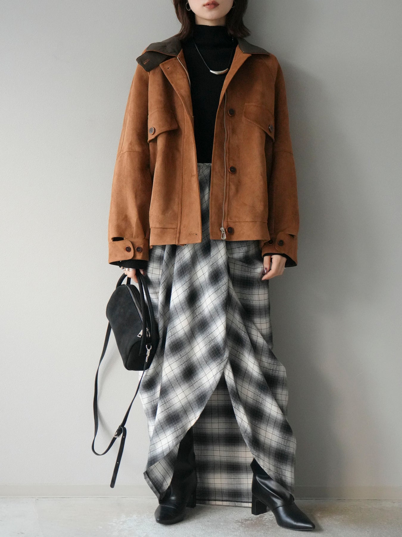 スウェード調素材にレザー襟を組み合わせ、フロントに存在感のあるデザインポケットを施したジャケット。コンパクトな丈感と程よいボリューム感のあるシルエットが、羽織るだけでスタイリングにアクセントを加えてくれます。高めのスタンドネックとフロントボタン仕様で防寒性もあり、秋冬のアウターとして活躍。パンツでメンズライクに、スカートやワンピースで女性らしく着崩してもおしゃれに決まる万能な一着です。 ※ボトムス、キャミソール(インナー)以外の商品は一律でインナーは付属していません。