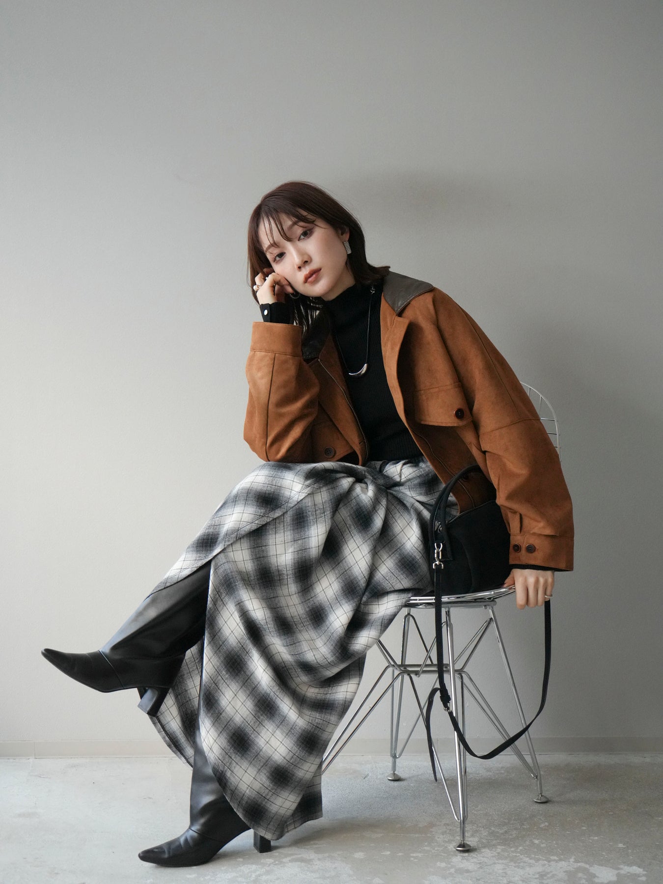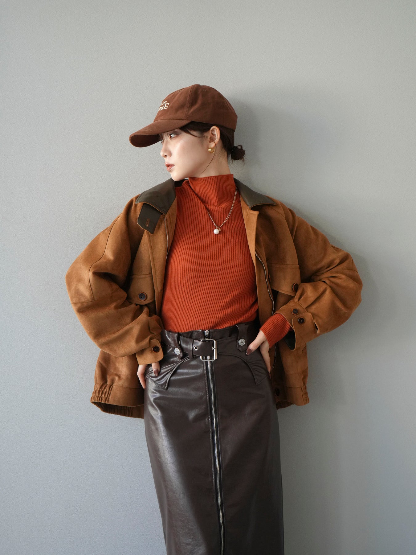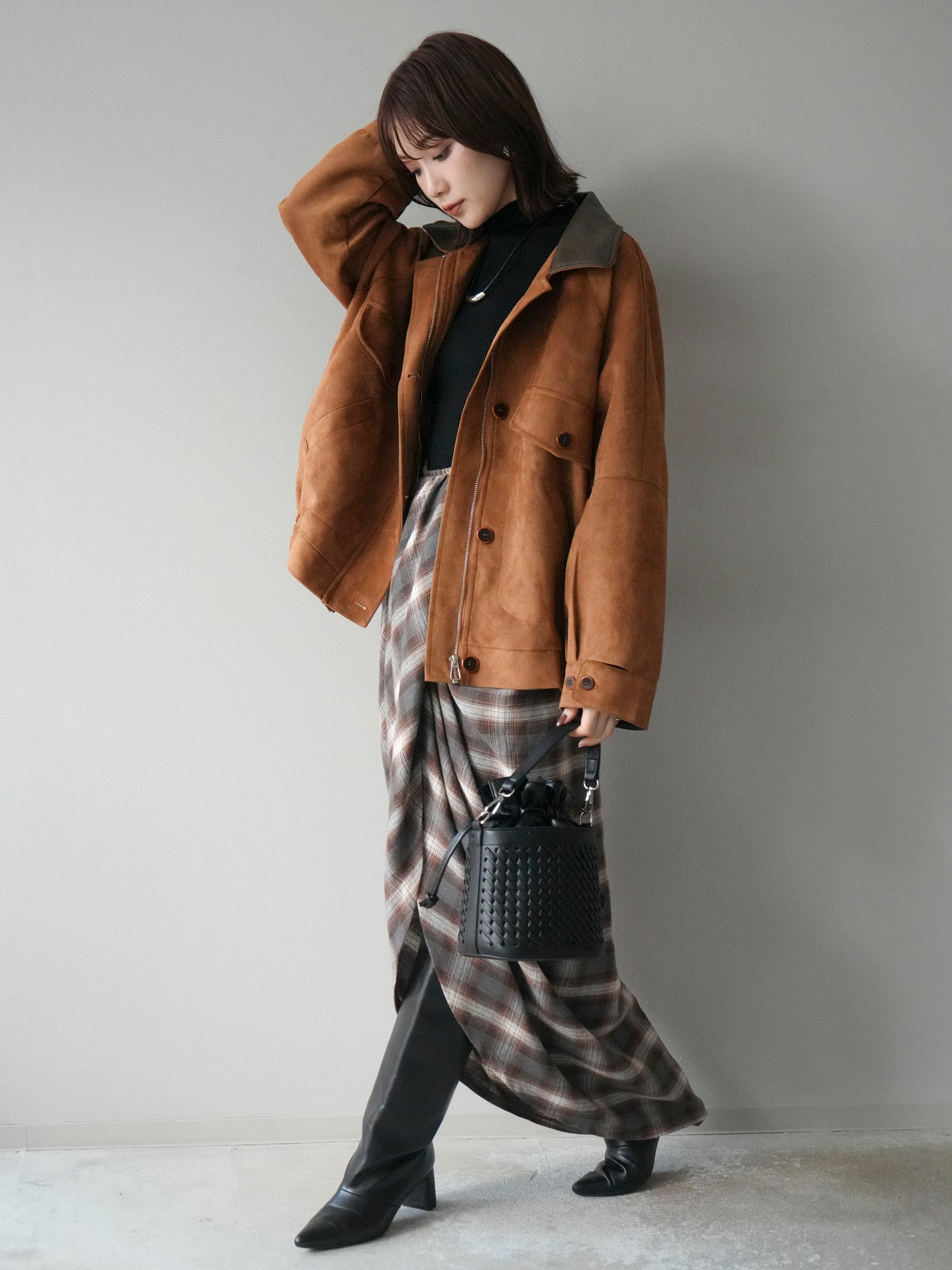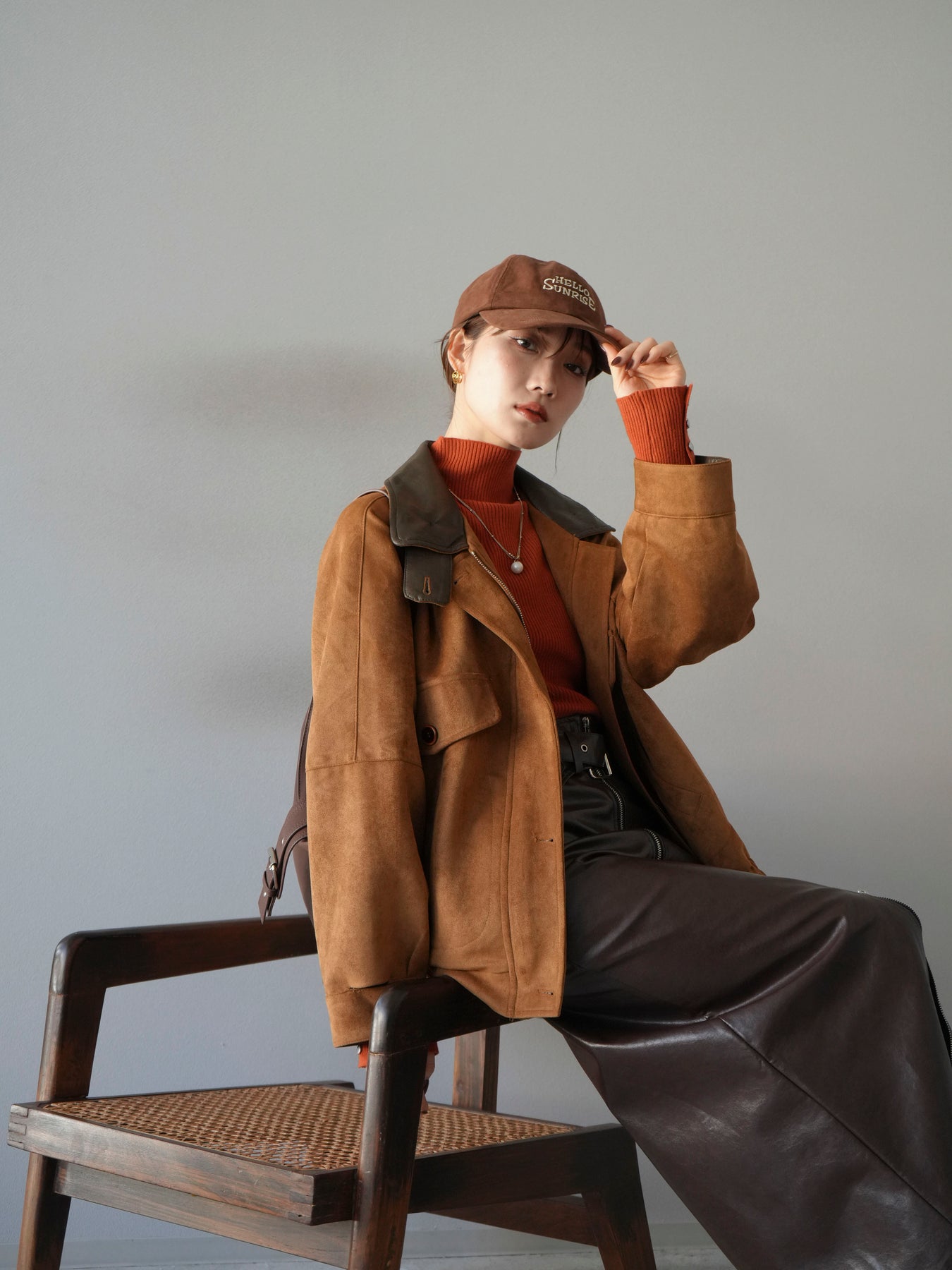 スウェード調素材にレザー襟を組み合わせ、フロントに存在感のあるデザインポケットを施したジャケット。コンパクトな丈感と程よいボリューム感のあるシルエットが、羽織るだけでスタイリングにアクセントを加えてくれます。高めのスタンドネックとフロントボタン仕様で防寒性もあり、秋冬のアウターとして活躍。パンツでメンズライクに、スカートやワンピースで女性らしく着崩してもおしゃれに決まる万能な一着です。 ※ボトムス、キャミソール(インナー)以外の商品は一律でインナーは付属していません。