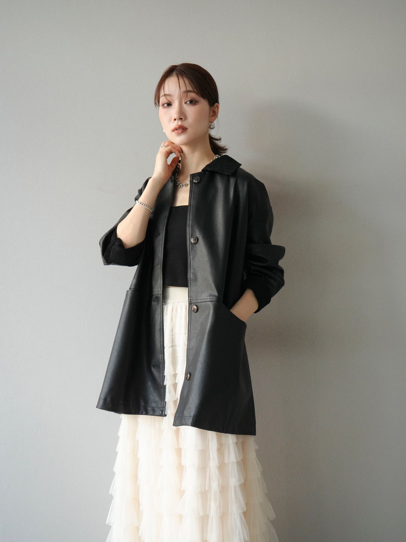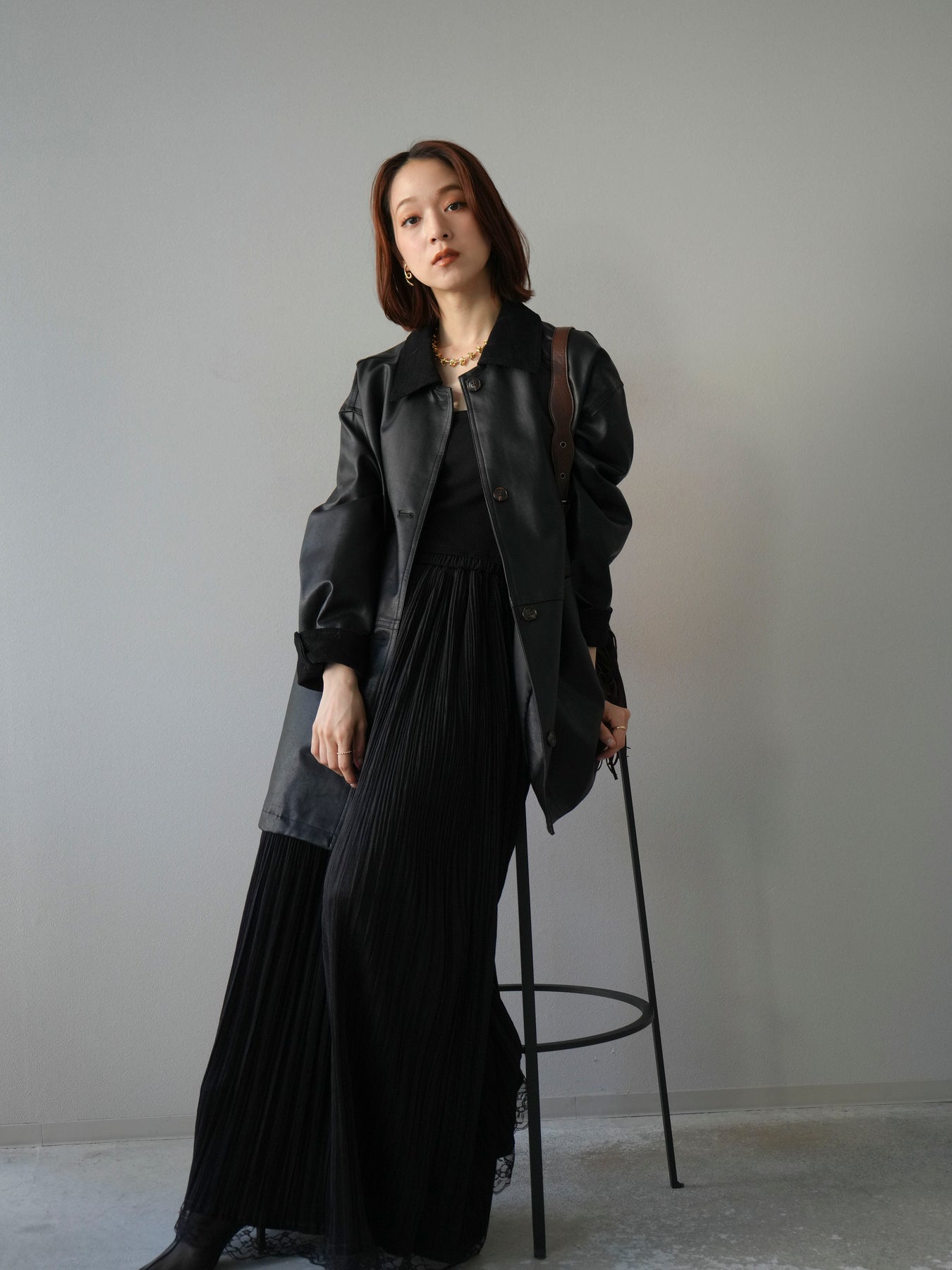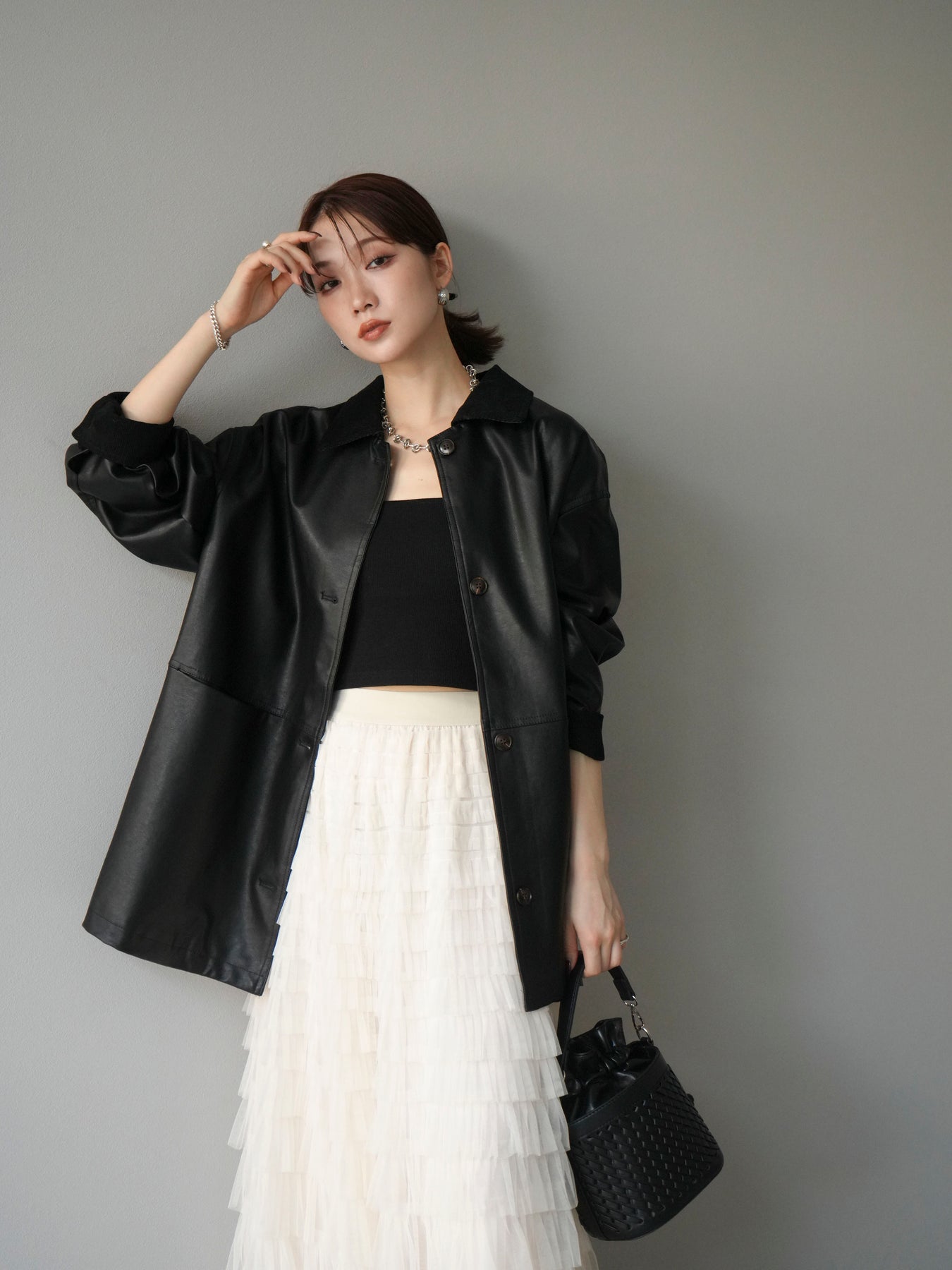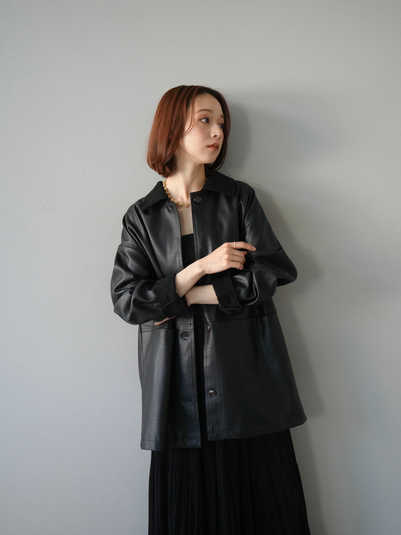 シンプルながらも存在感のあるステンカラーシルエットに、レザーの質感とコーデュロイ襟を組み合わせた一着。ほどよいオーバーサイズ感で、羽織るだけで洗練された印象を与えてくれます。フロントの大きめボタンや深めのポケットがアクセントになり、デザイン性と実用性を両立。カジュアルからモードなスタイルまで幅広く活躍し、季節の変わり目にも重宝するジャケットです。シンプルなコーディネートに取り入れるだけで、こなれた雰囲気を演出できます。 ※ボトムス、キャミソール(インナー)以外の商品は一律でインナーは付属していません。