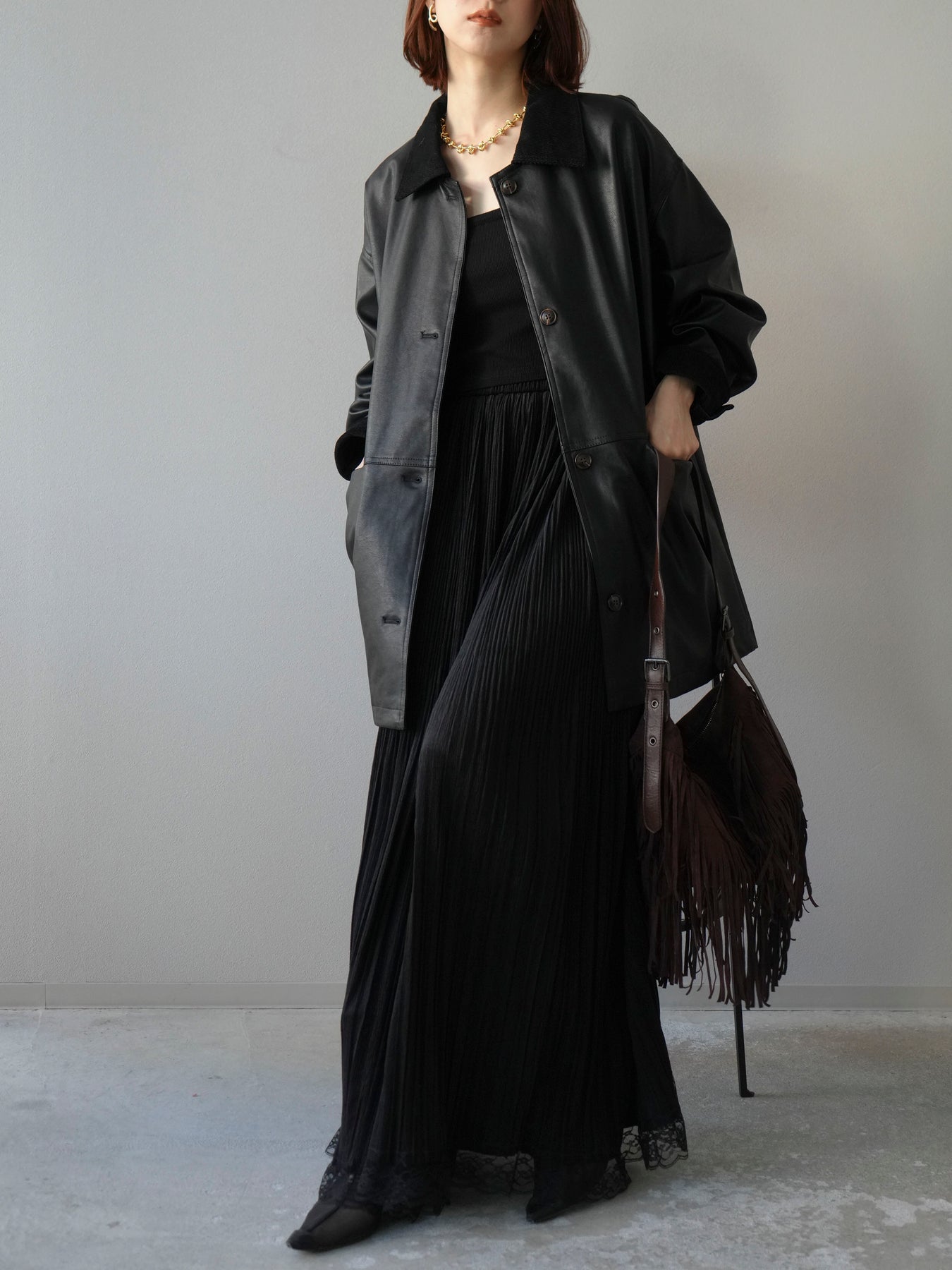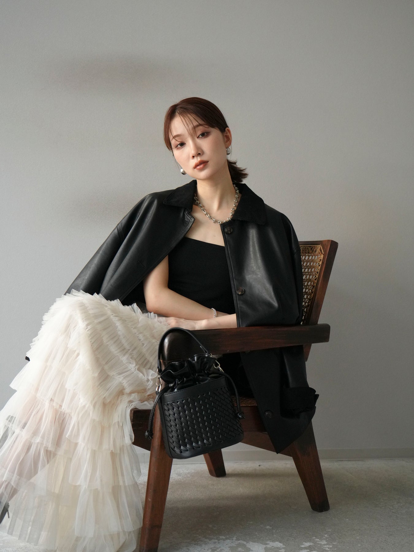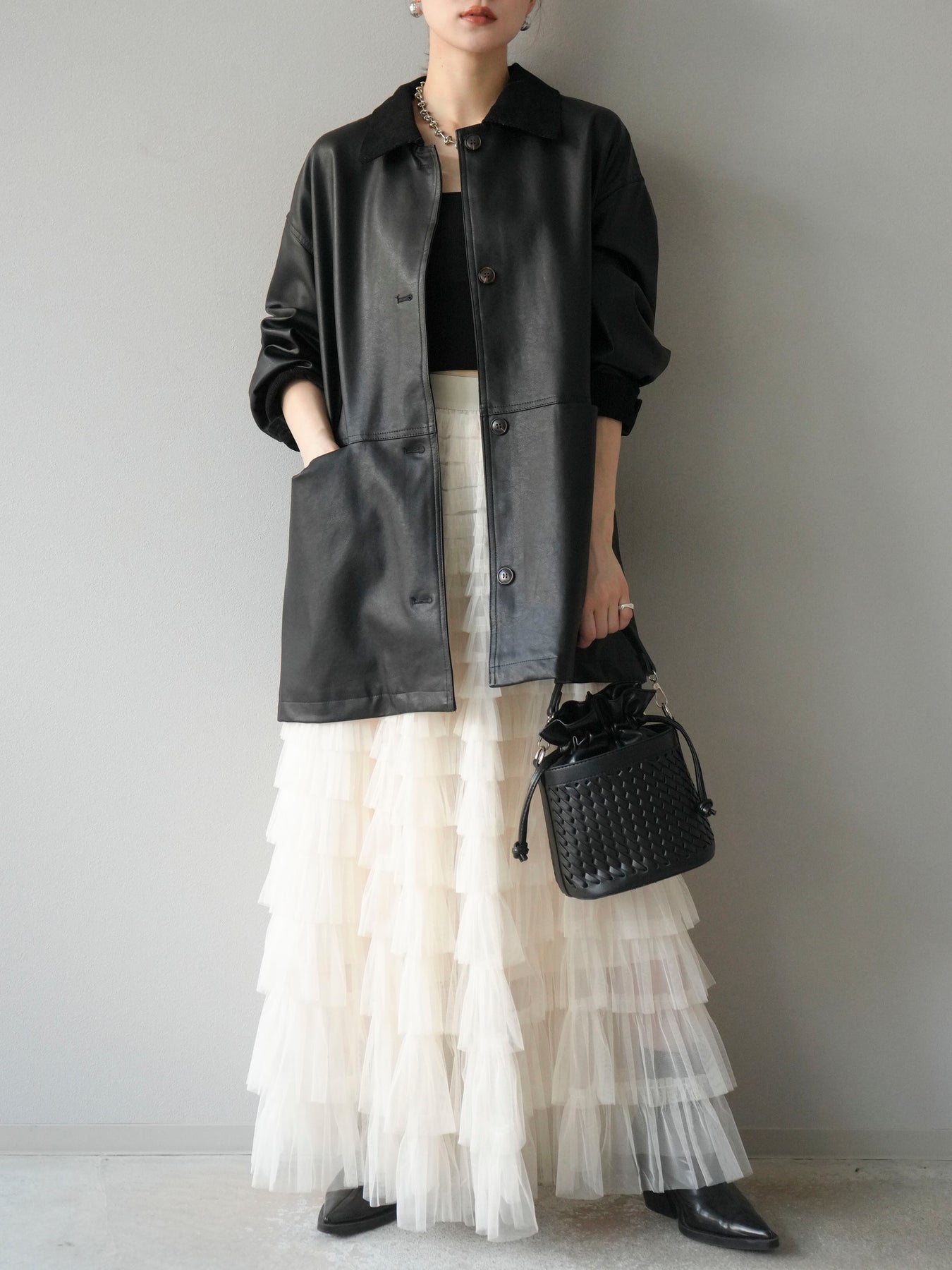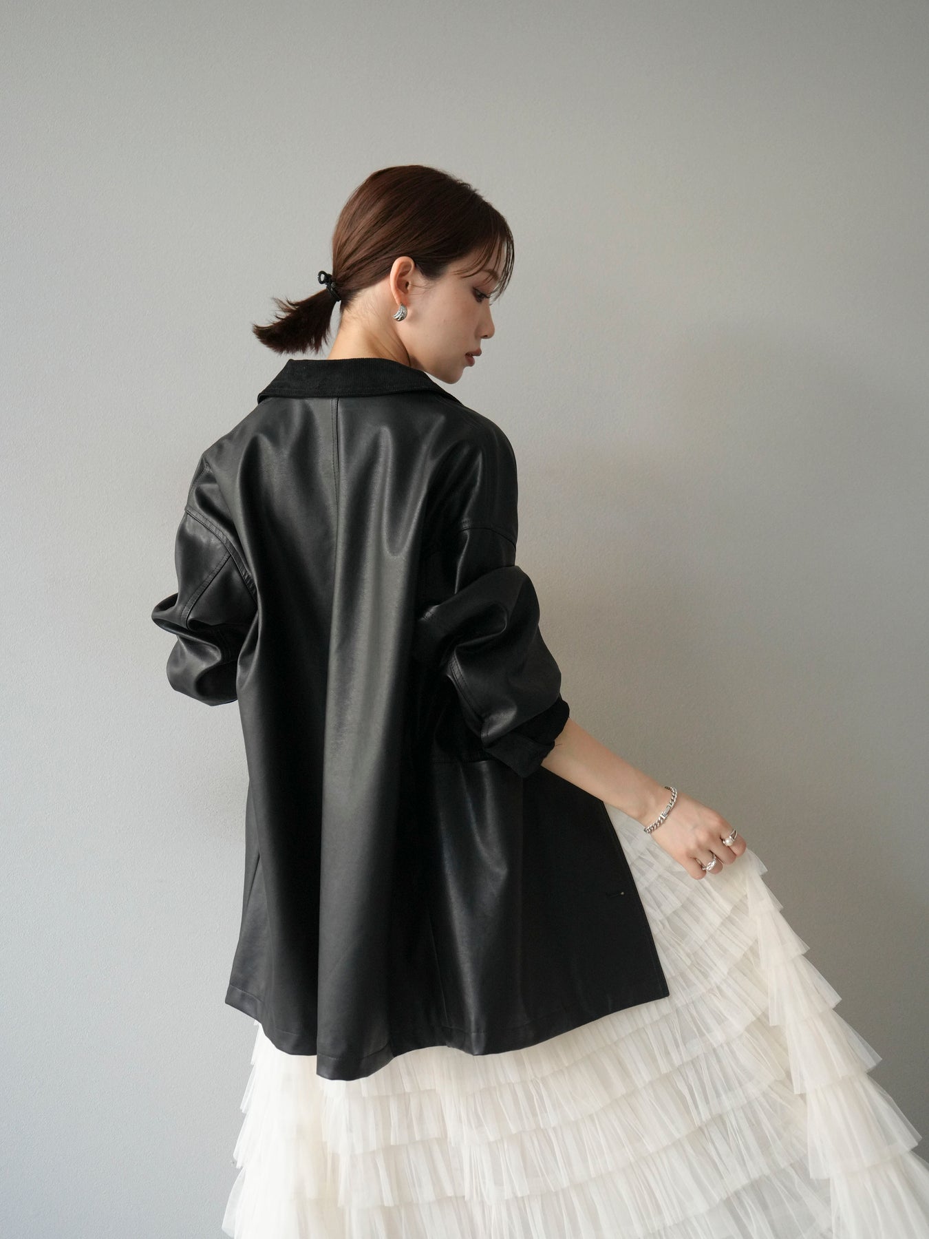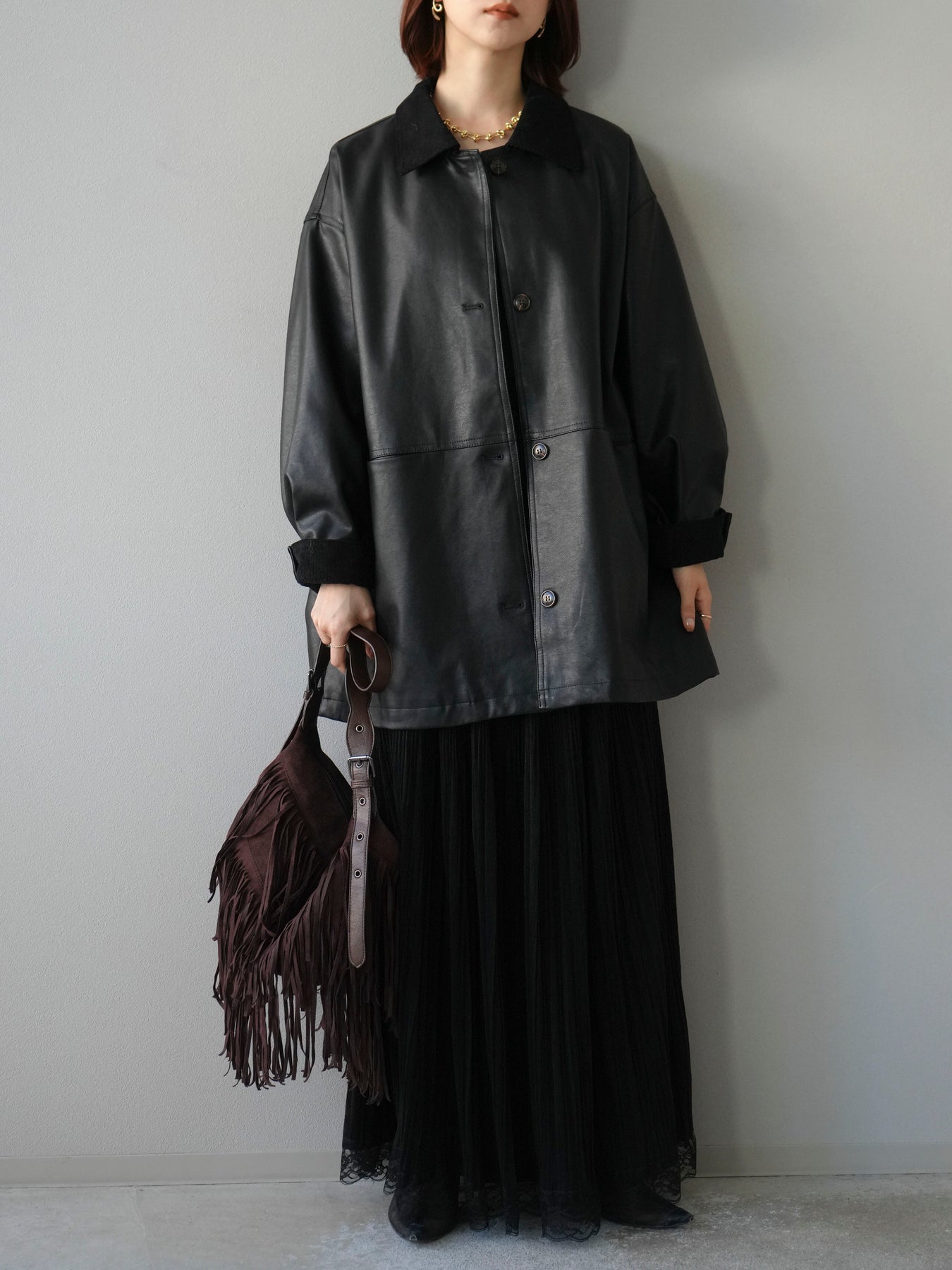 シンプルながらも存在感のあるステンカラーシルエットに、レザーの質感とコーデュロイ襟を組み合わせた一着。ほどよいオーバーサイズ感で、羽織るだけで洗練された印象を与えてくれます。フロントの大きめボタンや深めのポケットがアクセントになり、デザイン性と実用性を両立。カジュアルからモードなスタイルまで幅広く活躍し、季節の変わり目にも重宝するジャケットです。シンプルなコーディネートに取り入れるだけで、こなれた雰囲気を演出できます。 ※ボトムス、キャミソール(インナー)以外の商品は一律でインナーは付属していません。