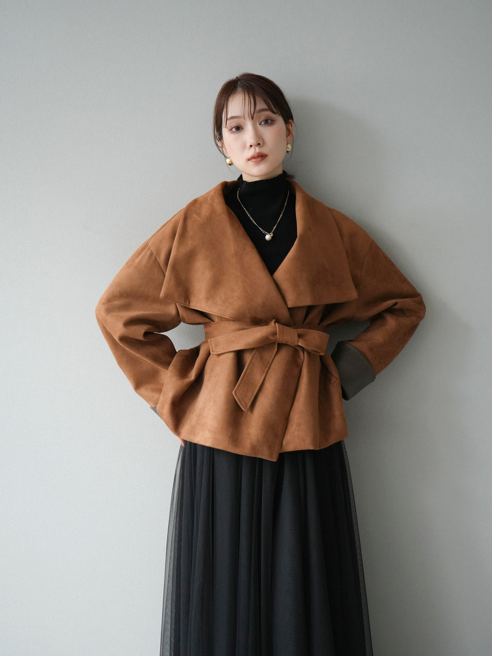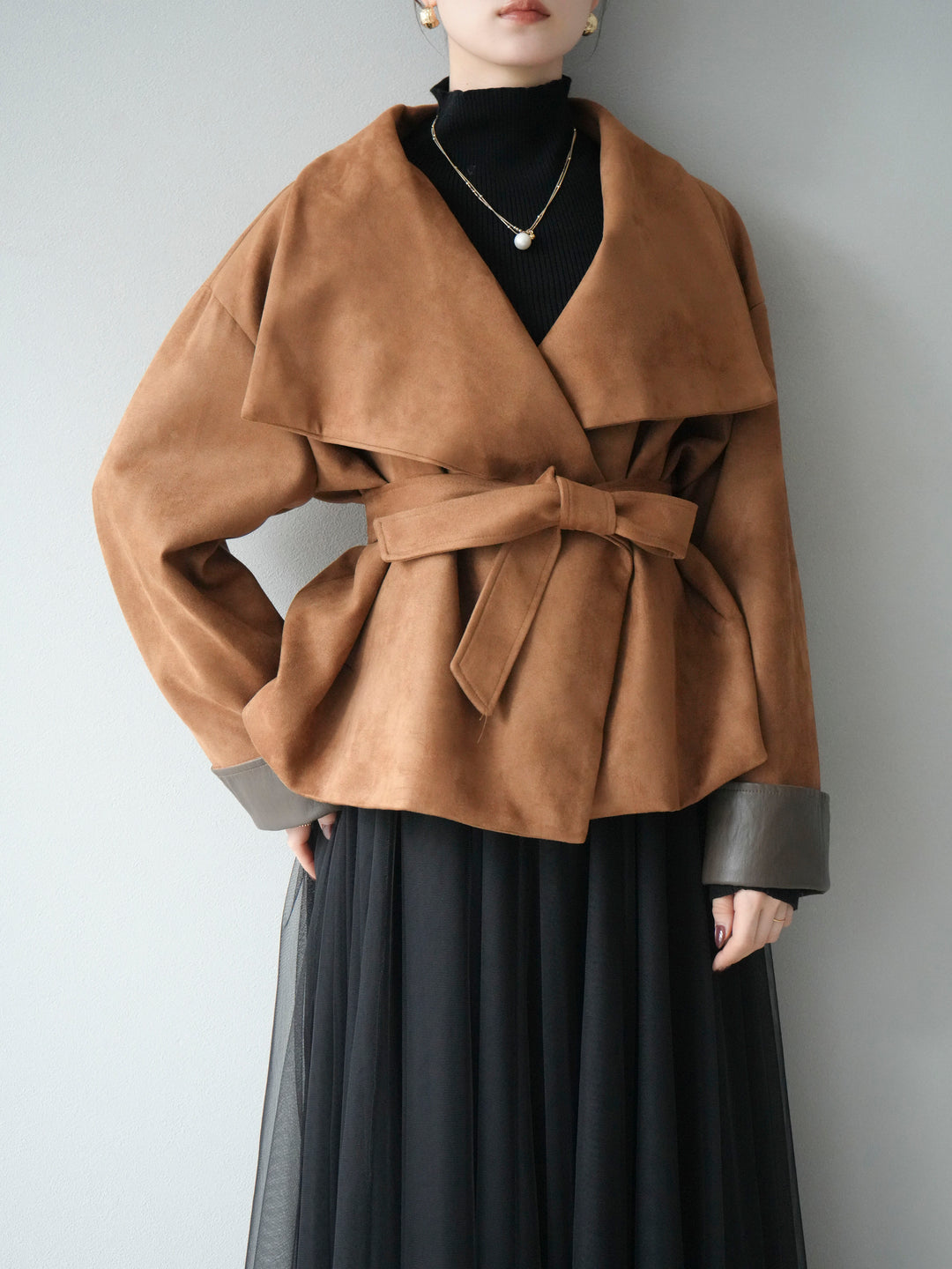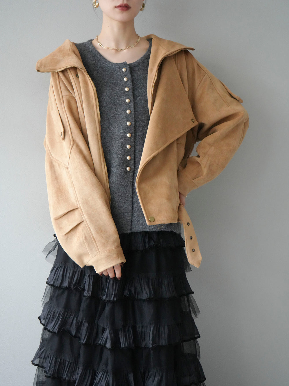 [予約]デザインポケットレザー襟スウェードジャケット/キャメル