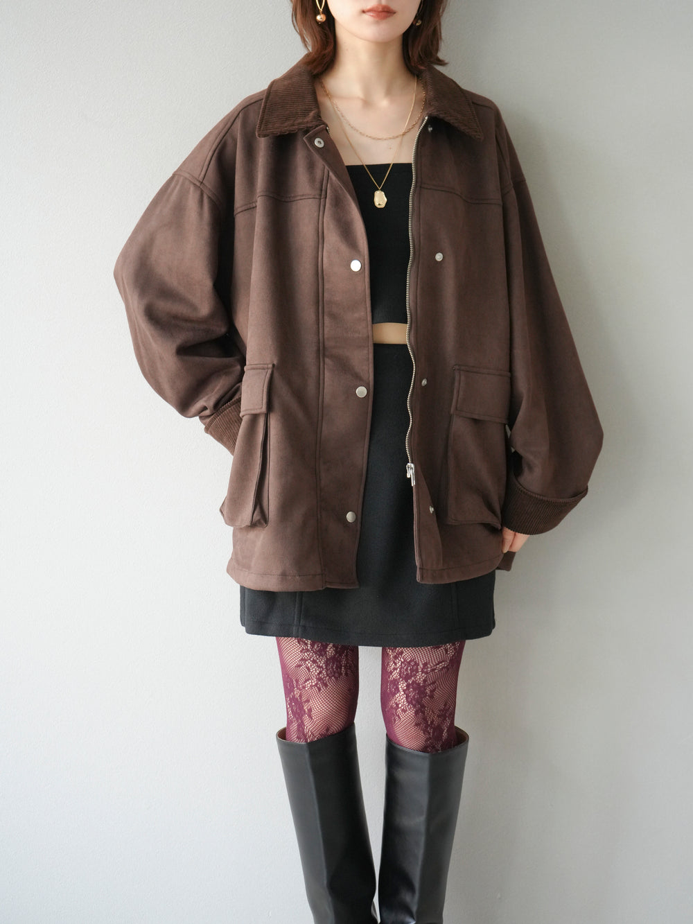 [予約]コーデュロイ襟スウェードミドルジャケット /ブラック
