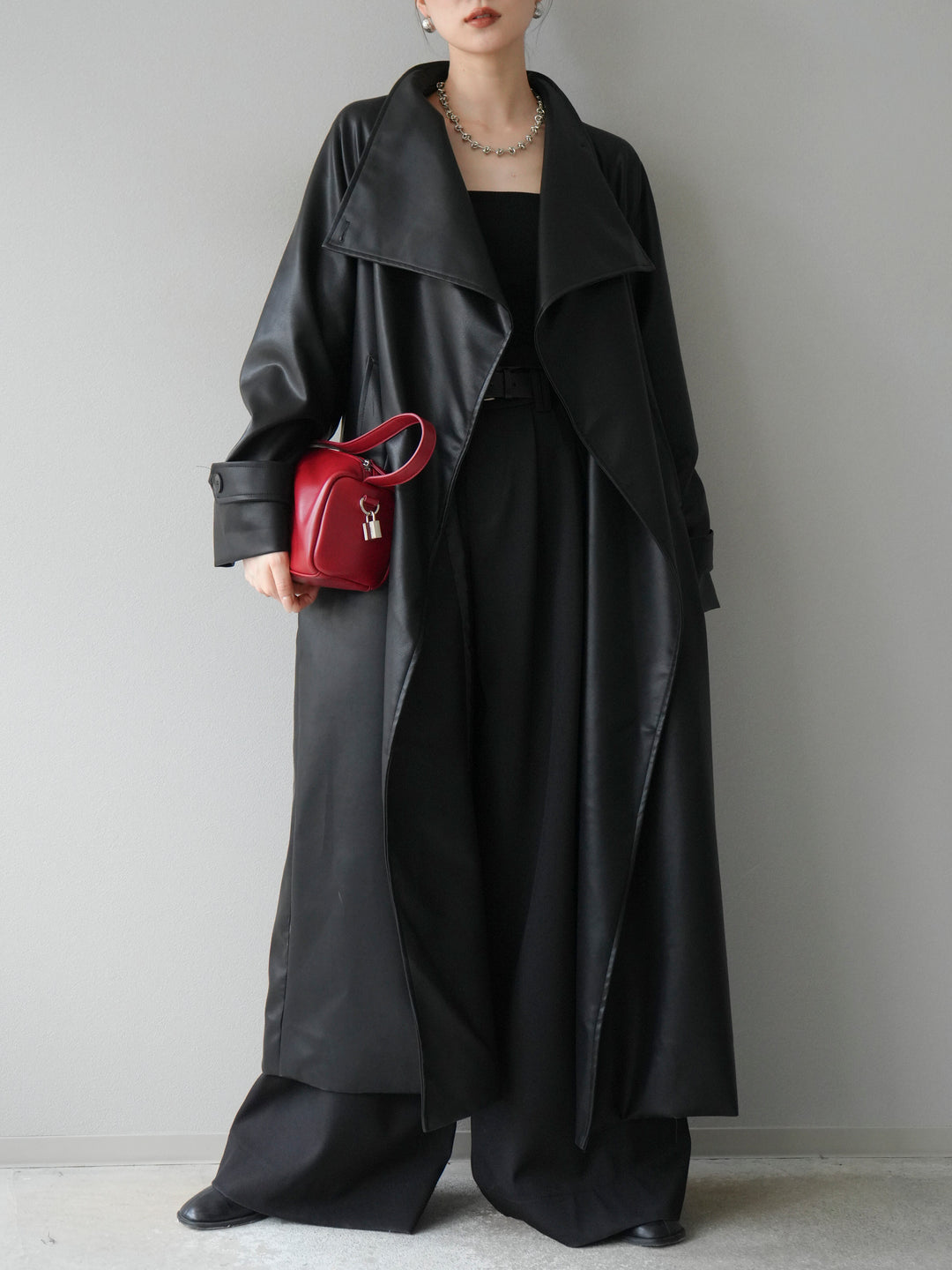 [予約]BIGカラーレザーロングコート/ブラック