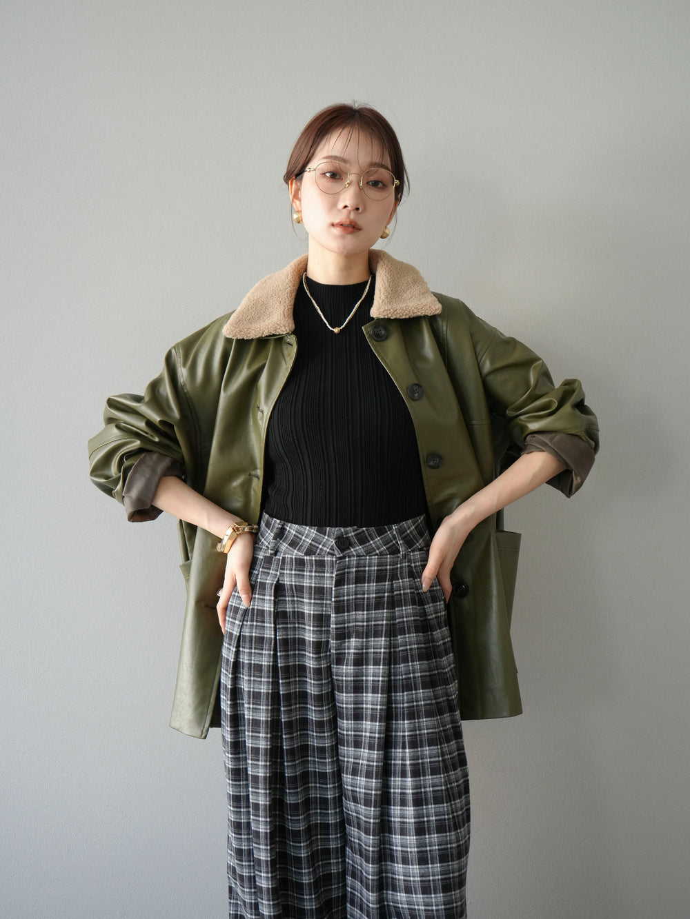 [予約]襟ボアレザーブルゾン/カーキ