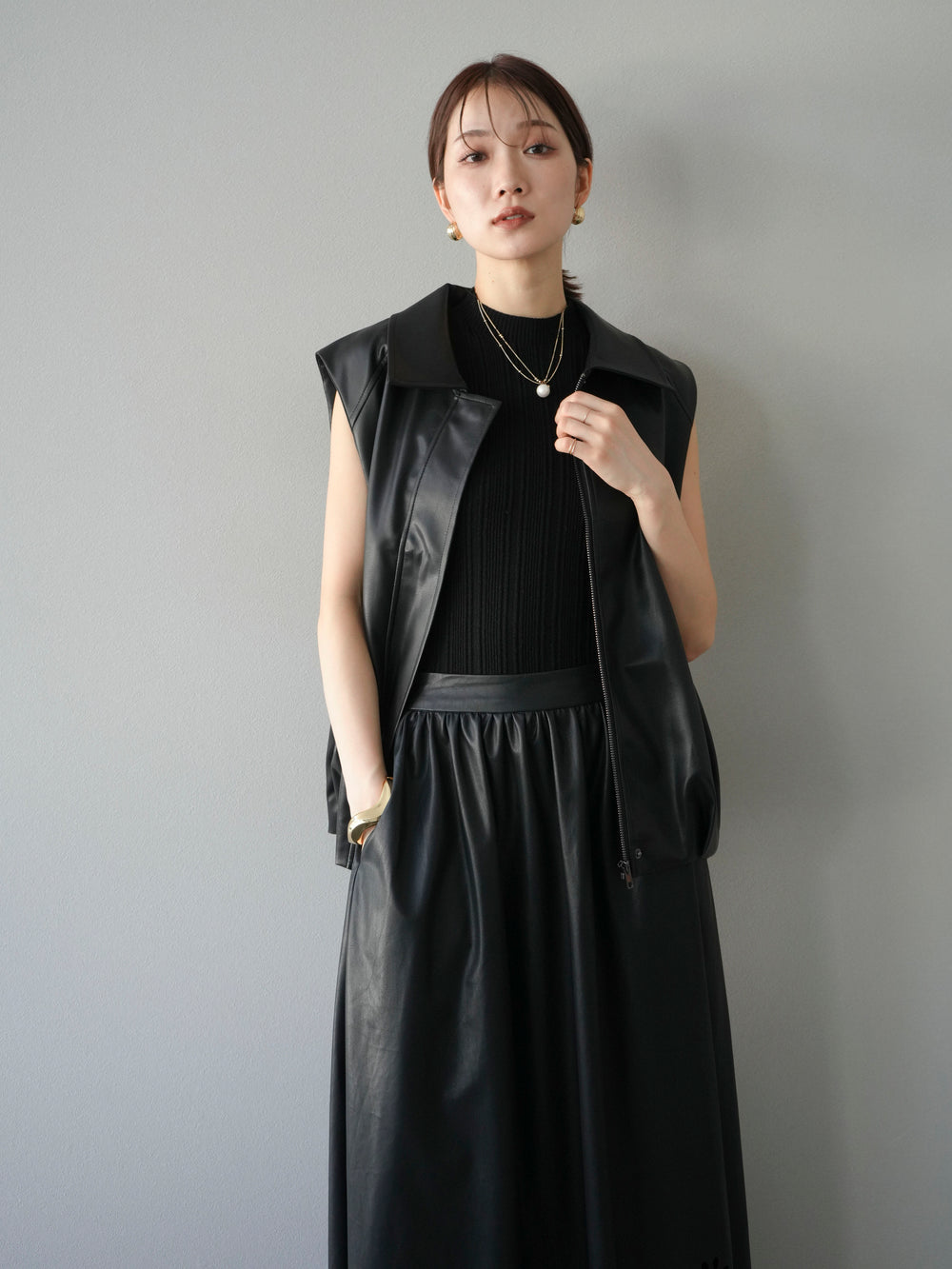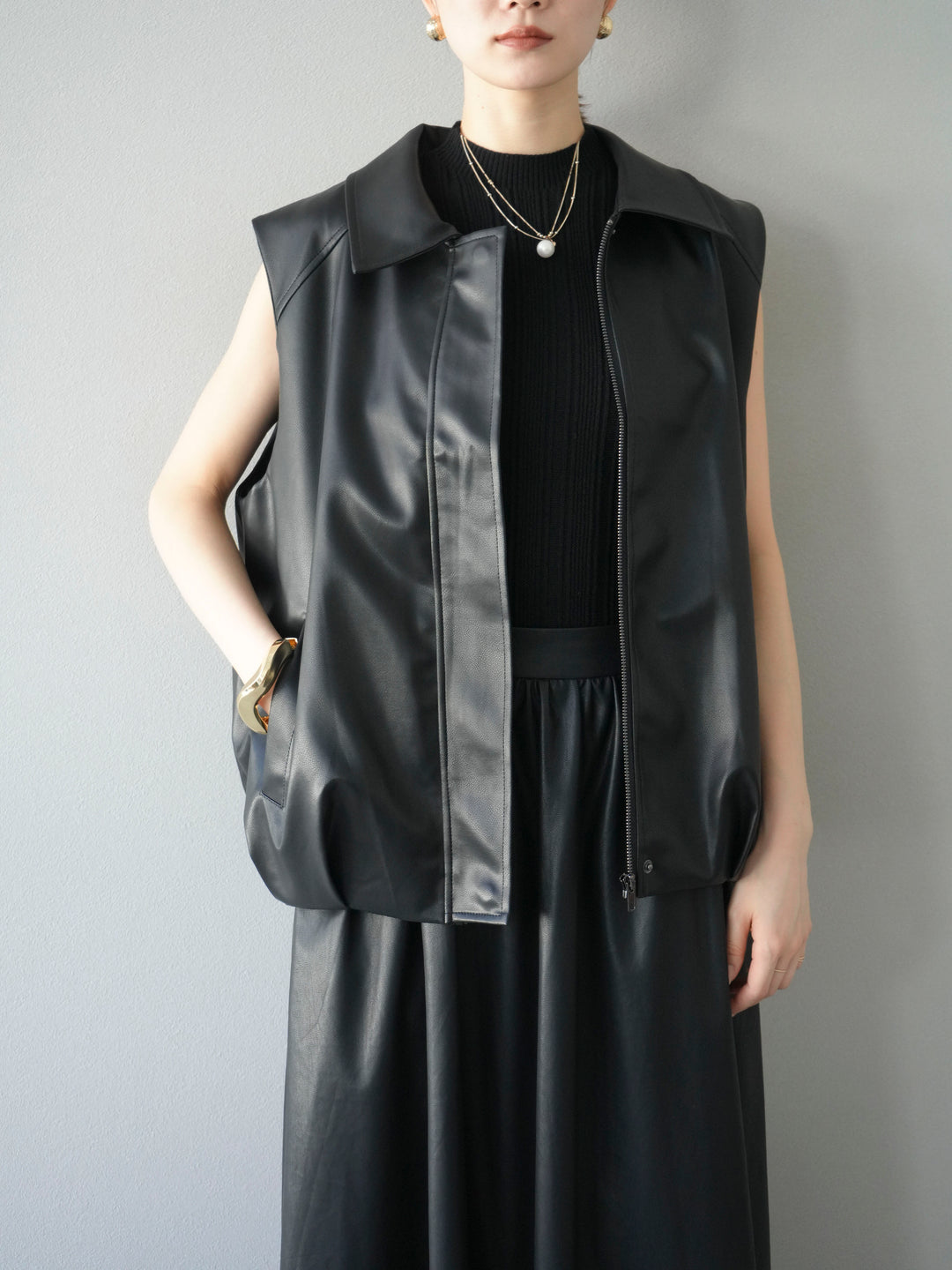 [予約]タックヘムレザーベスト/ブラック