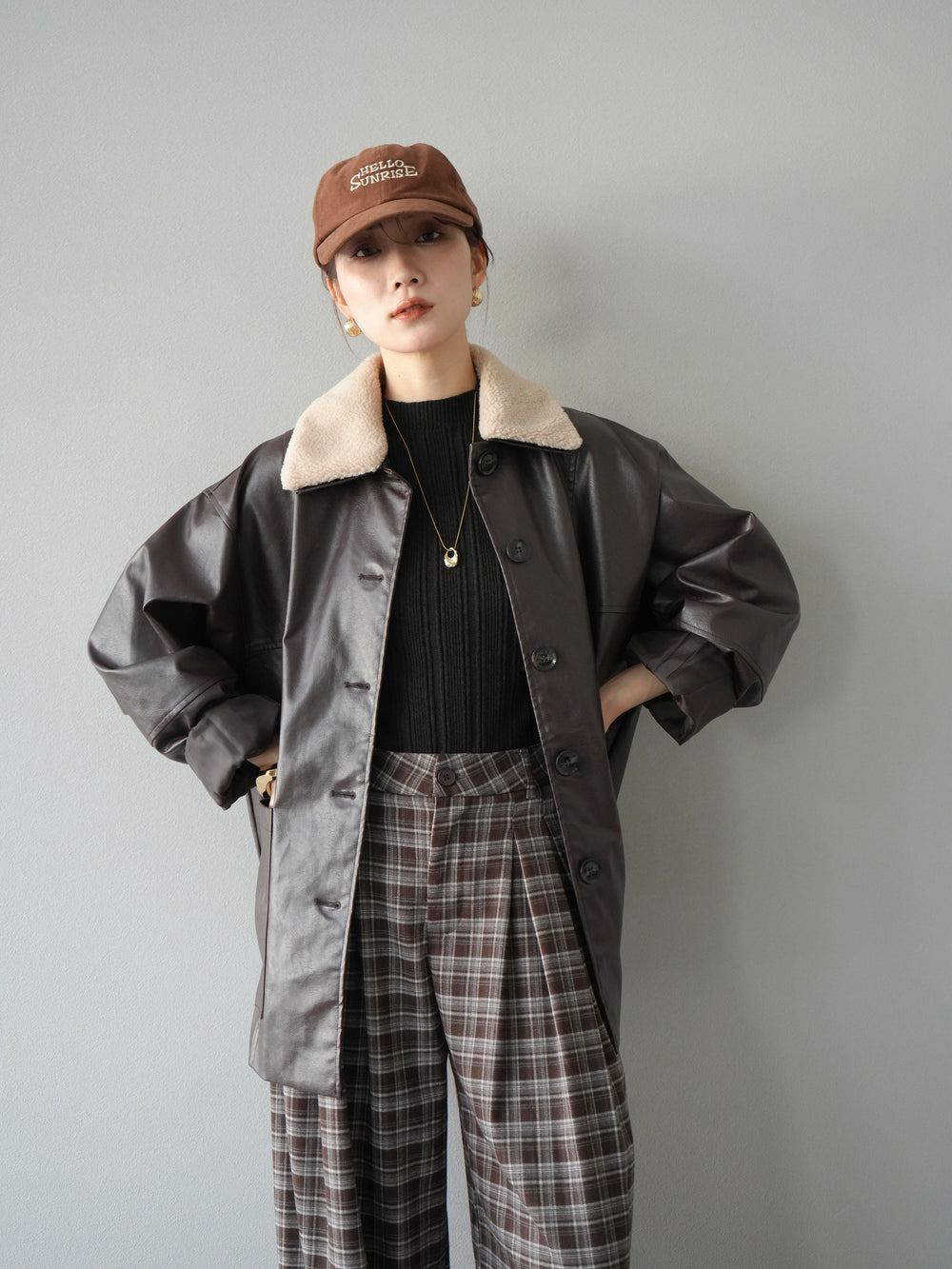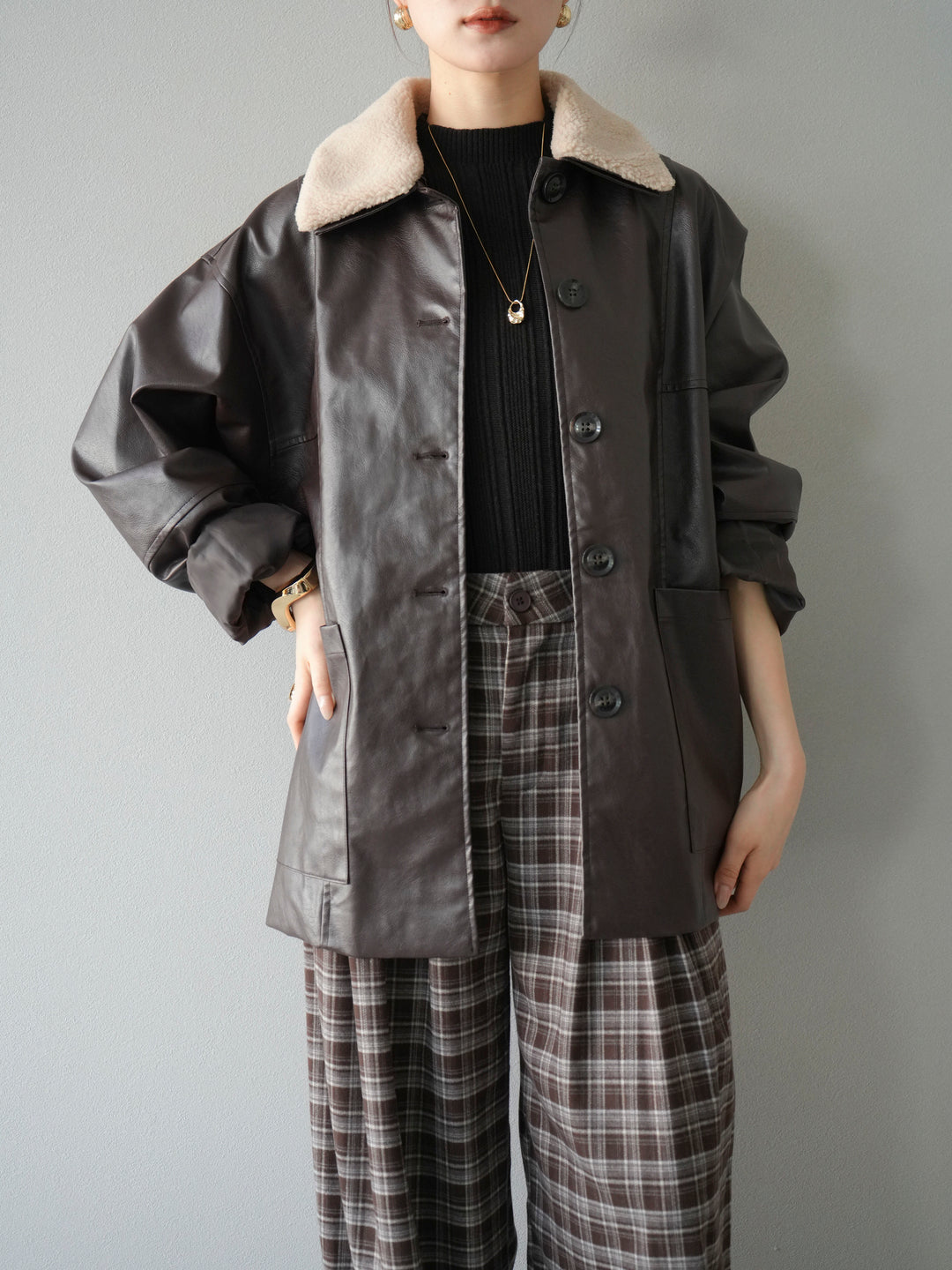 [予約]襟ボアレザーブルゾン/ブラウン