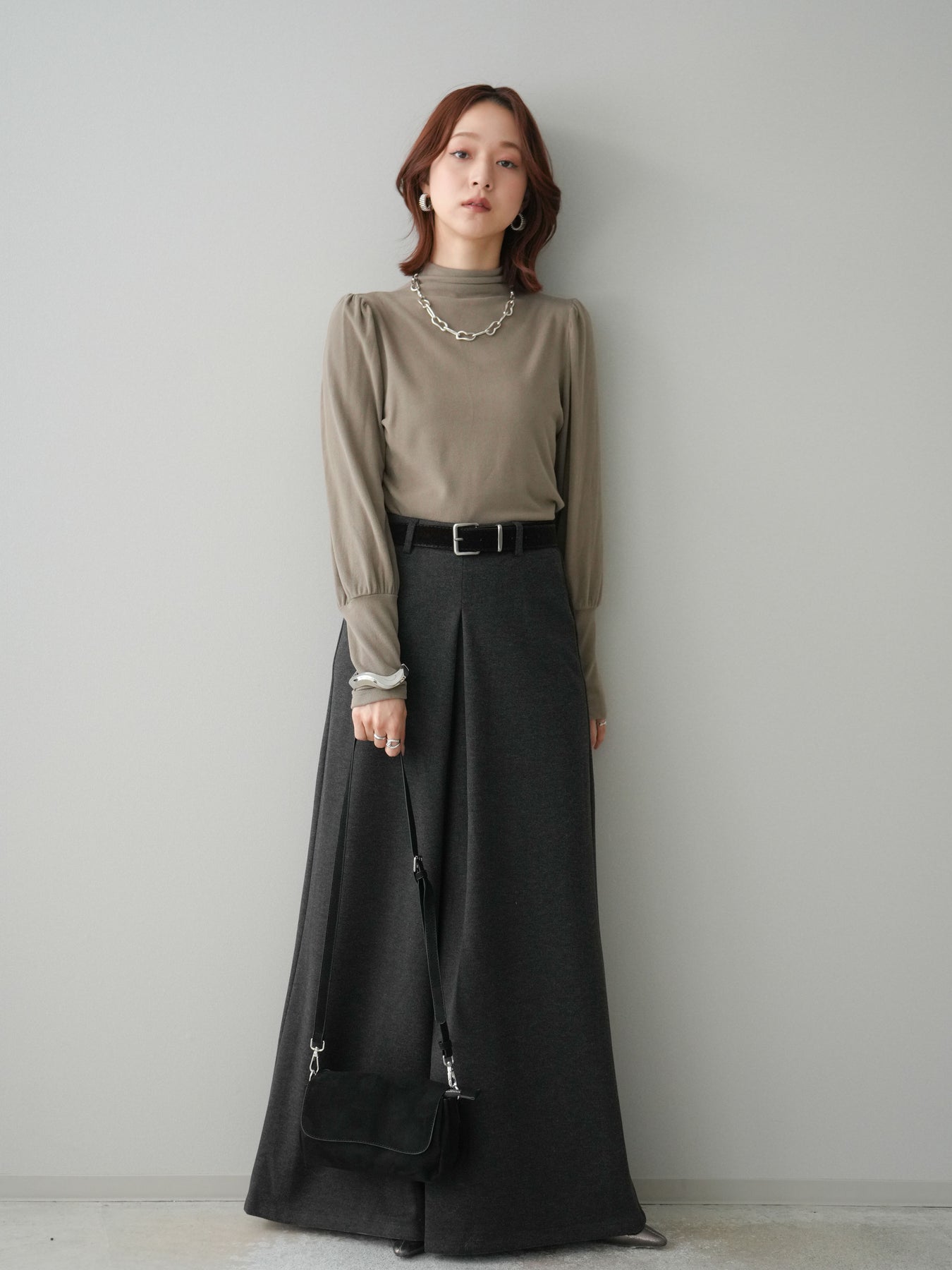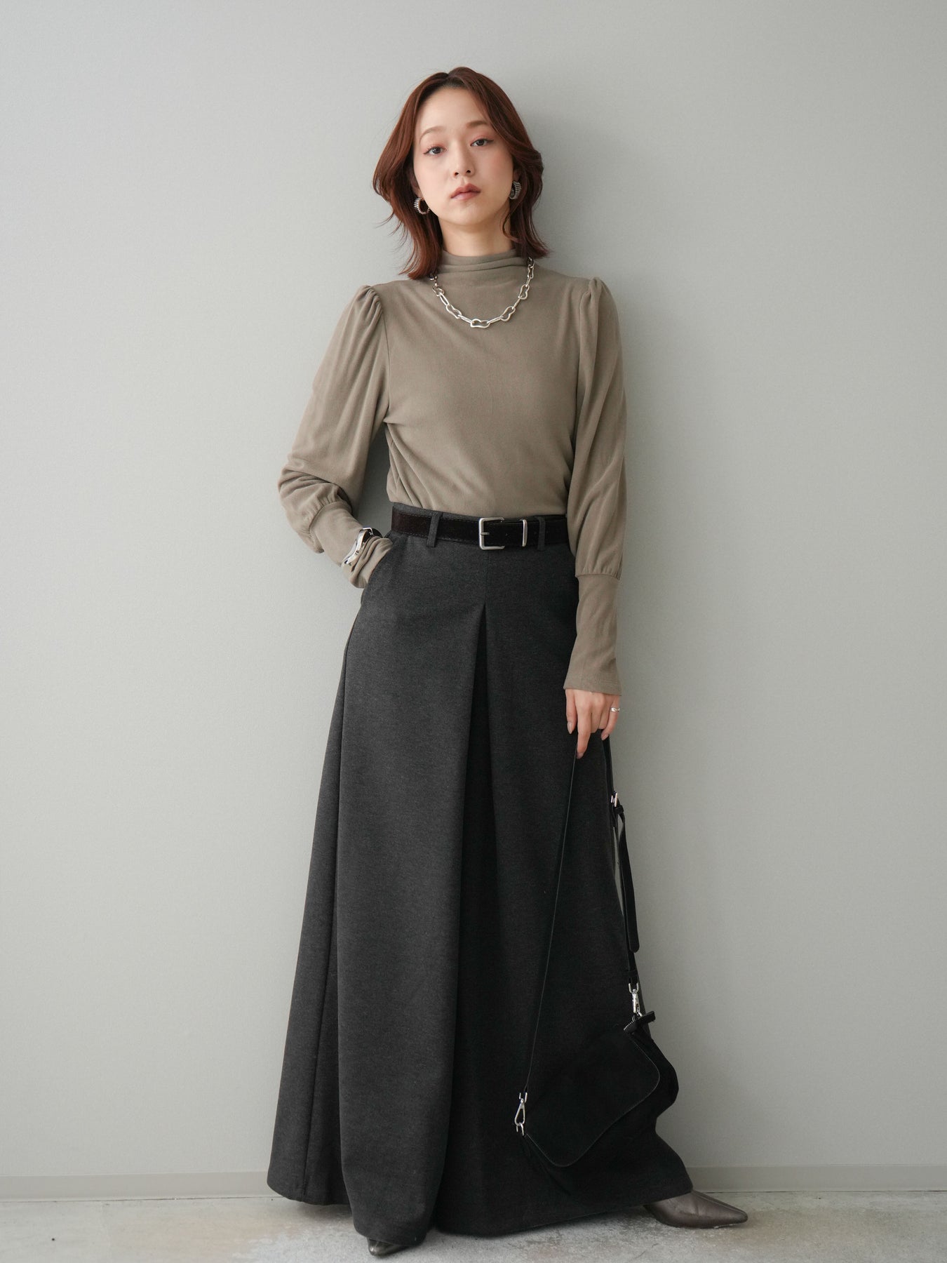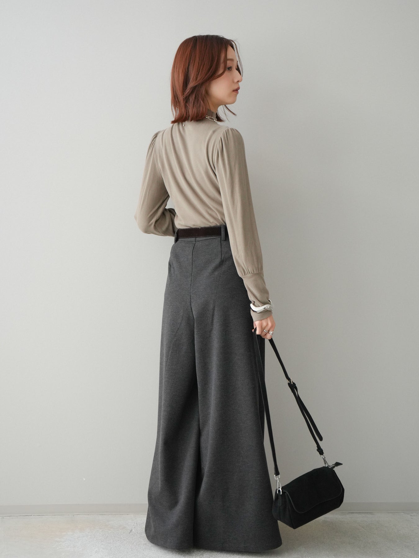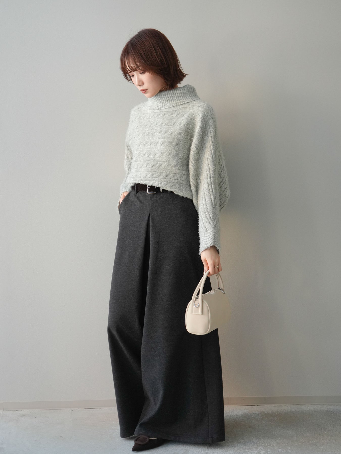 [予約]ベルト付きフロントタックワイドパンツ/charcoal