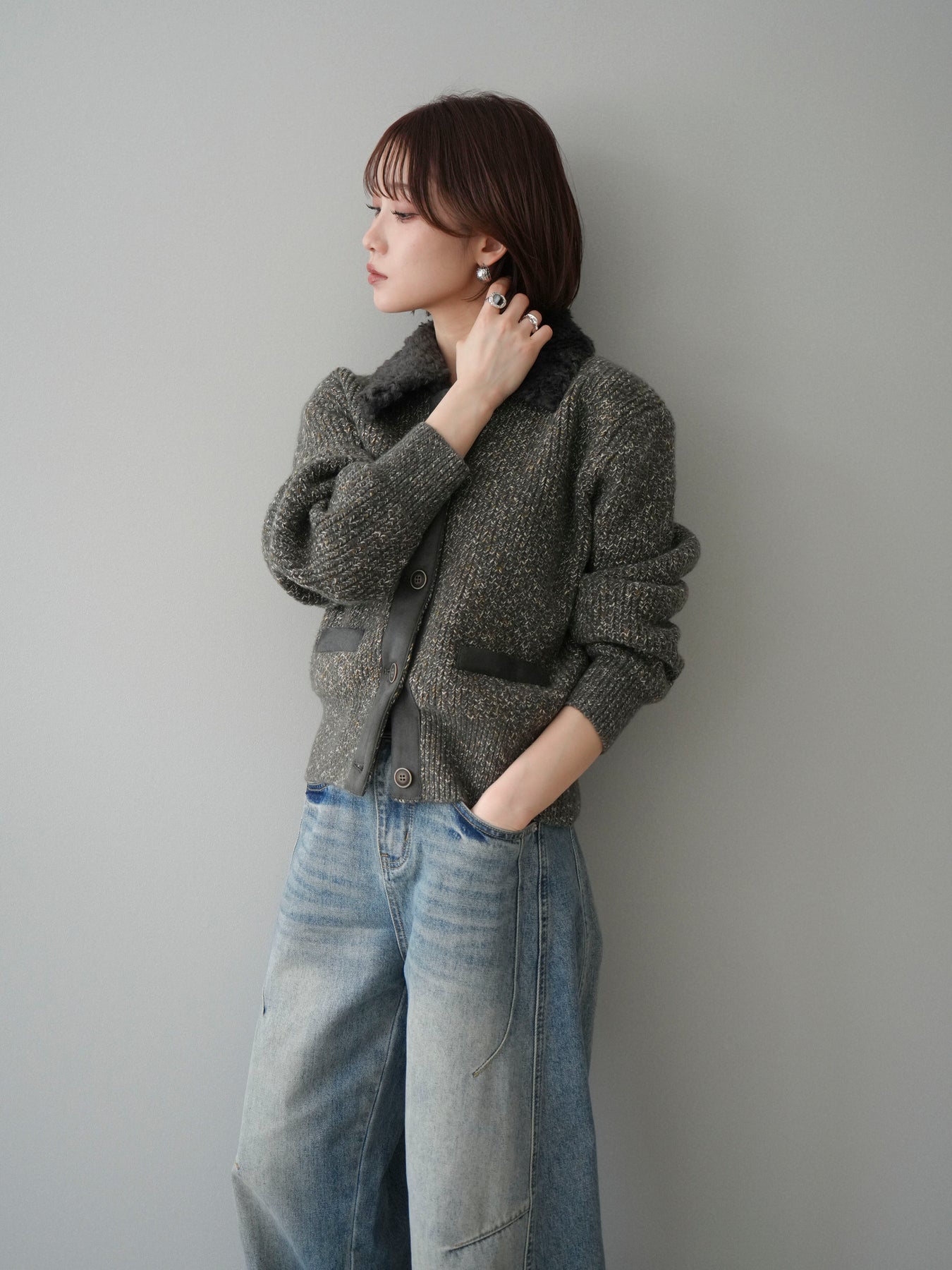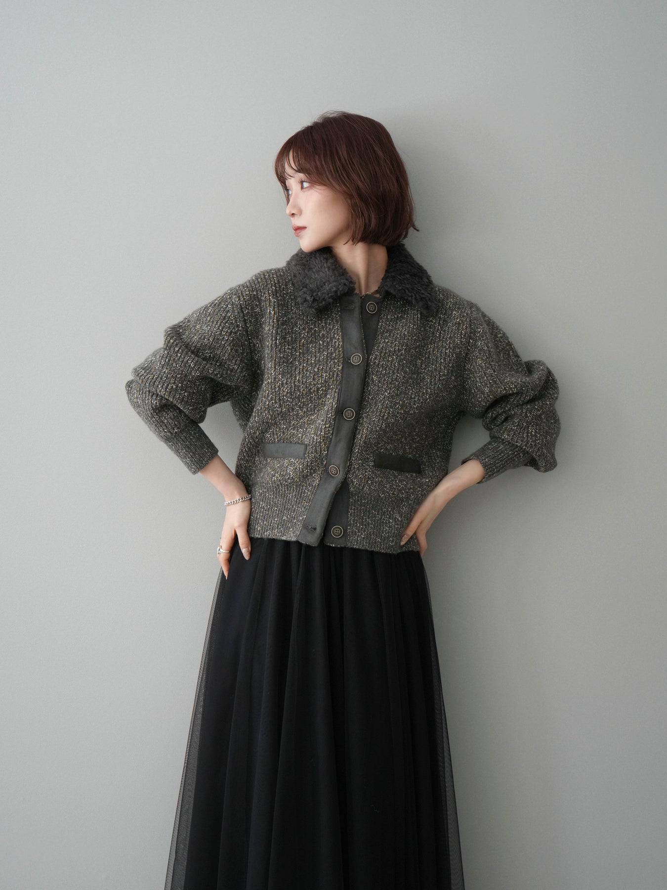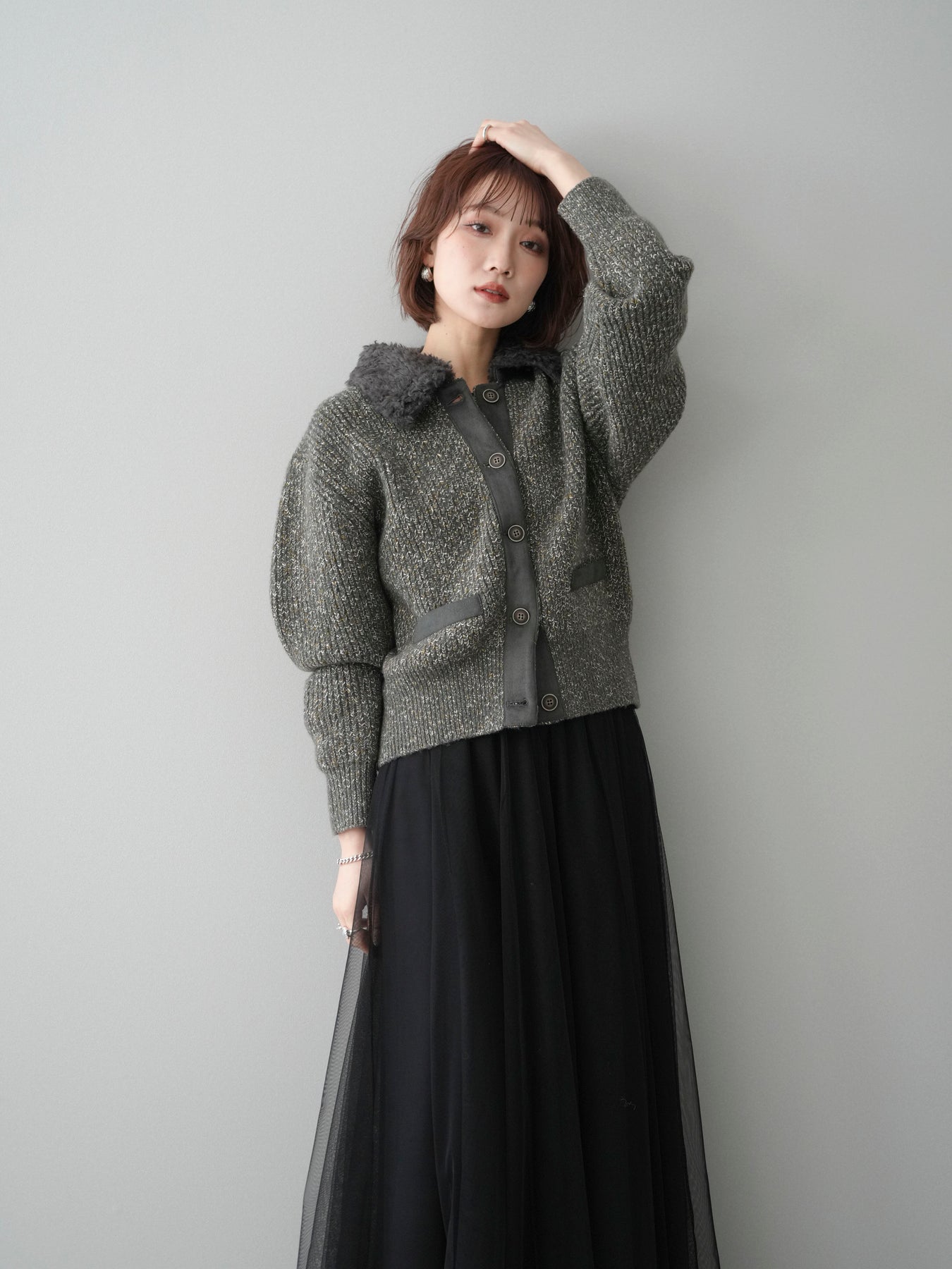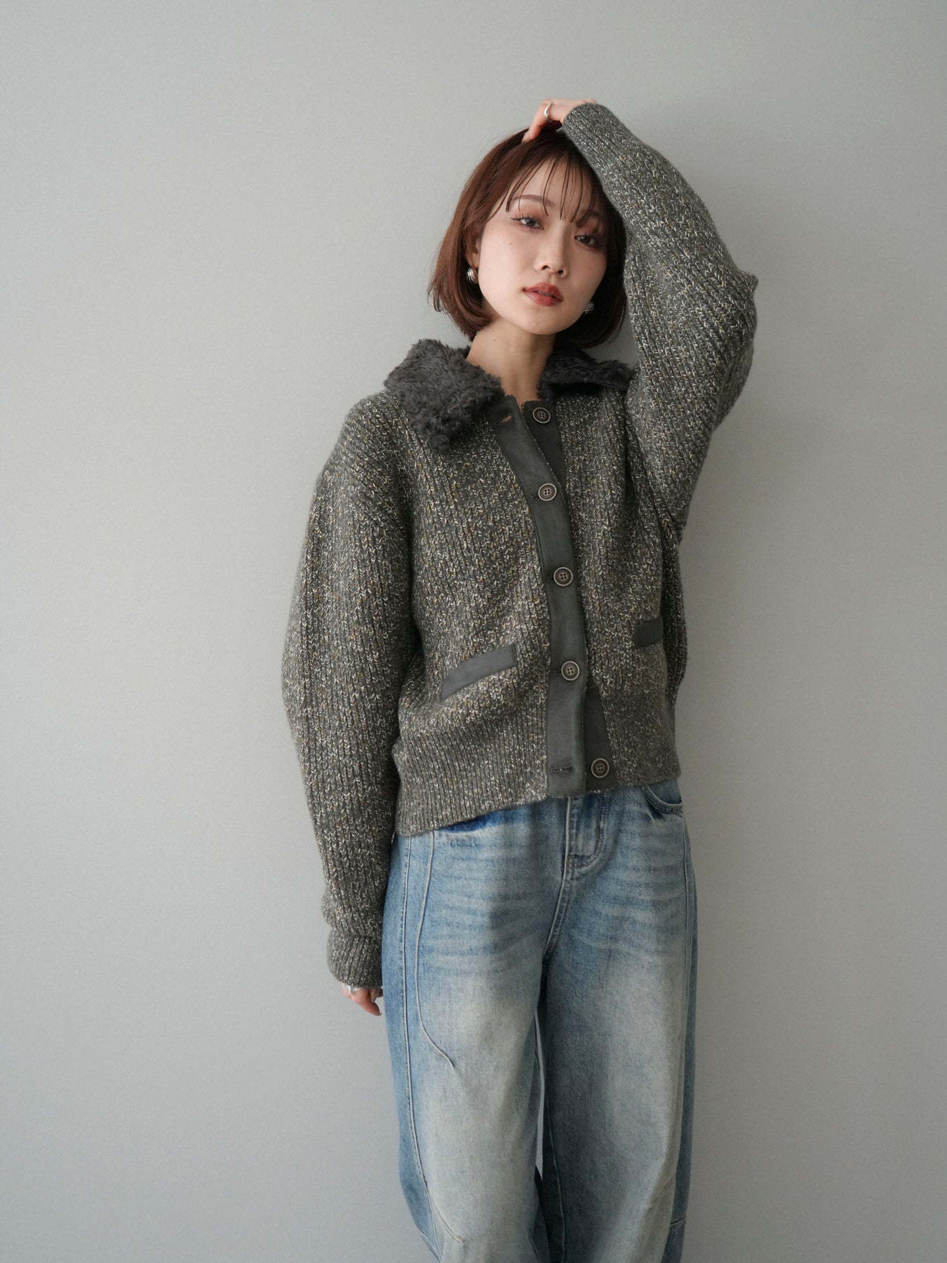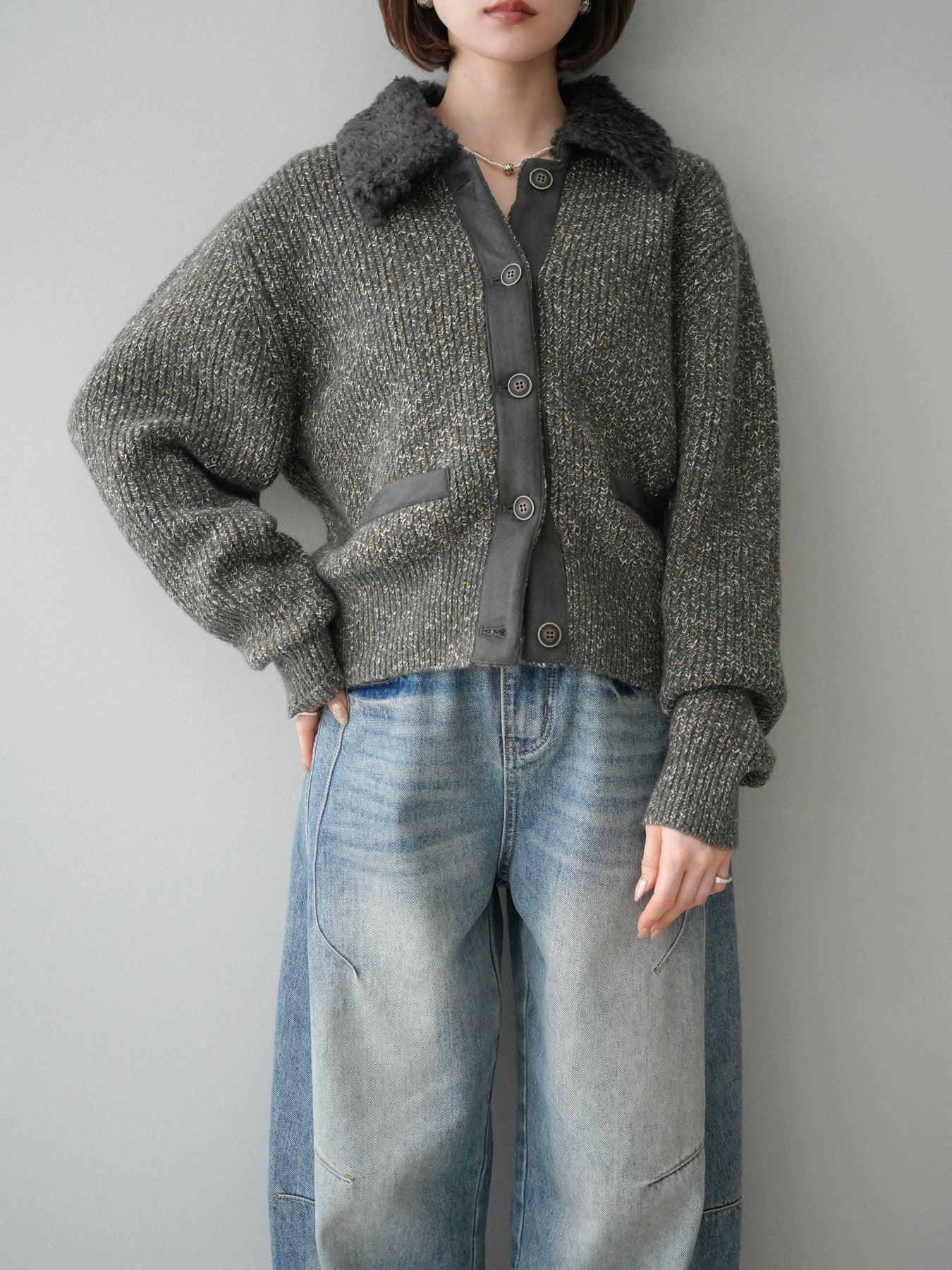 [予約]襟ボアミックスヤーンニットカーディガン/gray