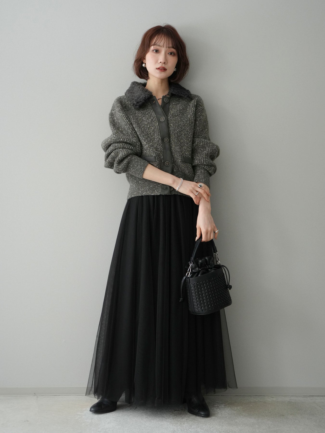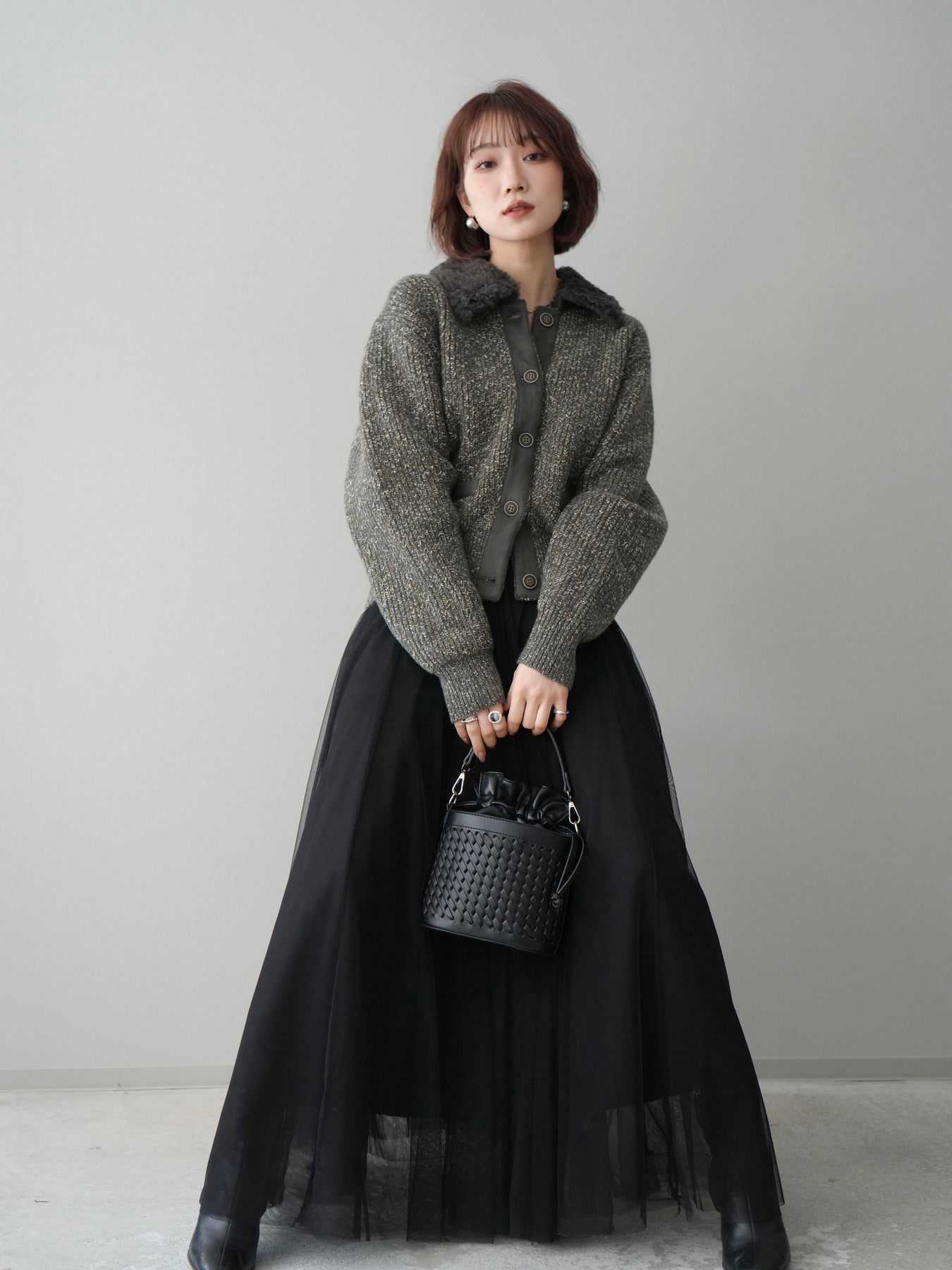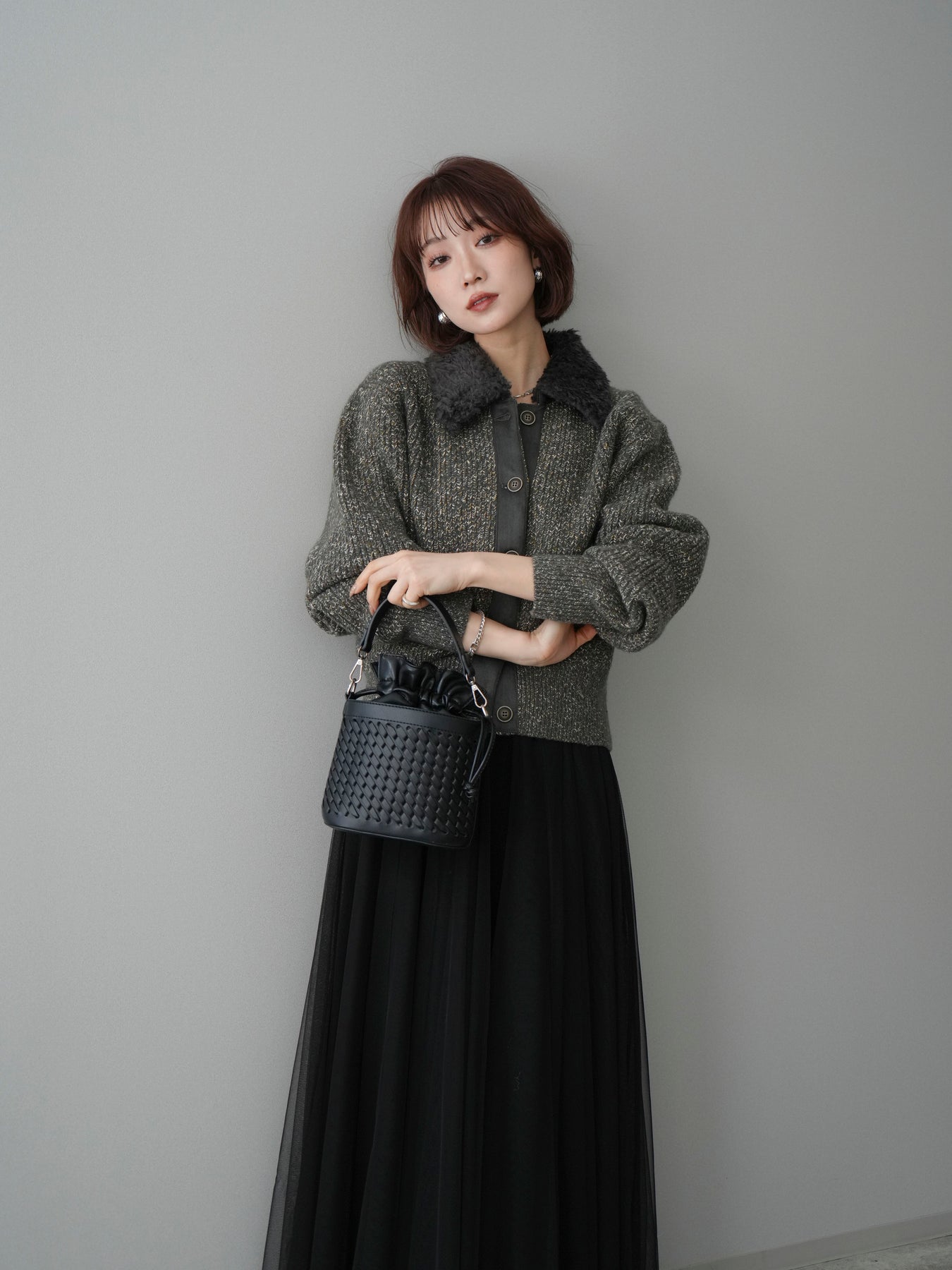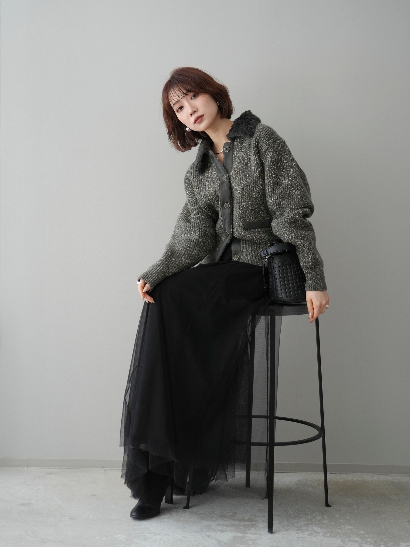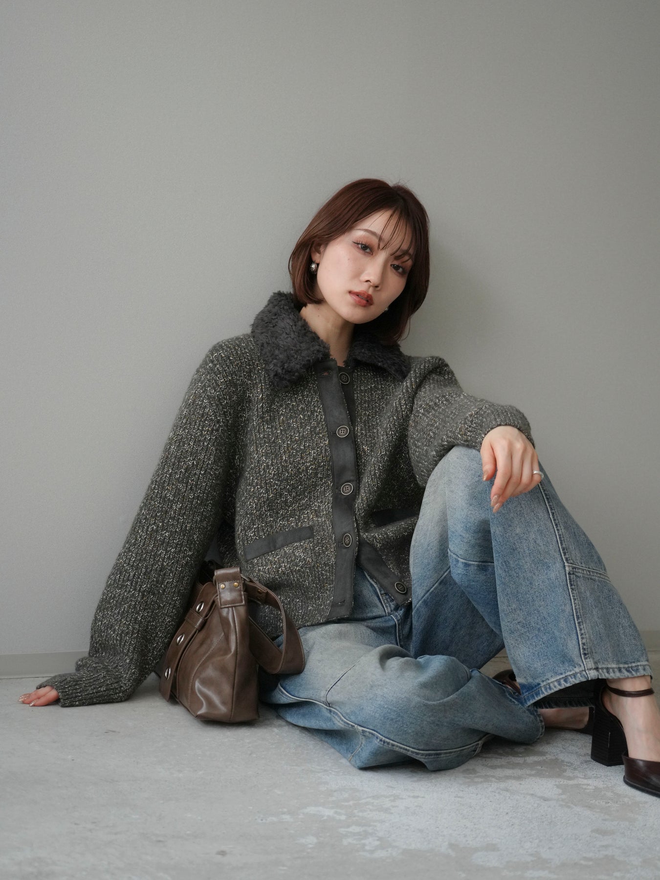 [予約]襟ボアミックスヤーンニットカーディガン/gray