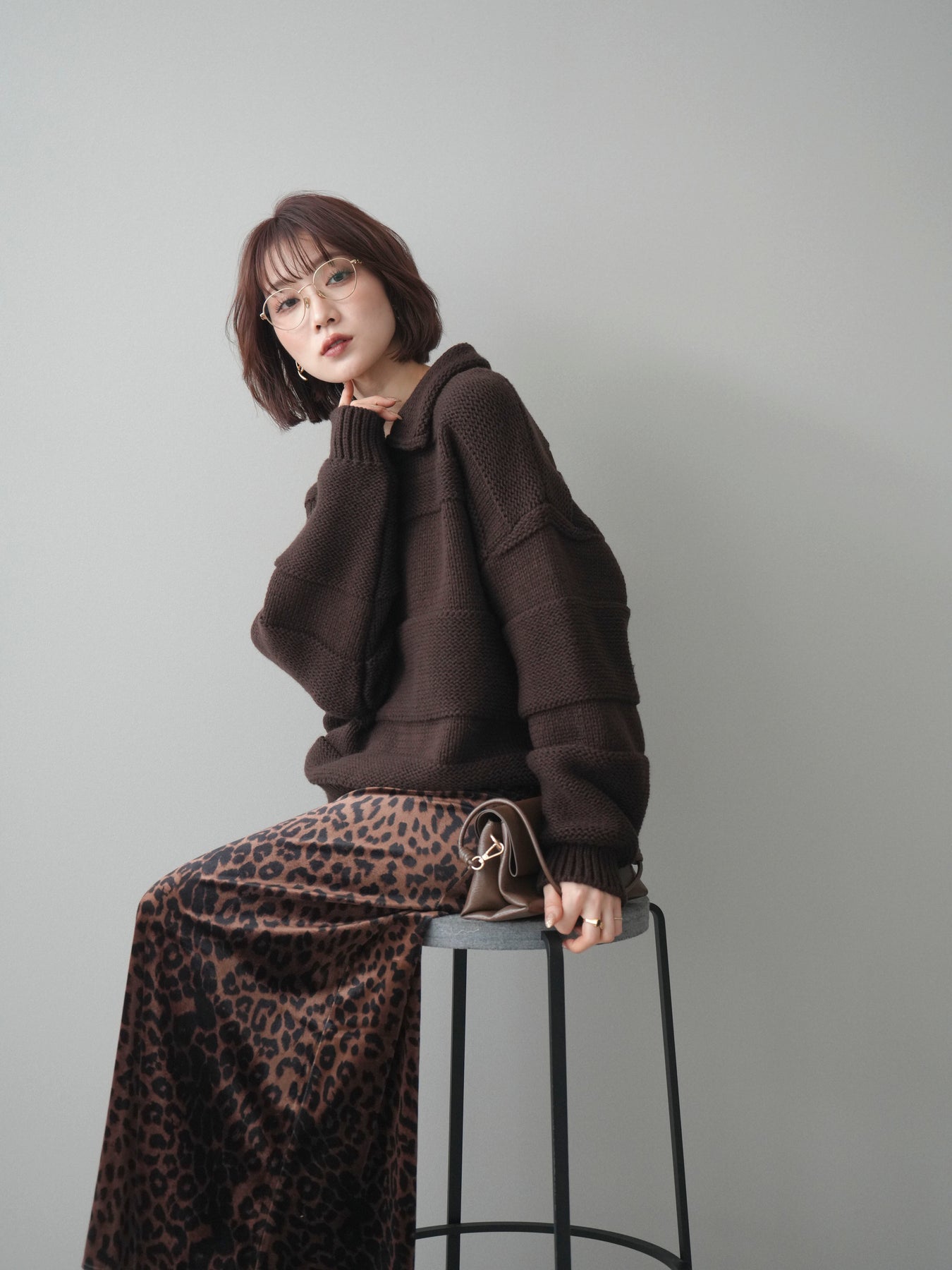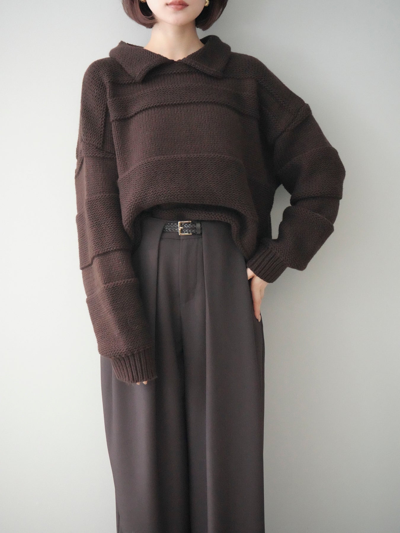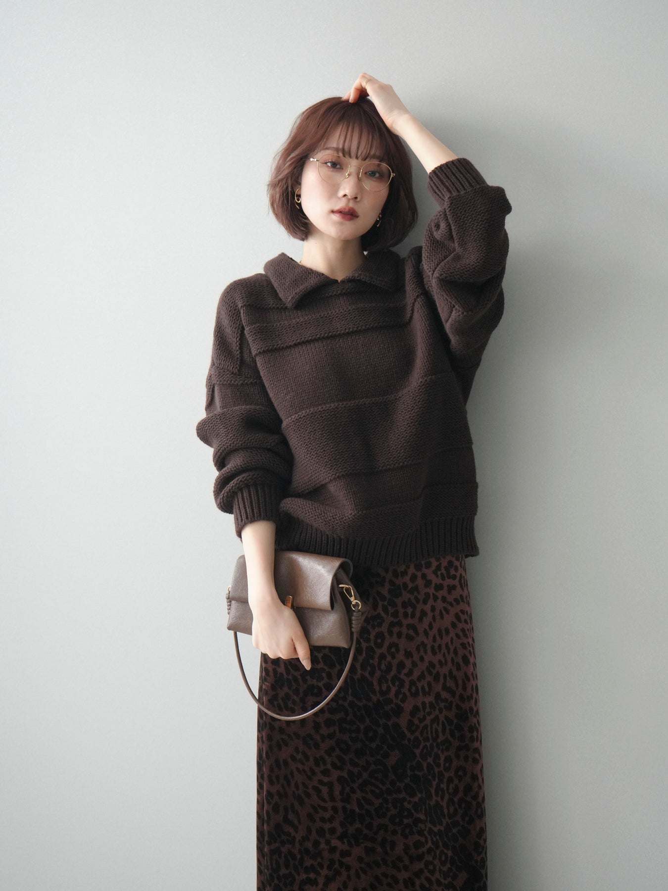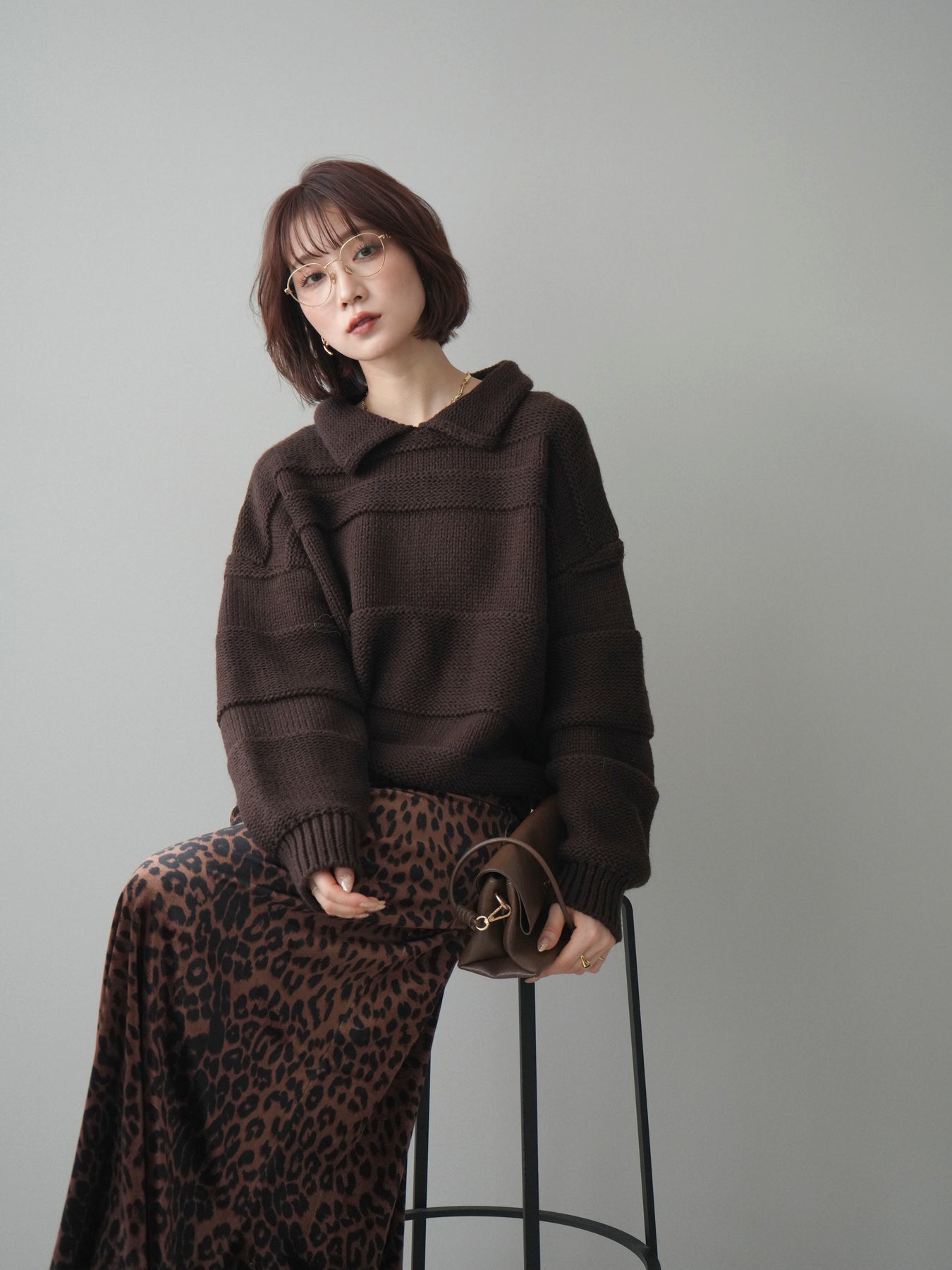 [予約]襟付きボーダー編みニットプルオーバー/brown