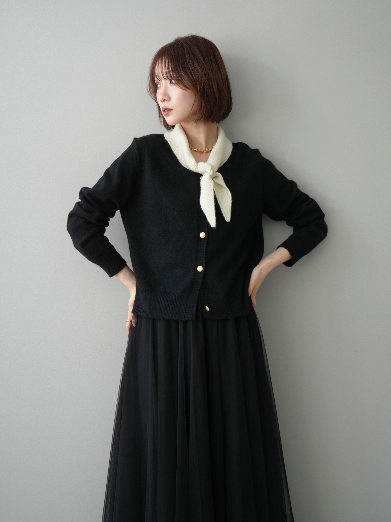 上品なデザイン襟がポイントのニットカーディガン。柔らかな肌触りと程よい厚みのニット素材で、秋冬のスタイリングにぴったりの1枚です。フロントのゴールド調ボタンが女性らしさをプラスし、襟元にはスカーフのような立体的なデザインが施されており、アクセントのあるコーディネートが叶います。デニムやスカートと合わせてカジュアルにも、ワンピースと合わせてきれいめにも着まわせる万能アイテムです。