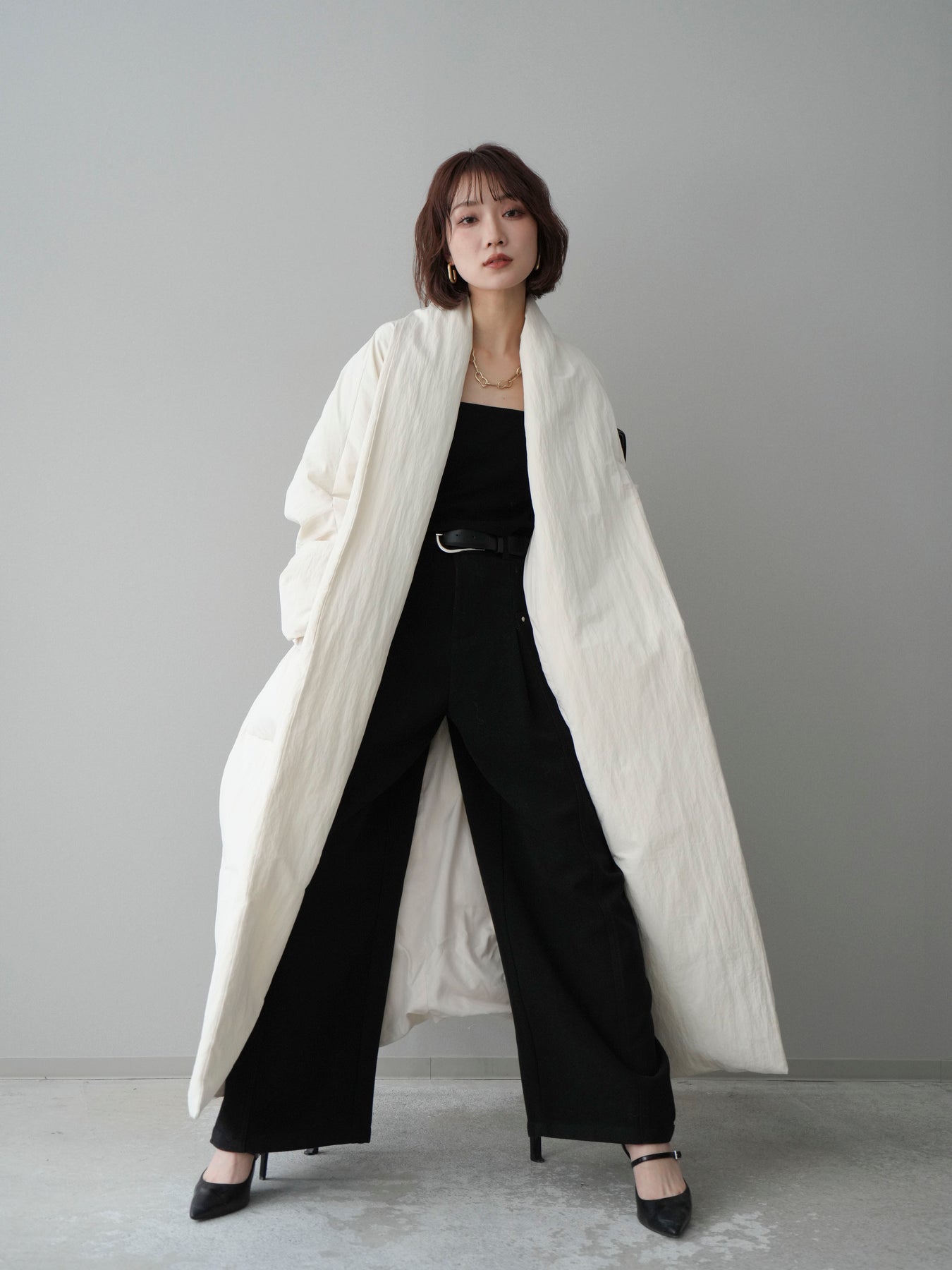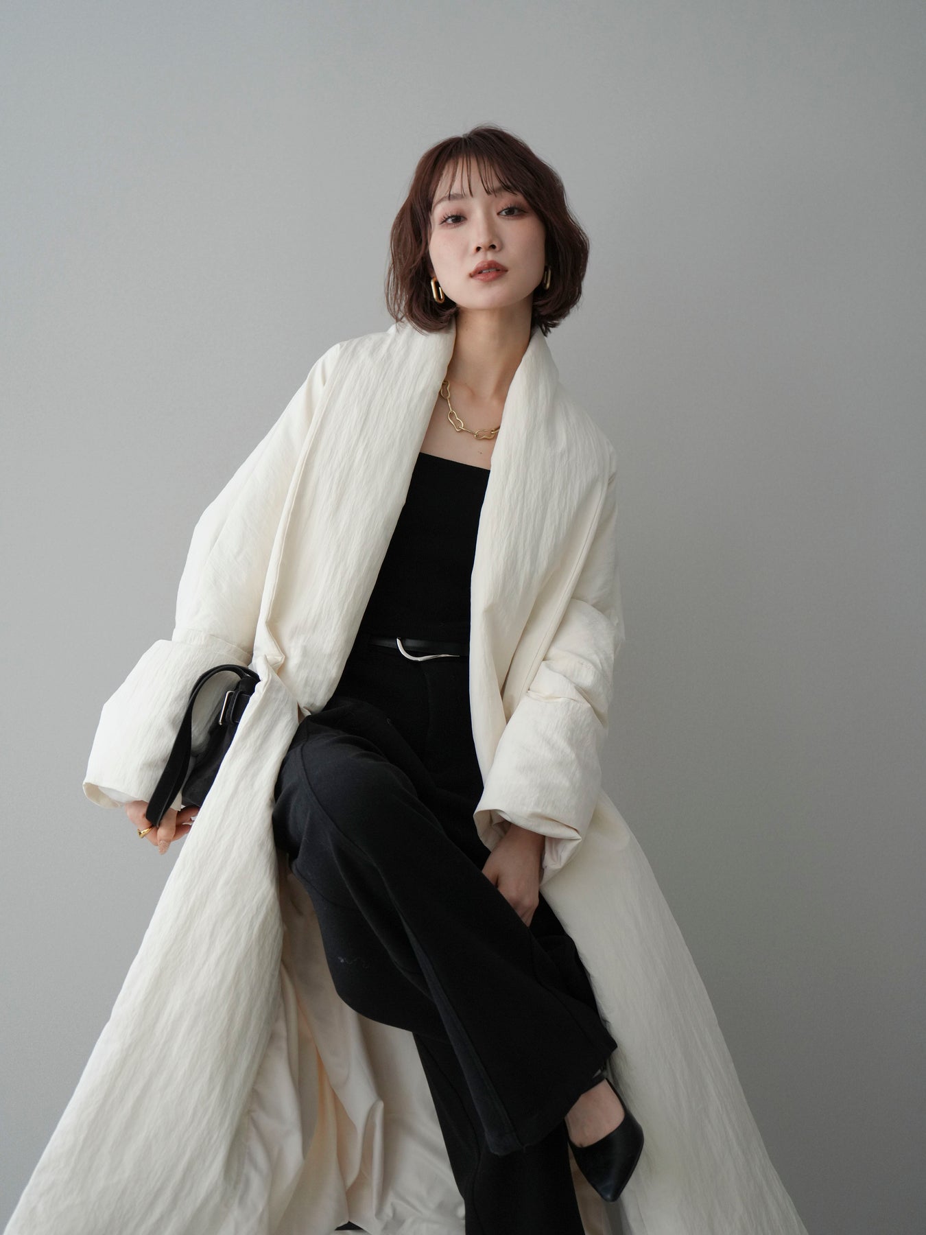 すっきりとした縦のラインが印象的なロング丈ダウンコート。程よくゆとりのあるシルエットで、厚手のトップスの上からも羽織りやすく、スタイリングを選ばず活躍します。軽やかな着心地ながら、シーズンムードを高めてくれる一着です。