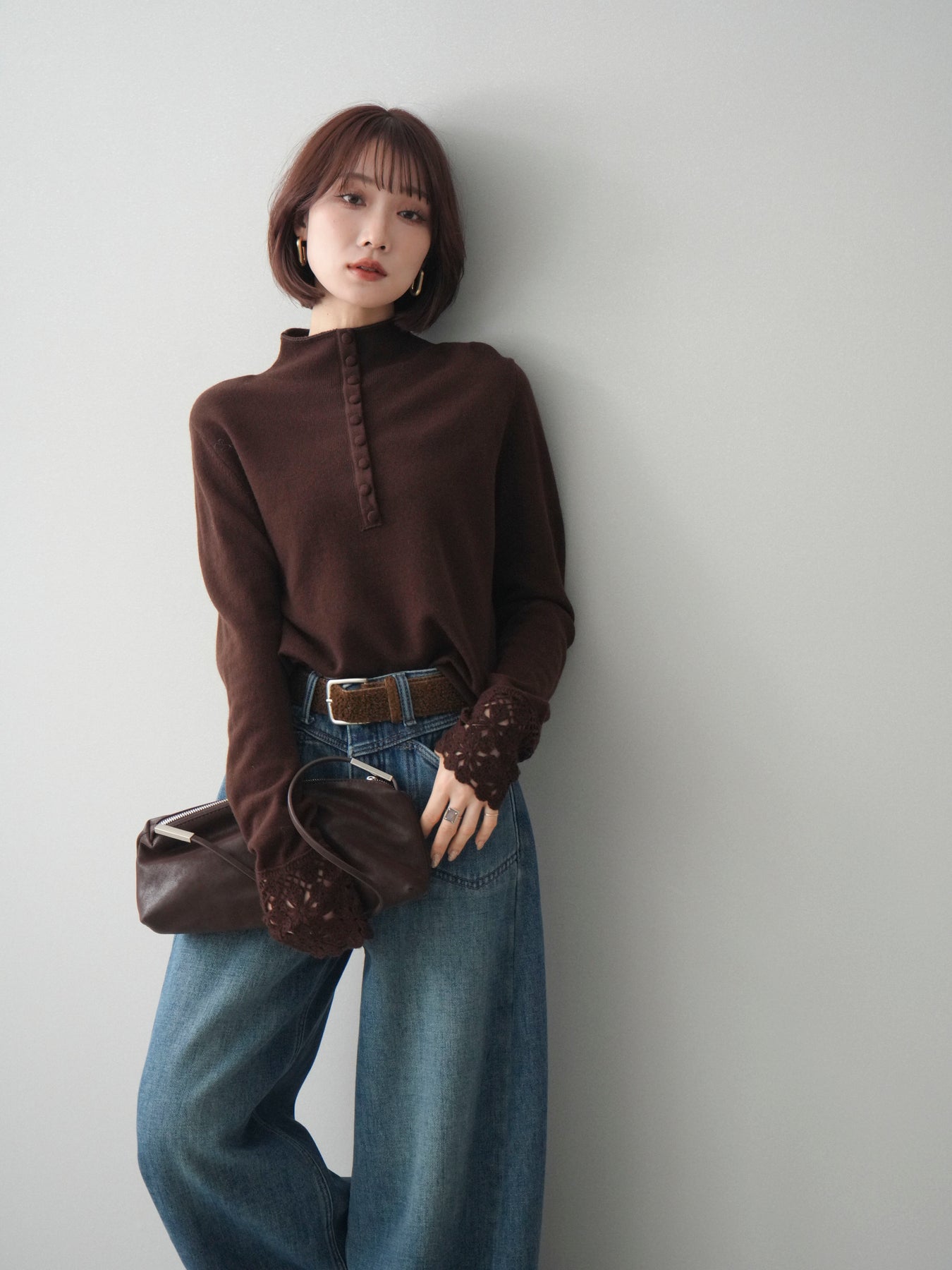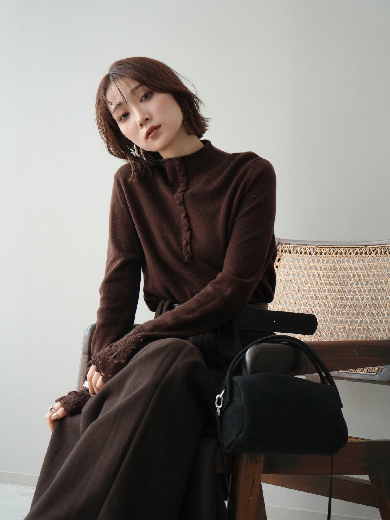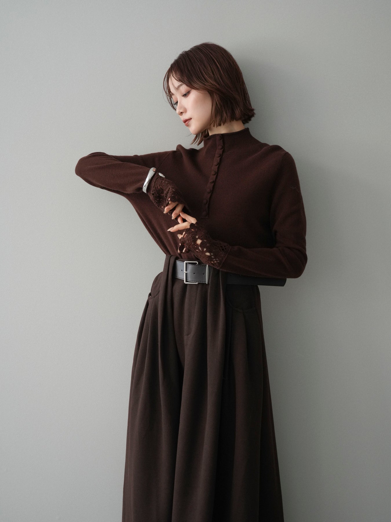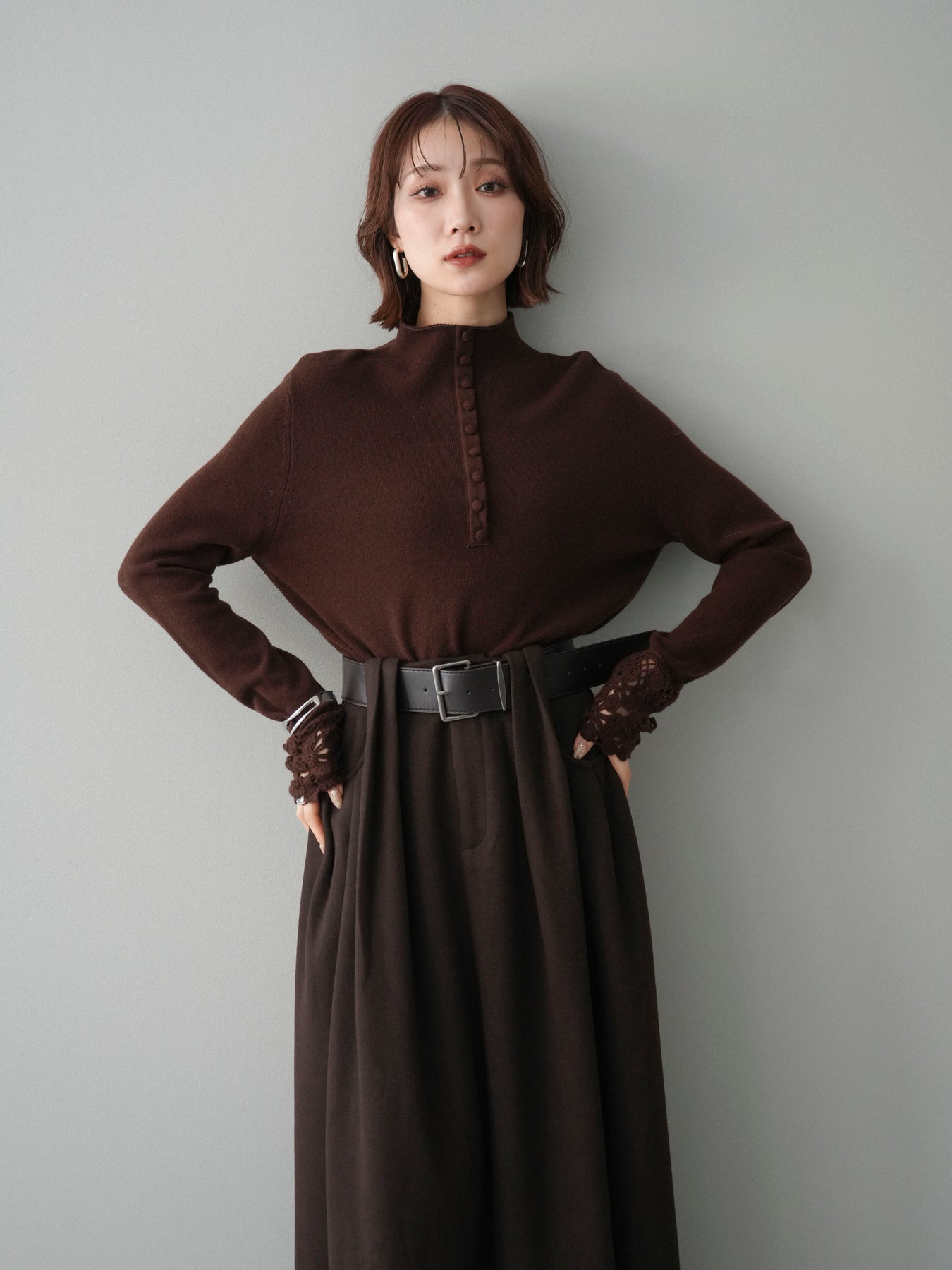 [予約]袖スカラップレースフロントボタンウールニットトップス/brown