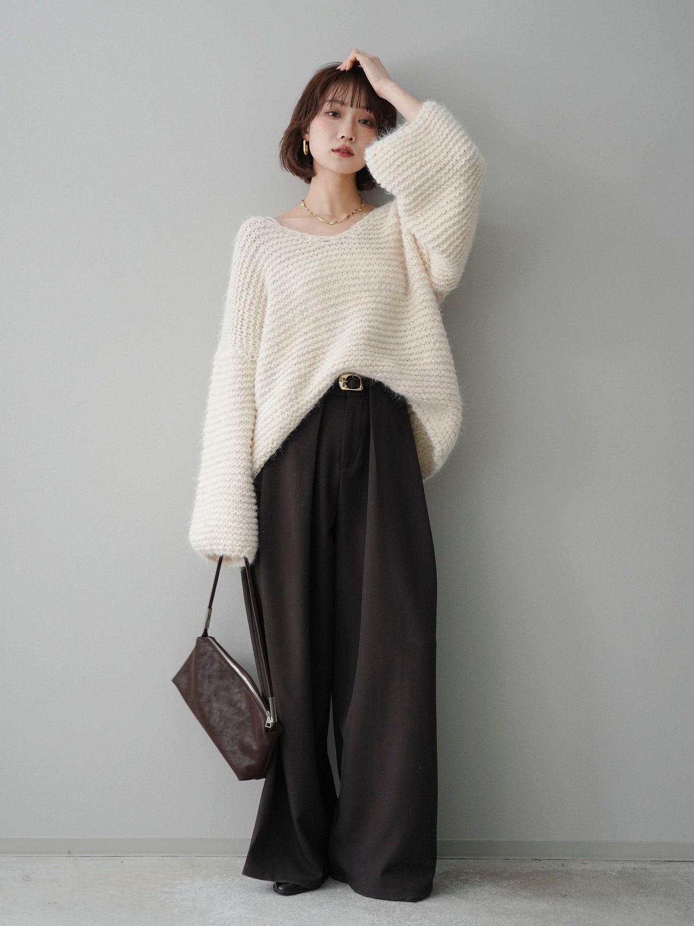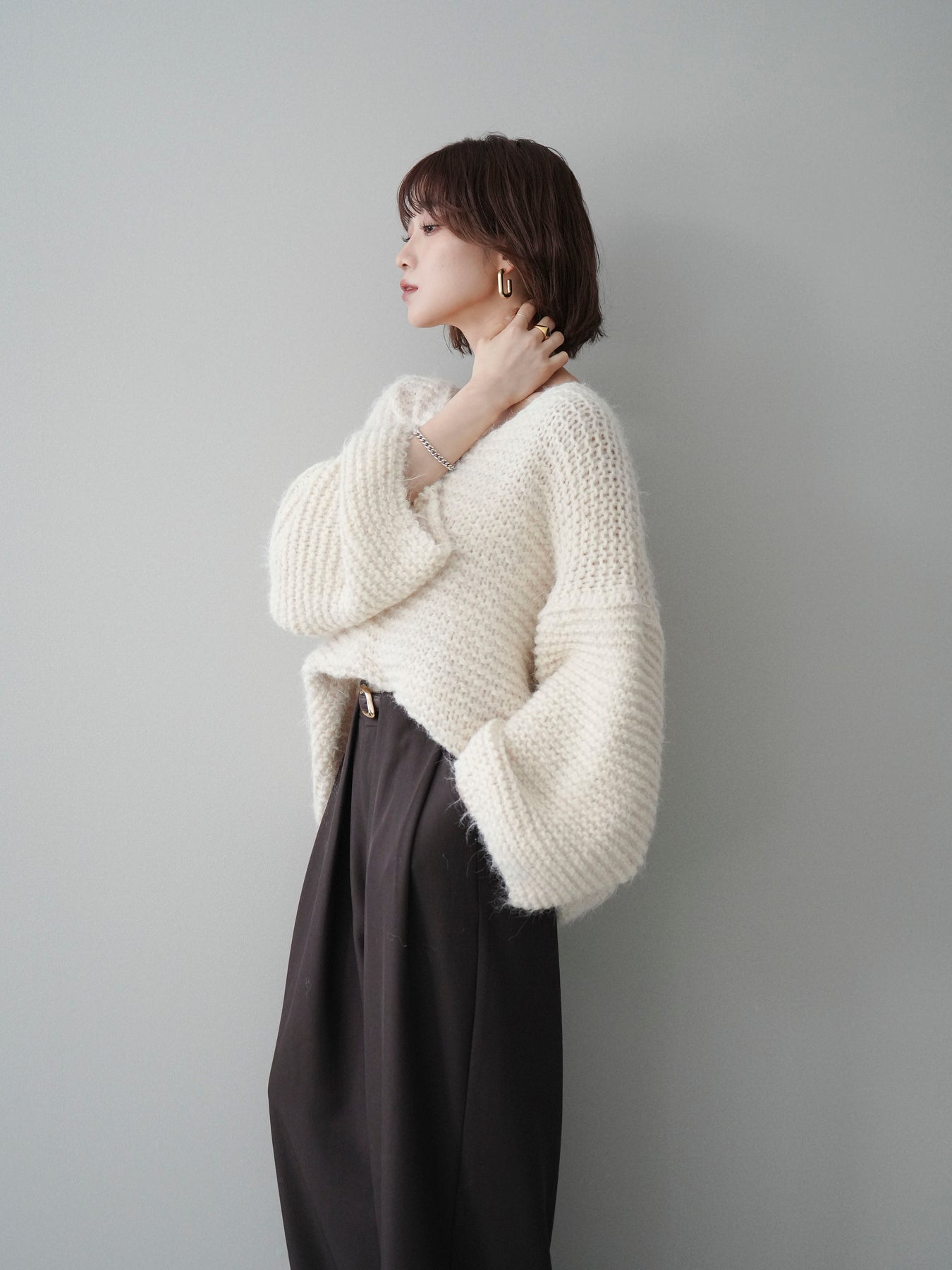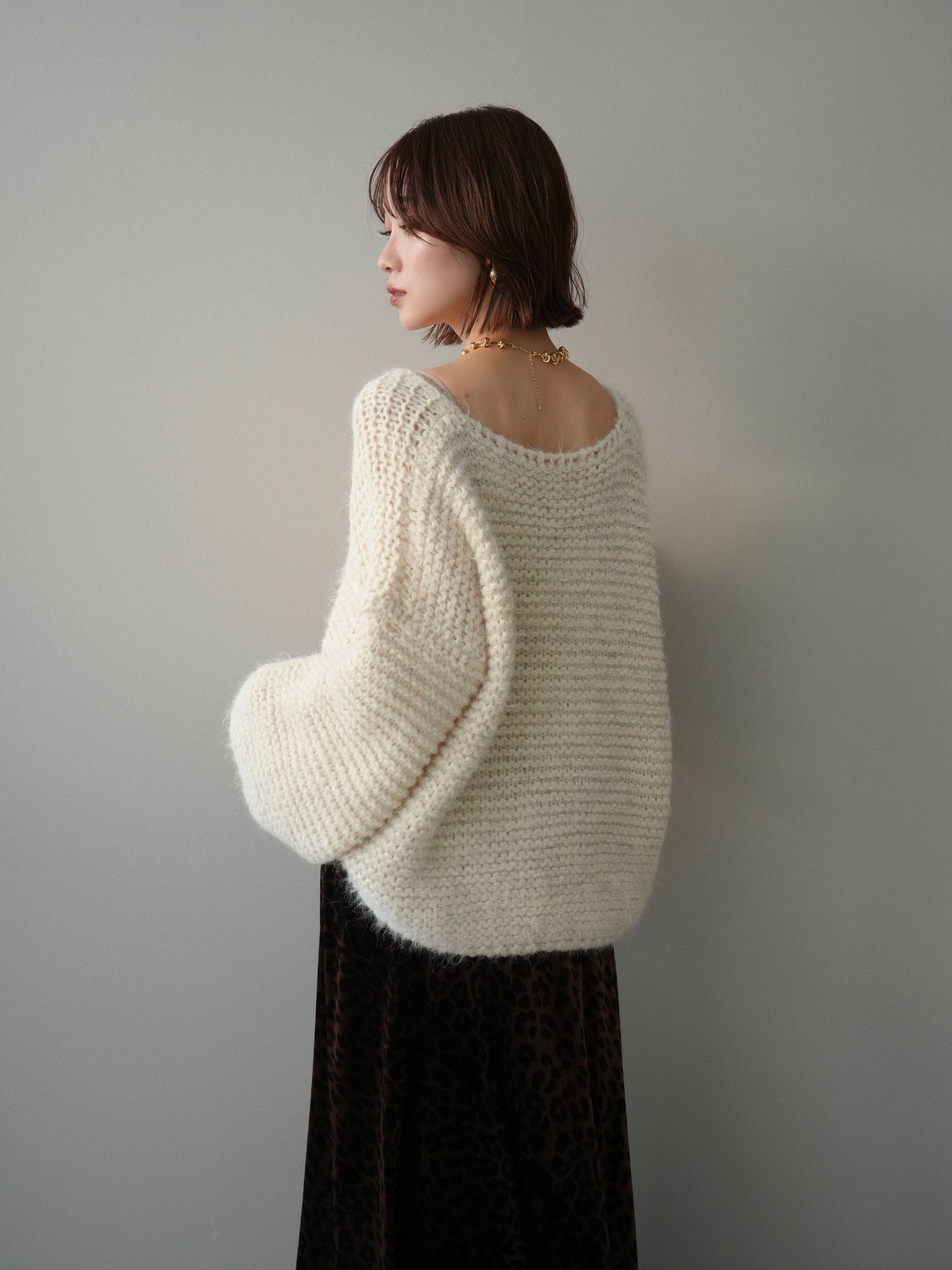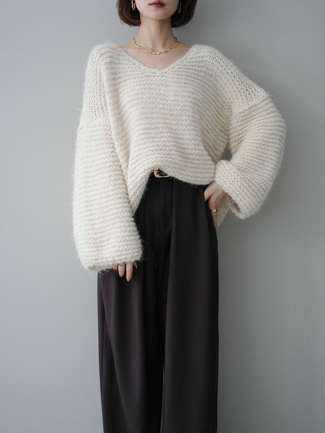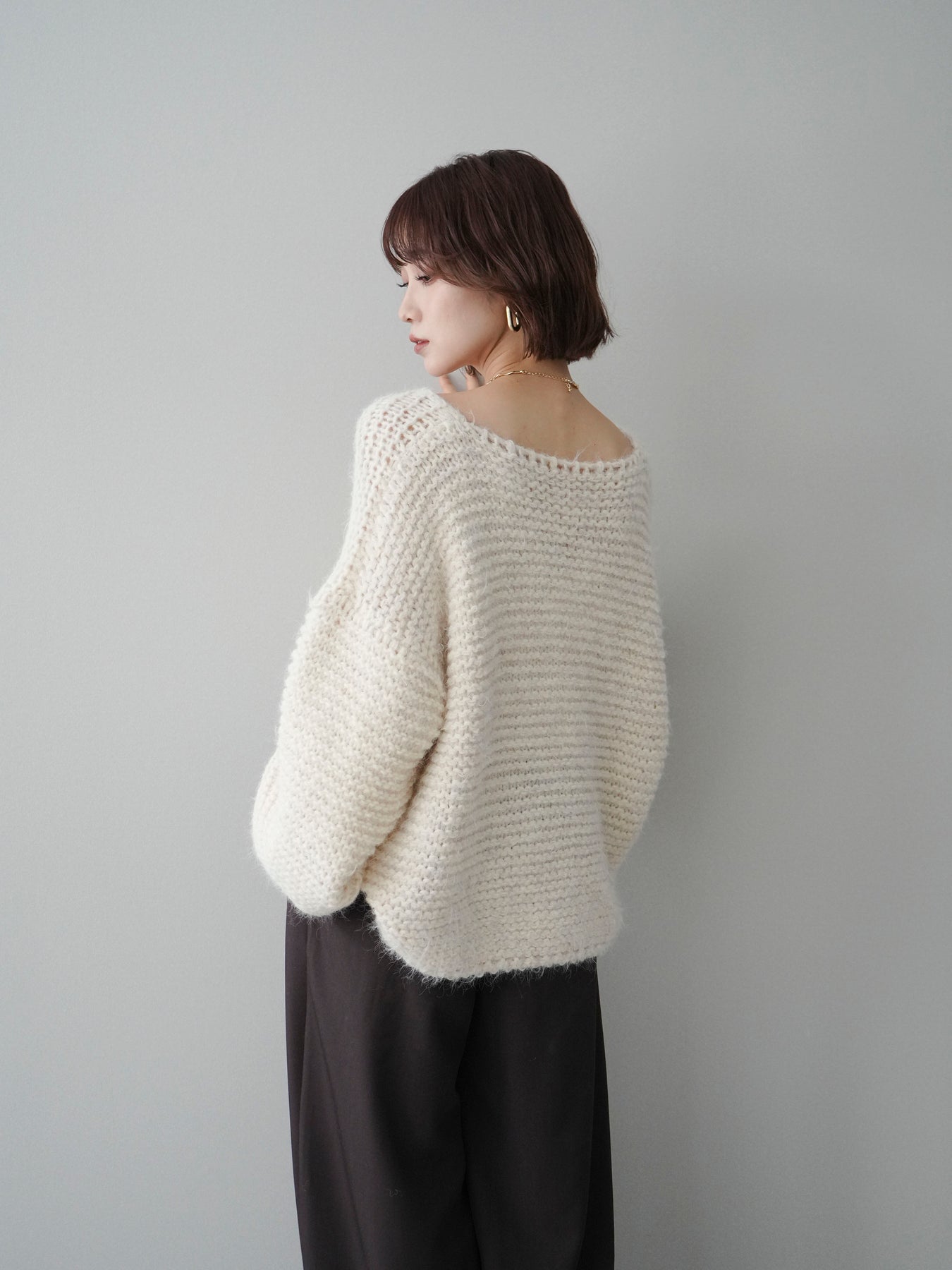 ふんわりとしたシャギー素材とワッフル編みの立体感が魅力のニットプルオーバー。 肌あたりのやさしい風合いで、着心地も抜群。ゆったりとしたルーズシルエットが抜け感を演出し、ナチュラルなムードに仕上げてくれます。 デコルテを美しく見せる絶妙なネックラインで女性らしさも忘れずに。 一枚着としても、シャツやワンピースとのレイヤードスタイルでも活躍する、着回し力の高いアイテムです。