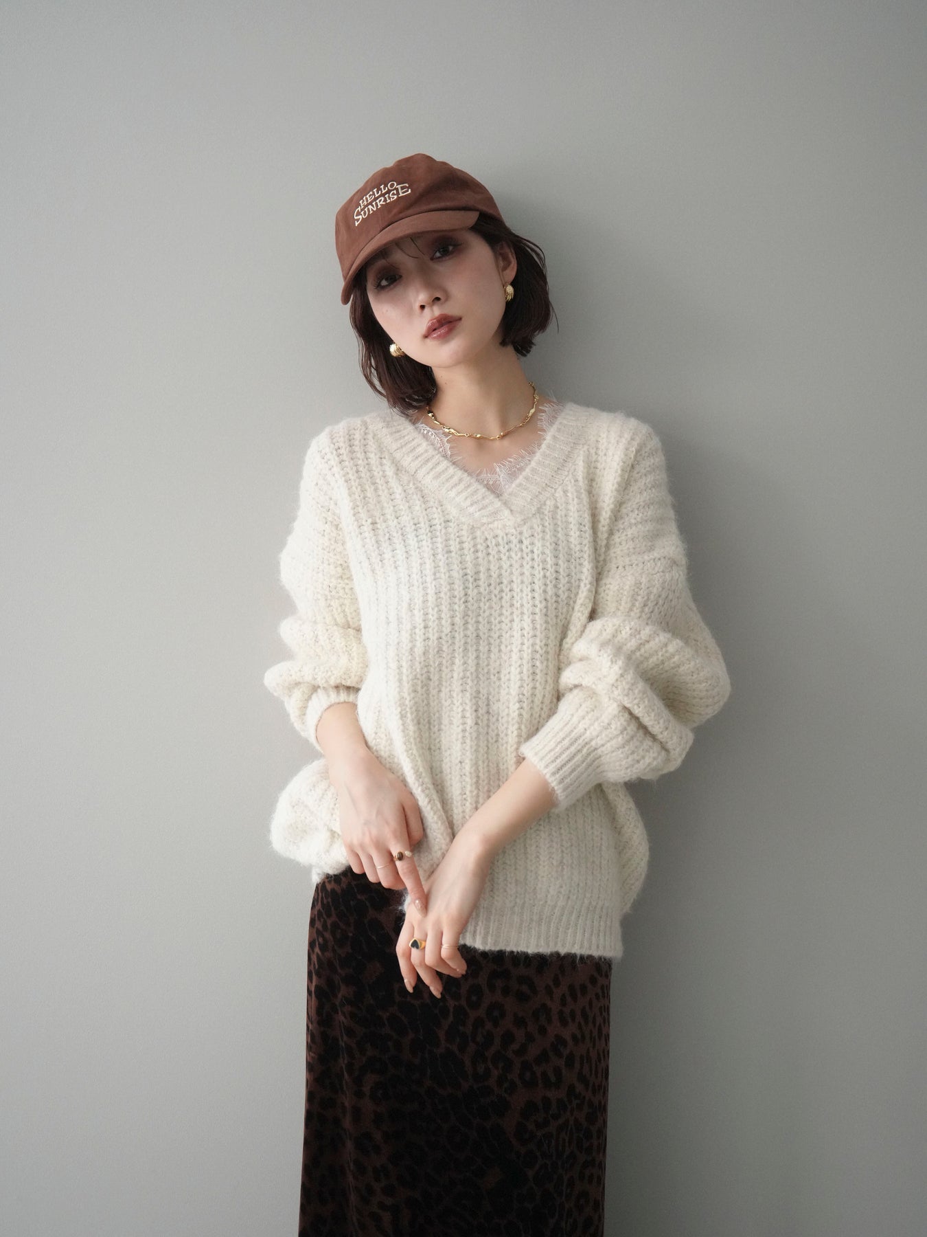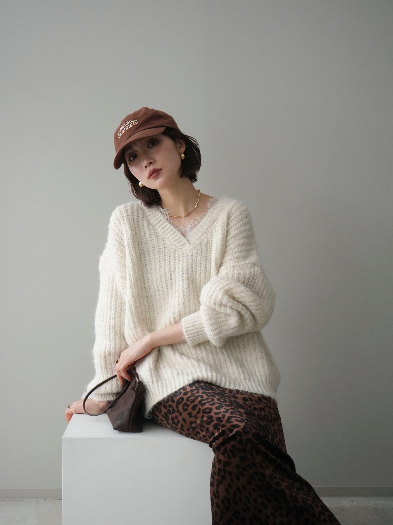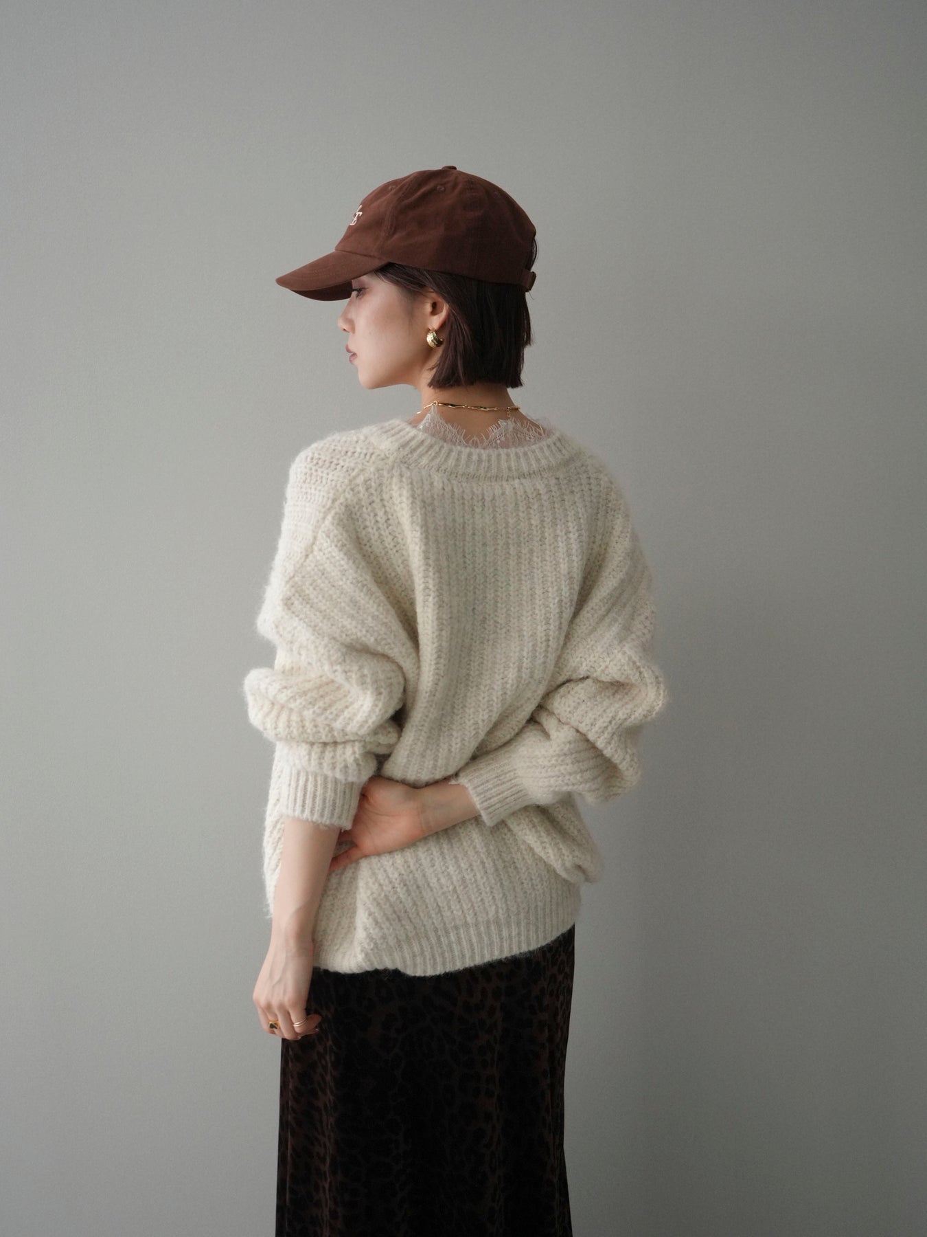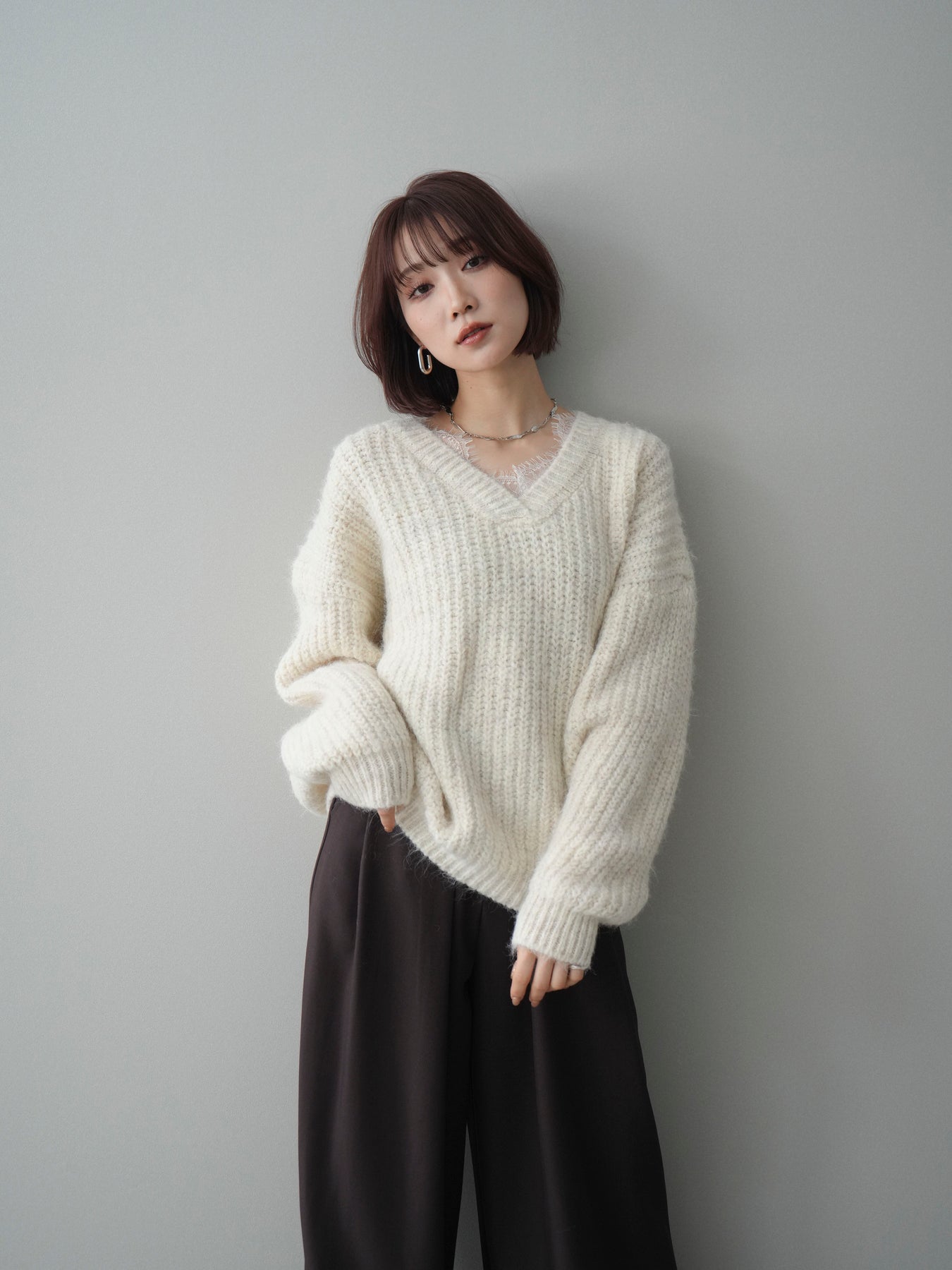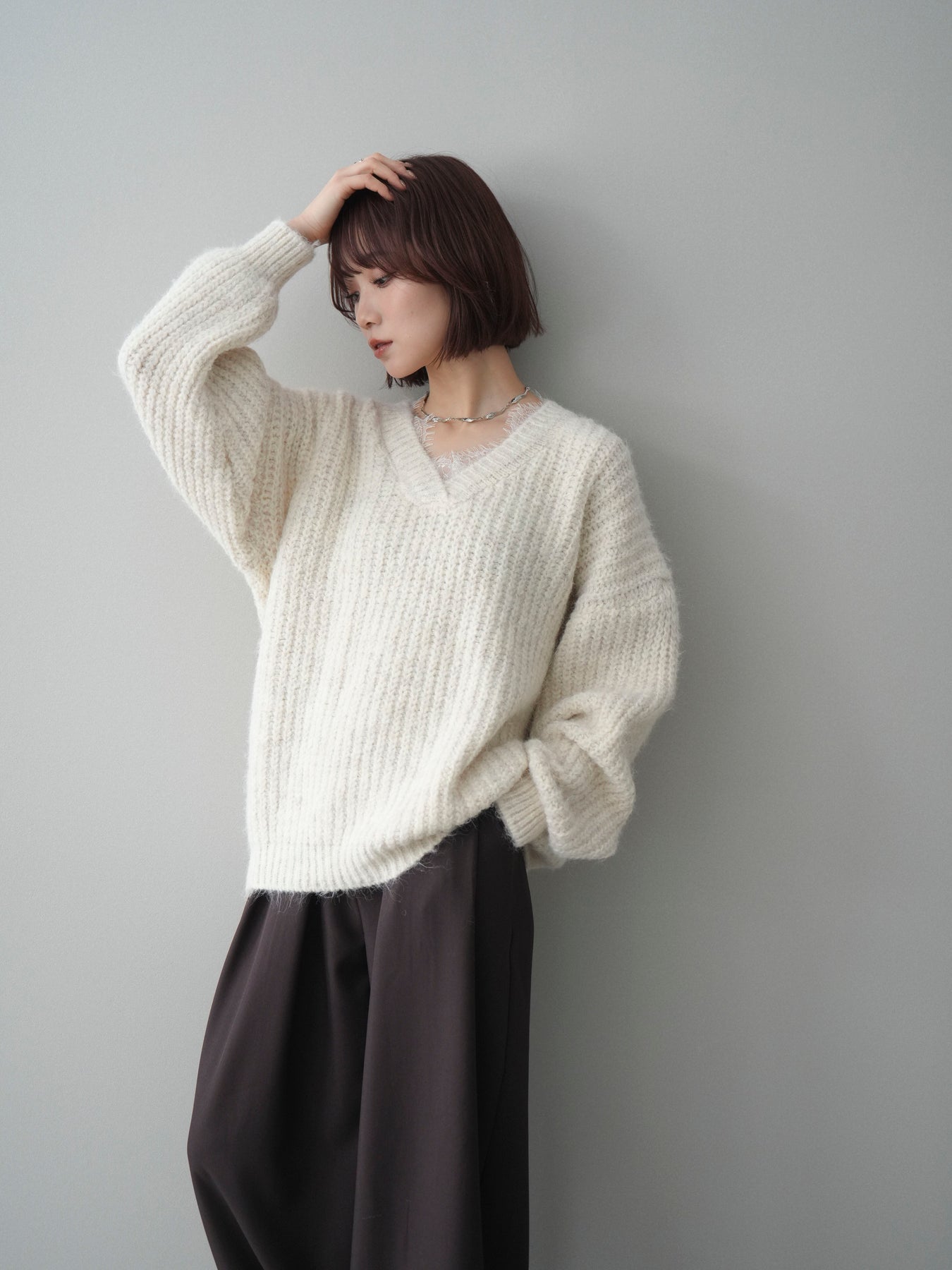 ざっくりとした編み地にレースのアクセントを加えたVネックニットプルオーバー。 ボリュームのある袖やゆとりのあるシルエットが、女性らしい抜け感を演出します。 襟元にあしらったレースがさりげなく華やかさを添え、一枚で着映えするアイテム。 柔らかな素材感で着心地もよく、カジュアルからフェミニンまで幅広いスタイリングにマッチします。 ボトムスを選ばず、デニムやスカートとの相性も抜群。
