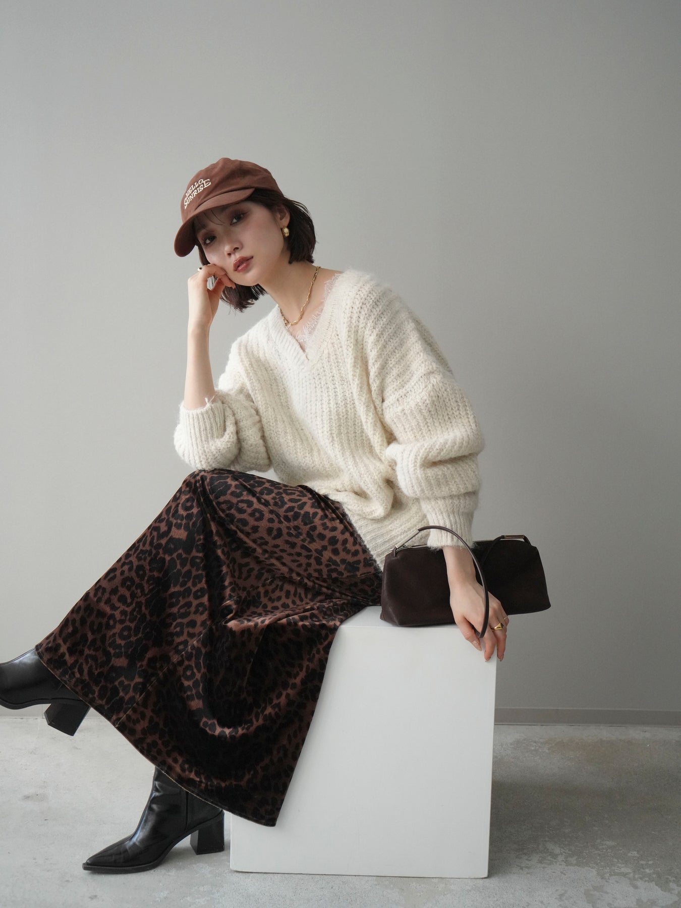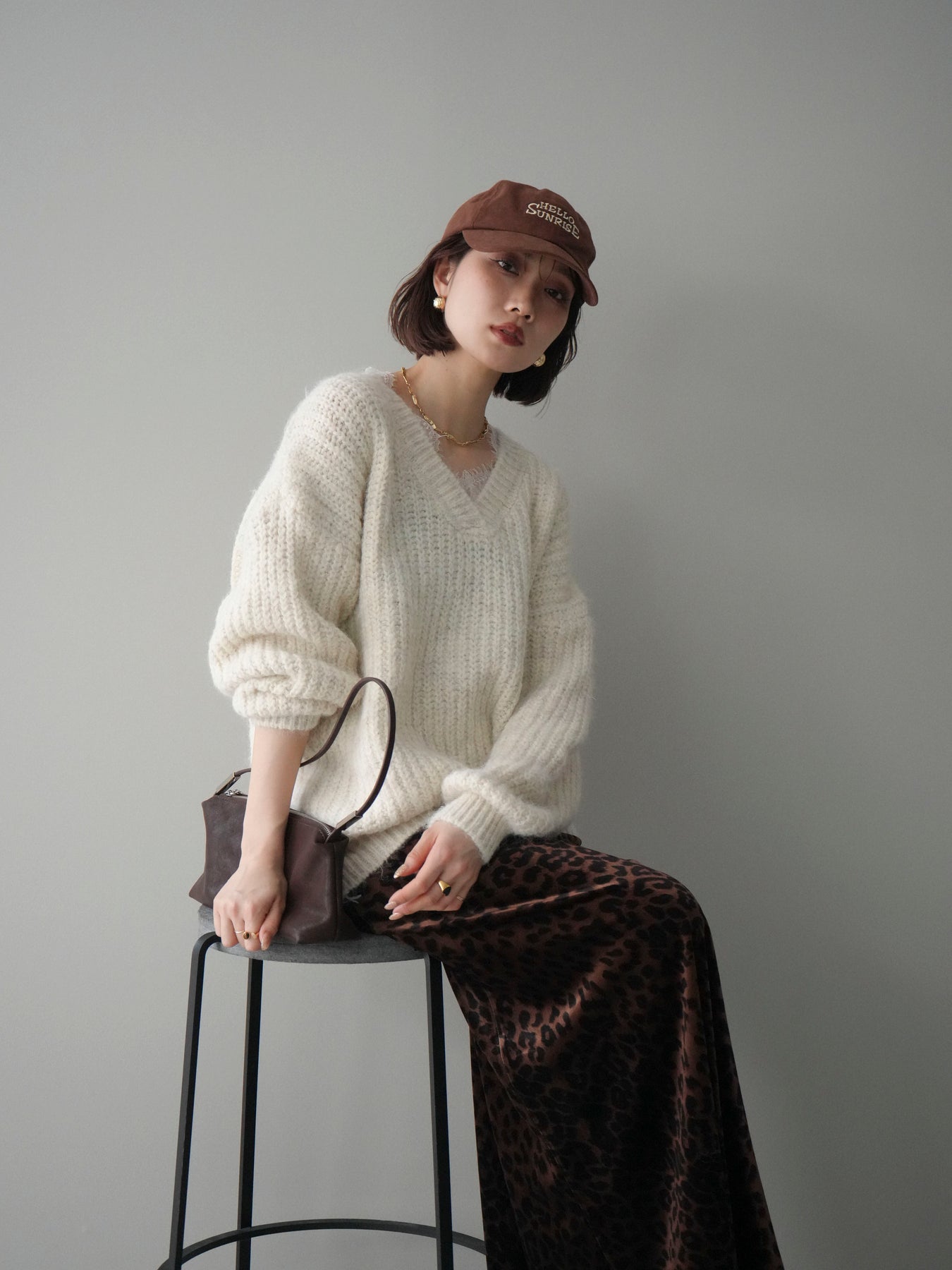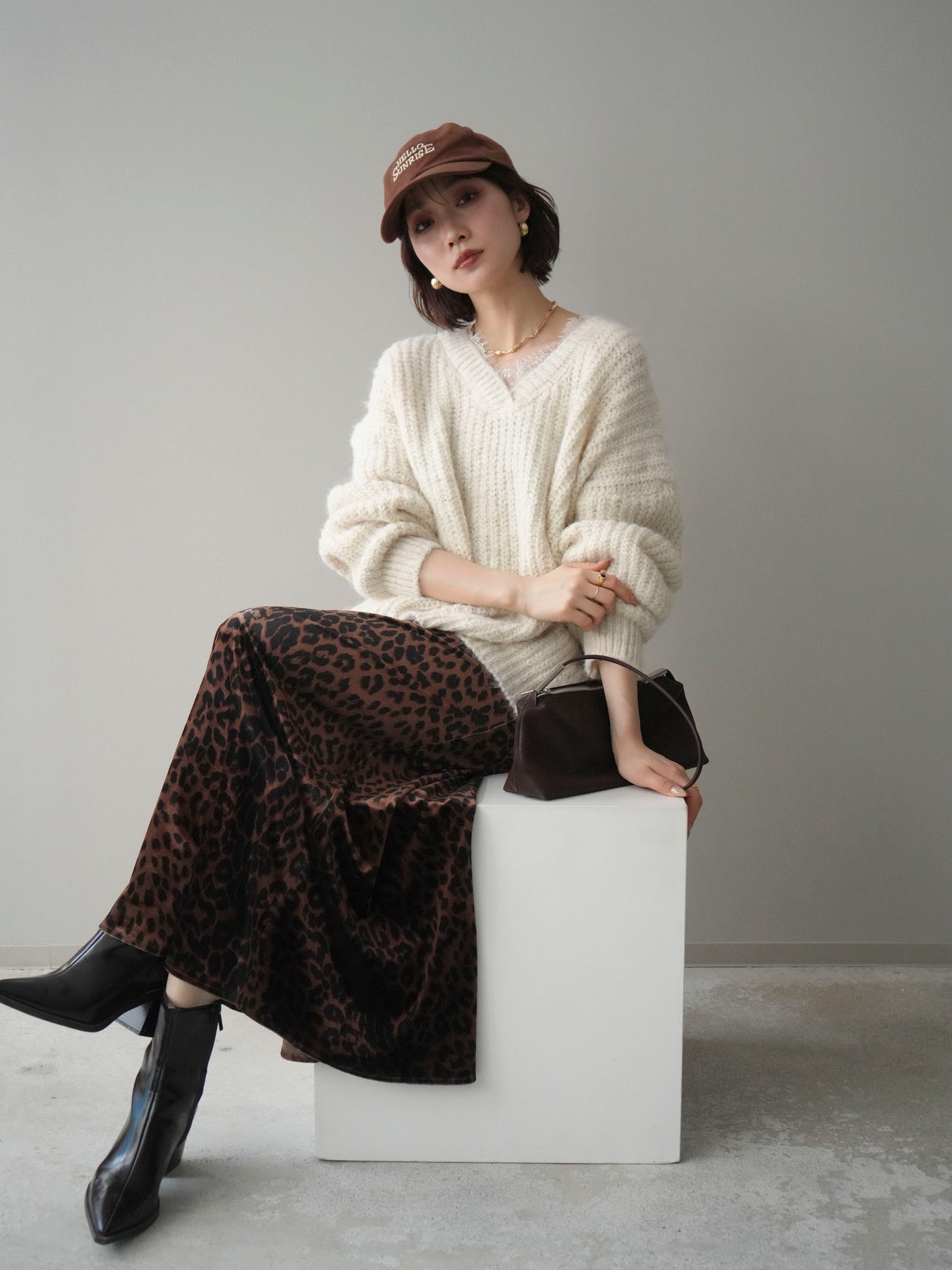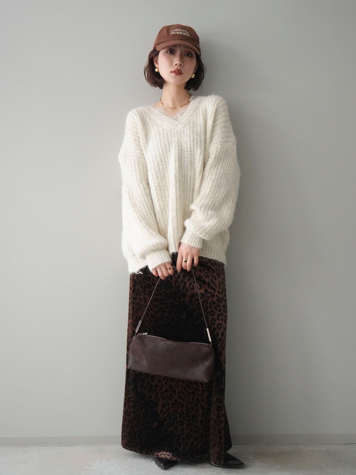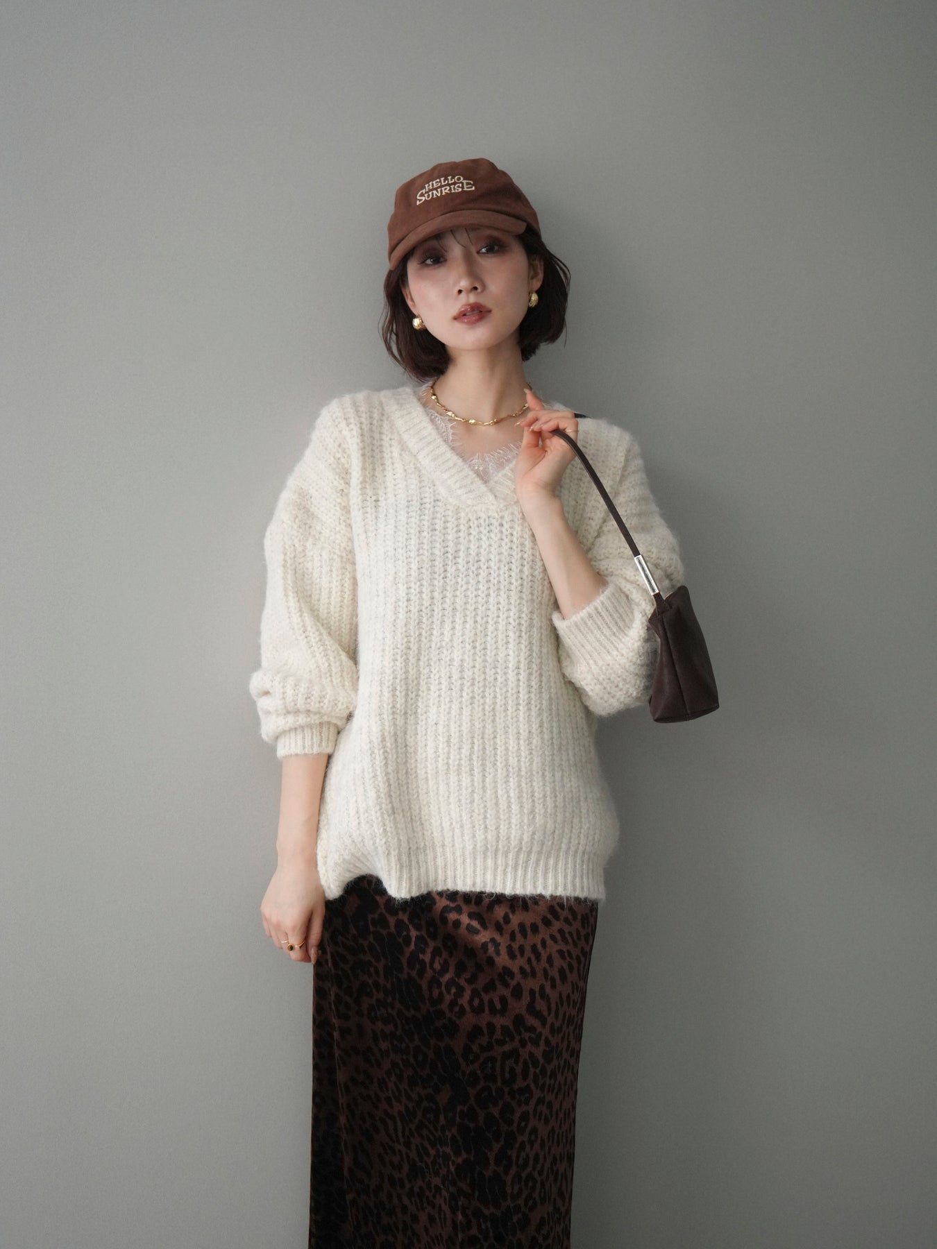 ざっくりとした編み地にレースのアクセントを加えたVネックニットプルオーバー。 ボリュームのある袖やゆとりのあるシルエットが、女性らしい抜け感を演出します。 襟元にあしらったレースがさりげなく華やかさを添え、一枚で着映えするアイテム。 柔らかな素材感で着心地もよく、カジュアルからフェミニンまで幅広いスタイリングにマッチします。 ボトムスを選ばず、デニムやスカートとの相性も抜群。