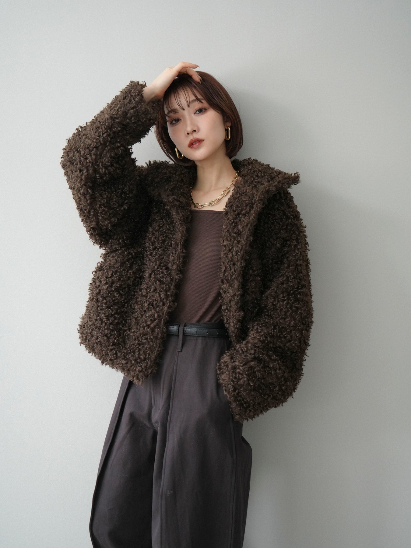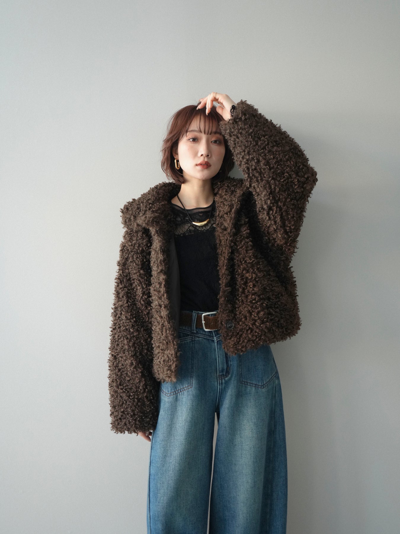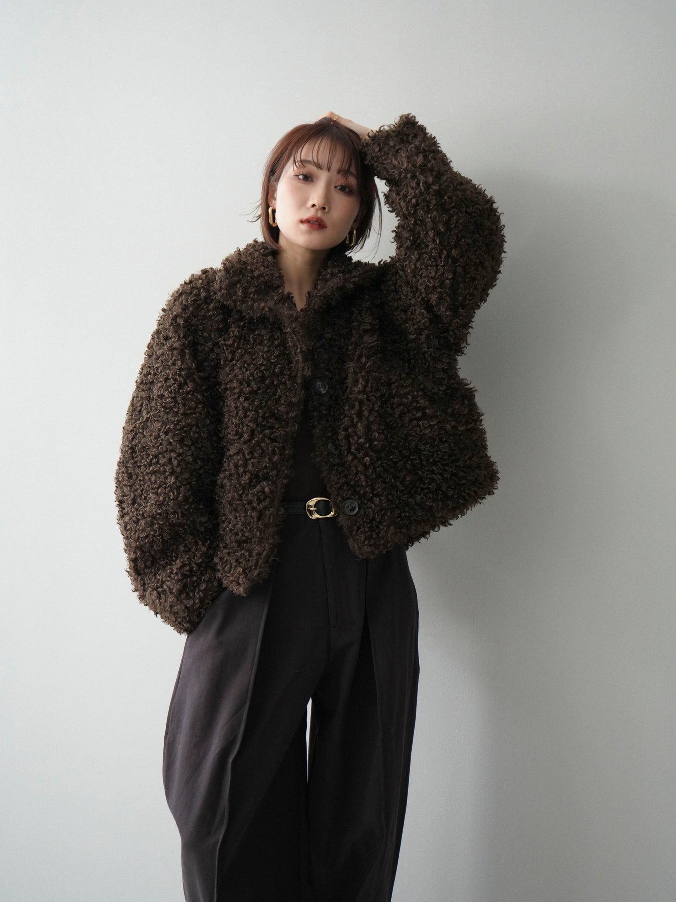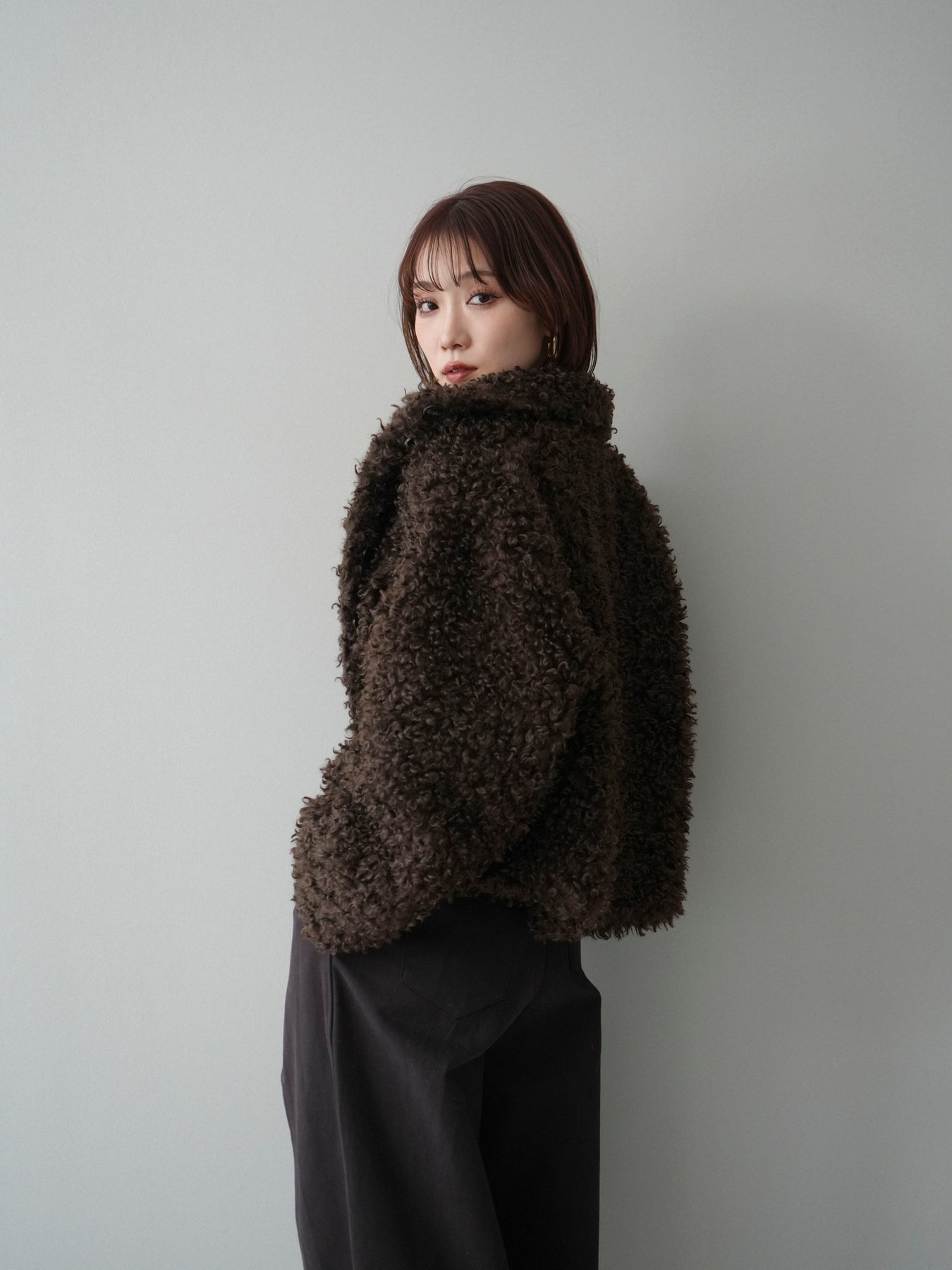 プードルファーの立体的な素材感が印象的なミドル丈ブルゾン。スタンドカラー仕様で首元まで包み込み、程よいボリューム感がコーディネートに存在感をプラスします。パンツにもスカートにも合わせやすく、季節感のある着こなしが完成する一着です。