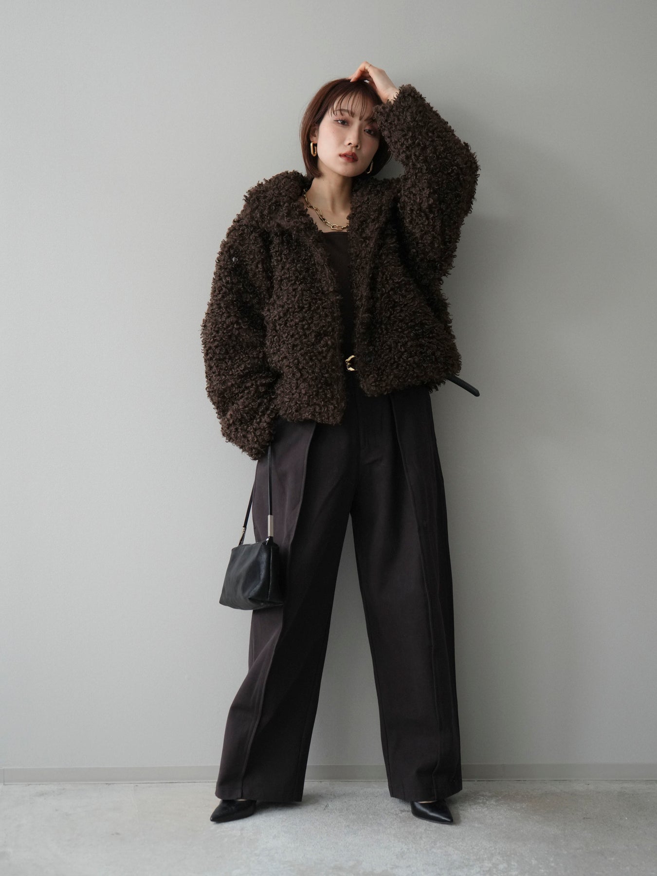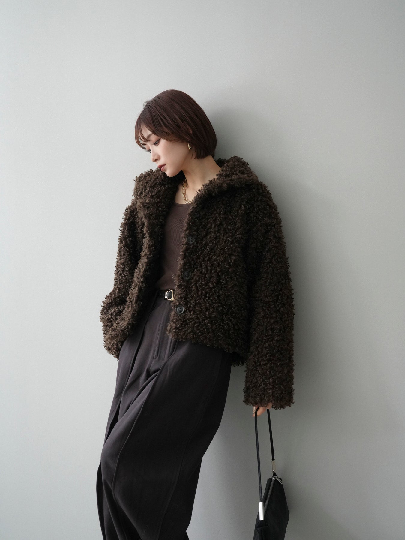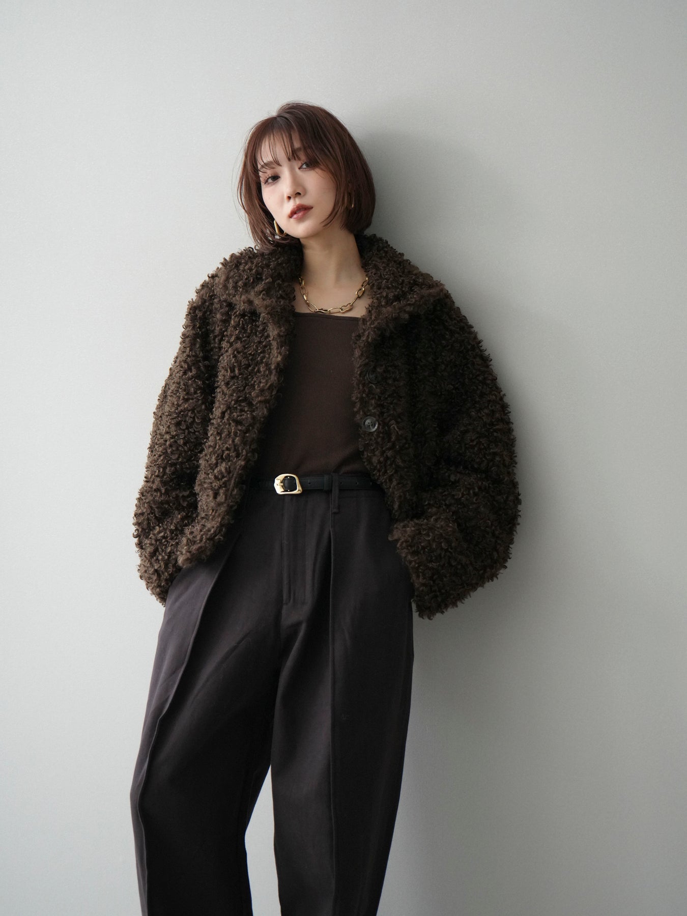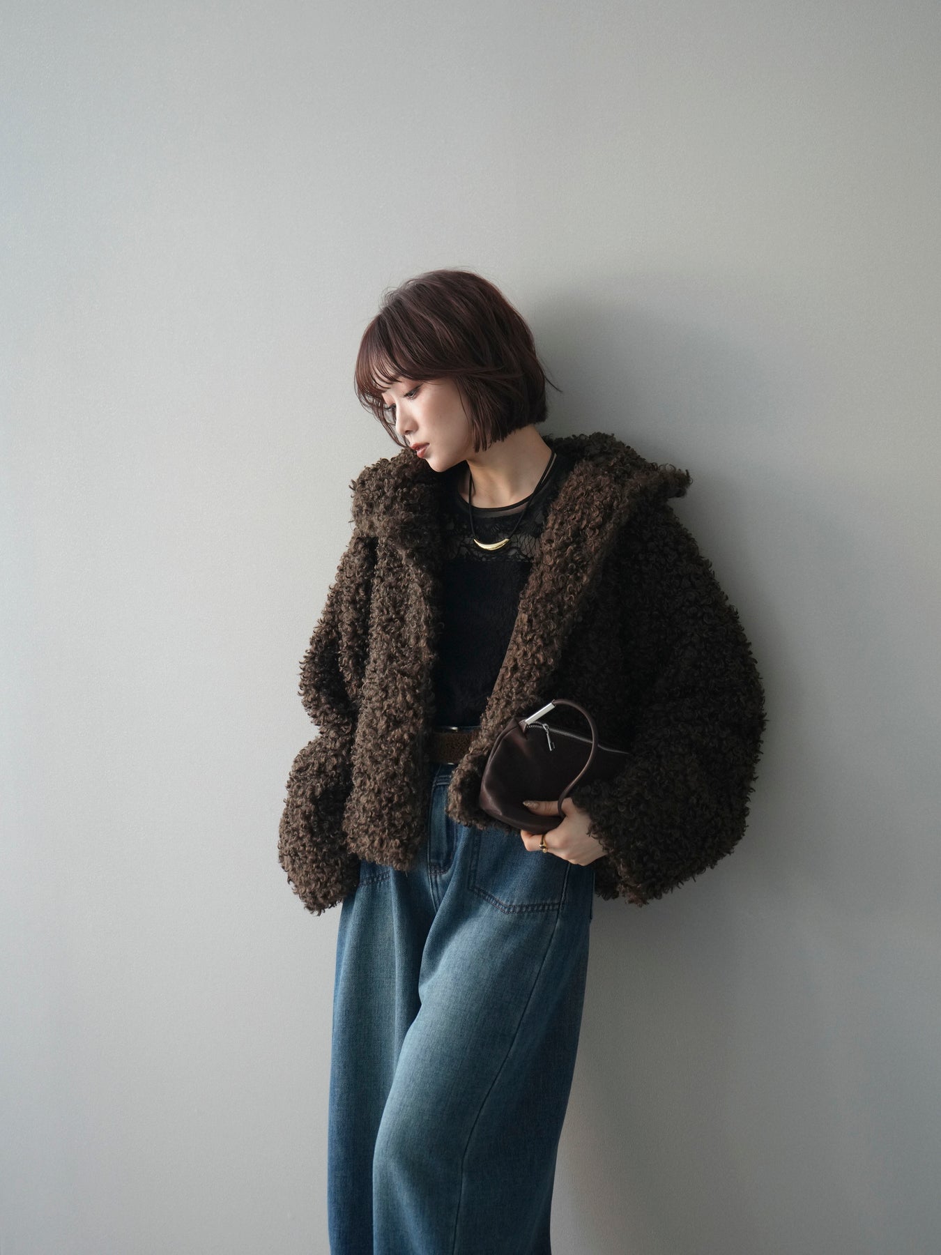 プードルファーの立体的な素材感が印象的なミドル丈ブルゾン。スタンドカラー仕様で首元まで包み込み、程よいボリューム感がコーディネートに存在感をプラスします。パンツにもスカートにも合わせやすく、季節感のある着こなしが完成する一着です。