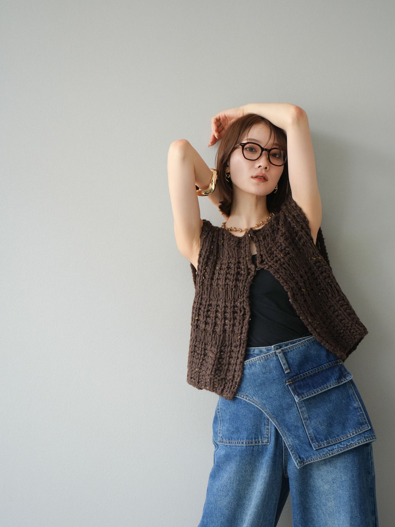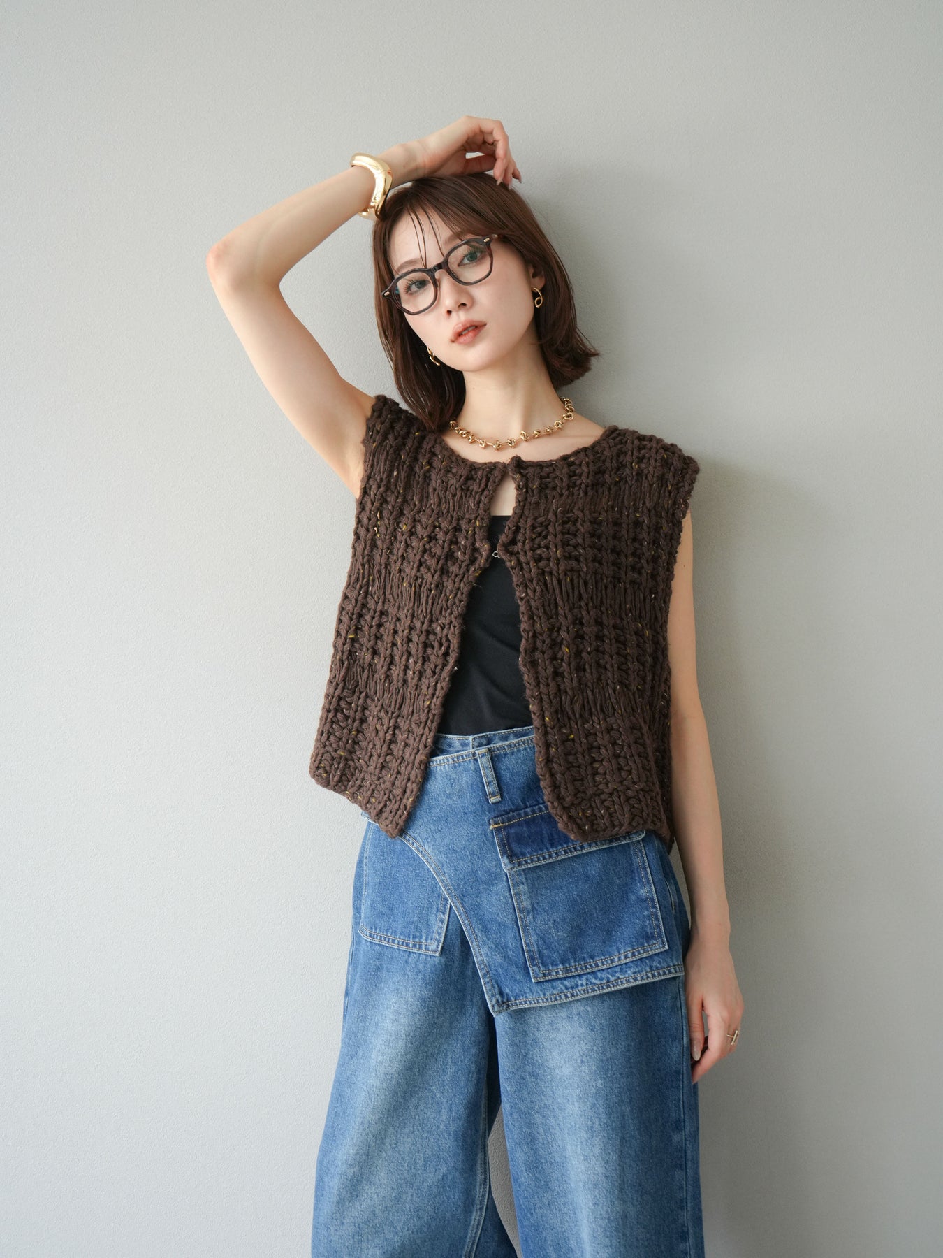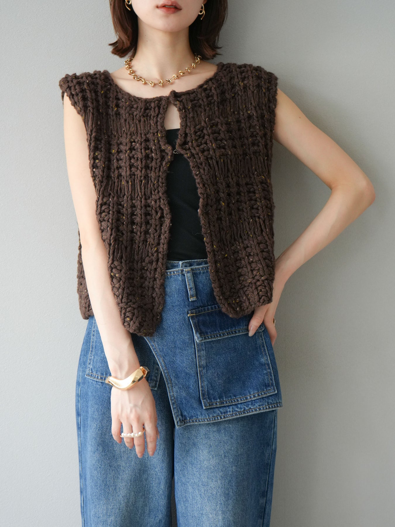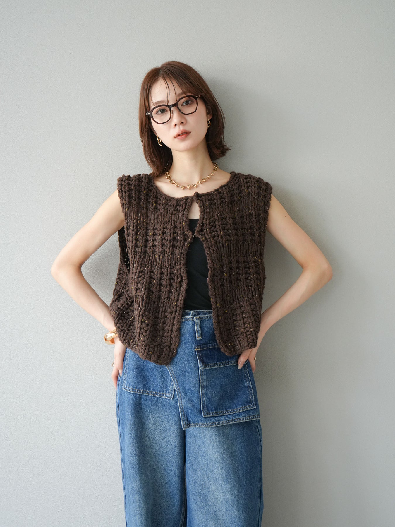 [予約]ミックスヤーンデザイン編みニットベスト/ブラウン