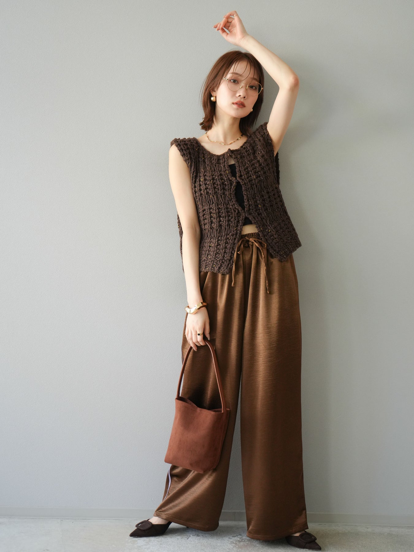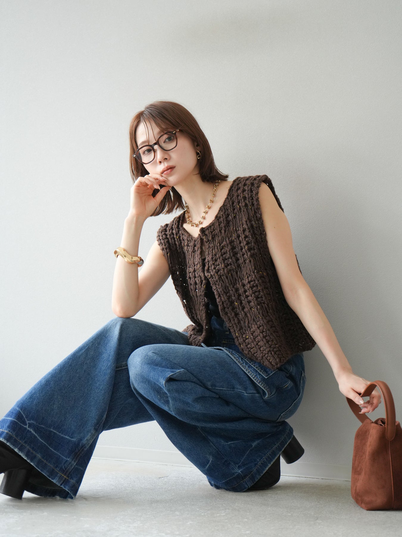 複数の糸をミックスした表情豊かな編地が魅力のニットベスト。ざっくりとした編み目が存在感を放ち、シンプルなアイテムに重ねるだけで旬なスタイリングに仕上がります。程よくゆとりのあるシルエットでレイヤードがしやすく、シャツやカットソーとの相性も抜群。短すぎない丈感でボトムスを選ばず、パンツにもスカートにも合わせやすい万能さもポイントです。ナチュラルな風合いと立体感のあるデザインが、コーディネートに奥行きをプラスしてくれるアイテムです。 ※ボトムス、キャミソール(インナー)以外の商品は一律でインナーは付属していません。