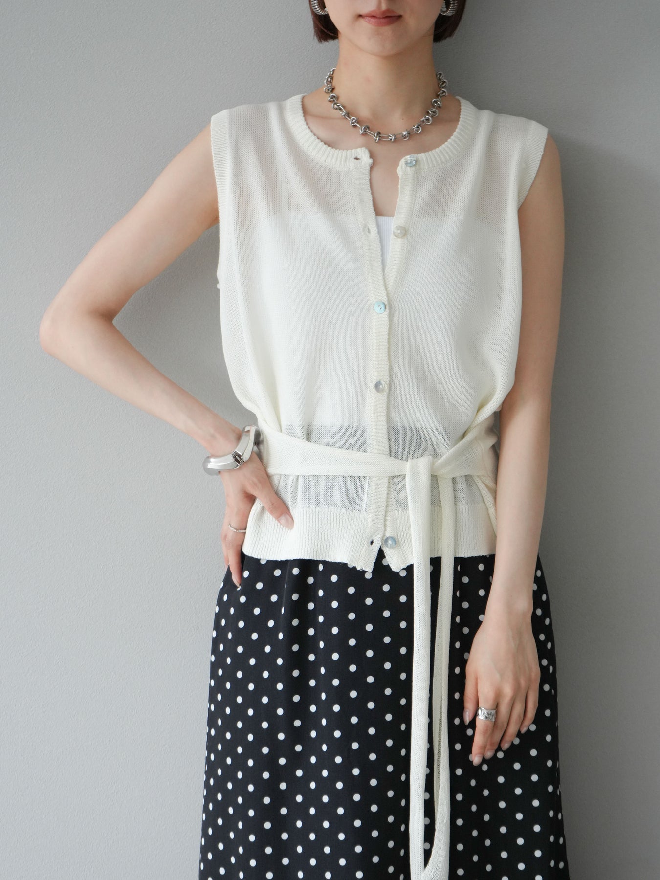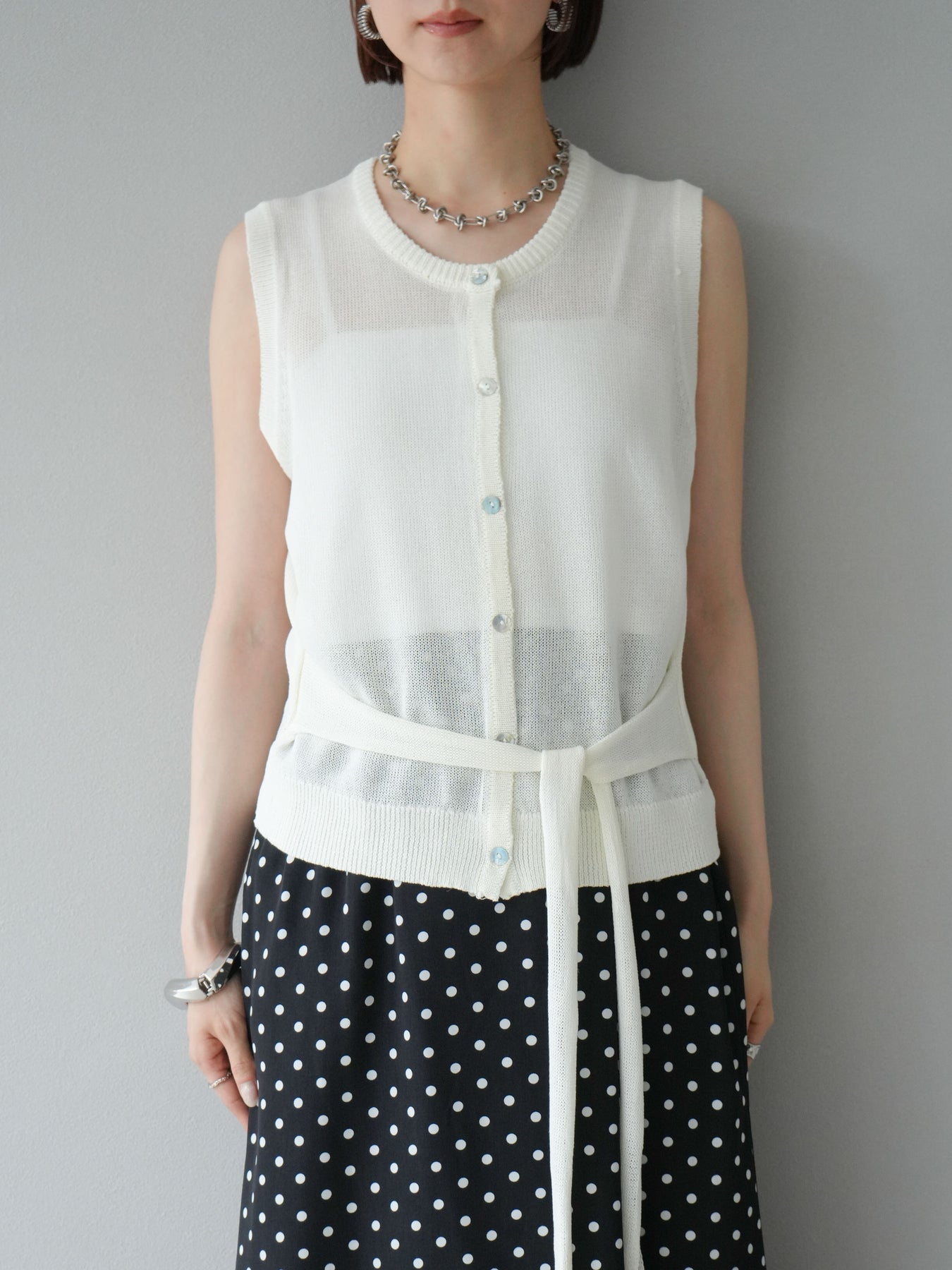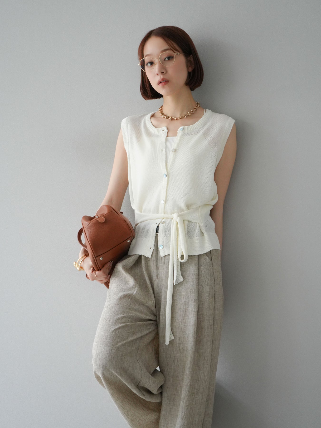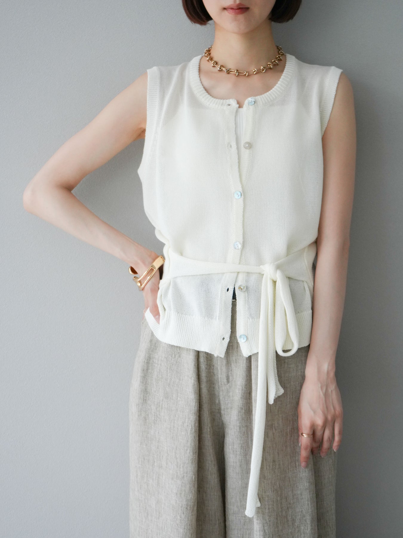 軽やかで透け感のある薄手のニット素材を使用した、涼しげな印象のニットベスト。前立てにはシンプルなボタンを並べ、クラシカルな雰囲気をプラス。ウエストには同素材のベルトが付属し、結び方次第でシルエットに変化をつけられるデザインです。 羽織りとしても、ボタンを留めてプルオーバー風にも着られる2WAY仕様。Tシャツやノースリーブに重ねるだけで、コーディネートに奥行きが生まれます。 カジュアルからきれいめまで幅広く対応できる、着回し力の高いアイテムです。 ※ボトムス、キャミソール(インナー)以外の商品は一律でインナーは付属していません。