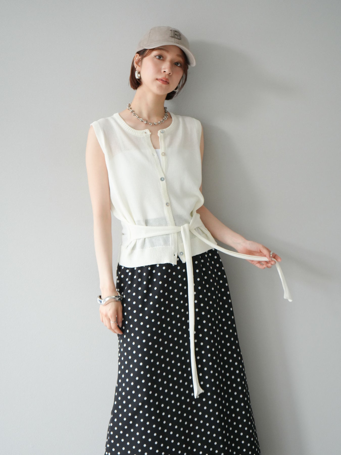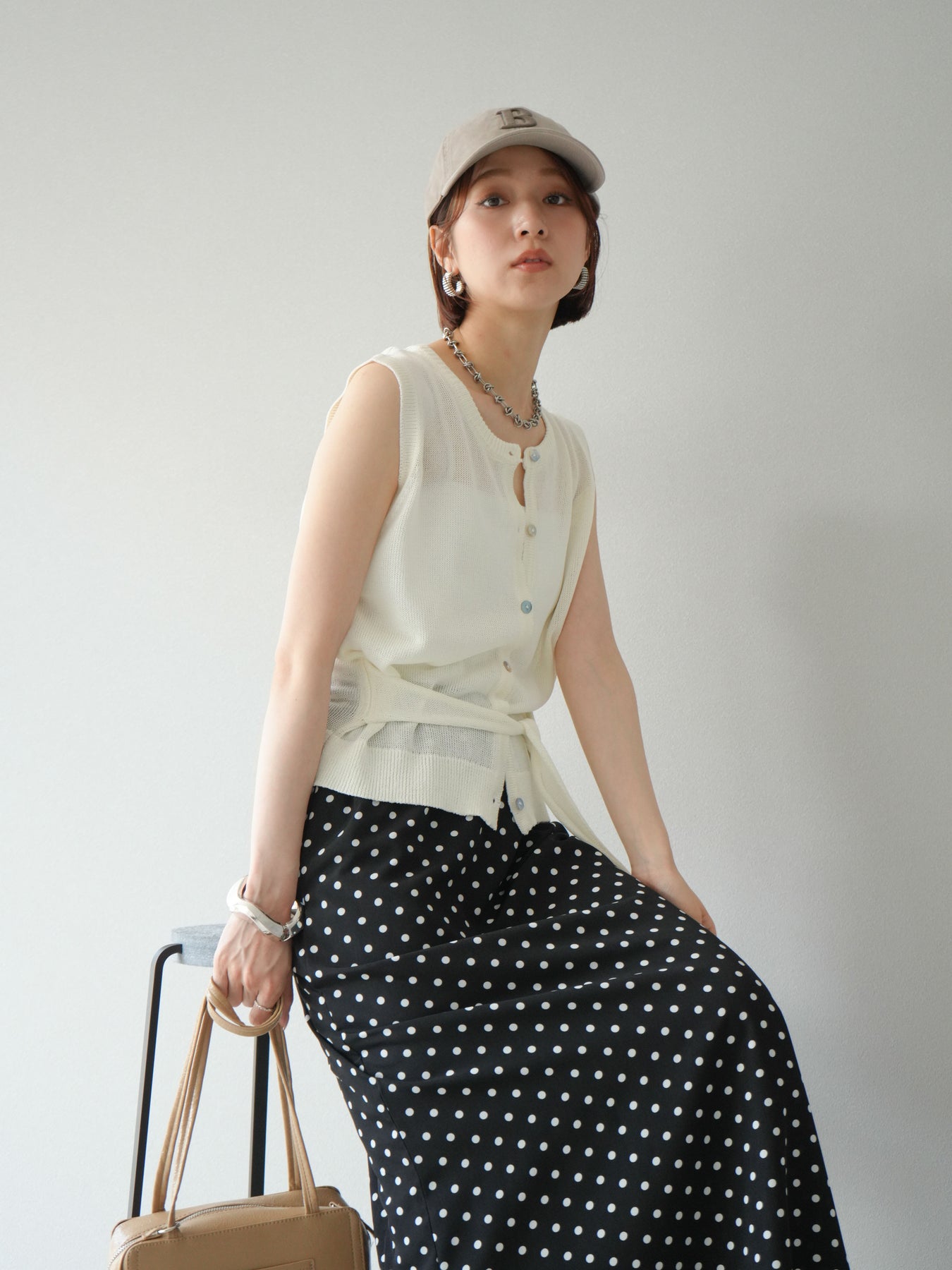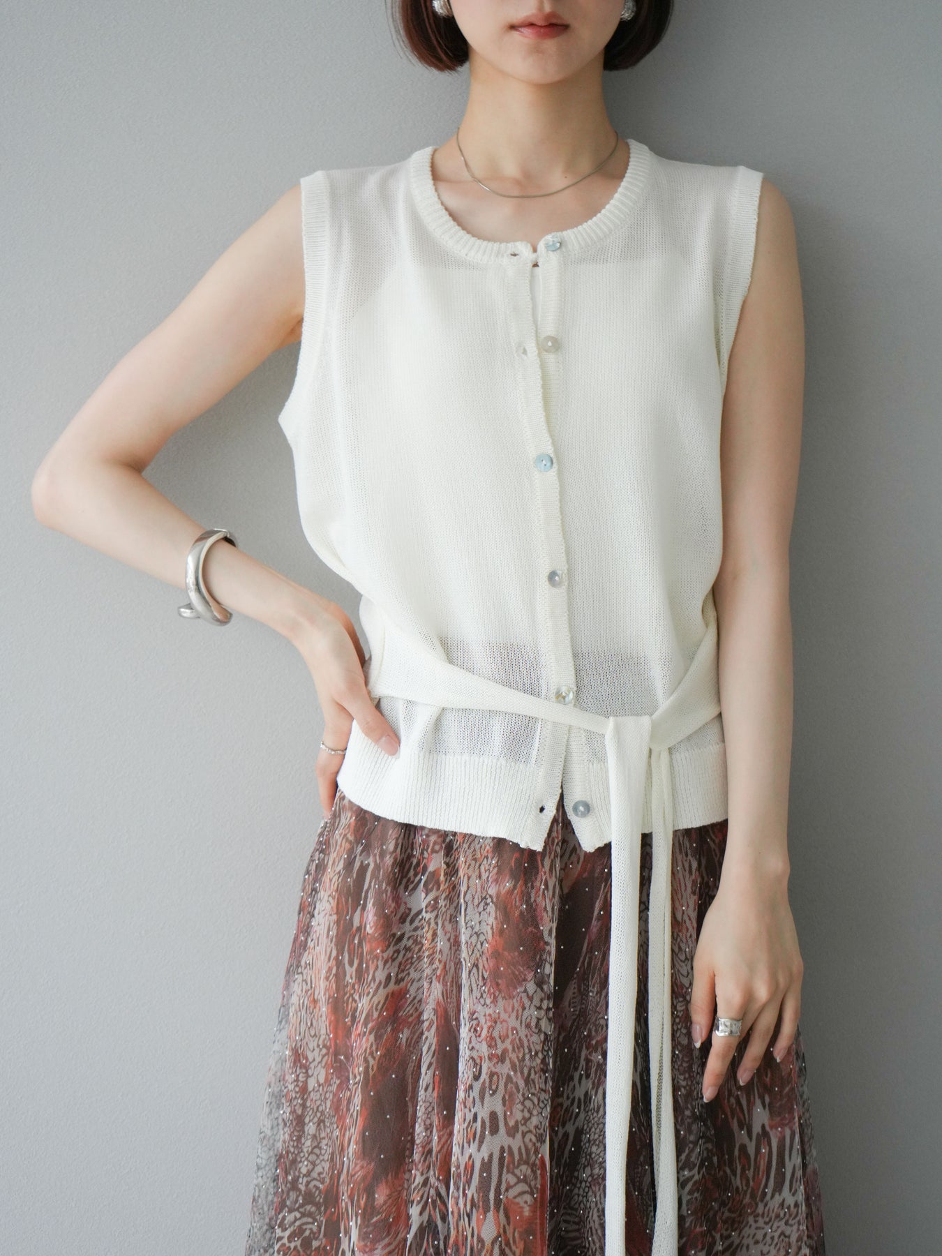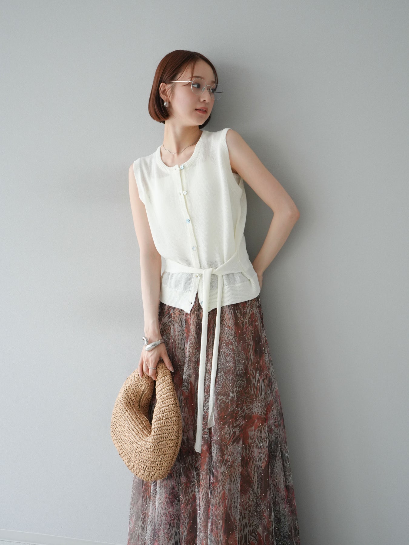 軽やかで透け感のある薄手のニット素材を使用した、涼しげな印象のニットベスト。前立てにはシンプルなボタンを並べ、クラシカルな雰囲気をプラス。ウエストには同素材のベルトが付属し、結び方次第でシルエットに変化をつけられるデザインです。 羽織りとしても、ボタンを留めてプルオーバー風にも着られる2WAY仕様。Tシャツやノースリーブに重ねるだけで、コーディネートに奥行きが生まれます。 カジュアルからきれいめまで幅広く対応できる、着回し力の高いアイテムです。 ※ボトムス、キャミソール(インナー)以外の商品は一律でインナーは付属していません。