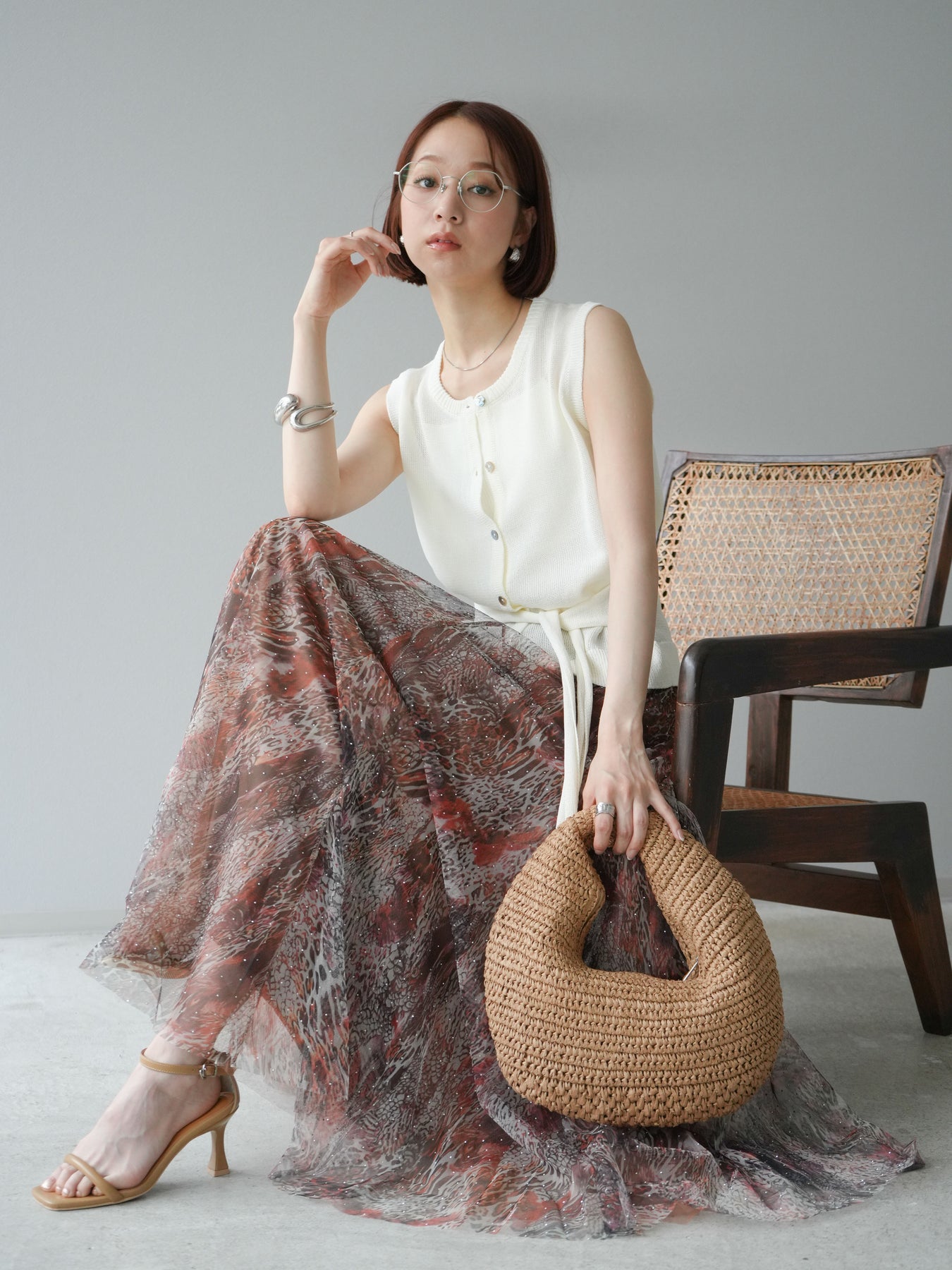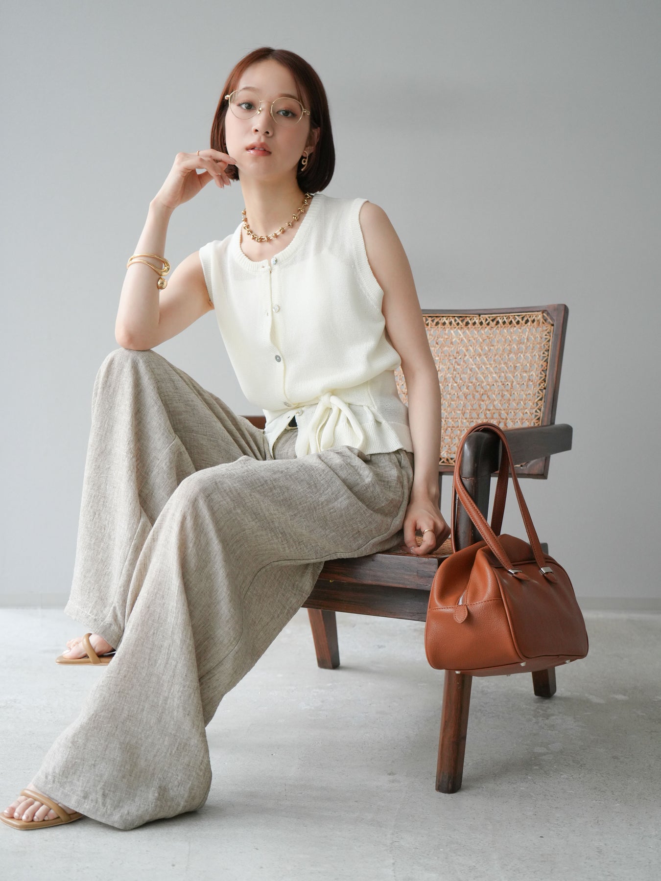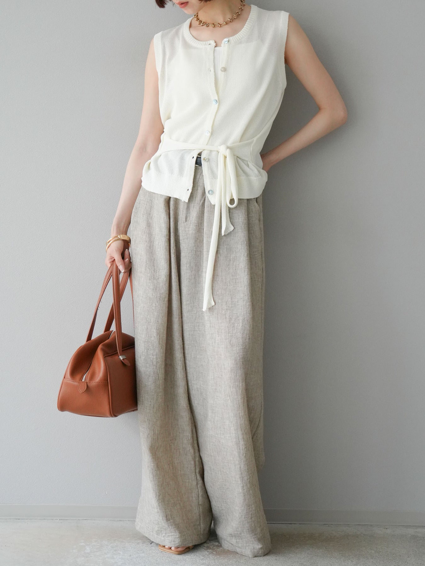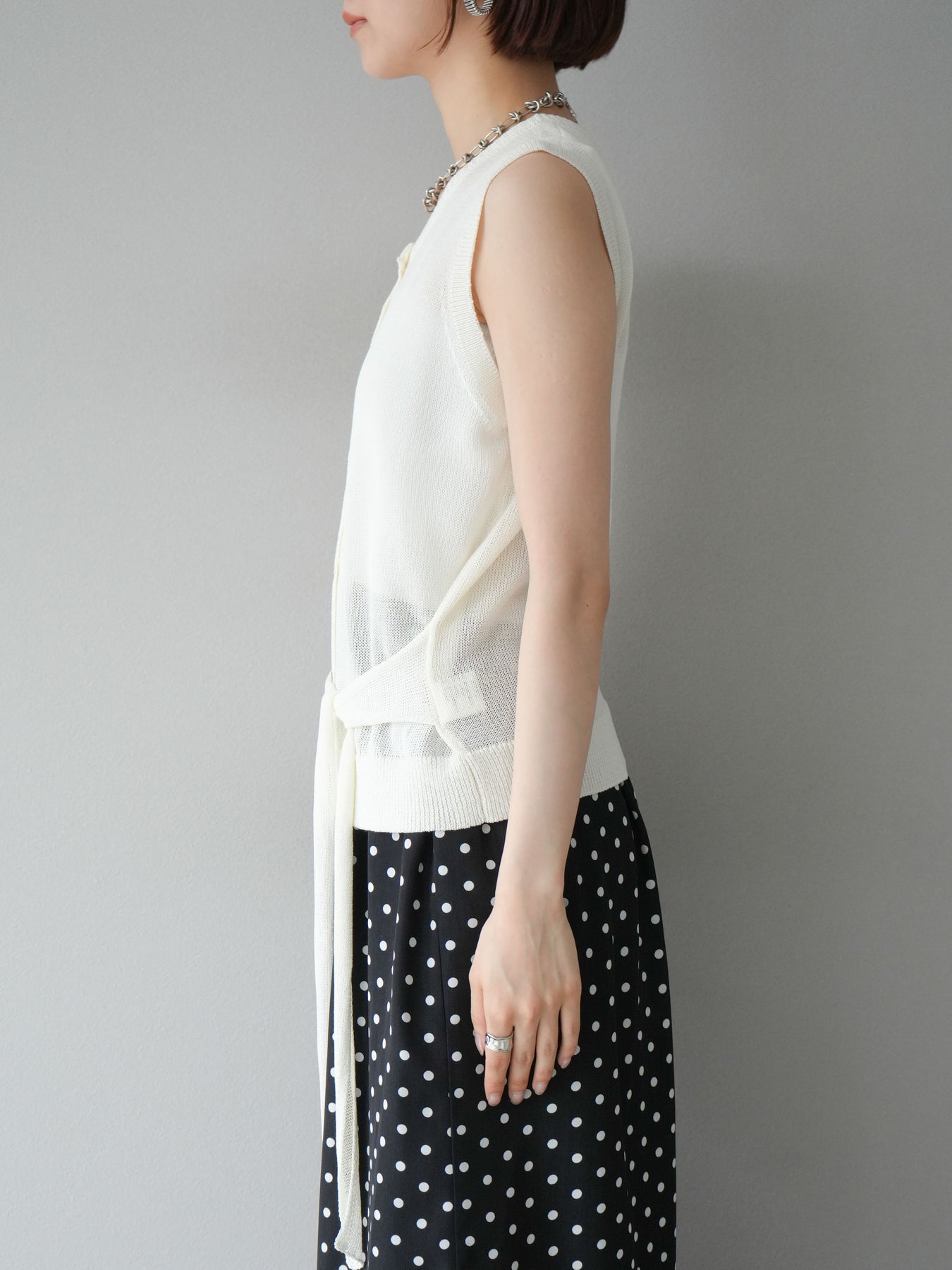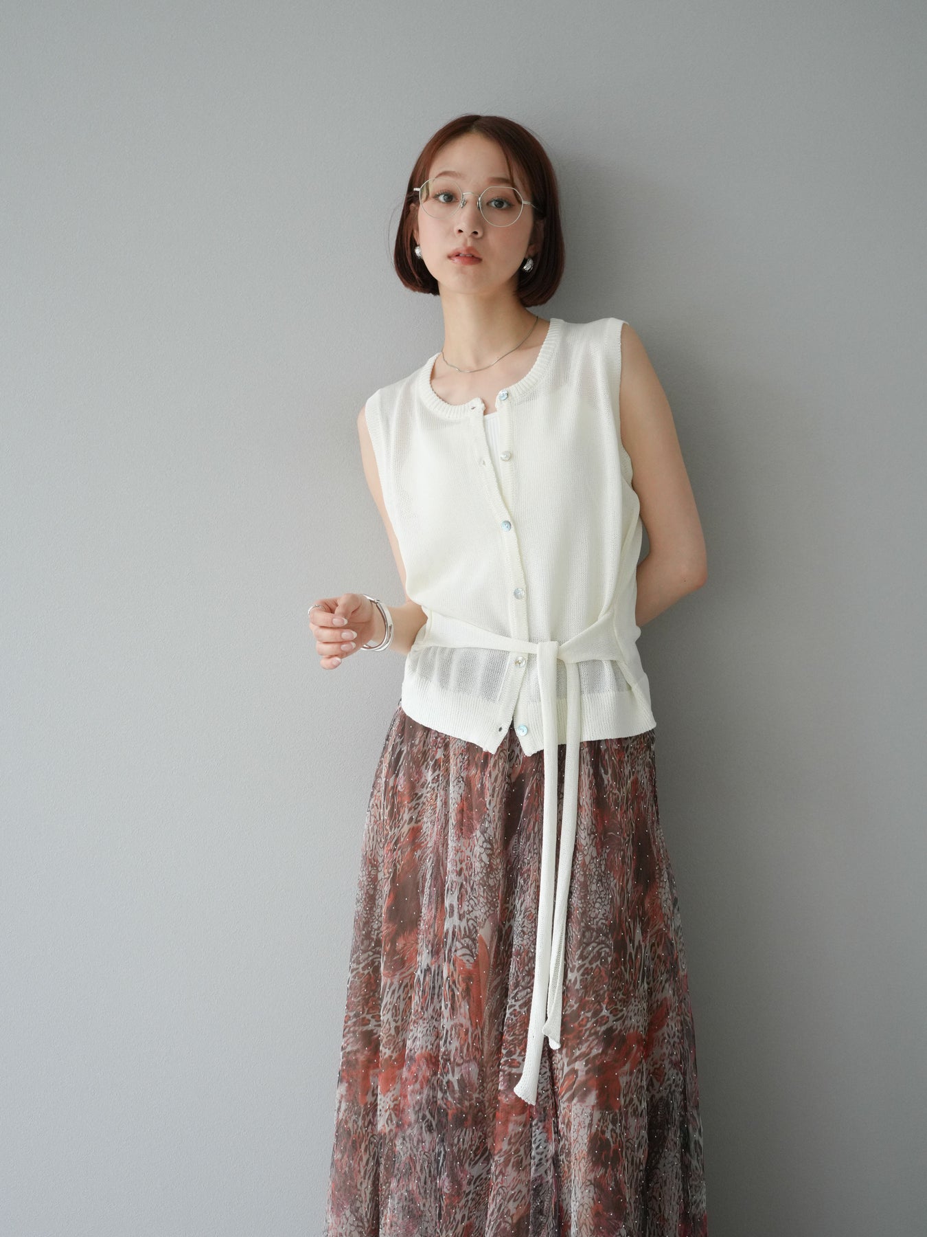 軽やかで透け感のある薄手のニット素材を使用した、涼しげな印象のニットベスト。前立てにはシンプルなボタンを並べ、クラシカルな雰囲気をプラス。ウエストには同素材のベルトが付属し、結び方次第でシルエットに変化をつけられるデザインです。 羽織りとしても、ボタンを留めてプルオーバー風にも着られる2WAY仕様。Tシャツやノースリーブに重ねるだけで、コーディネートに奥行きが生まれます。 カジュアルからきれいめまで幅広く対応できる、着回し力の高いアイテムです。 ※ボトムス、キャミソール(インナー)以外の商品は一律でインナーは付属していません。