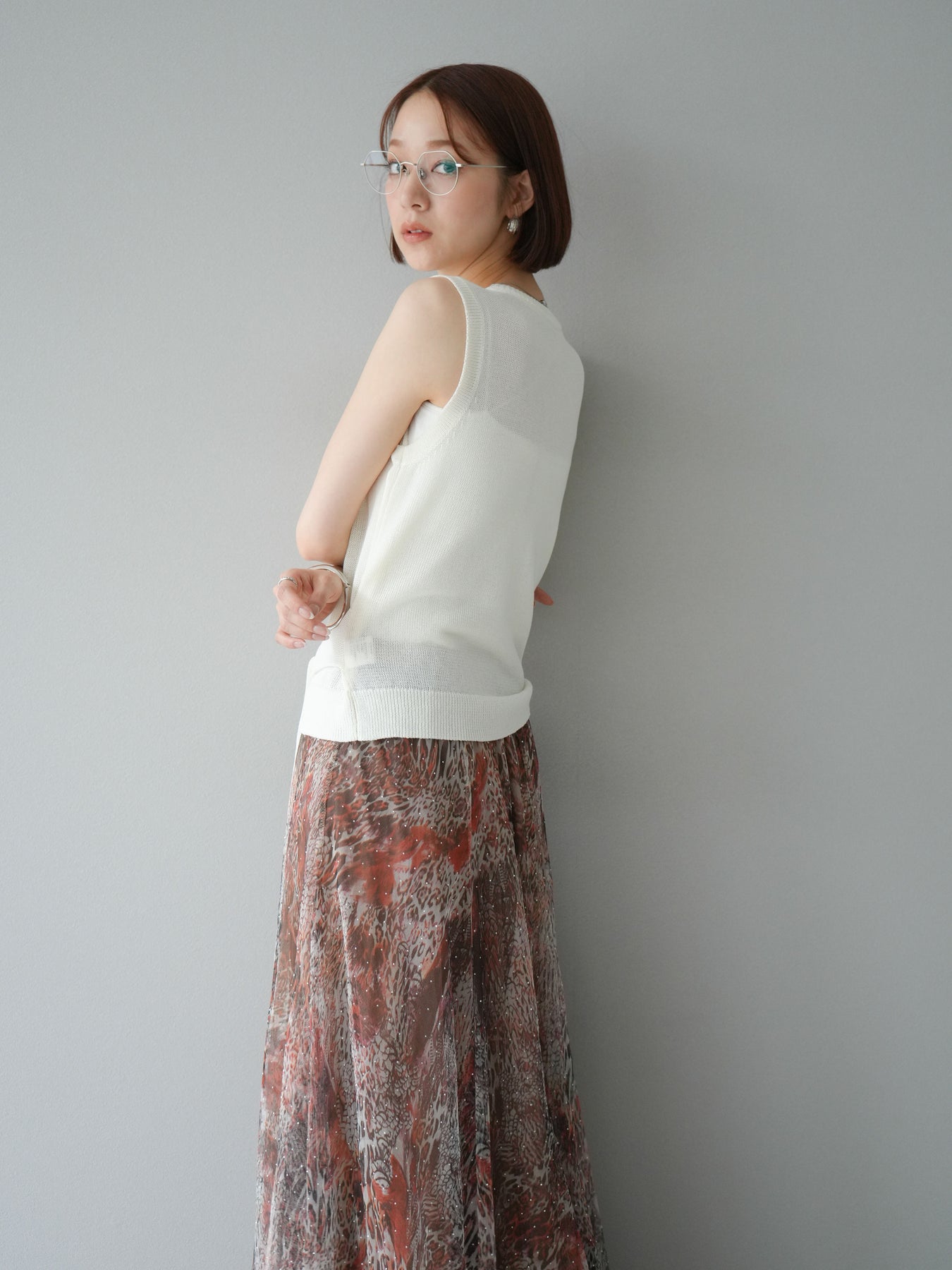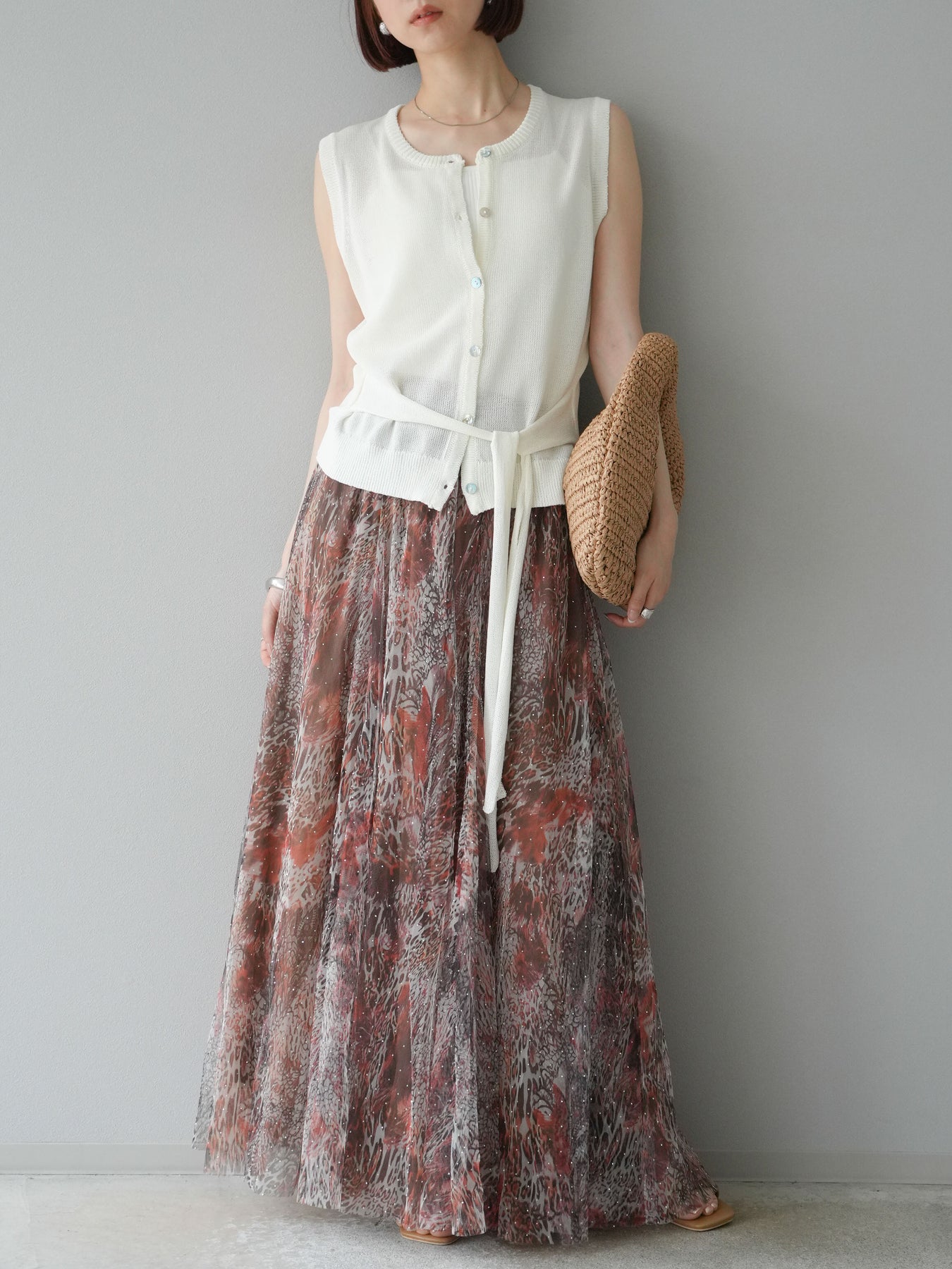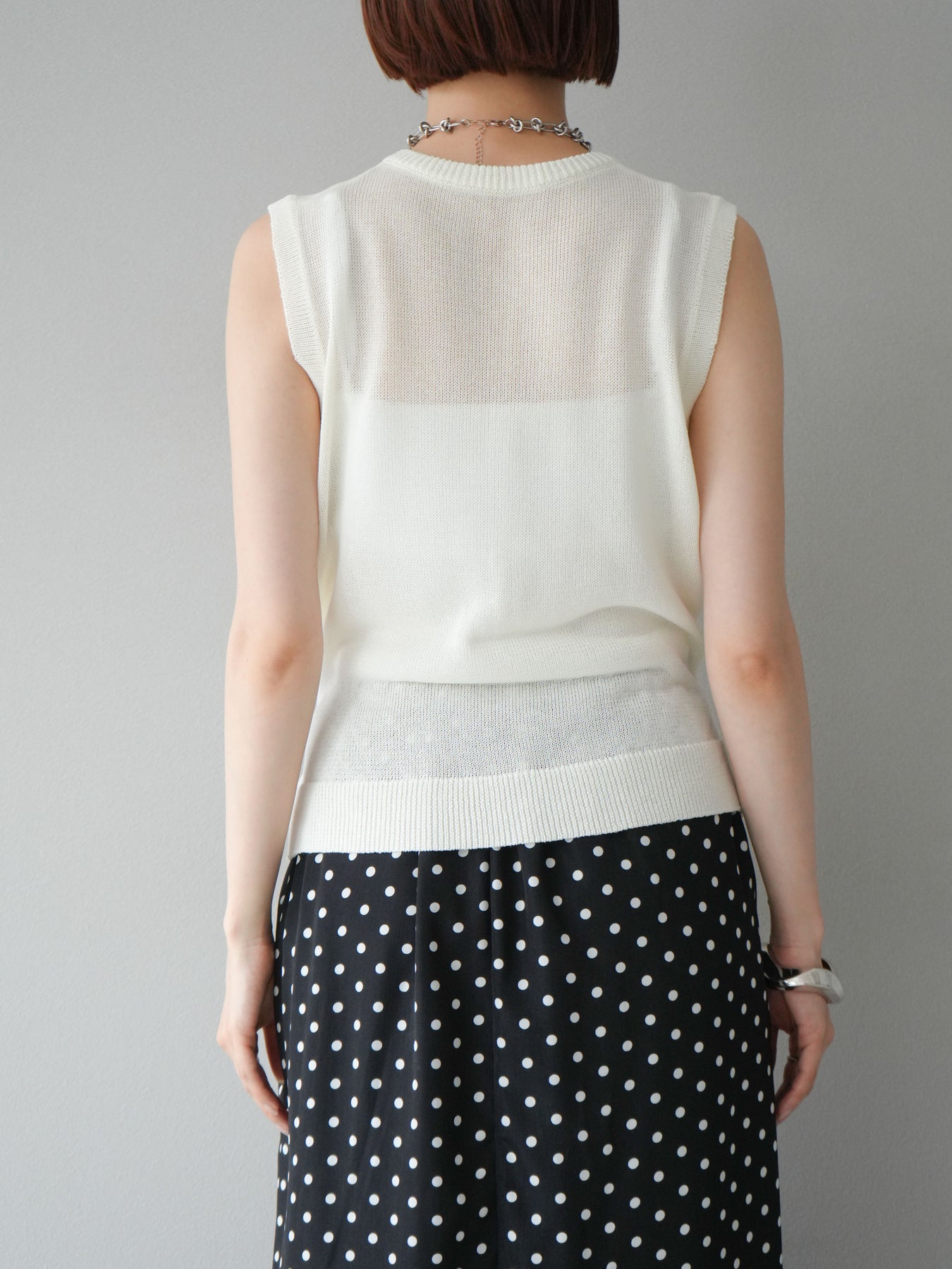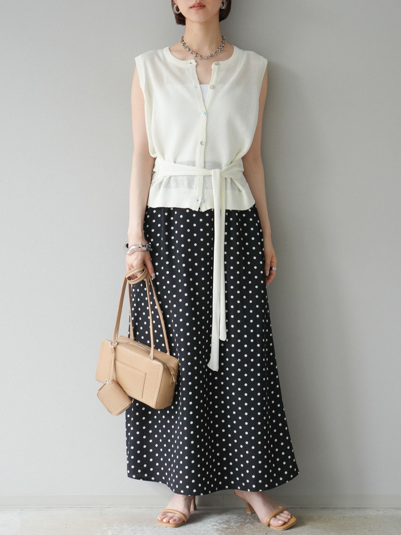 軽やかで透け感のある薄手のニット素材を使用した、涼しげな印象のニットベスト。前立てにはシンプルなボタンを並べ、クラシカルな雰囲気をプラス。ウエストには同素材のベルトが付属し、結び方次第でシルエットに変化をつけられるデザインです。 羽織りとしても、ボタンを留めてプルオーバー風にも着られる2WAY仕様。Tシャツやノースリーブに重ねるだけで、コーディネートに奥行きが生まれます。 カジュアルからきれいめまで幅広く対応できる、着回し力の高いアイテムです。 ※ボトムス、キャミソール(インナー)以外の商品は一律でインナーは付属していません。