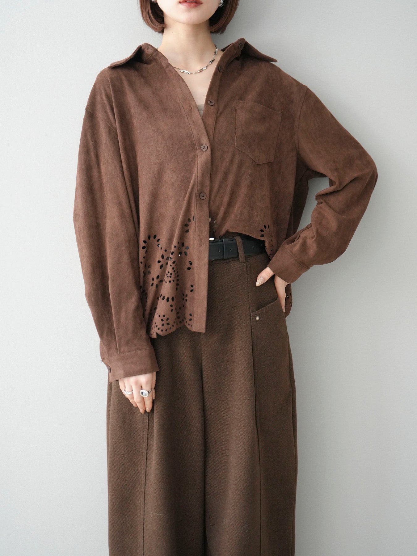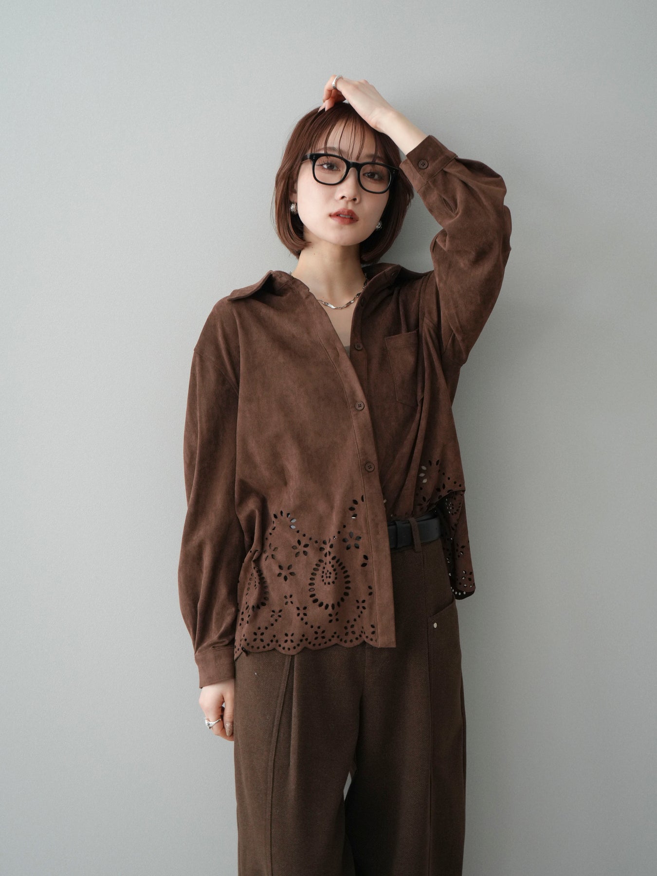 スエード調素材を使用した上品な風合いのシャツ。裾に施したスカラップデザインがさりげないアクセントとなり、シンプルながらも女性らしさを演出します。一枚ではもちろん、羽織としても着回しやすく、幅広いスタイリングに取り入れやすい一着です。