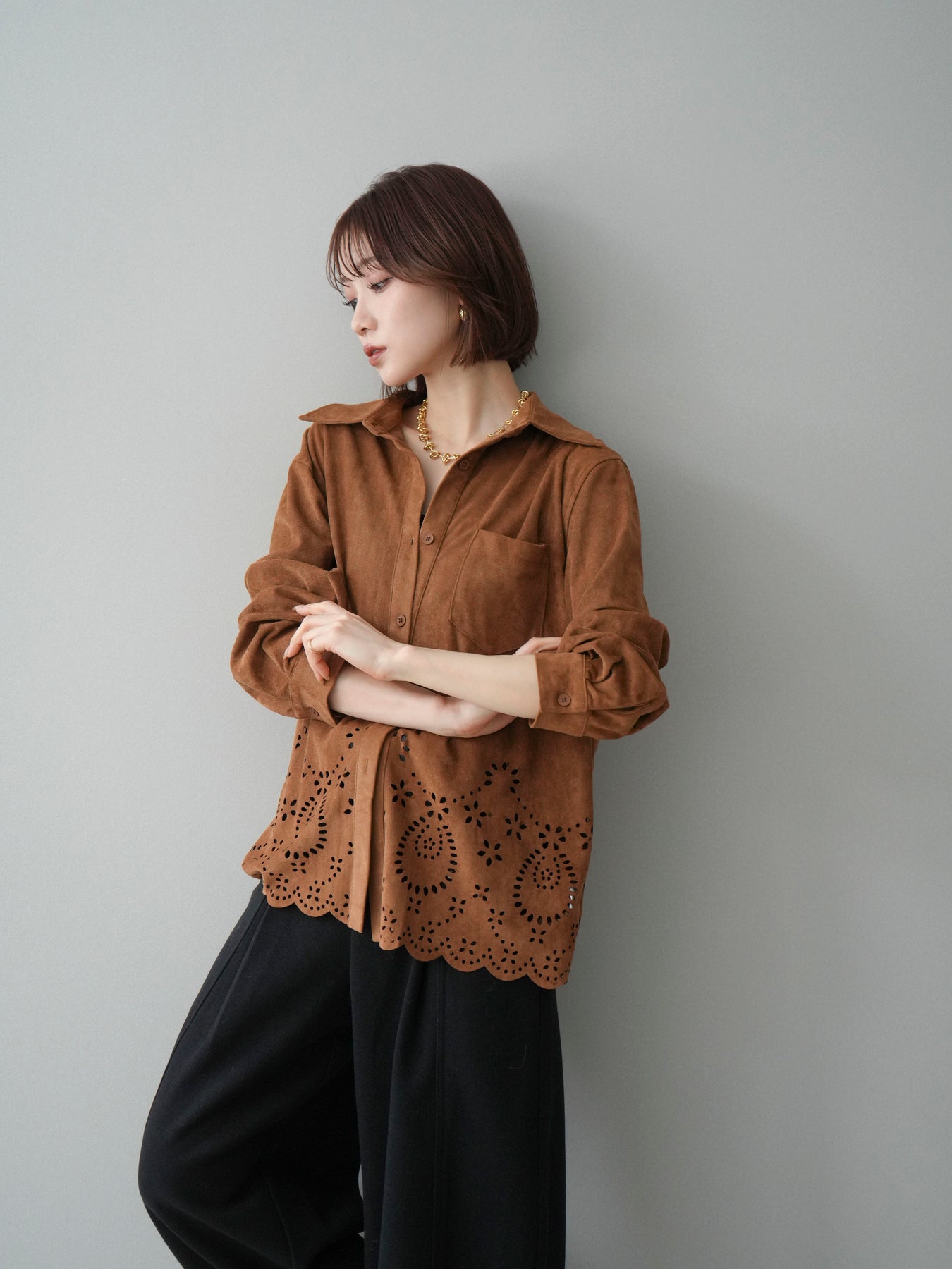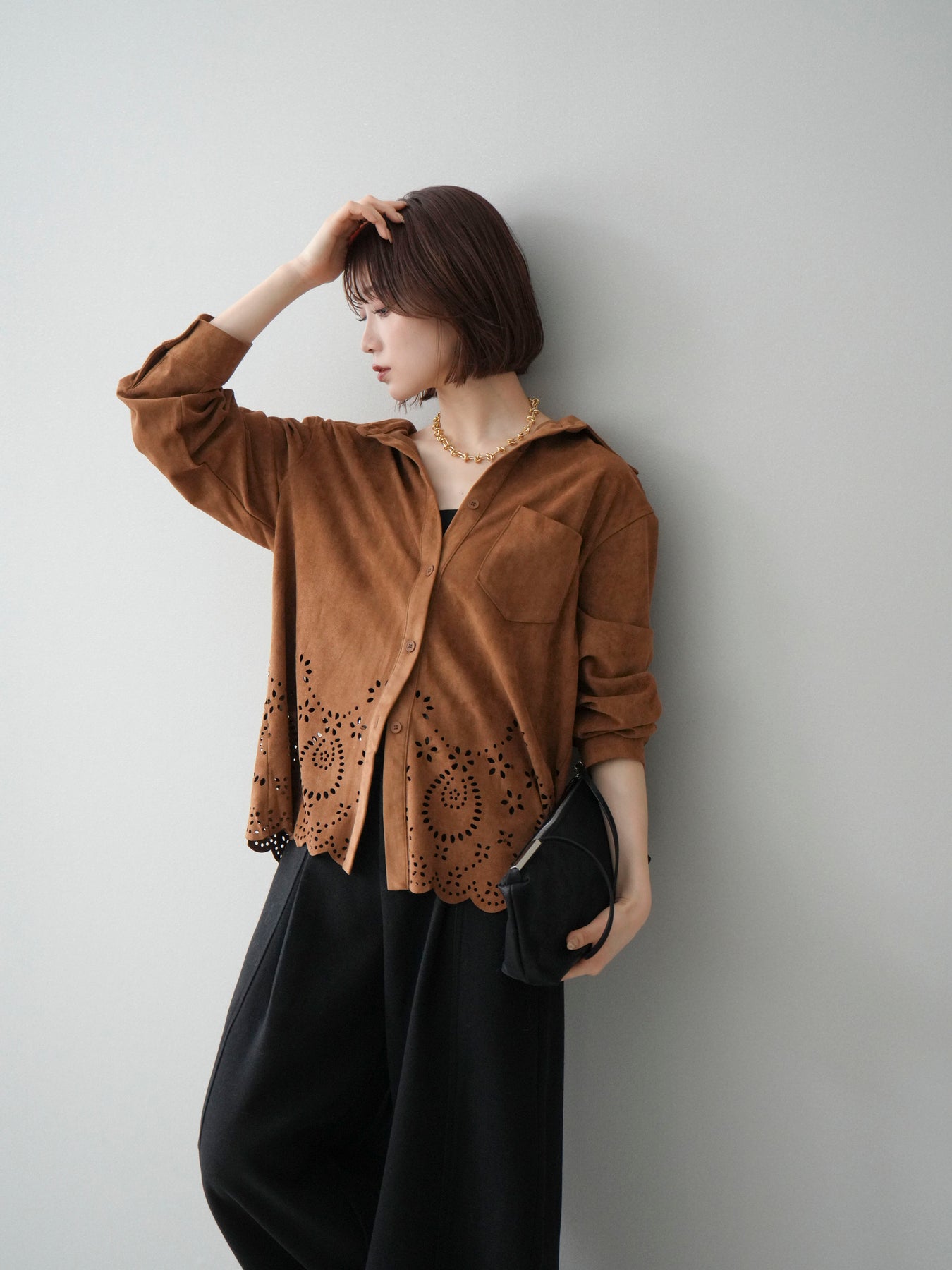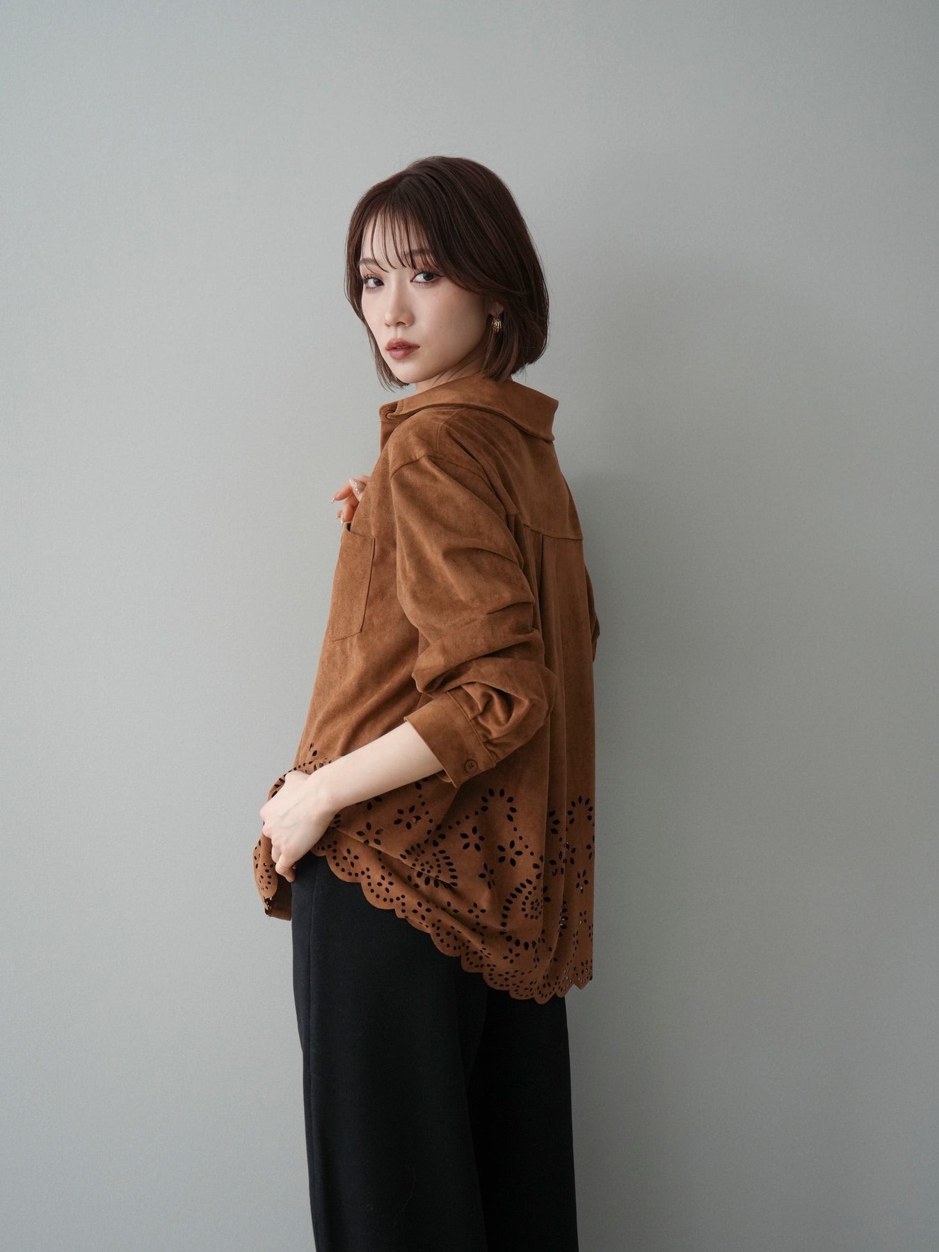 スエード調素材を使用した上品な風合いのシャツ。裾に施したスカラップデザインがさりげないアクセントとなり、シンプルながらも女性らしさを演出します。一枚ではもちろん、羽織としても着回しやすく、幅広いスタイリングに取り入れやすい一着です。