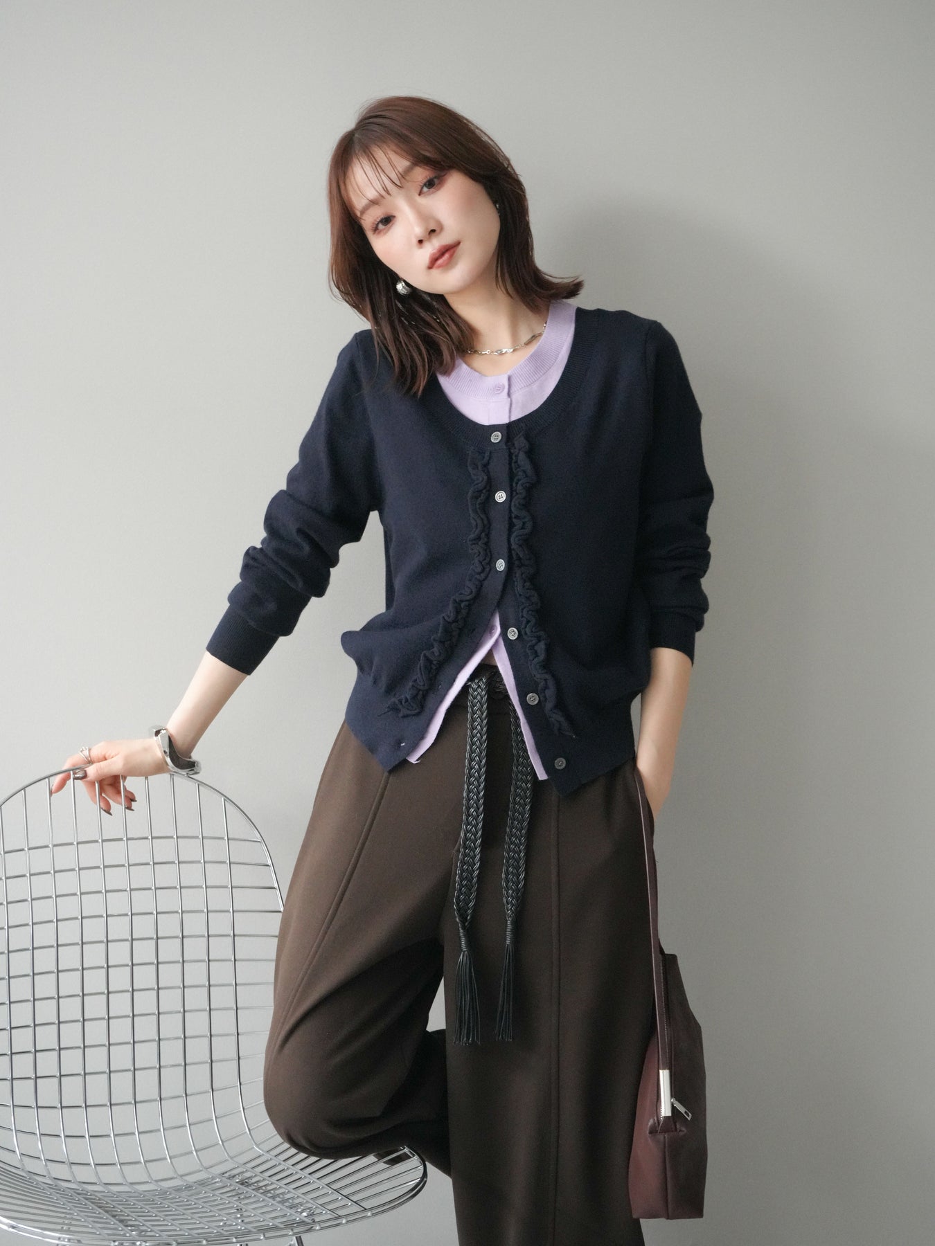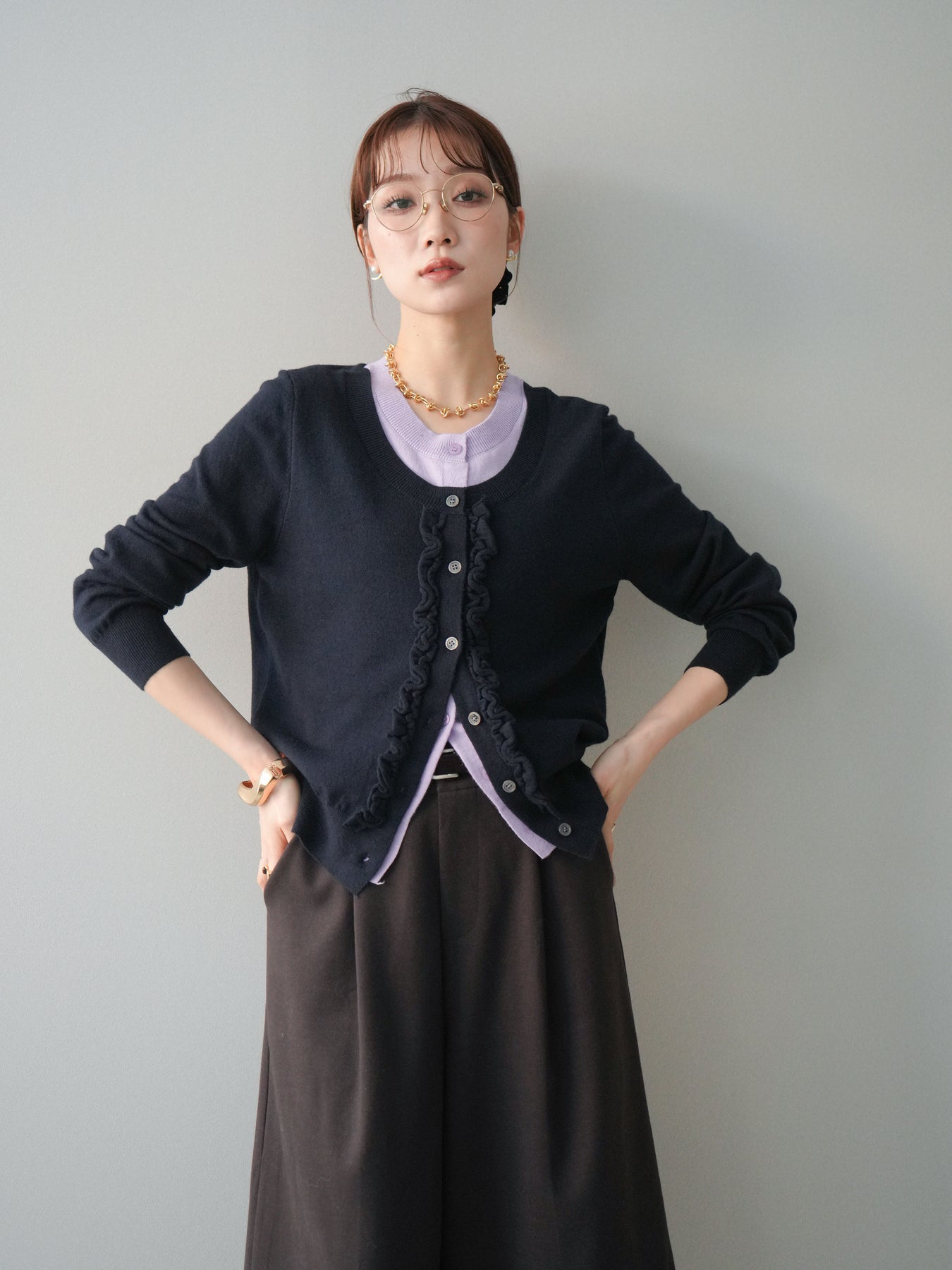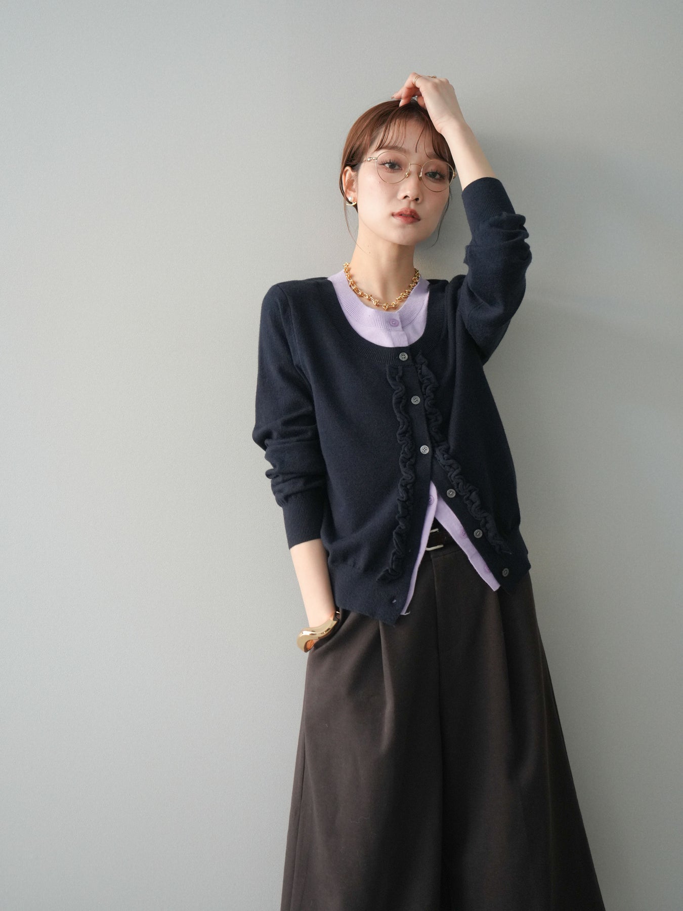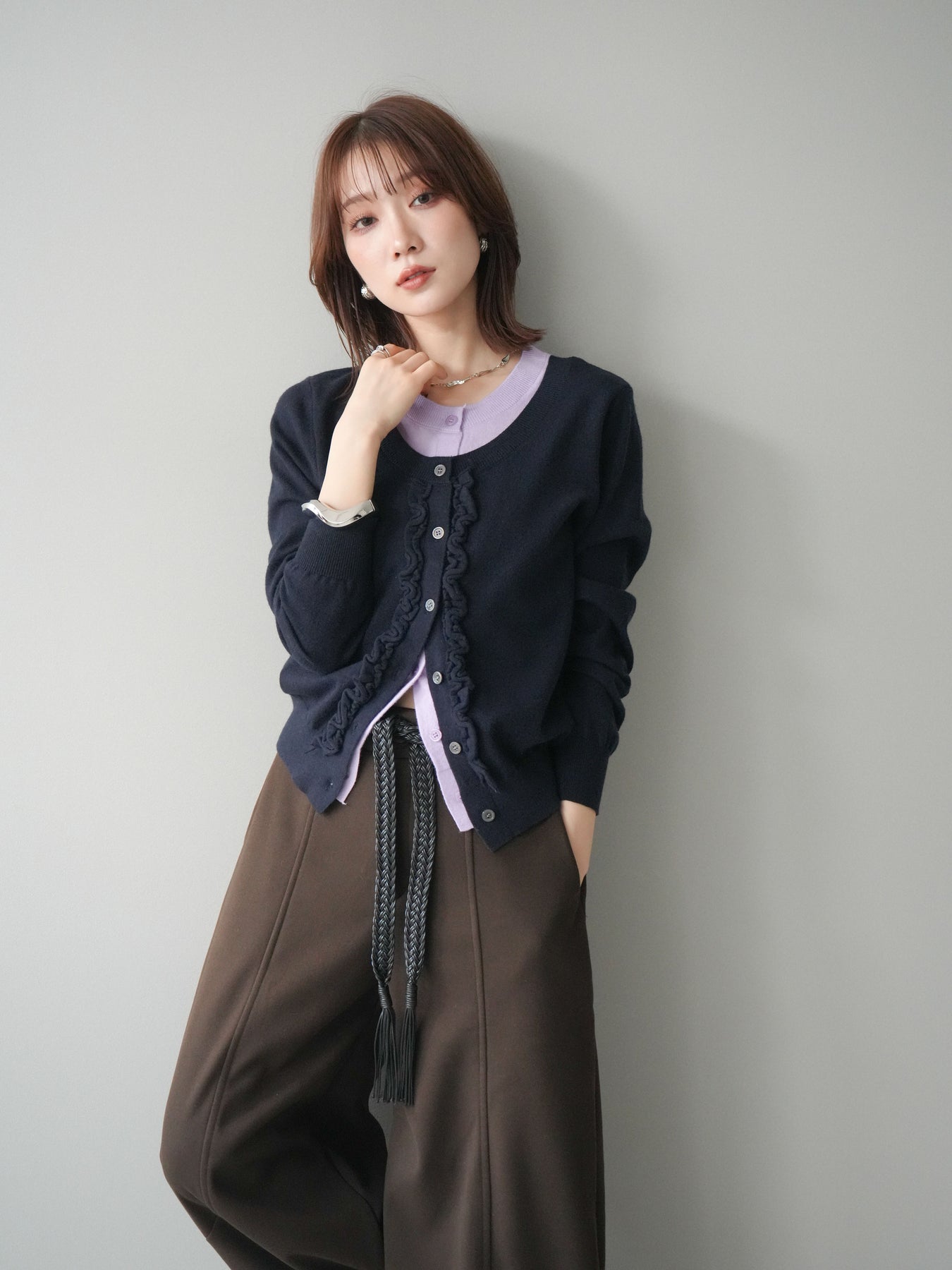 レイヤード風の配色デザインとフロントに施した繊細なフリルが目を惹くニットカーディガン。コンパクトなシルエットながらも華やかな印象を持ち、1枚で着映えする上品なデザインに仕上げています。柔らかく肌なじみの良い素材で着心地も快適。羽織りとしてはもちろん、ボタンを閉めてトップスとしても活躍し、さまざまなスタイリングに取り入れやすい万能アイテムです。普段のコーディネートにフェミニンなアクセントを加えてくれる一枚。 ※ボトムス、キャミソール(インナー)以外の商品は一律でインナーは付属していません。