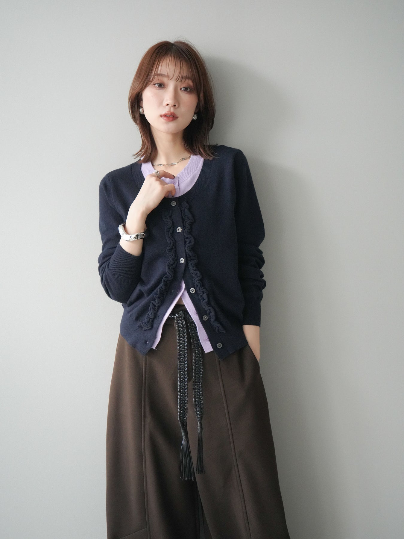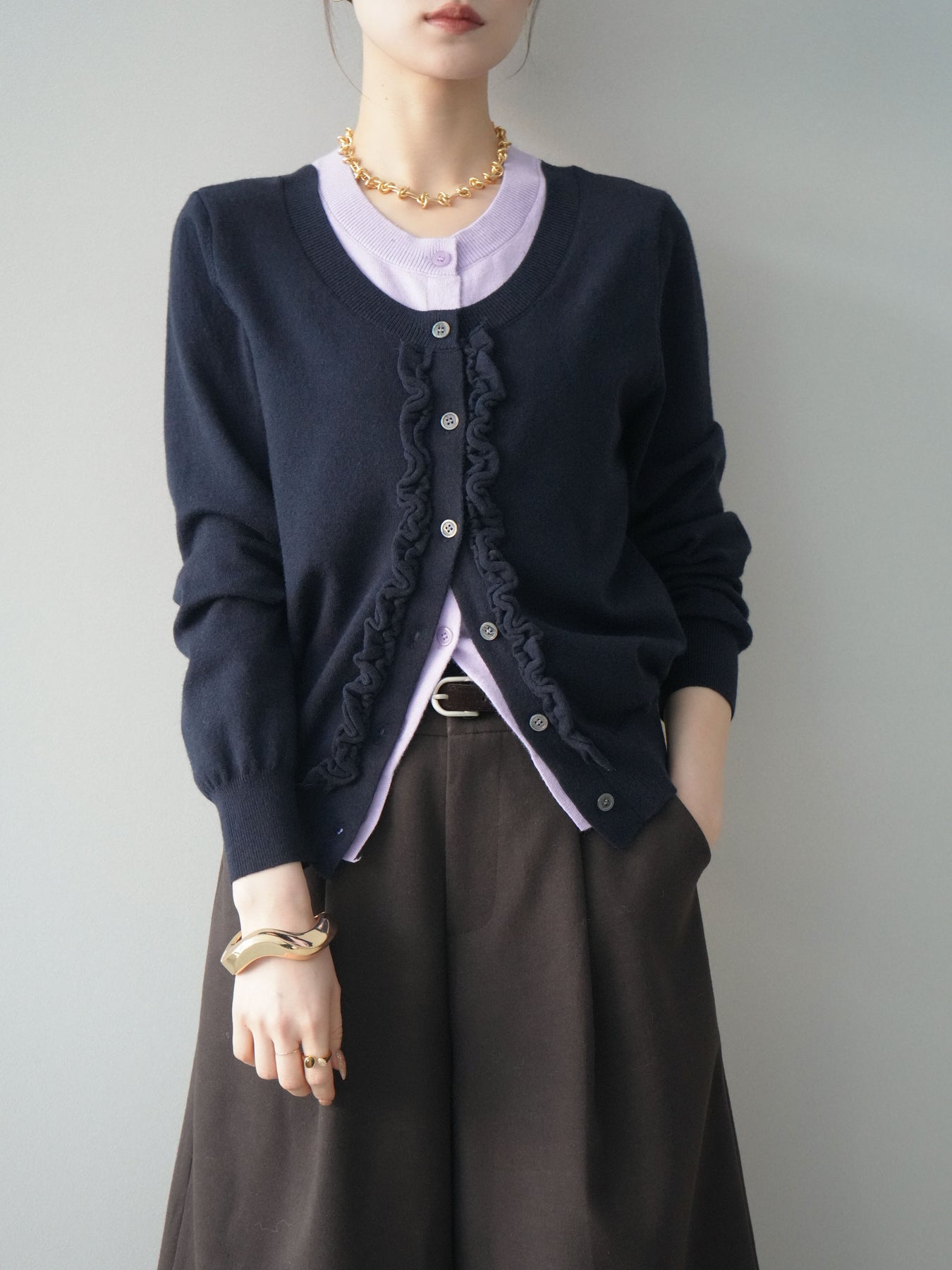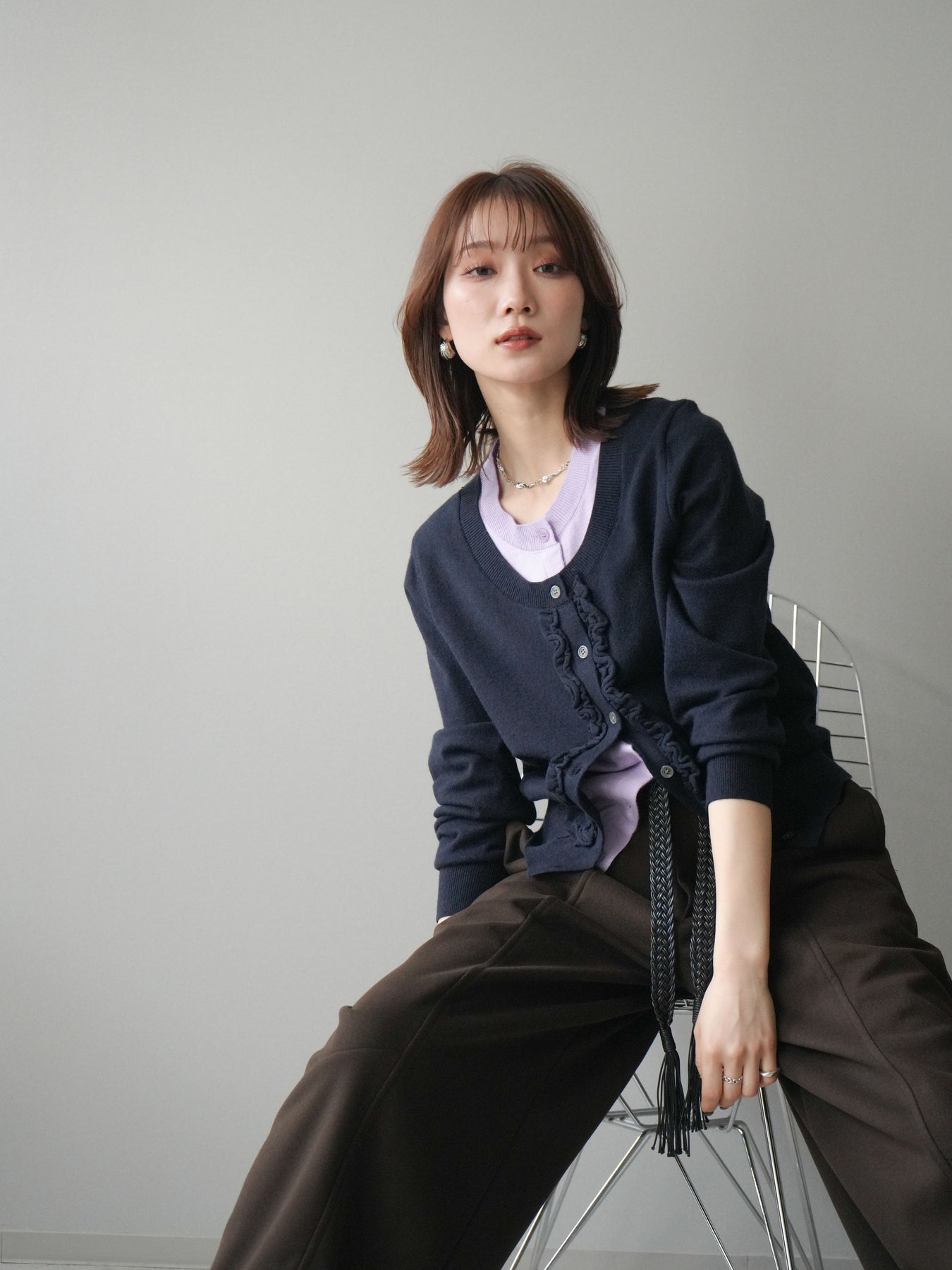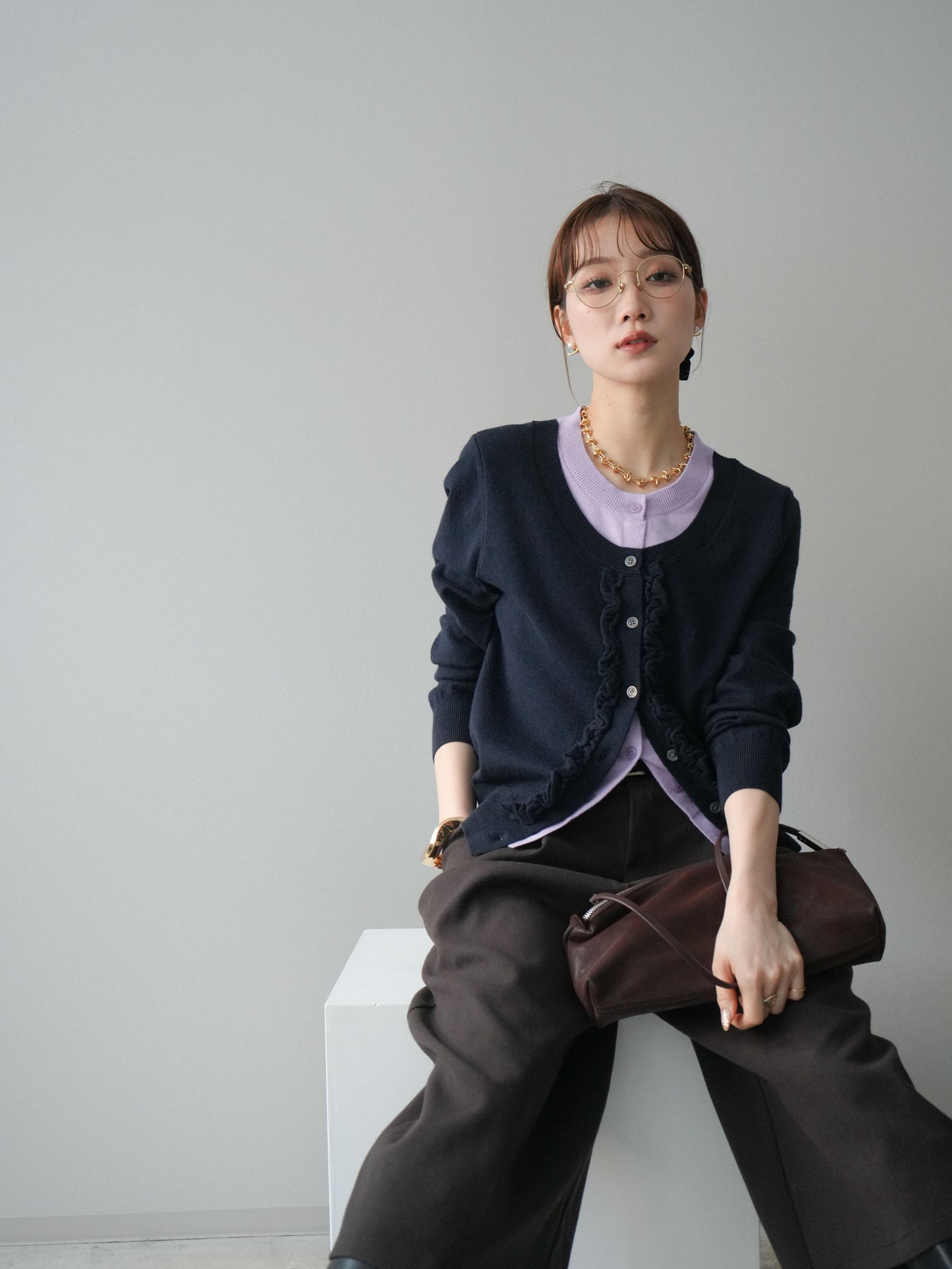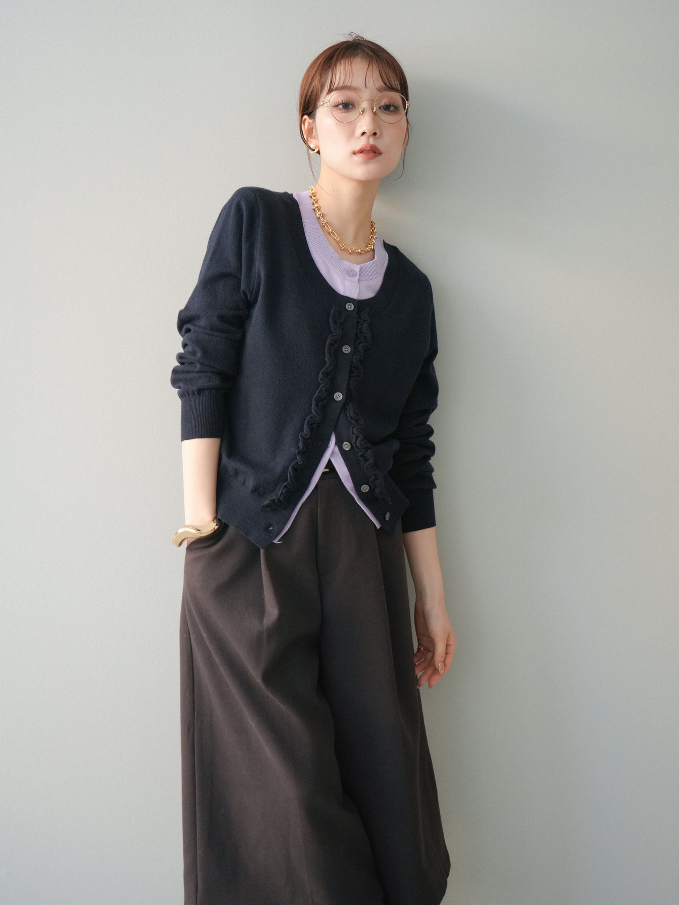 レイヤード風の配色デザインとフロントに施した繊細なフリルが目を惹くニットカーディガン。コンパクトなシルエットながらも華やかな印象を持ち、1枚で着映えする上品なデザインに仕上げています。柔らかく肌なじみの良い素材で着心地も快適。羽織りとしてはもちろん、ボタンを閉めてトップスとしても活躍し、さまざまなスタイリングに取り入れやすい万能アイテムです。普段のコーディネートにフェミニンなアクセントを加えてくれる一枚。 ※ボトムス、キャミソール(インナー)以外の商品は一律でインナーは付属していません。