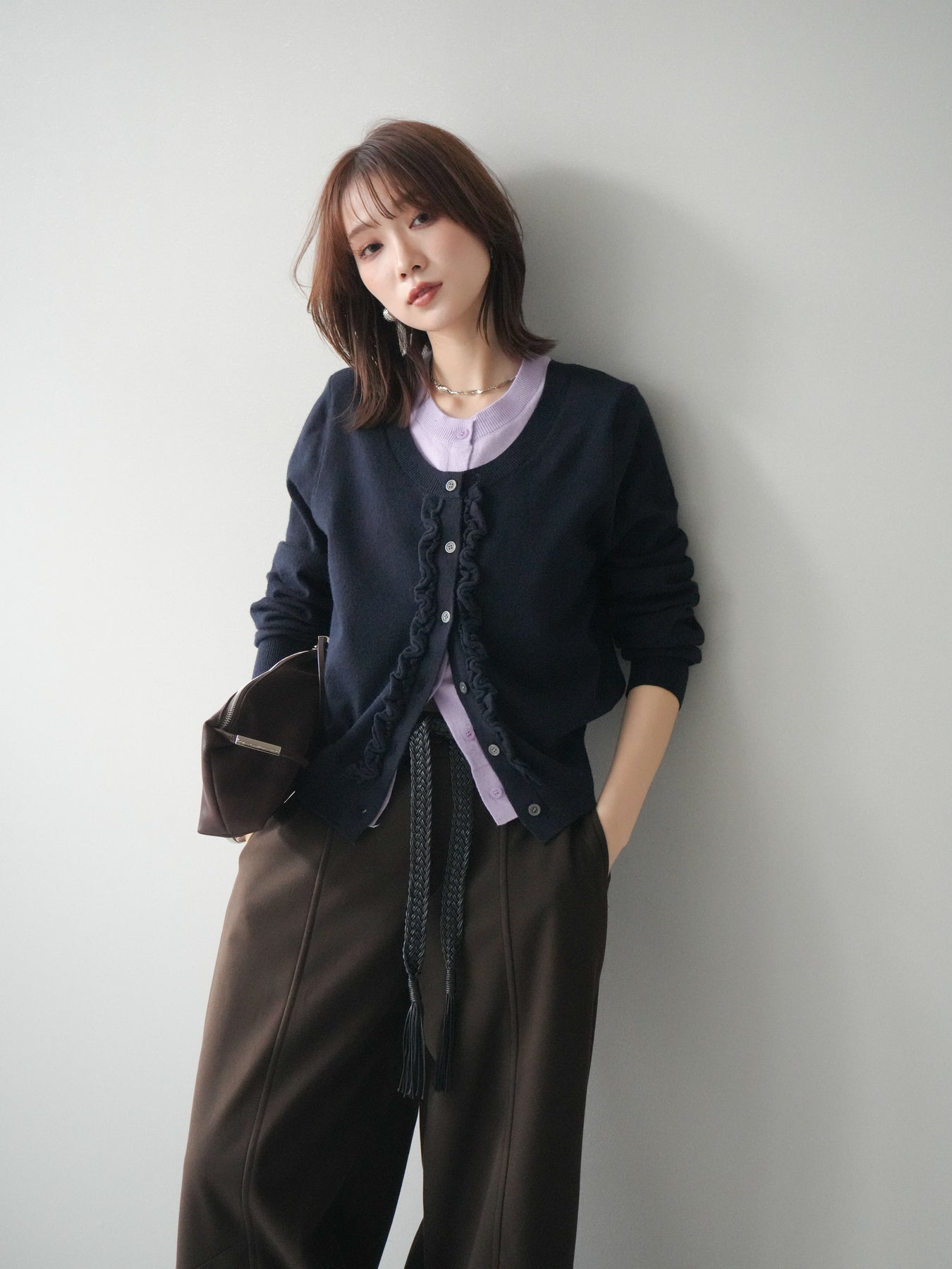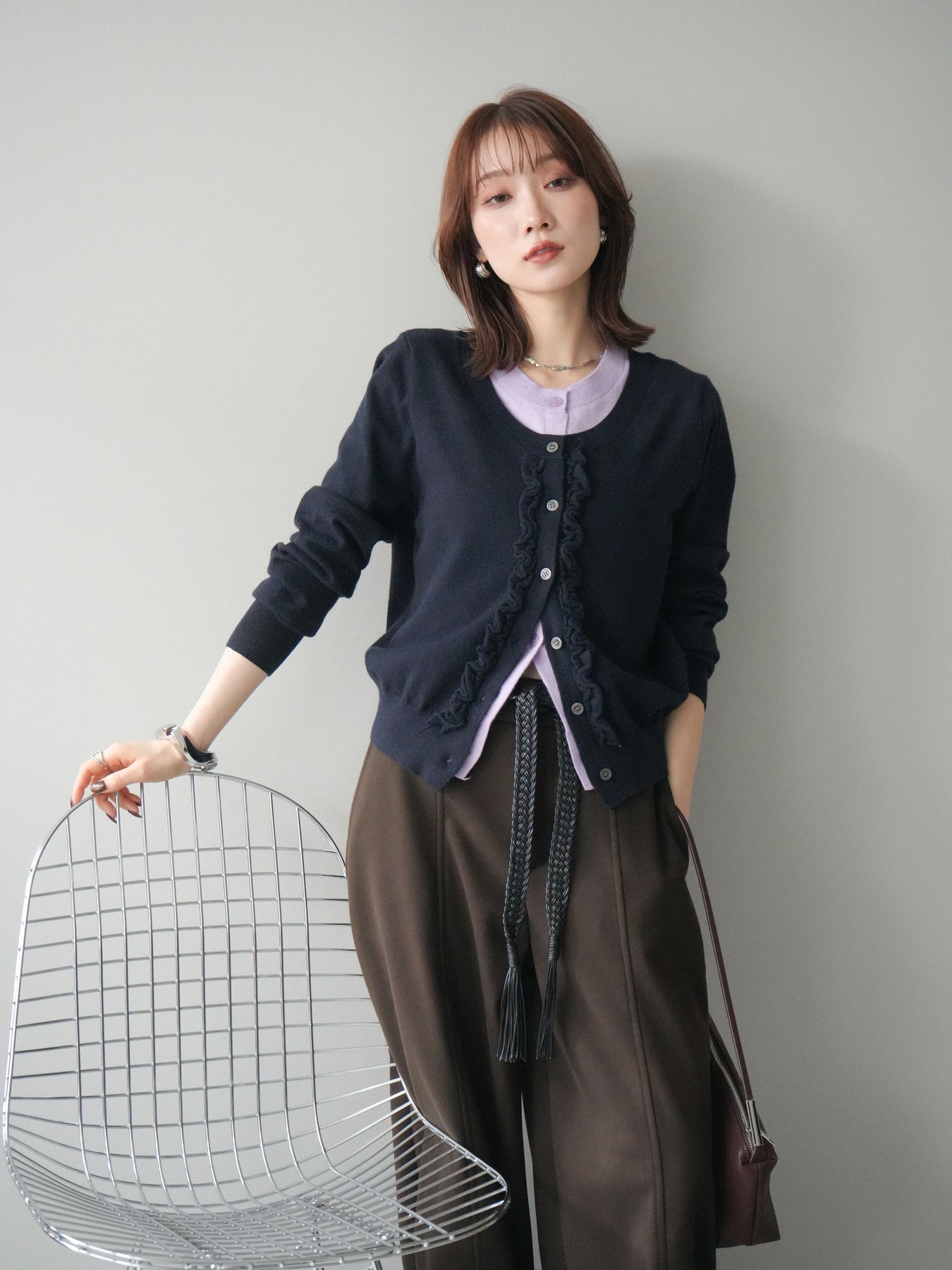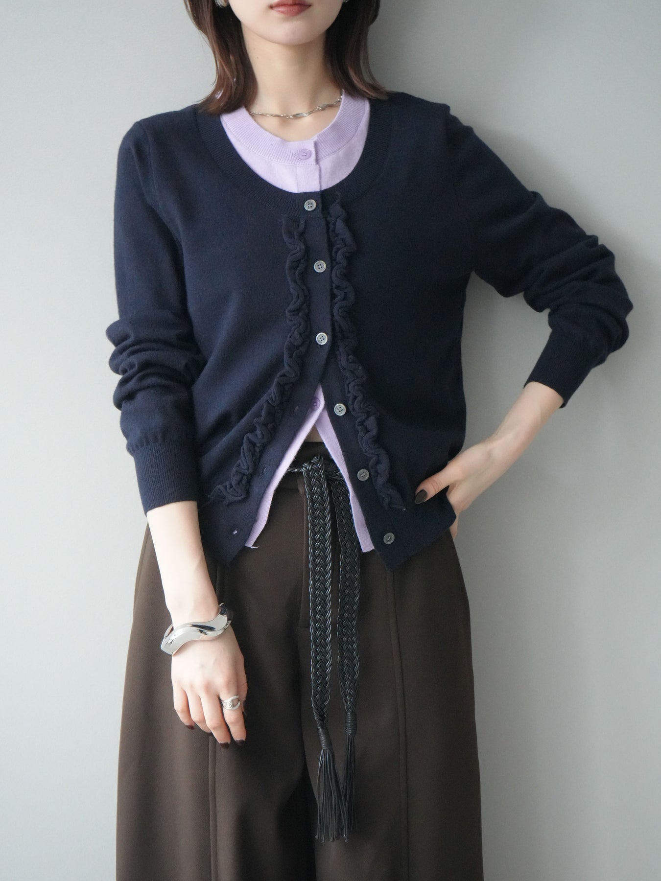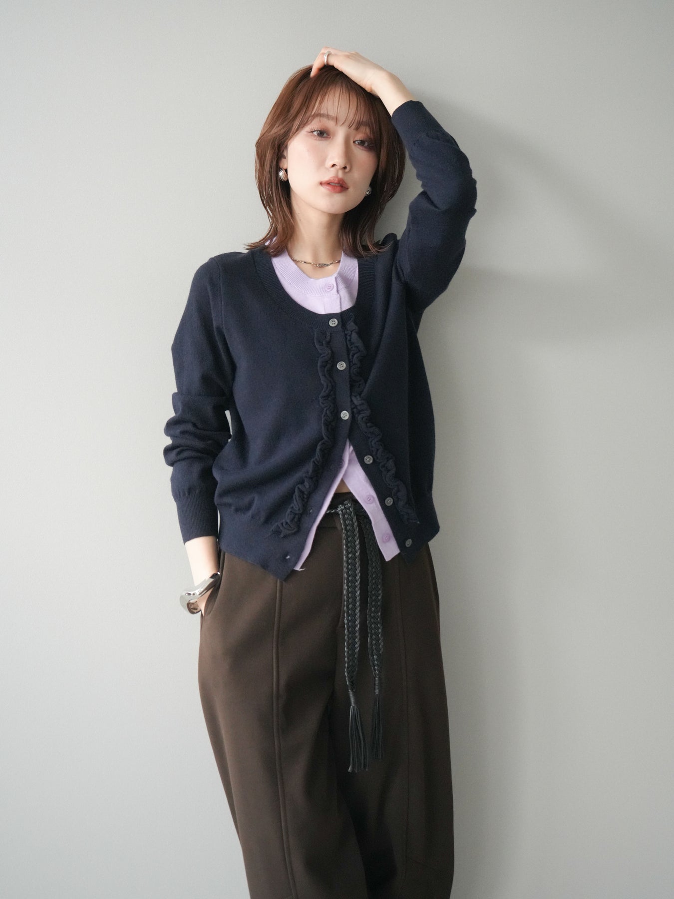 レイヤード風の配色デザインとフロントに施した繊細なフリルが目を惹くニットカーディガン。コンパクトなシルエットながらも華やかな印象を持ち、1枚で着映えする上品なデザインに仕上げています。柔らかく肌なじみの良い素材で着心地も快適。羽織りとしてはもちろん、ボタンを閉めてトップスとしても活躍し、さまざまなスタイリングに取り入れやすい万能アイテムです。普段のコーディネートにフェミニンなアクセントを加えてくれる一枚。 ※ボトムス、キャミソール(インナー)以外の商品は一律でインナーは付属していません。