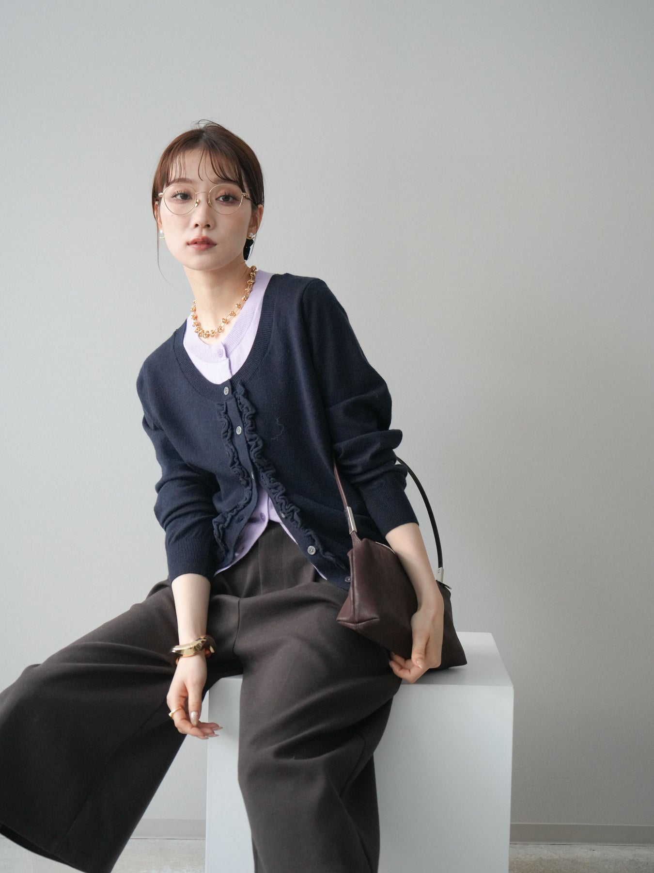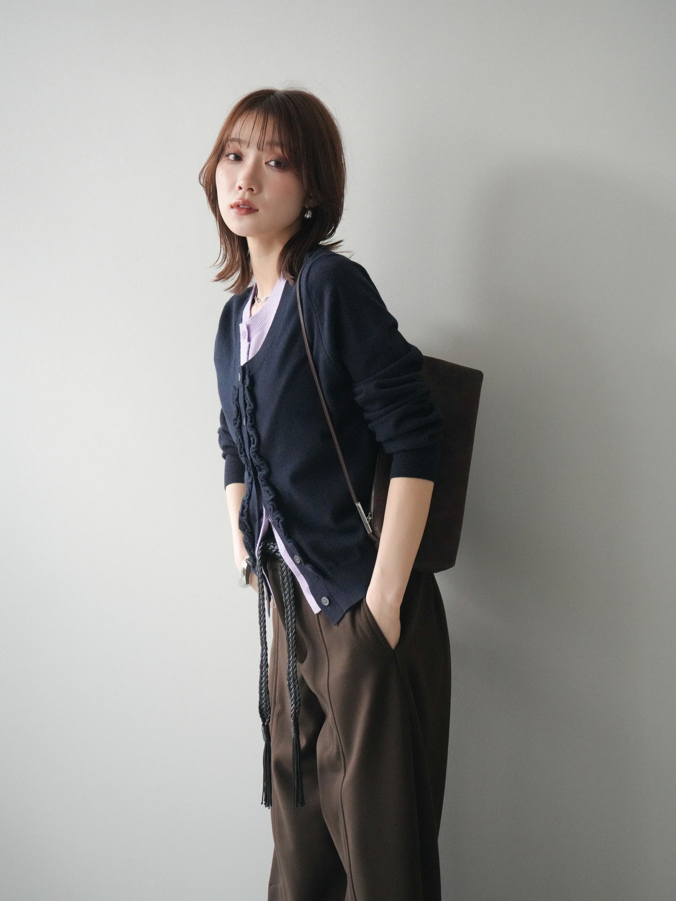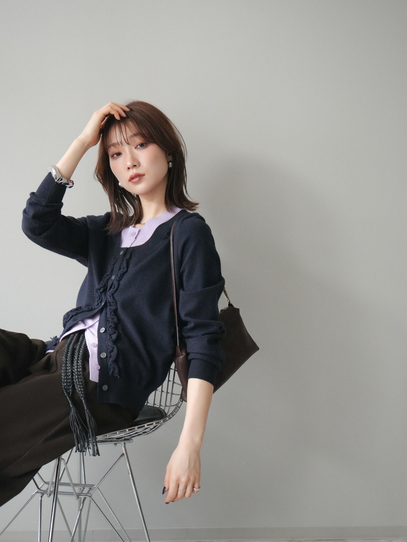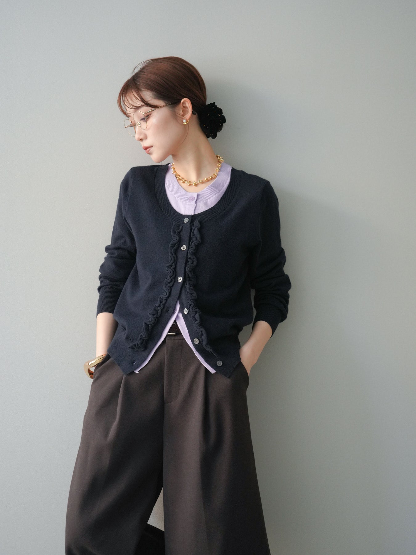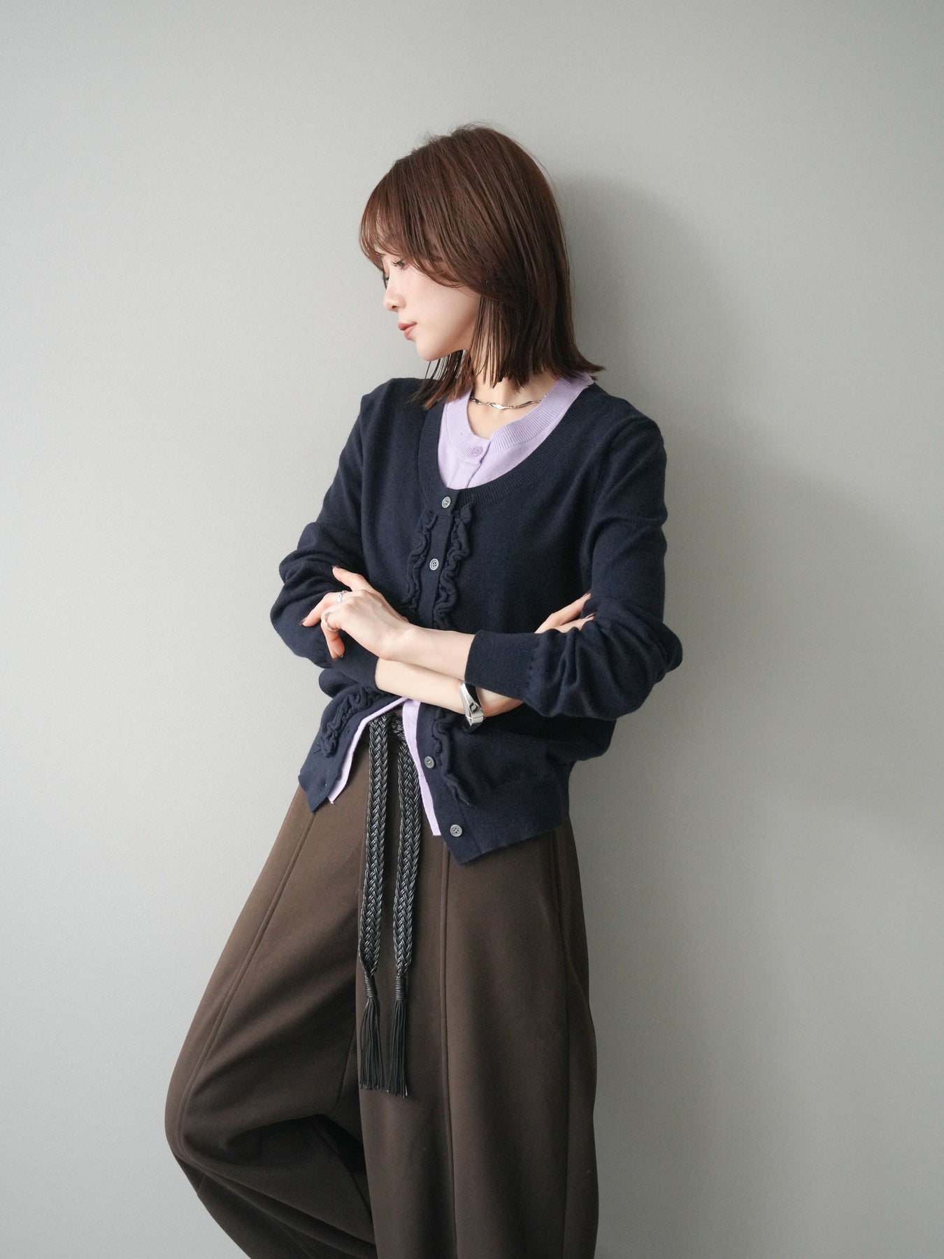 レイヤード風の配色デザインとフロントに施した繊細なフリルが目を惹くニットカーディガン。コンパクトなシルエットながらも華やかな印象を持ち、1枚で着映えする上品なデザインに仕上げています。柔らかく肌なじみの良い素材で着心地も快適。羽織りとしてはもちろん、ボタンを閉めてトップスとしても活躍し、さまざまなスタイリングに取り入れやすい万能アイテムです。普段のコーディネートにフェミニンなアクセントを加えてくれる一枚。 ※ボトムス、キャミソール(インナー)以外の商品は一律でインナーは付属していません。