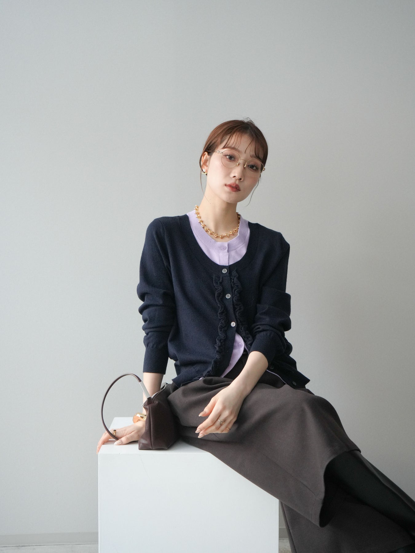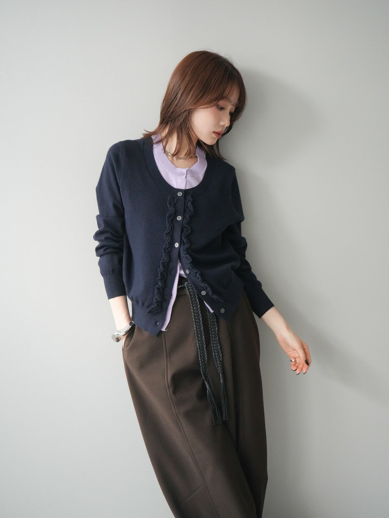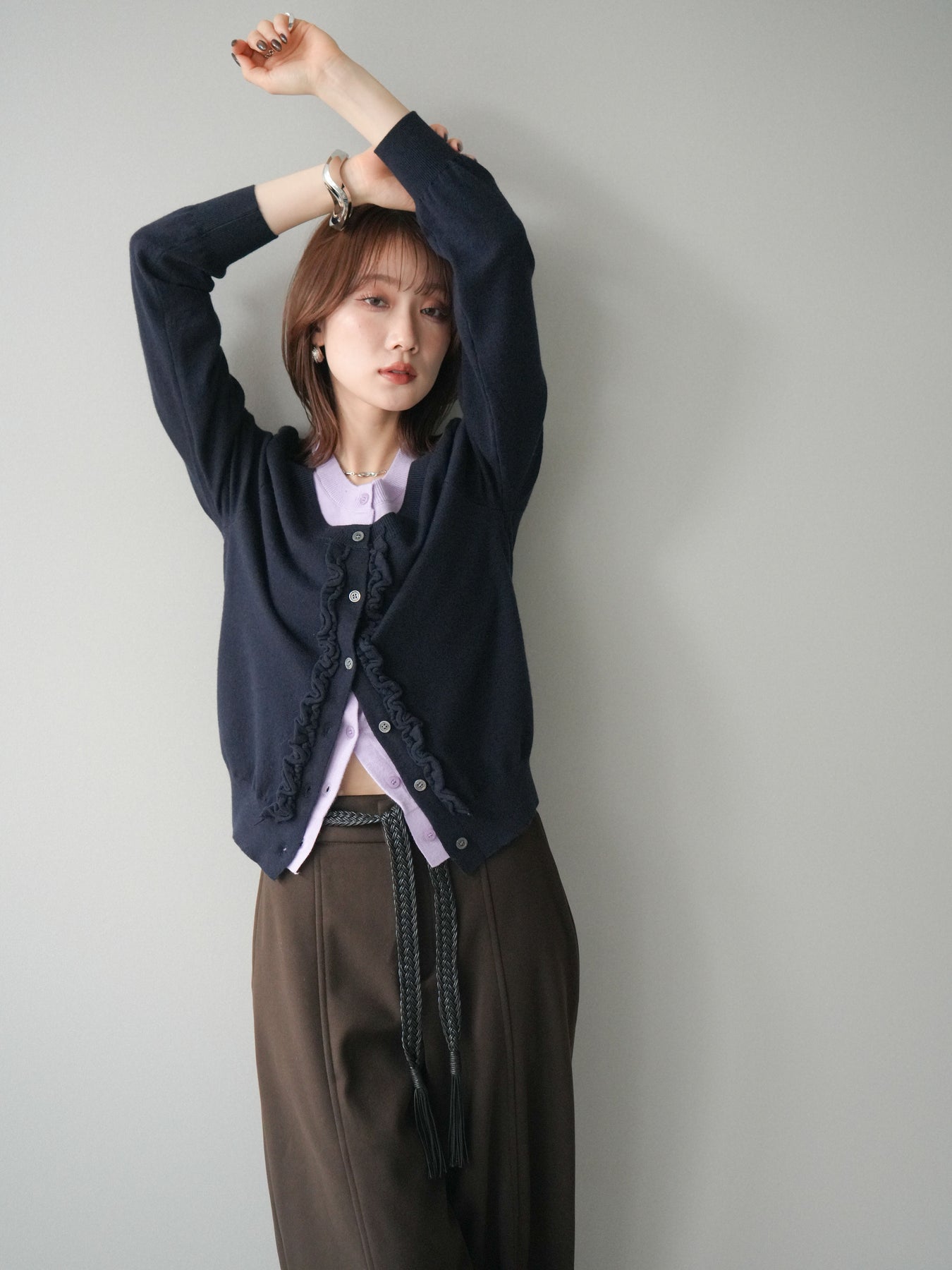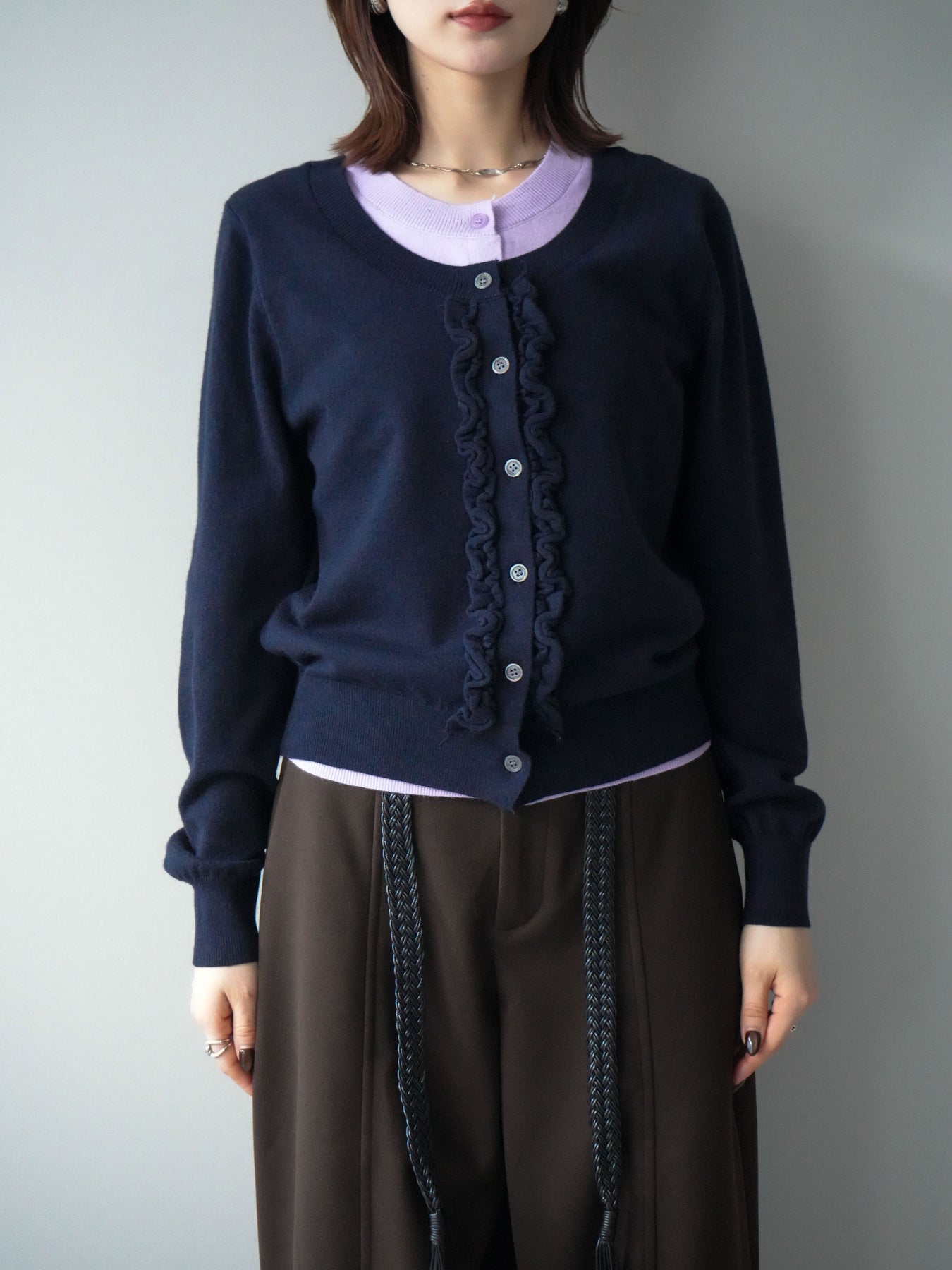 レイヤード風の配色デザインとフロントに施した繊細なフリルが目を惹くニットカーディガン。コンパクトなシルエットながらも華やかな印象を持ち、1枚で着映えする上品なデザインに仕上げています。柔らかく肌なじみの良い素材で着心地も快適。羽織りとしてはもちろん、ボタンを閉めてトップスとしても活躍し、さまざまなスタイリングに取り入れやすい万能アイテムです。普段のコーディネートにフェミニンなアクセントを加えてくれる一枚。 ※ボトムス、キャミソール(インナー)以外の商品は一律でインナーは付属していません。