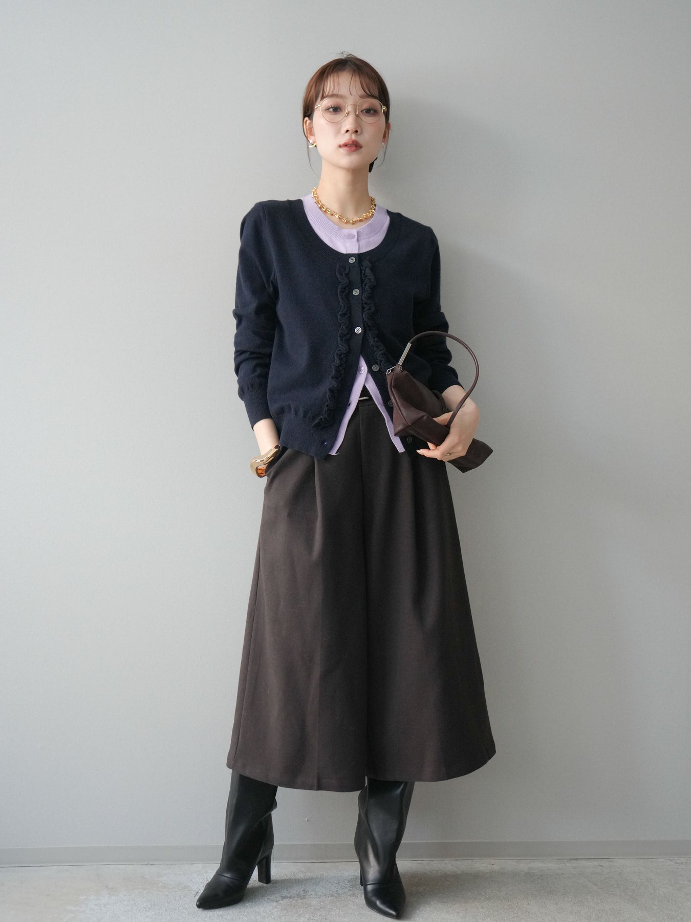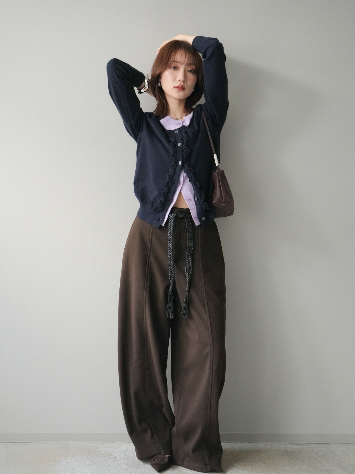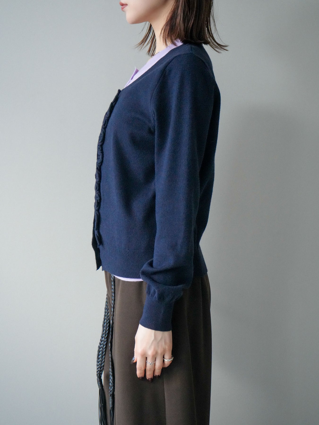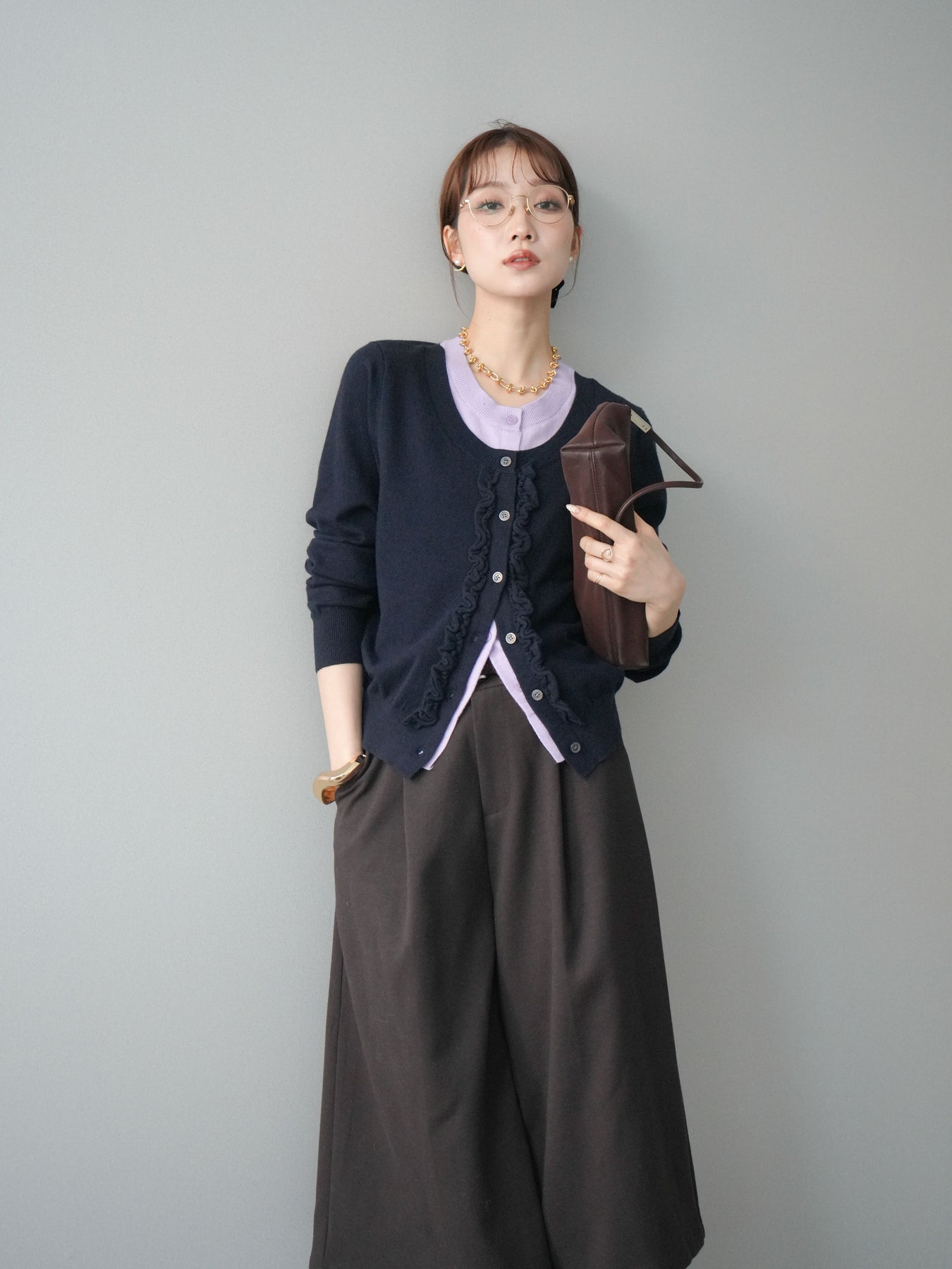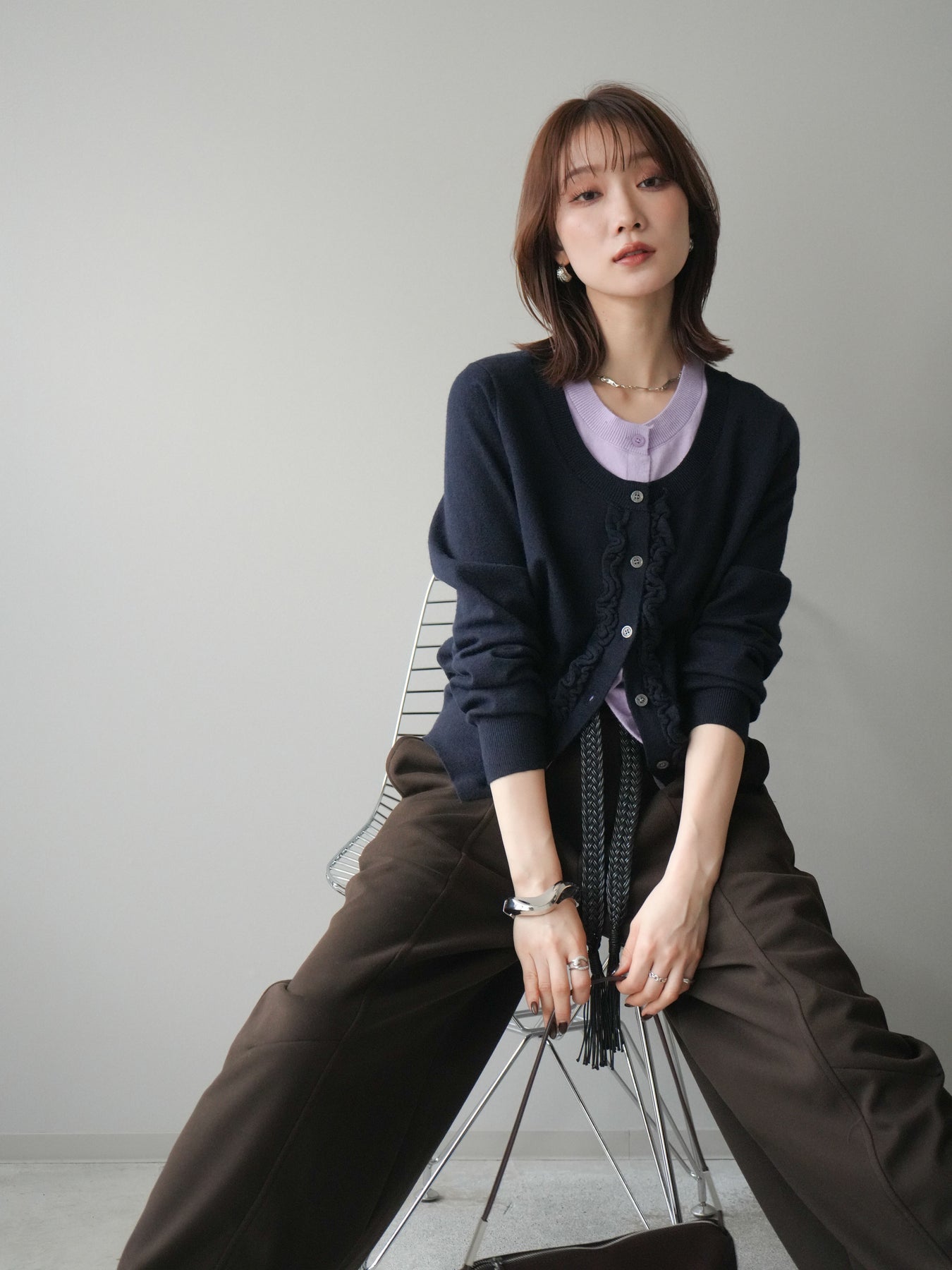 レイヤード風の配色デザインとフロントに施した繊細なフリルが目を惹くニットカーディガン。コンパクトなシルエットながらも華やかな印象を持ち、1枚で着映えする上品なデザインに仕上げています。柔らかく肌なじみの良い素材で着心地も快適。羽織りとしてはもちろん、ボタンを閉めてトップスとしても活躍し、さまざまなスタイリングに取り入れやすい万能アイテムです。普段のコーディネートにフェミニンなアクセントを加えてくれる一枚。 ※ボトムス、キャミソール(インナー)以外の商品は一律でインナーは付属していません。