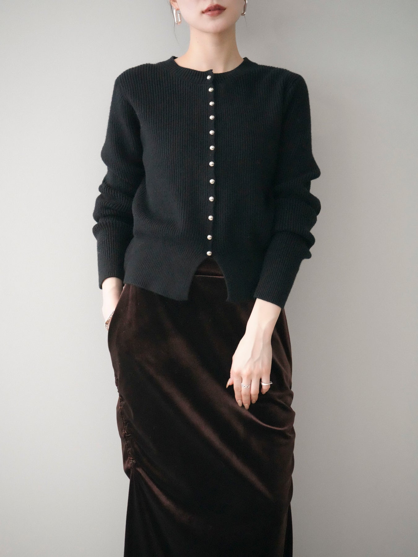 [予約]シルバーボタン畦編みニットカーディガン/black